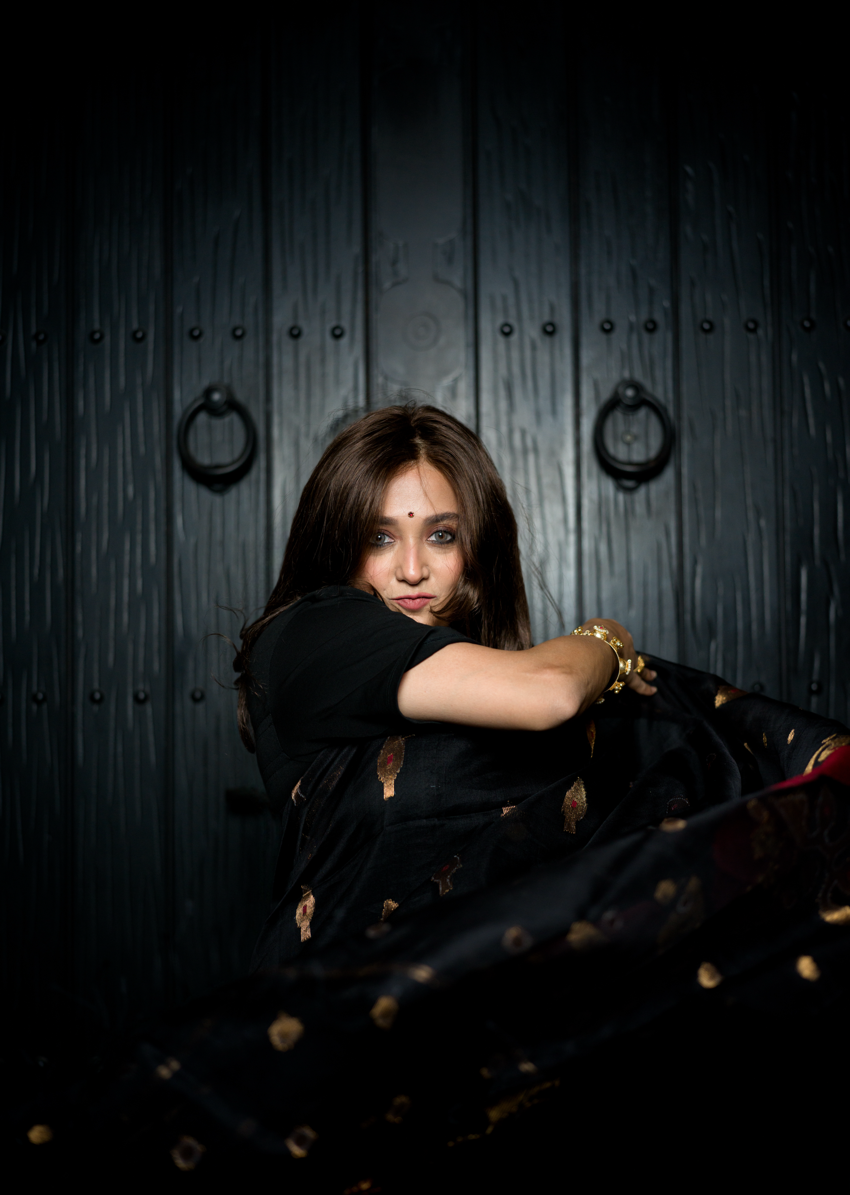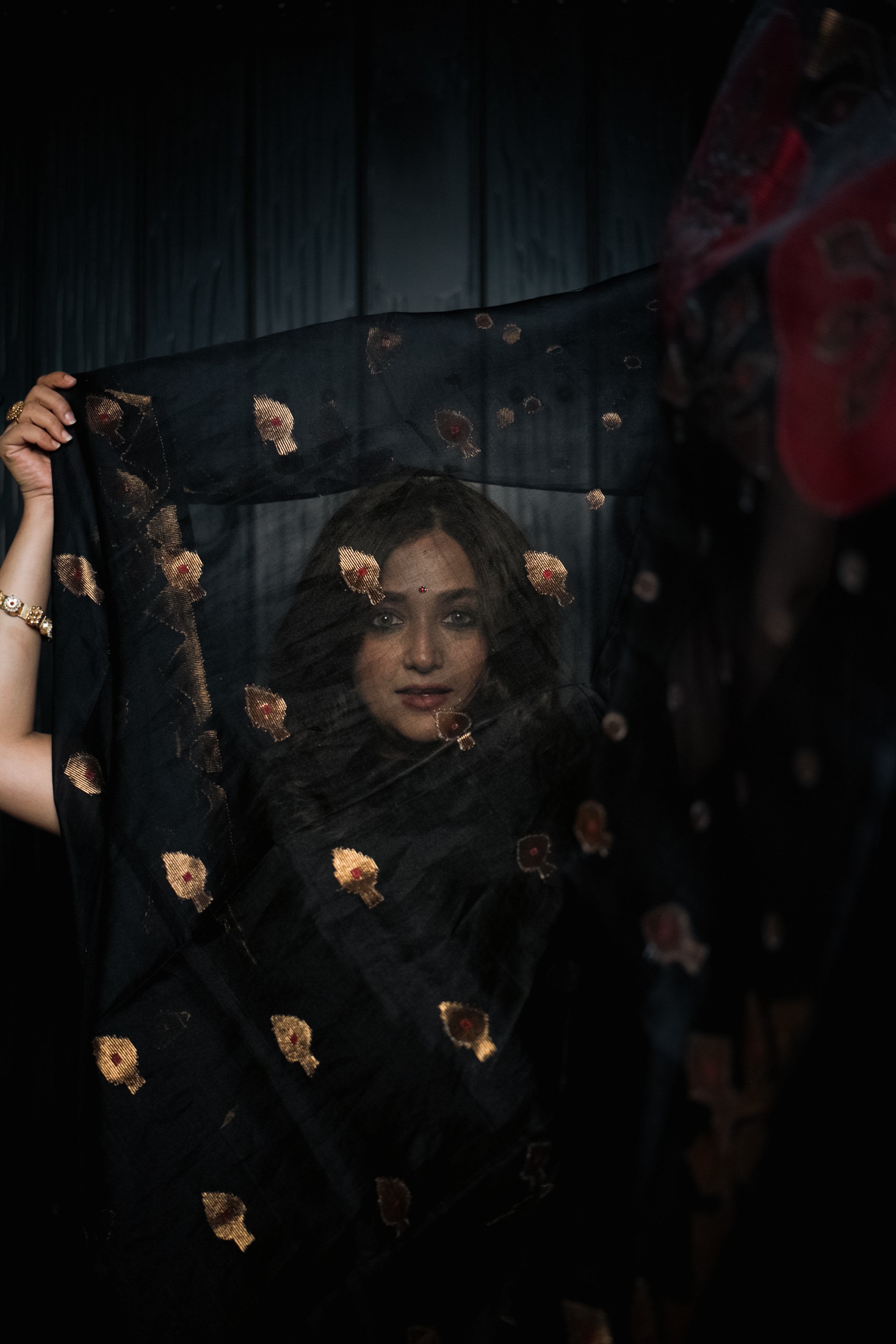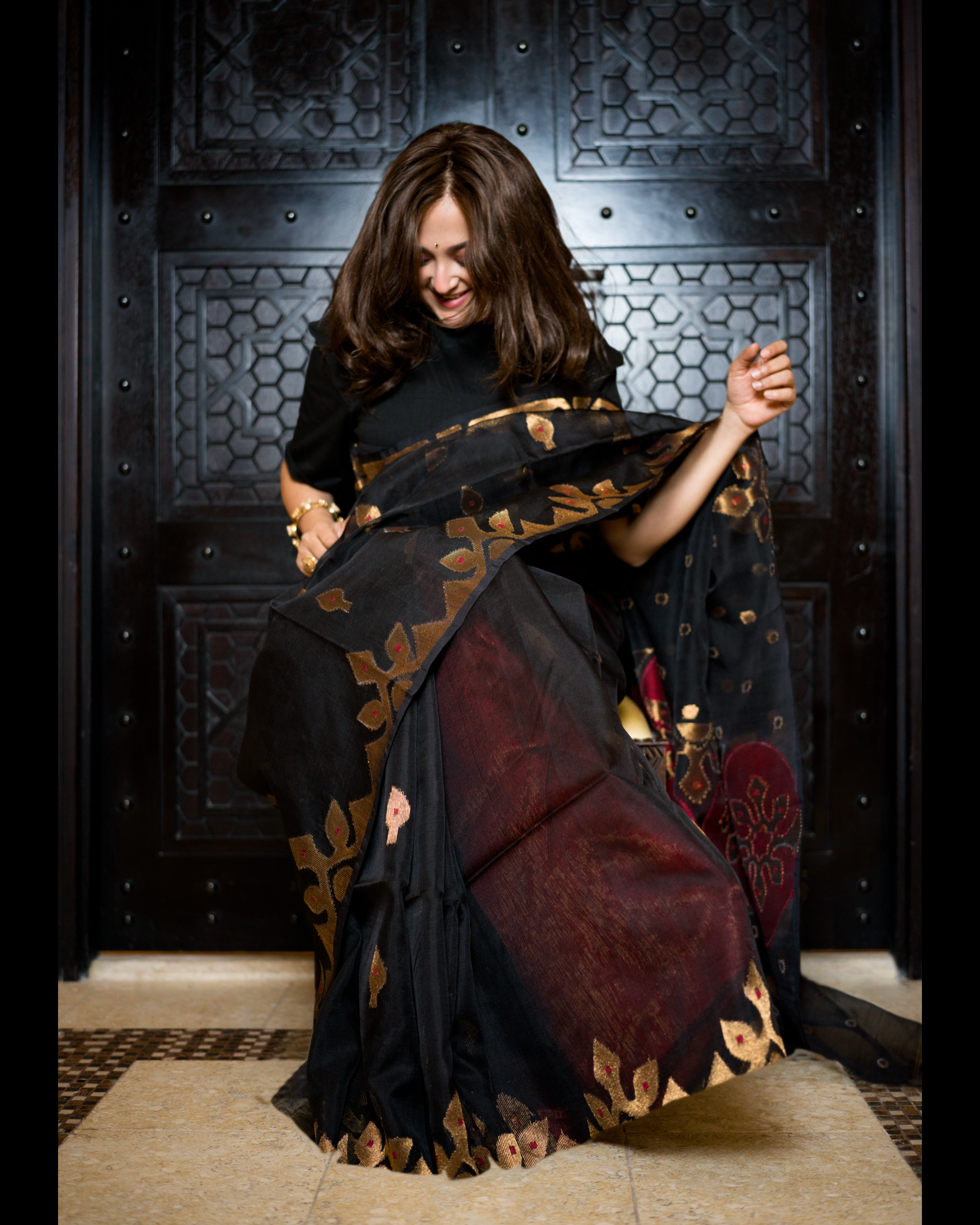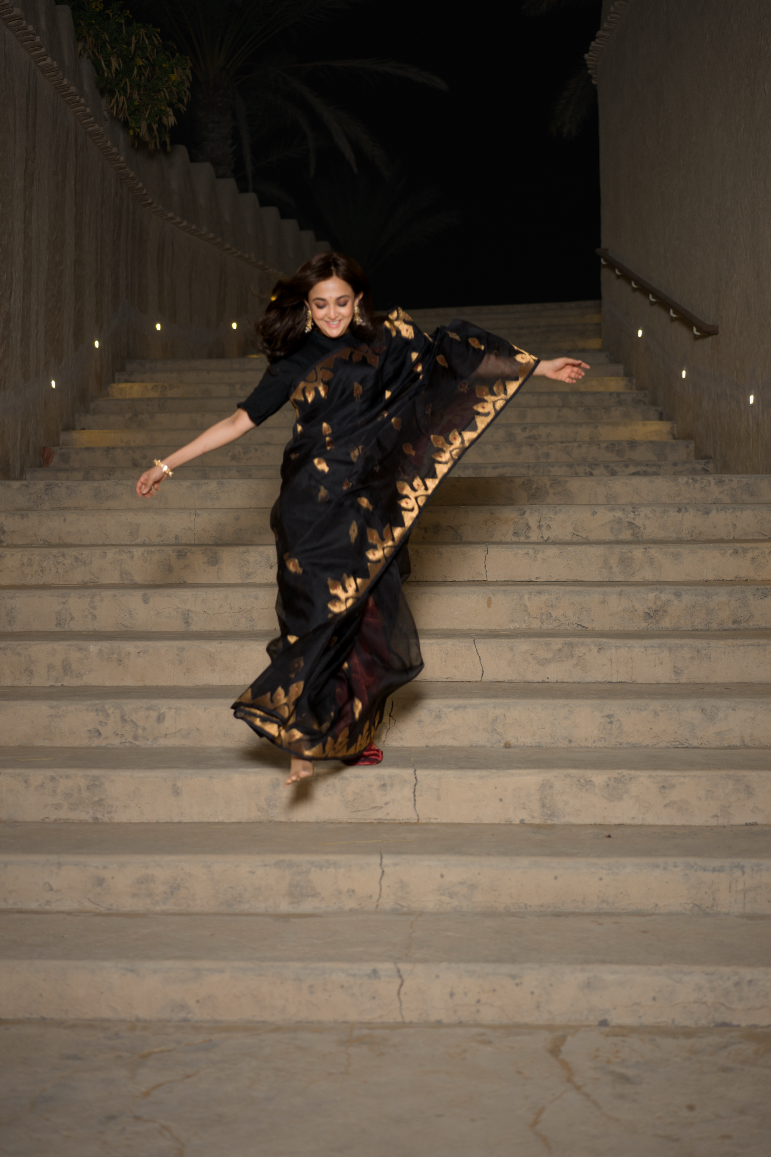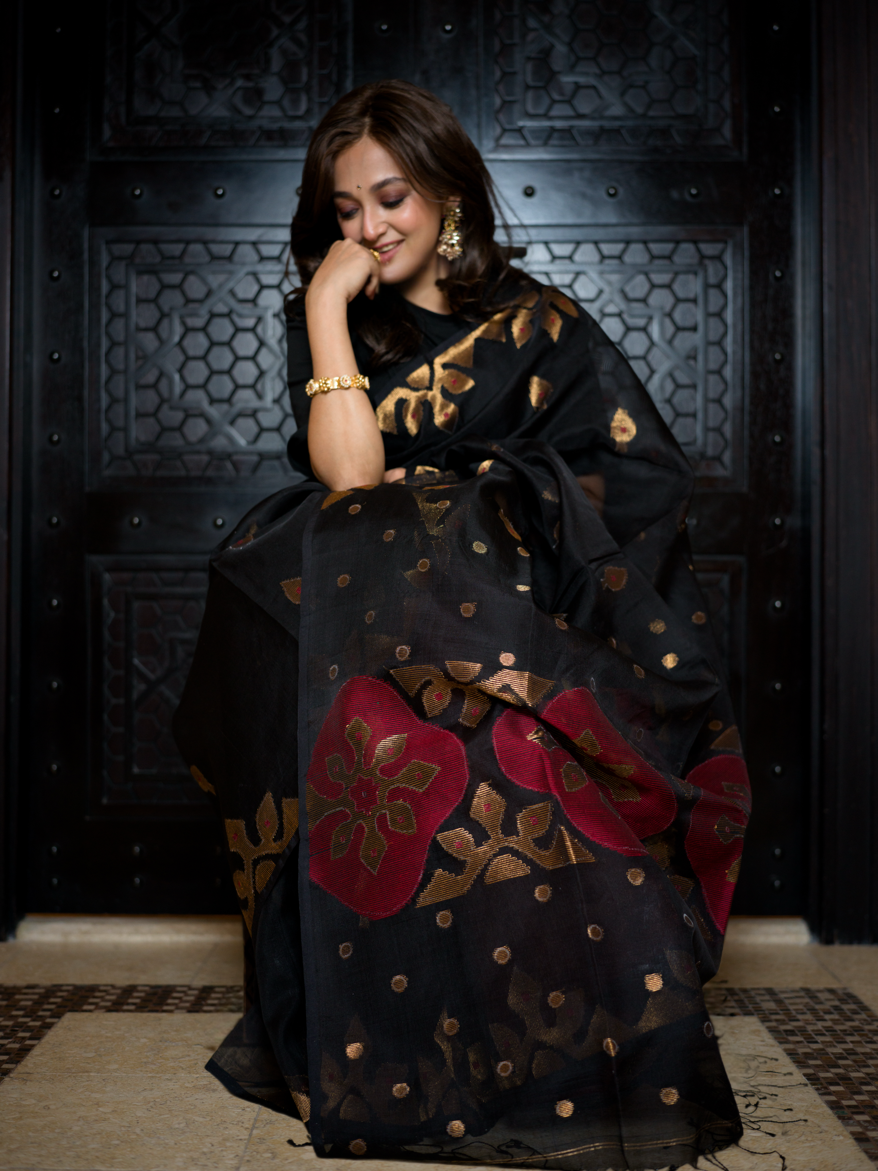 Flame in the Dark, Pure Muslin Black, Gold and Red Jamdaani Saree