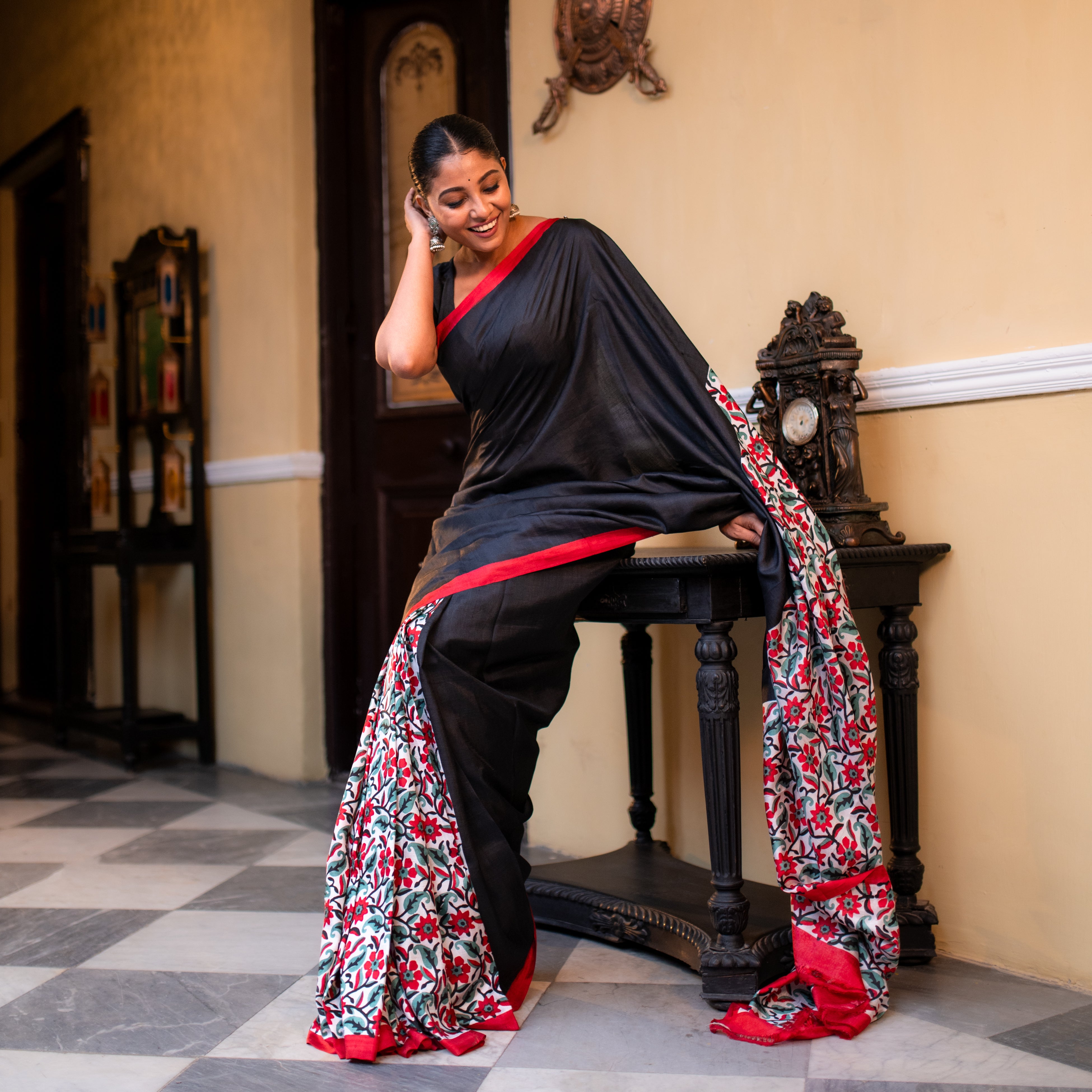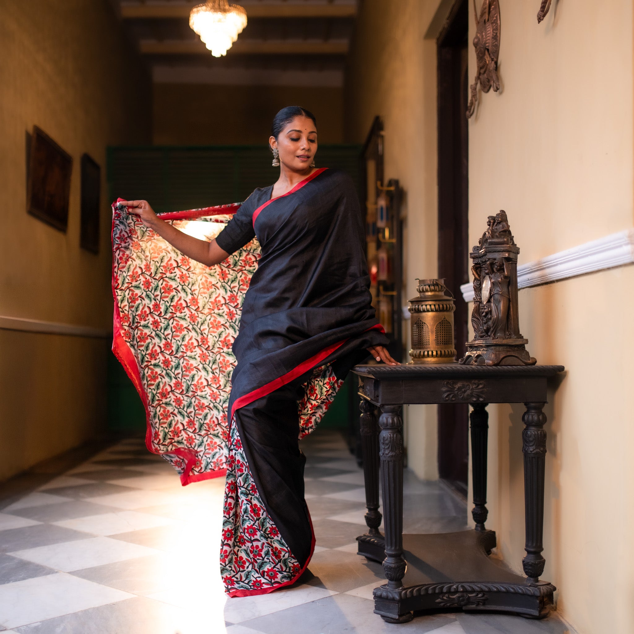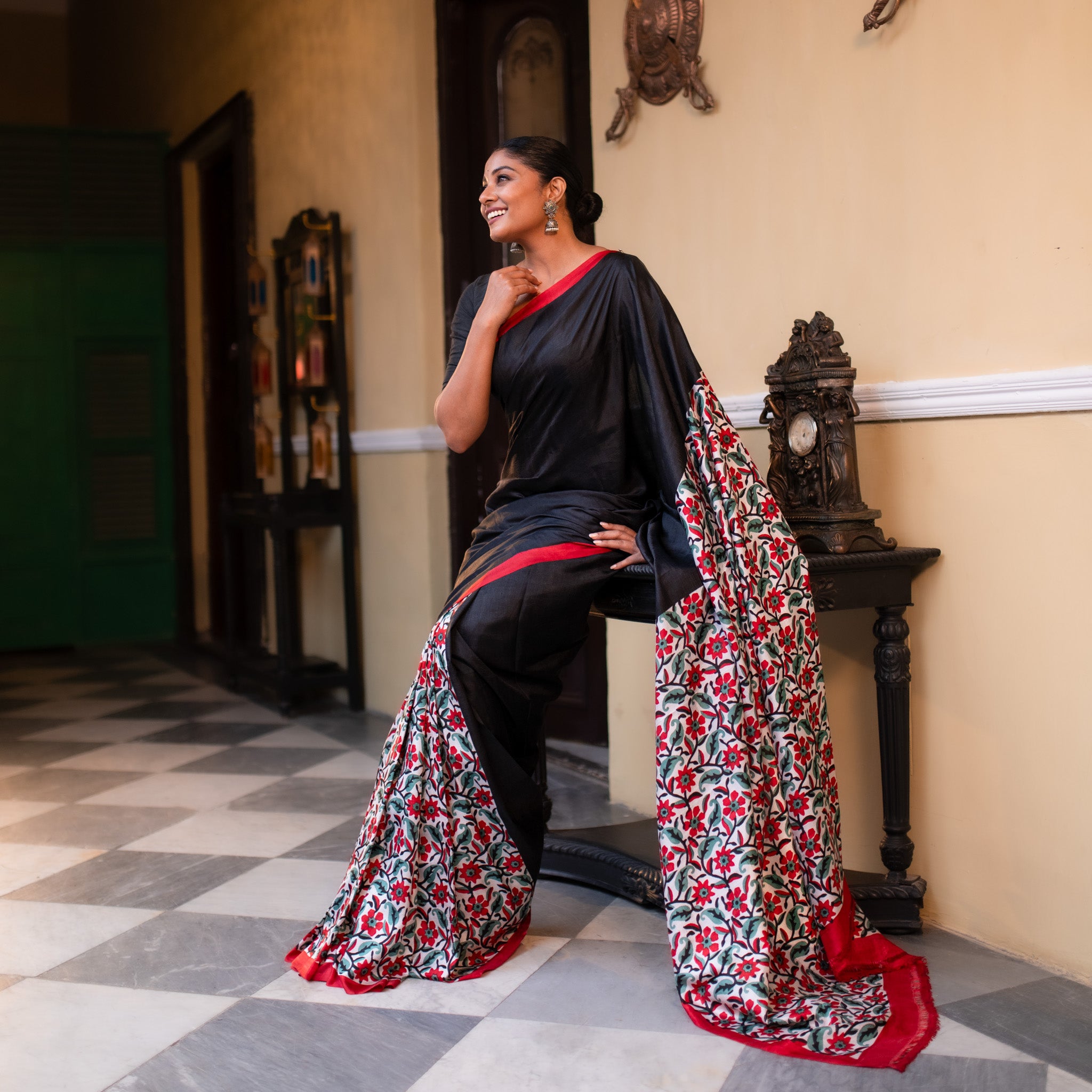 This striking 4ply Half and Half Bishnupuri silk saree, crafted with traditional artistry, features a deep black body adorned with hand block printed floral motifs in red, white, and green in half of the Body and Pallu, perfect for elegant occasions.