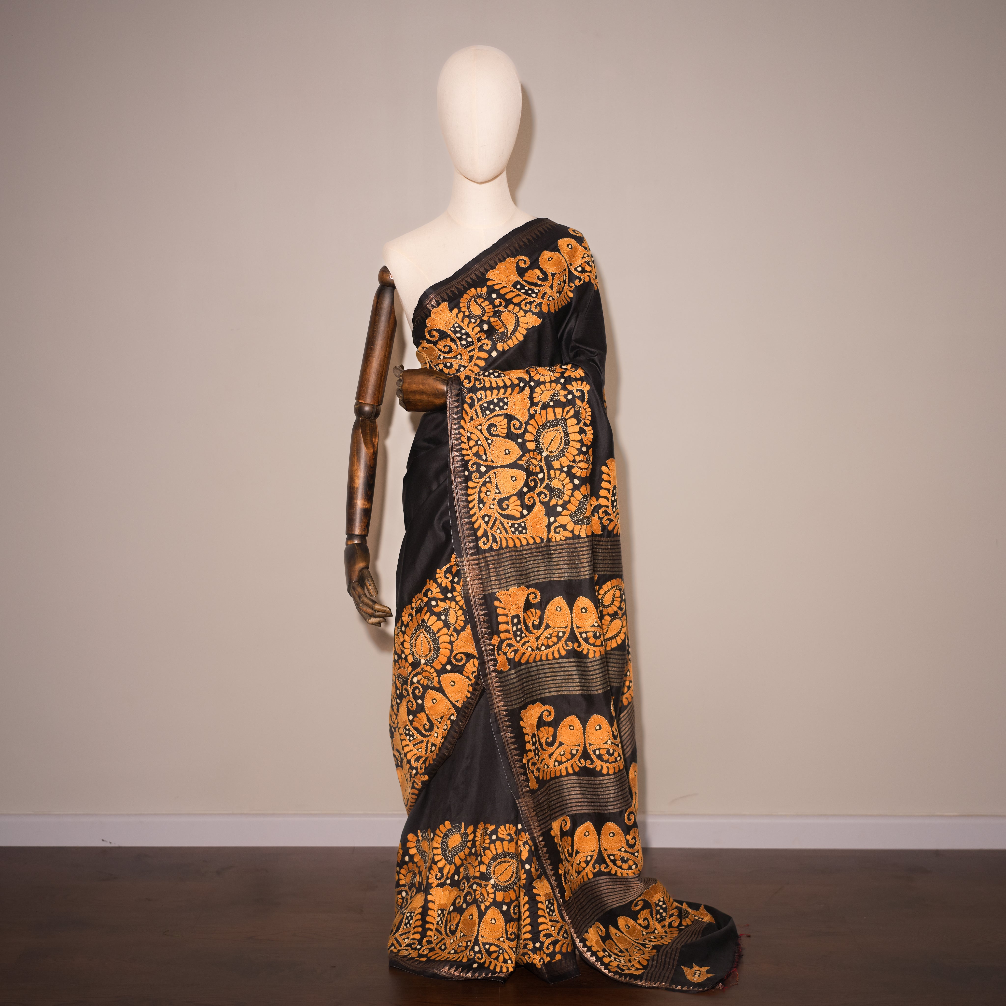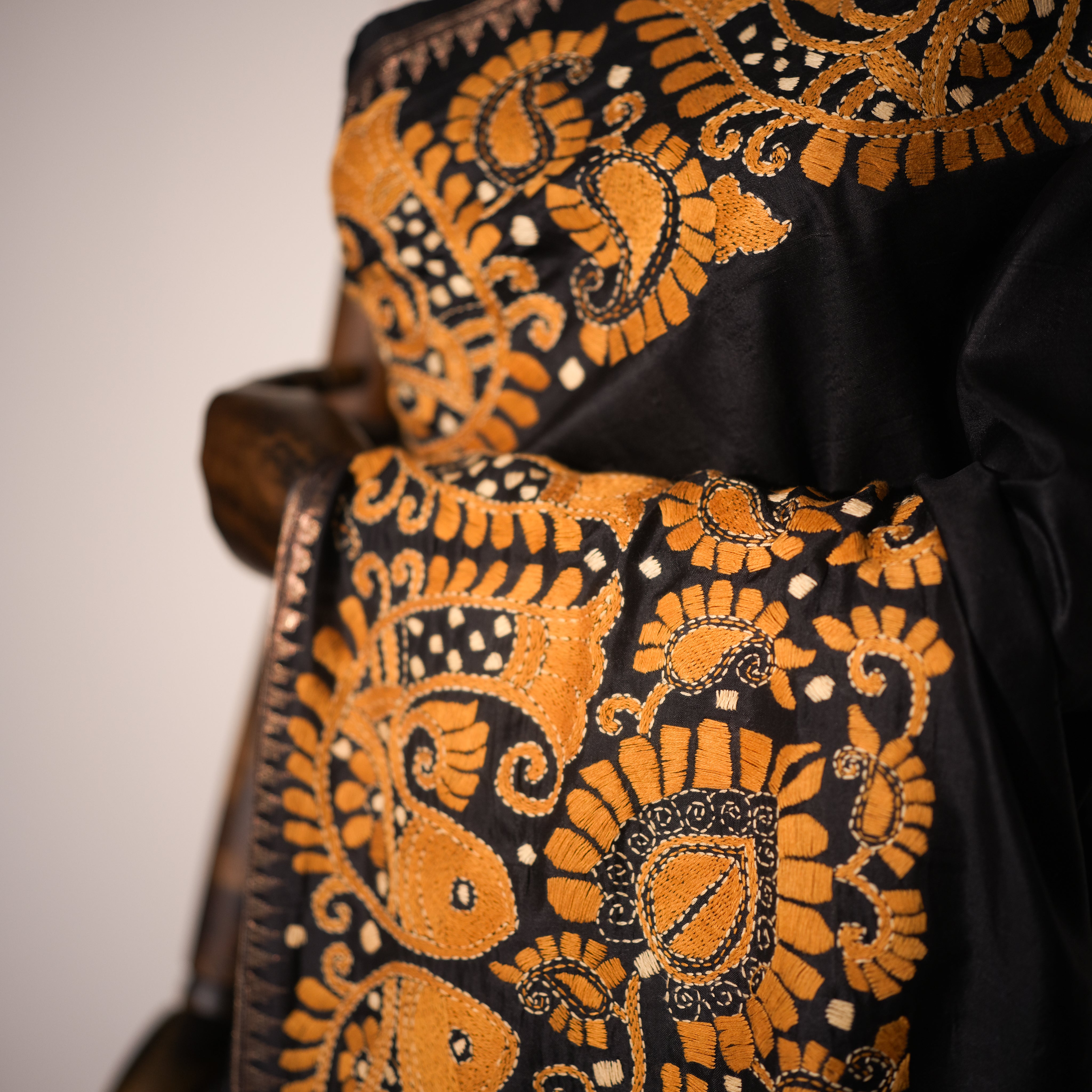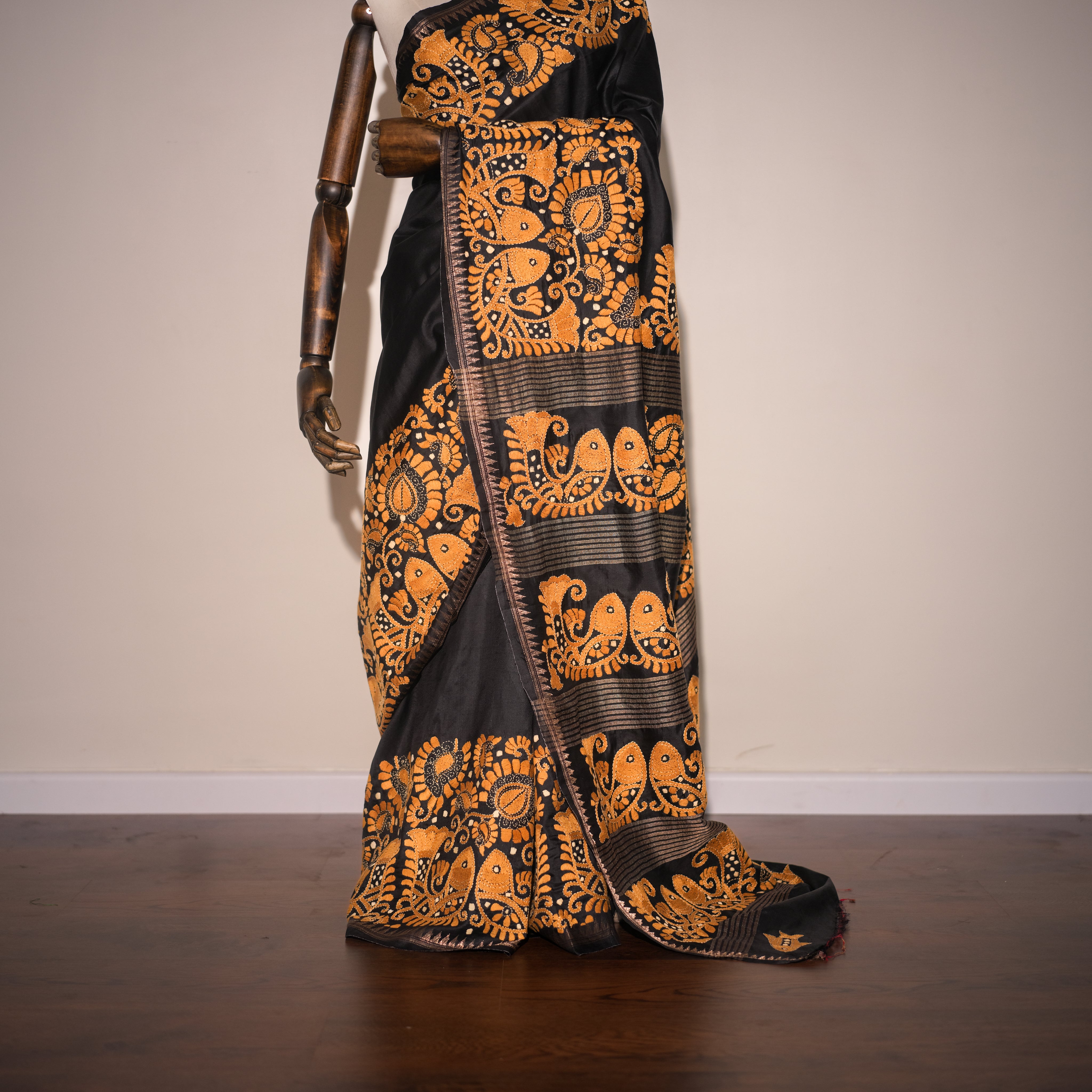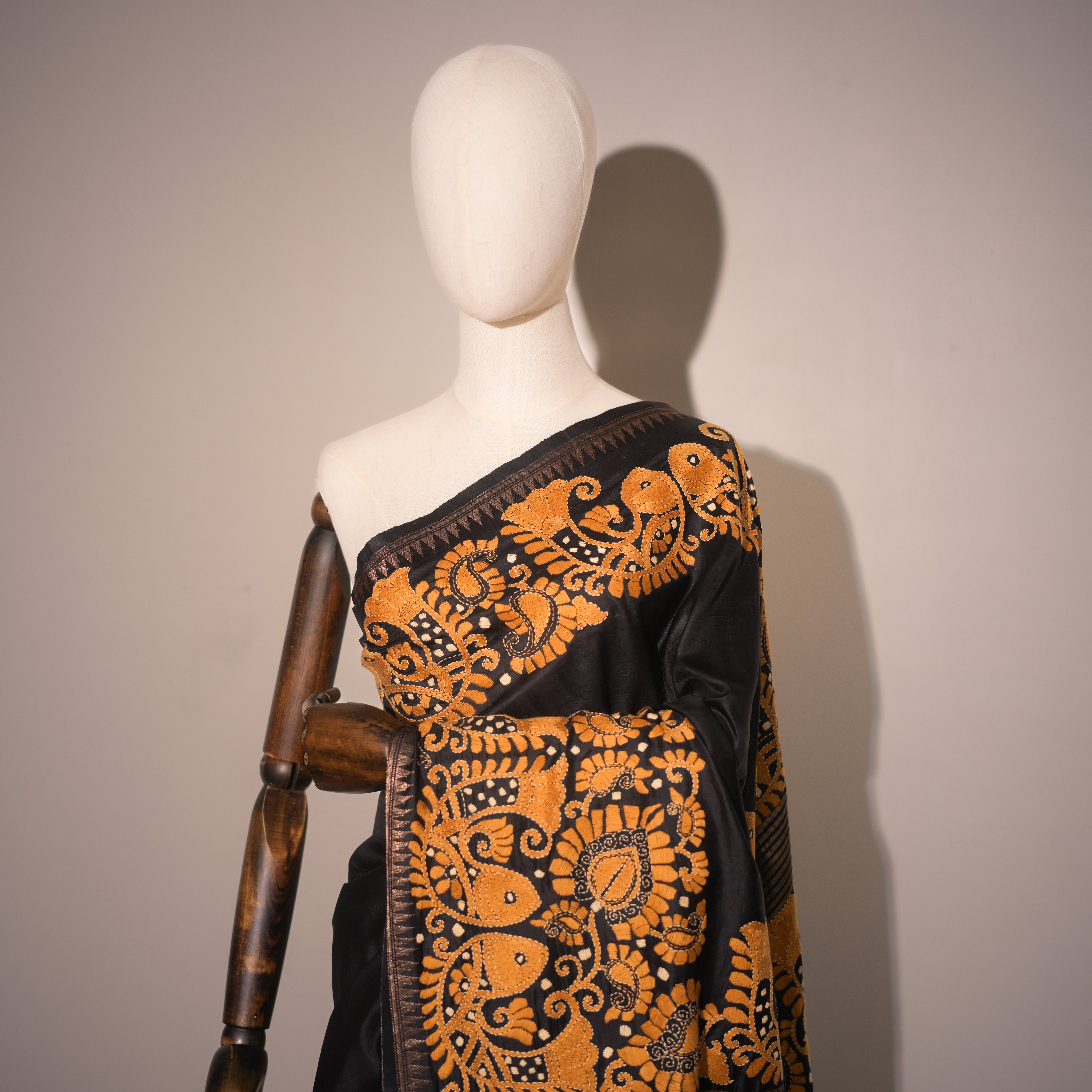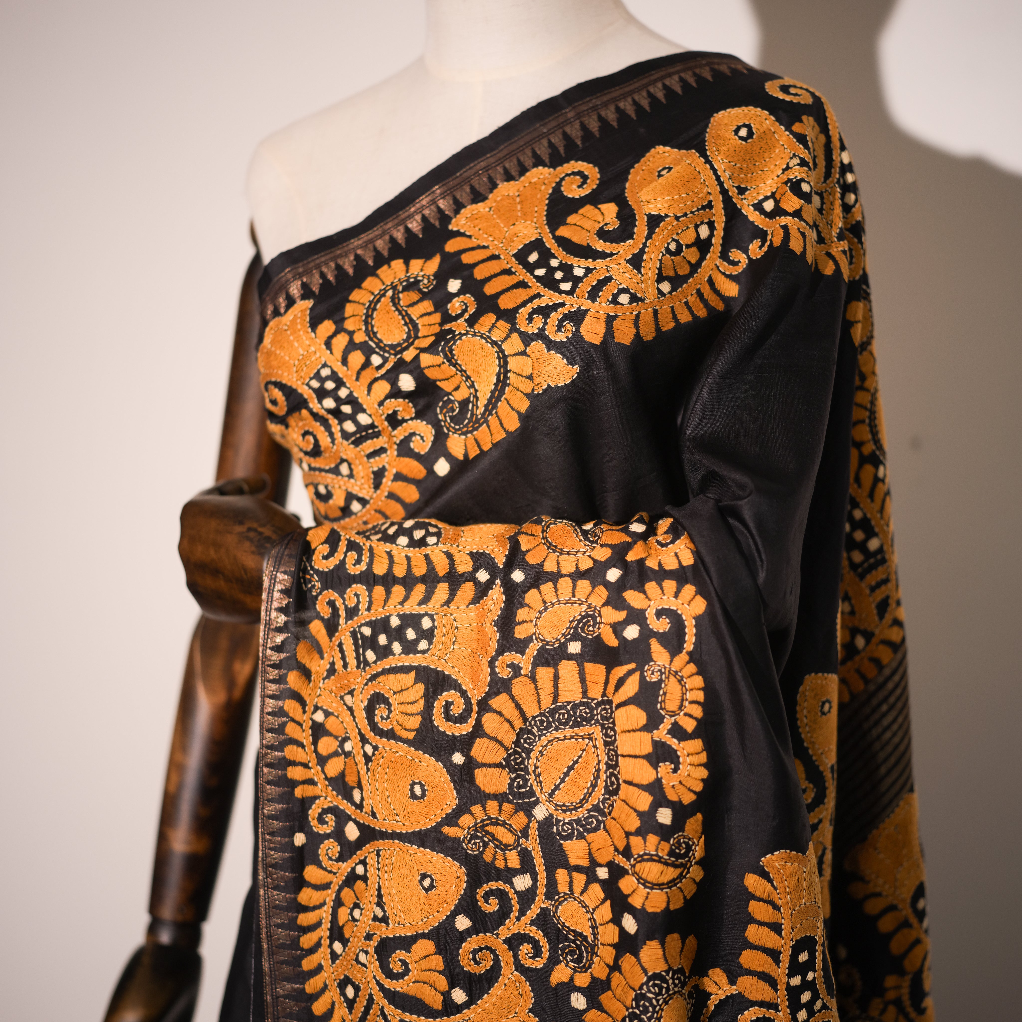 Black Kanthha Stitch Saree with Mustard Embroidery Motifs