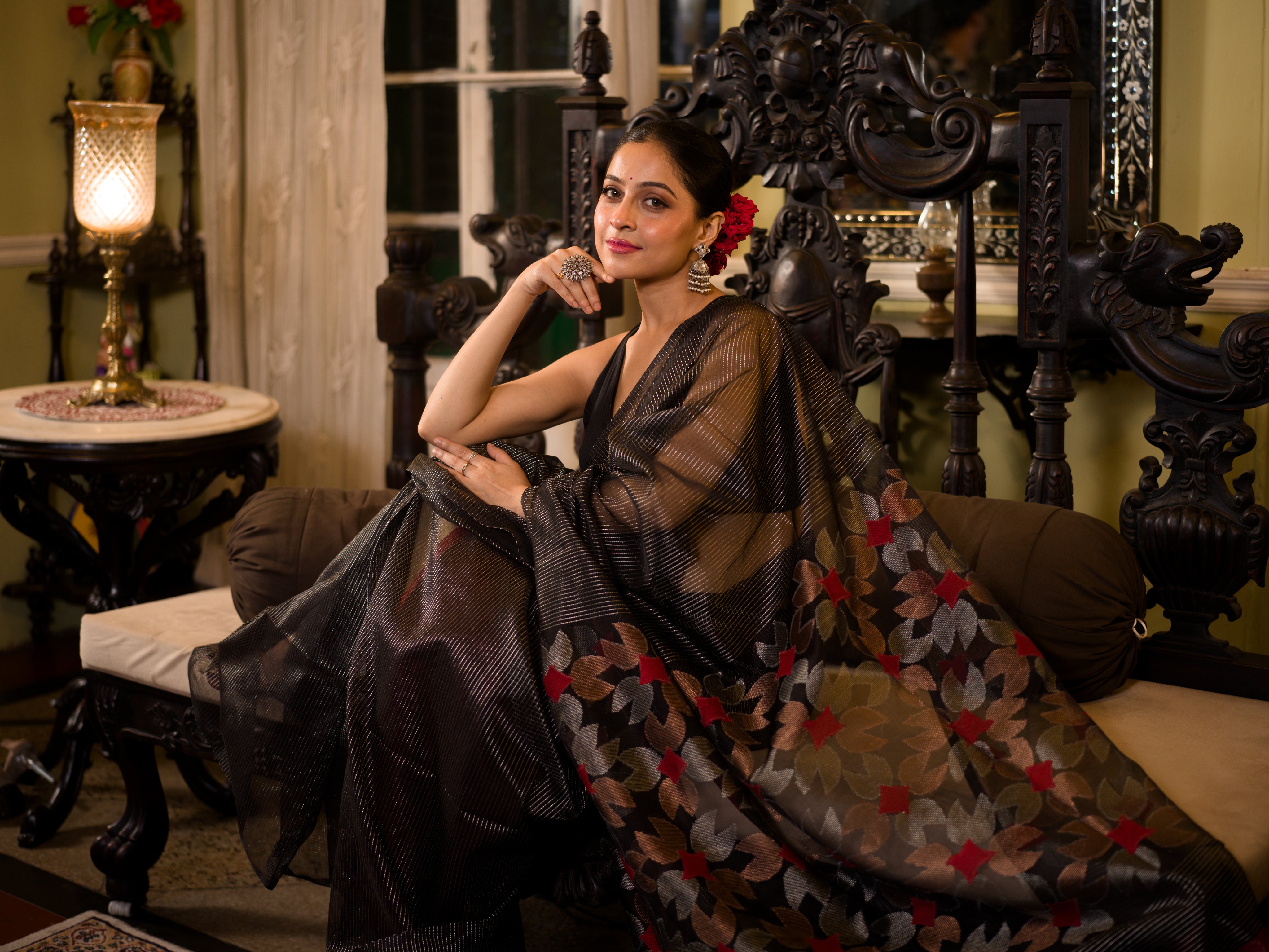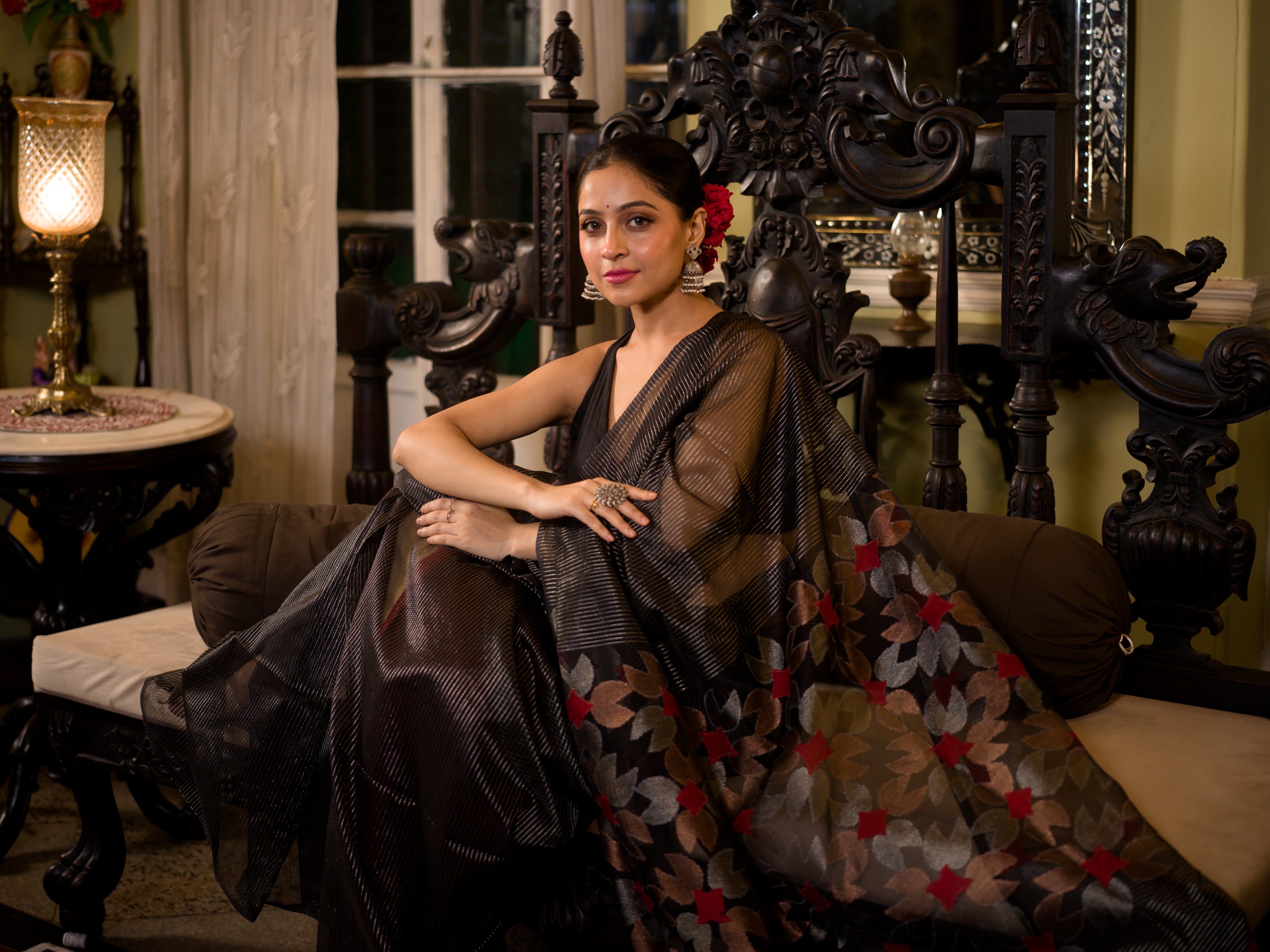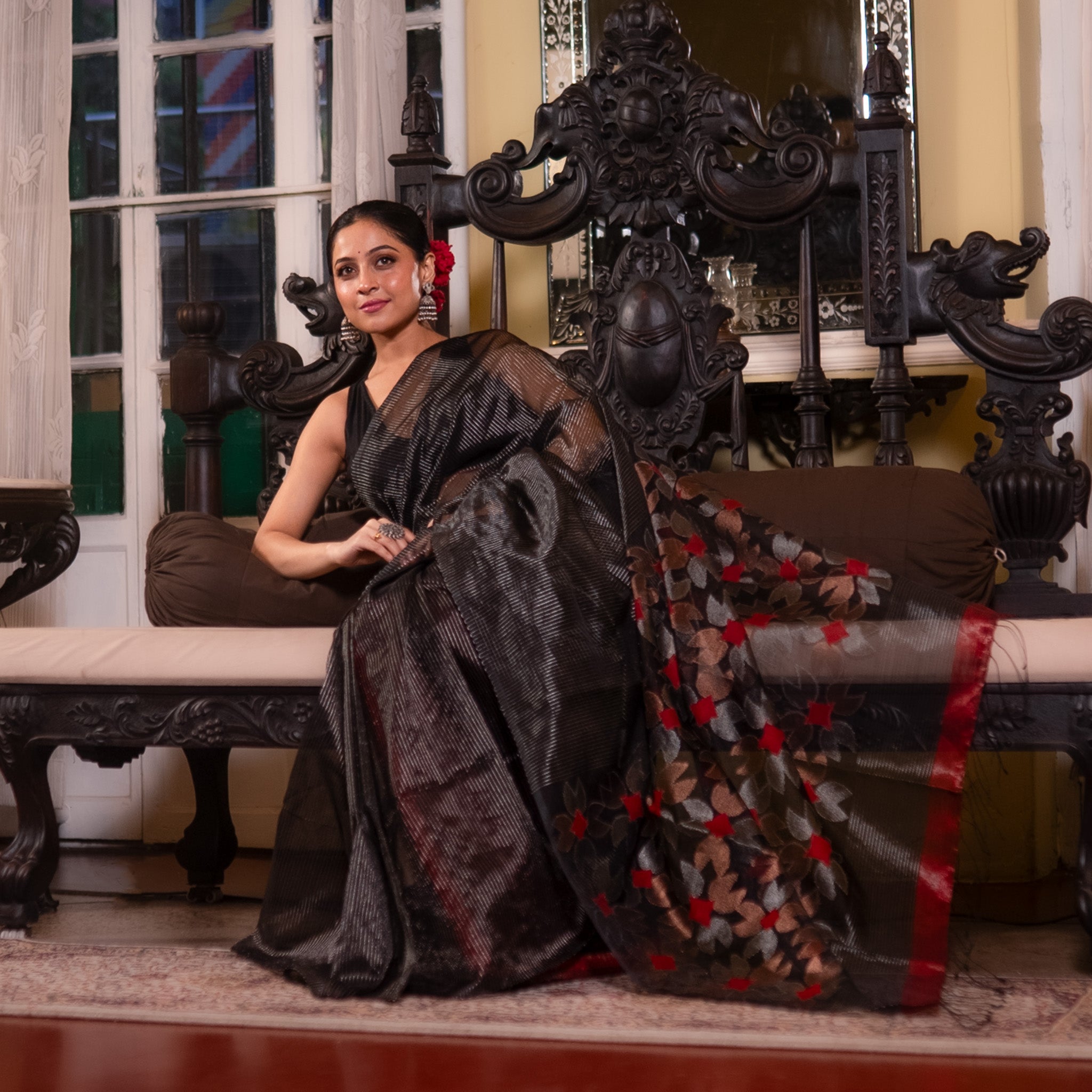 This exquisite black pure matka tissue jamdaani saree is a masterpiece of traditional weaving from West Bengal. This saree features striking handwoven floral motifs in red, golden, and silver spread gracefully across the body. The deep black base enhances the vibrancy of the motifs, creating a dramatic and elegant contrast. With its rich texture, intricate craftsmanship, and timeless appeal, this saree is perfect for festive occasions, cultural celebrations and eveing gatherings.