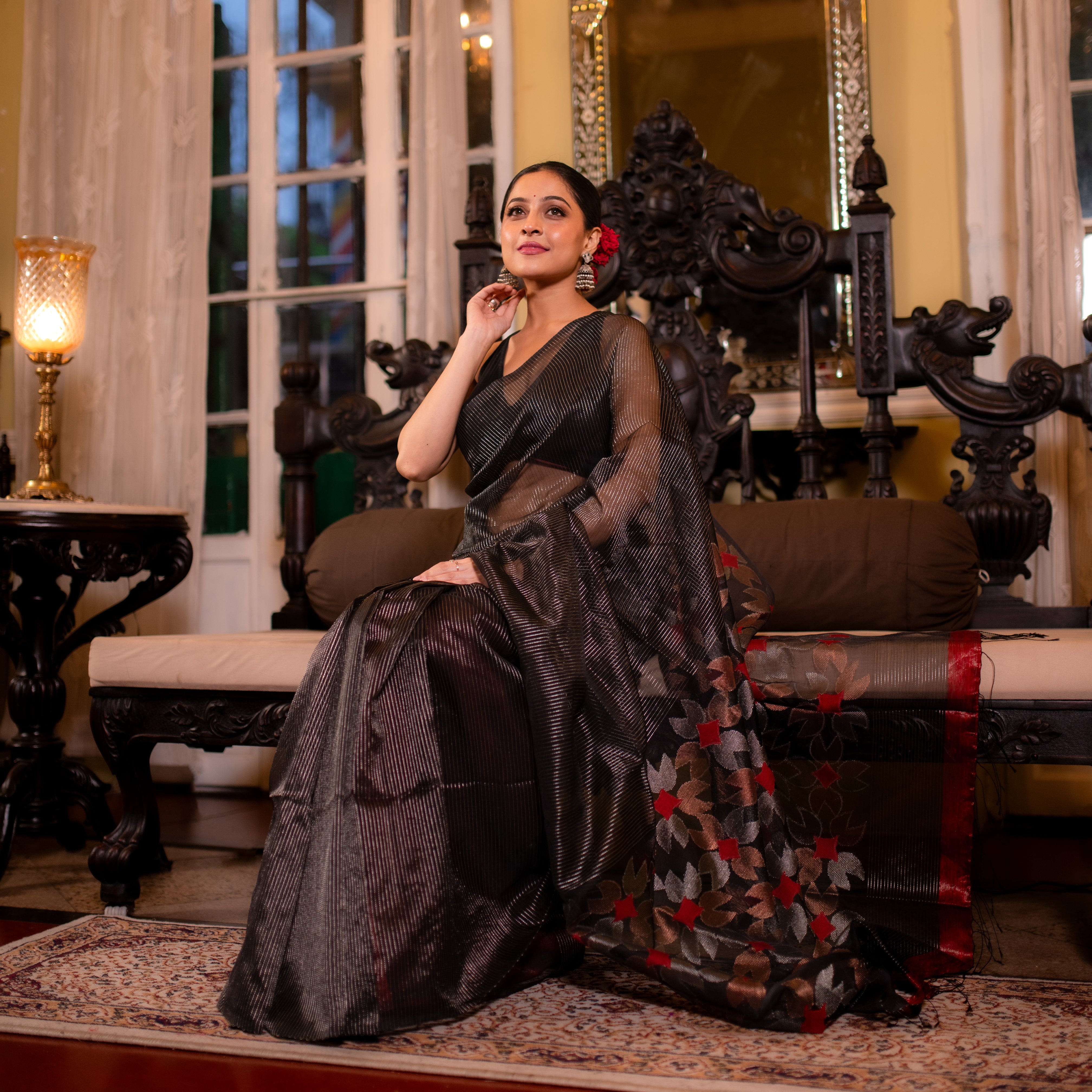 Black, Silver, Gold and Red Pure Matka Tissue Jamdaani Saree