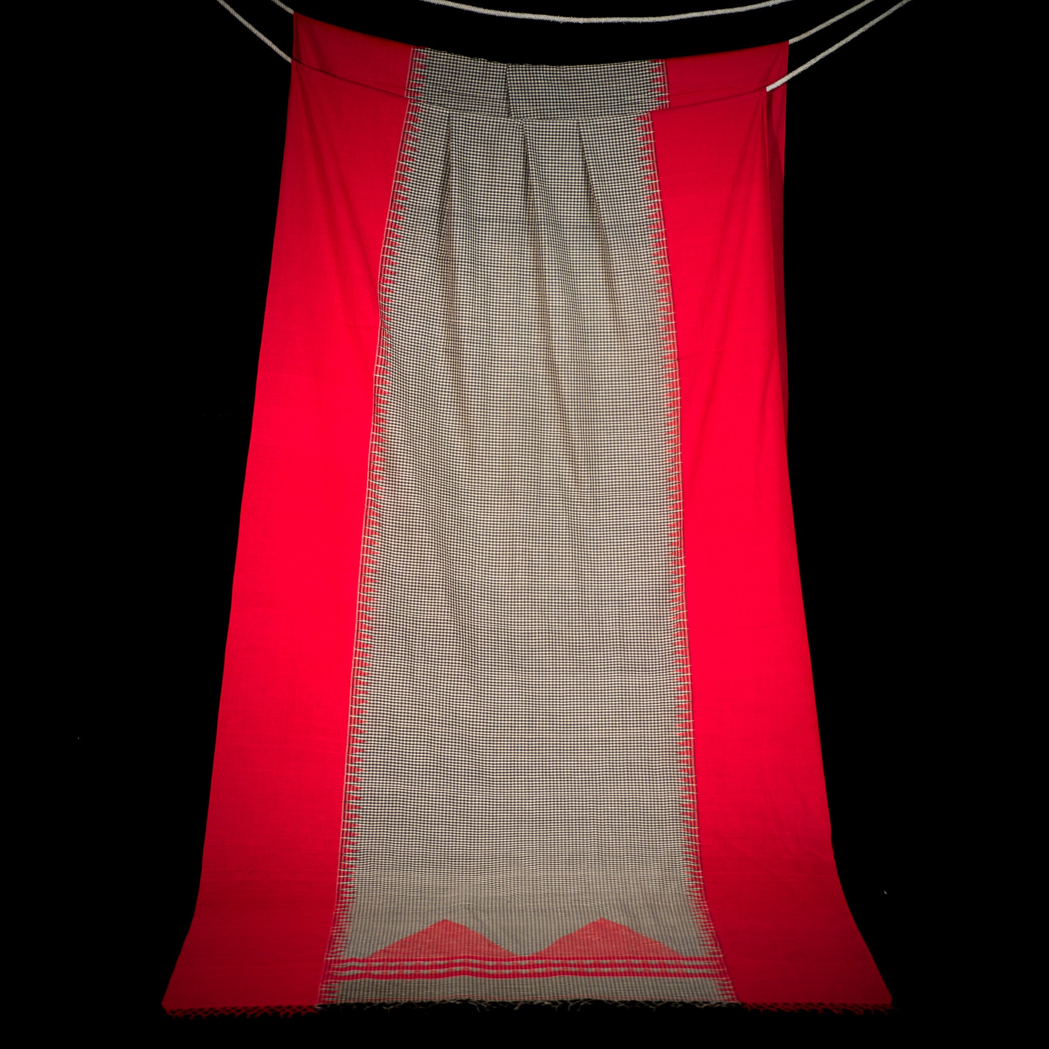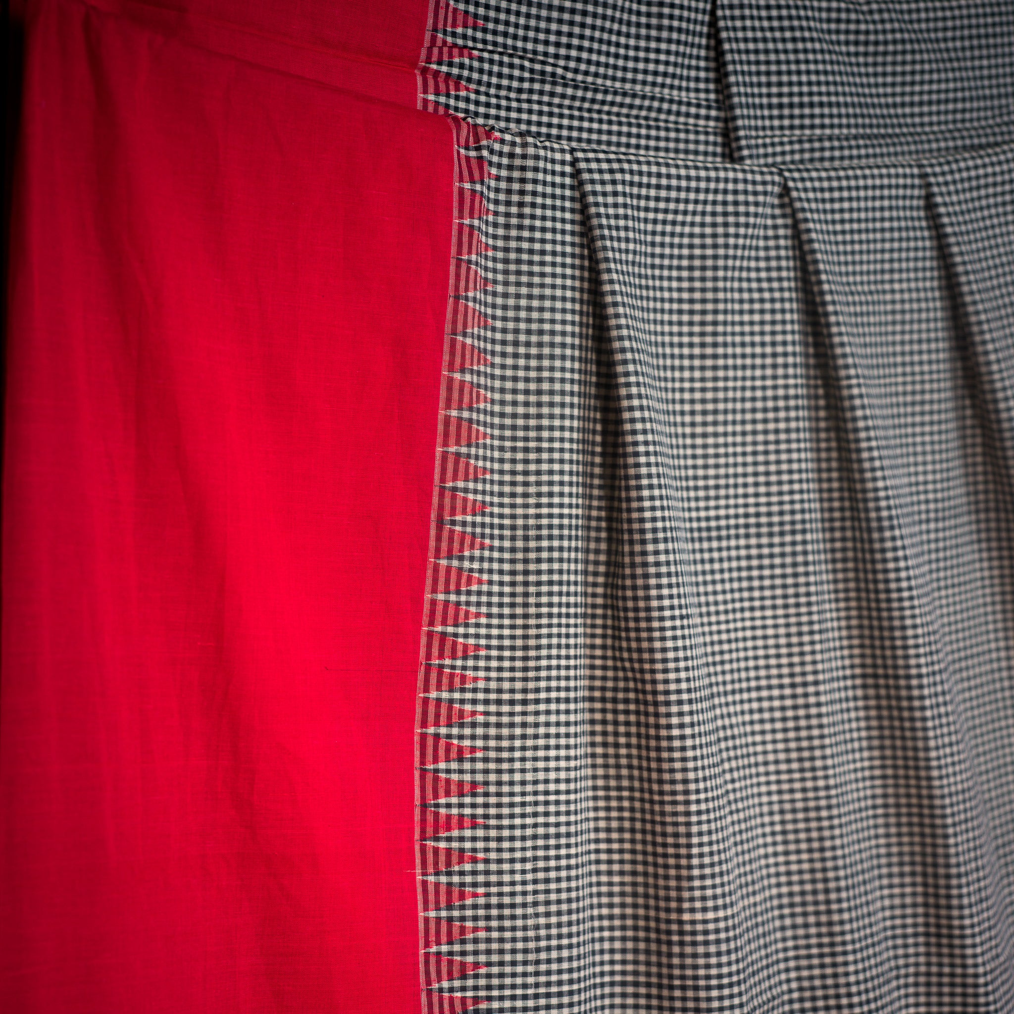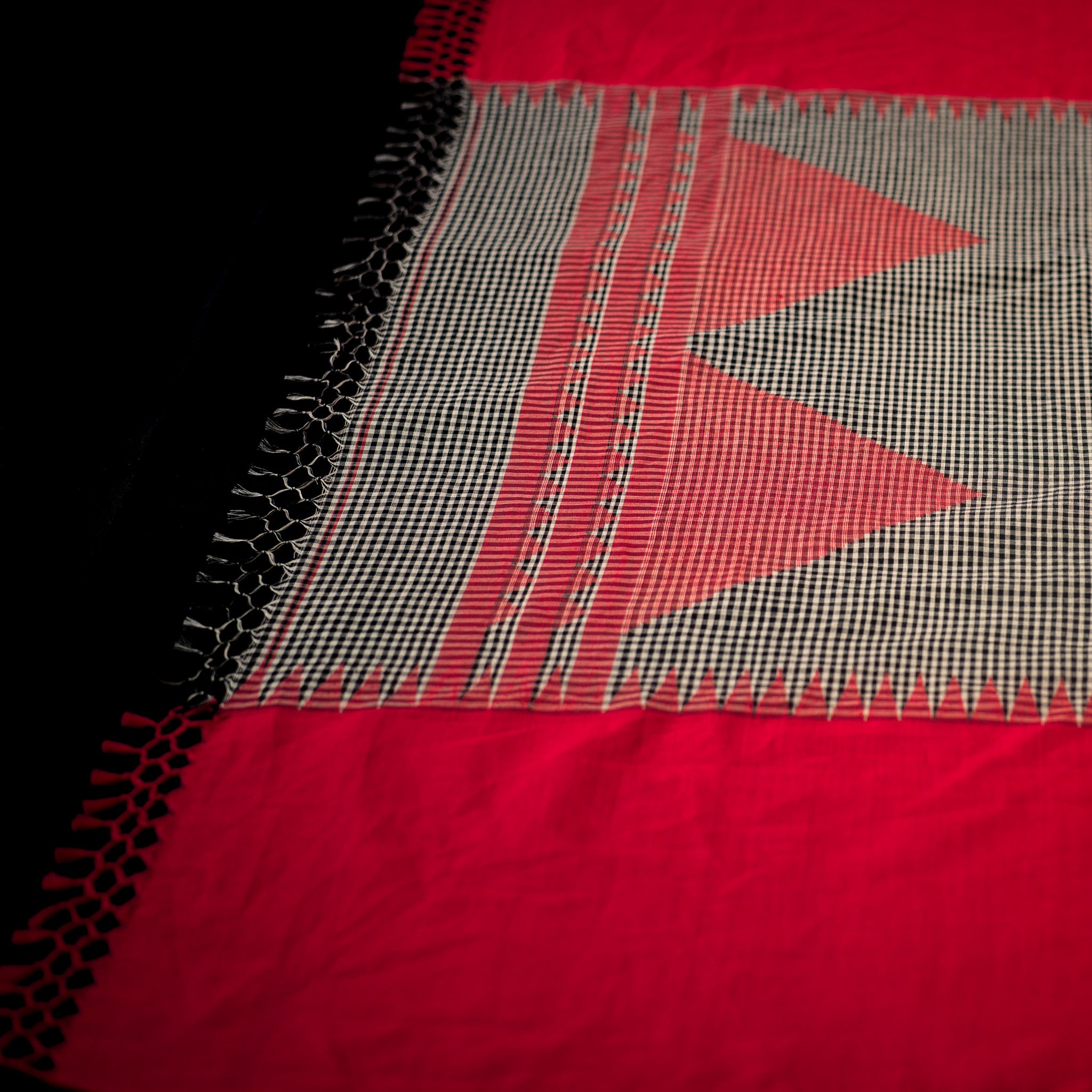 A bold interplay of contrast and craft, is a Bengal handweave saree that brings together modern geometry and traditional weaving finesse. The saree features a black and white micro-checked body flanked by fiery red borders, with a striking triangular pallu that adds drama to every drape. A powerful choice for those who like their tradition served with an edge.