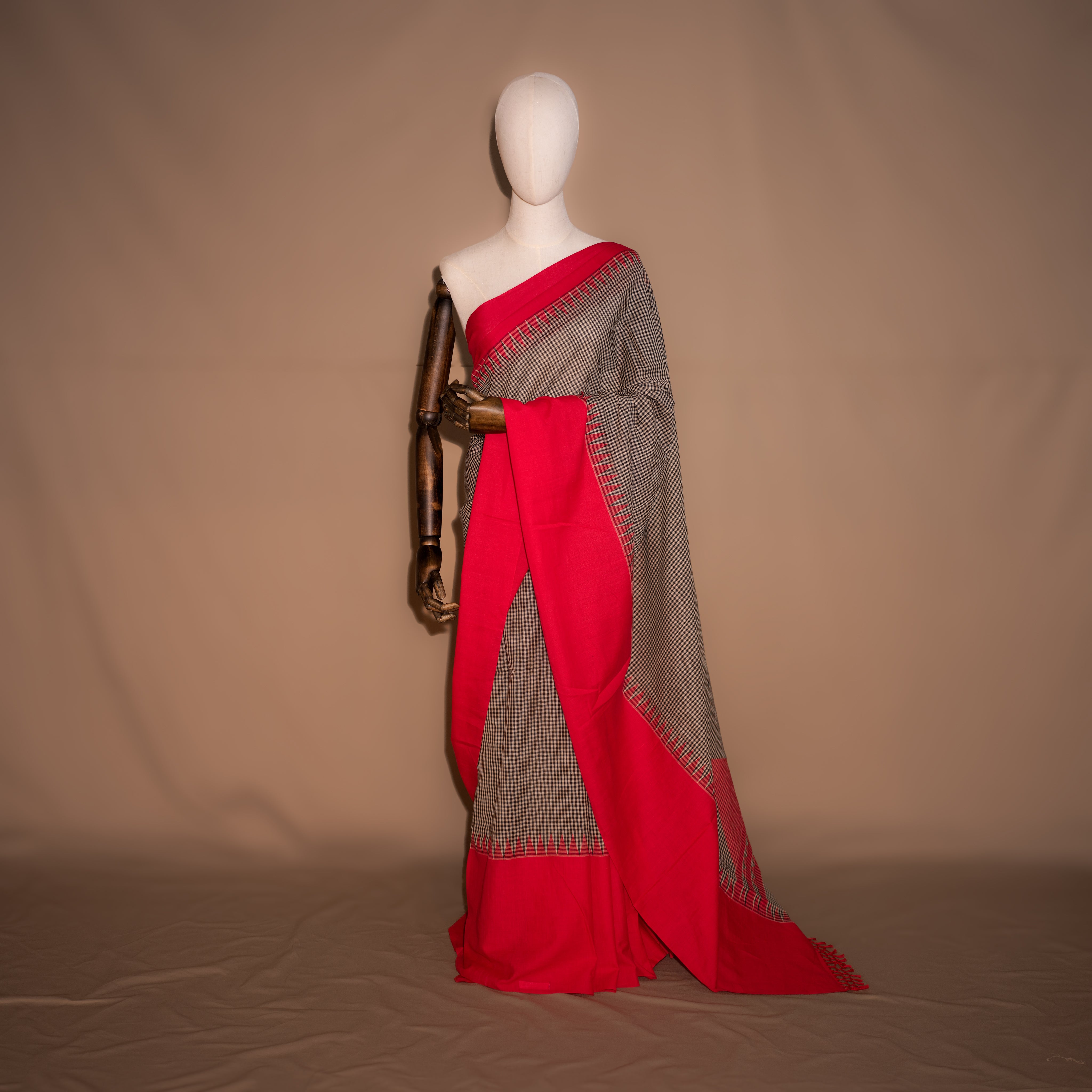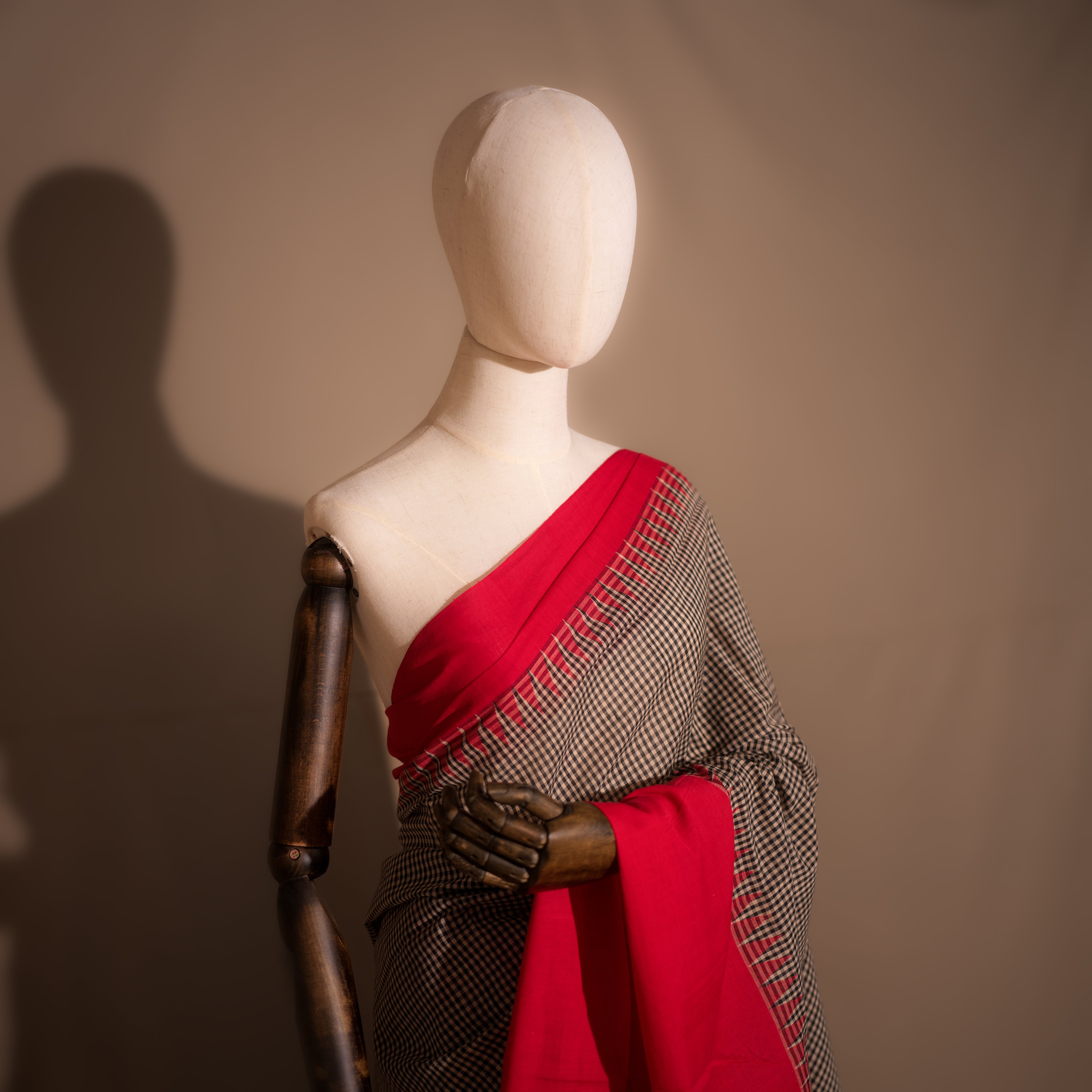 Black & White Checked Pure Cotton Saree with Broad Red Borders