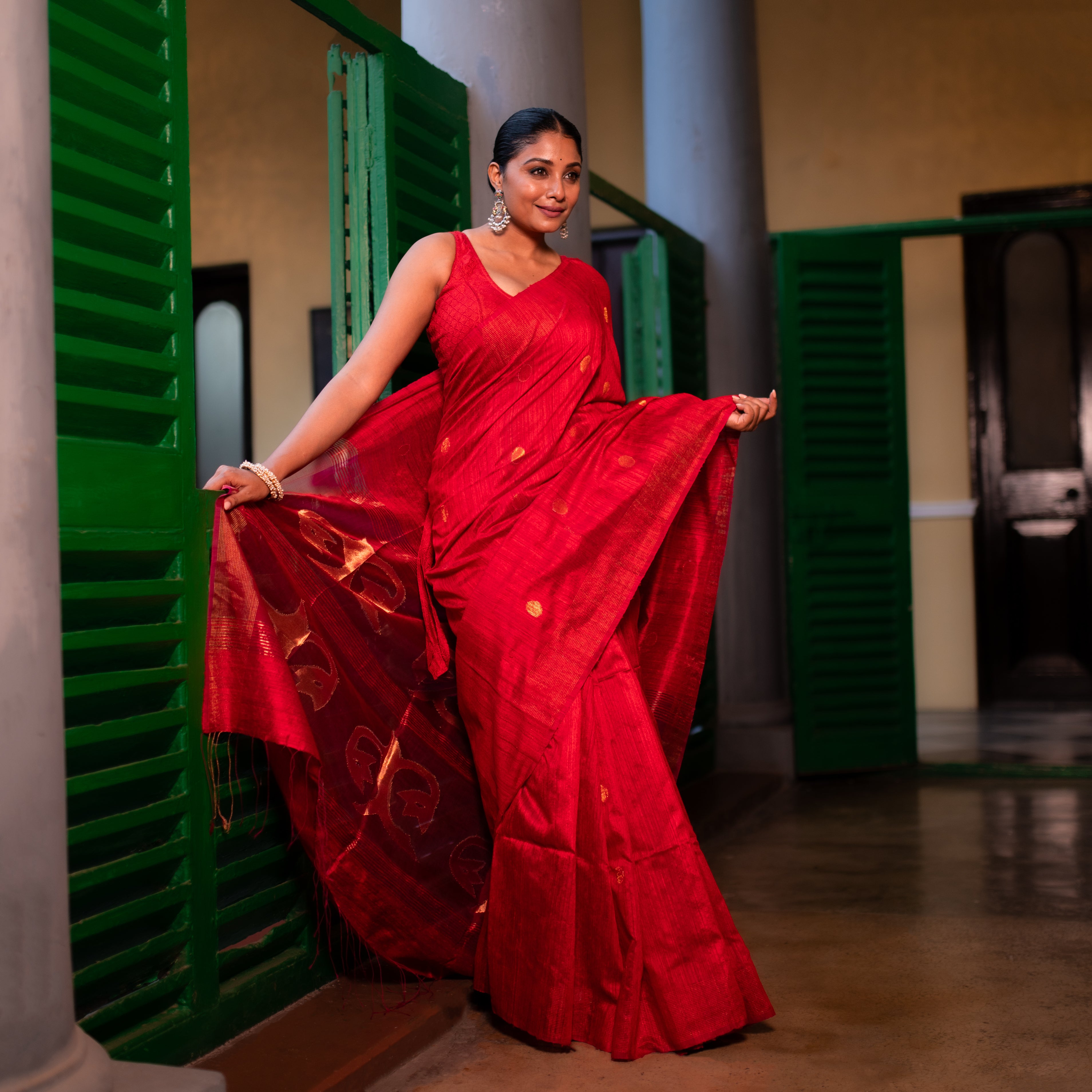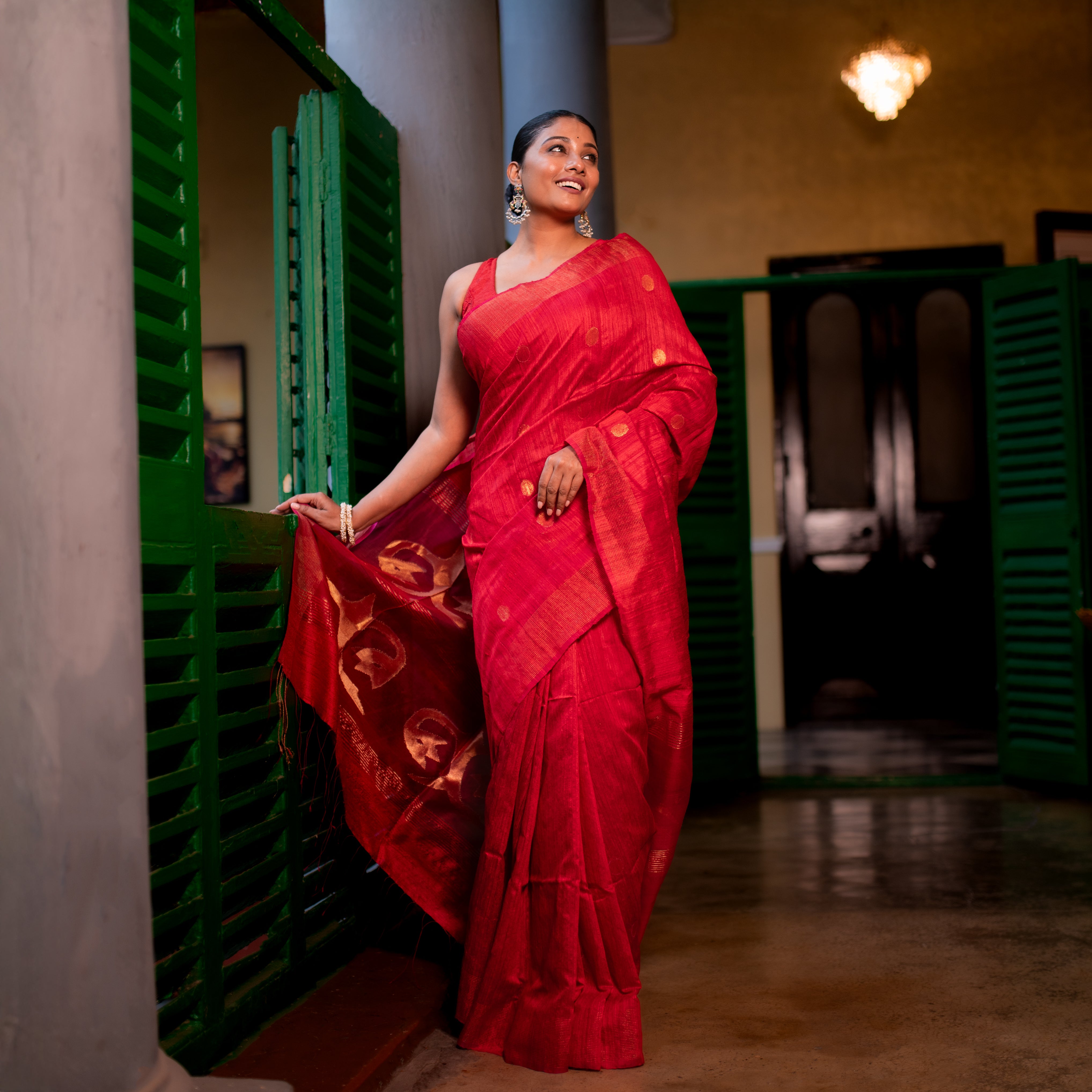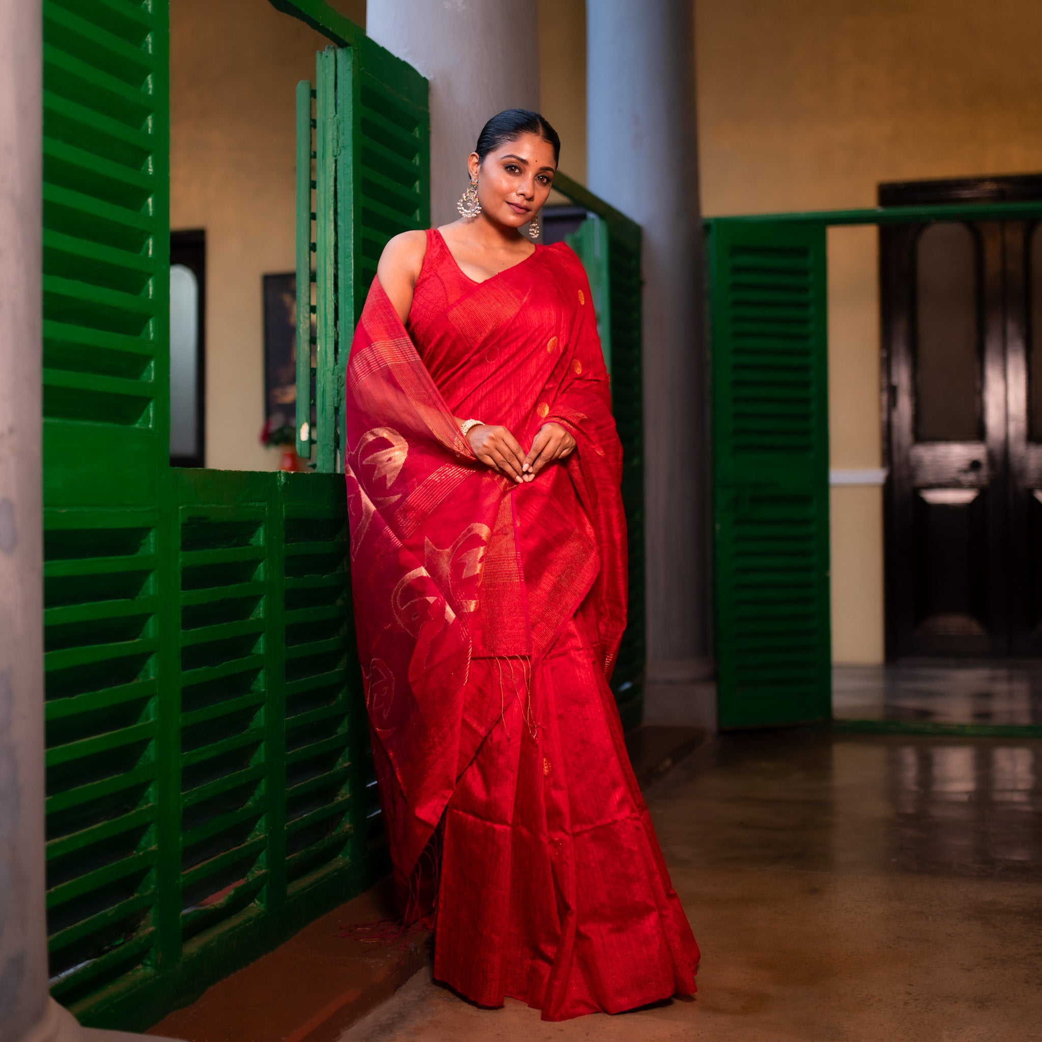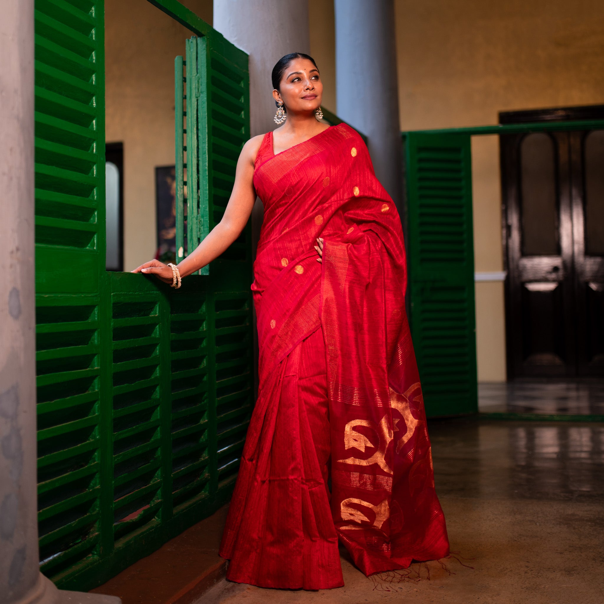 This stunning bright red pure Matka Silk saree is a radiant example of traditional weaving from West Bengal. Handwoven with rich matka silk, it is beautifully embellished with fine gold thread work that enhances its vibrant base. The bold color paired with intricate detailing makes it perfect for weddings, festive occasions, and cultural celebrations, offering both elegance and grandeur in every drape.