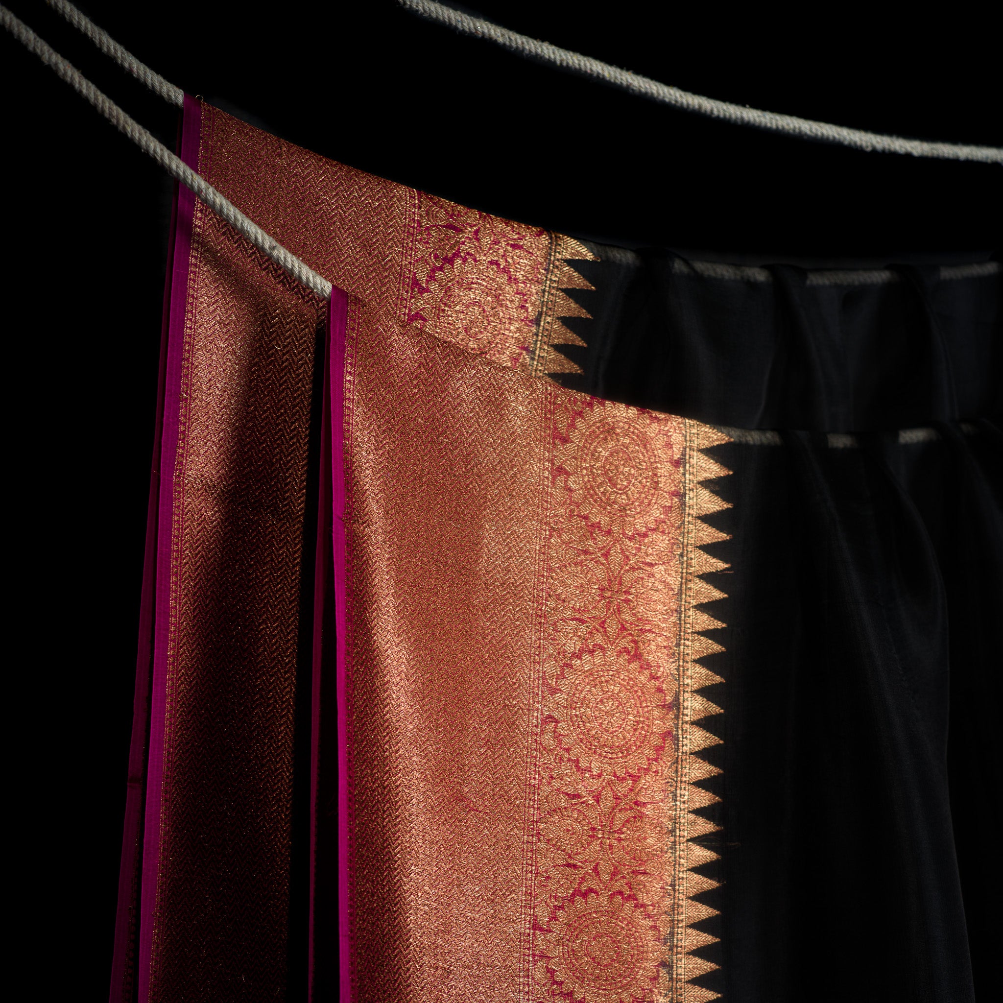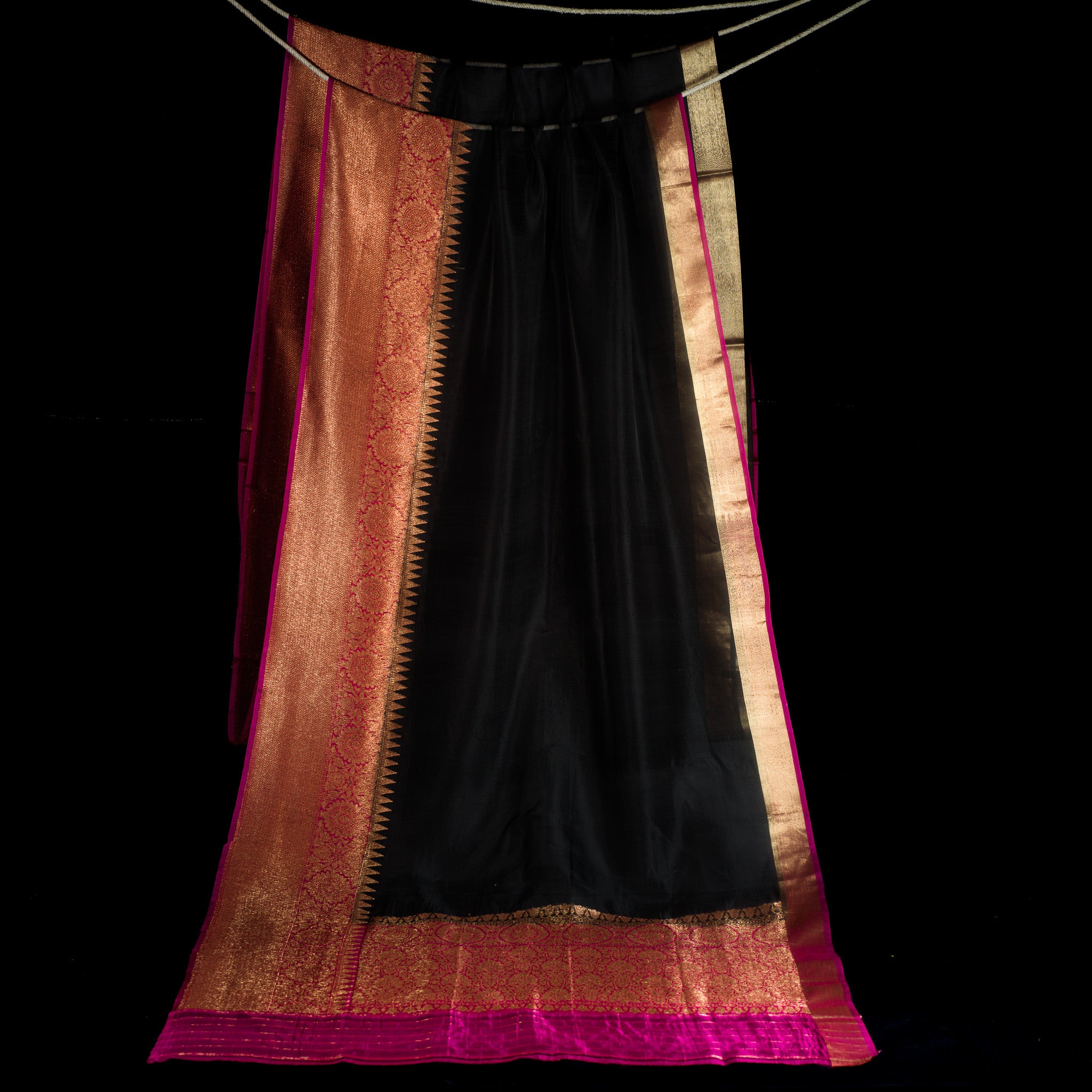 Deep Black Kora Banarasi Silk Saree with Pink-Gold Zari Border