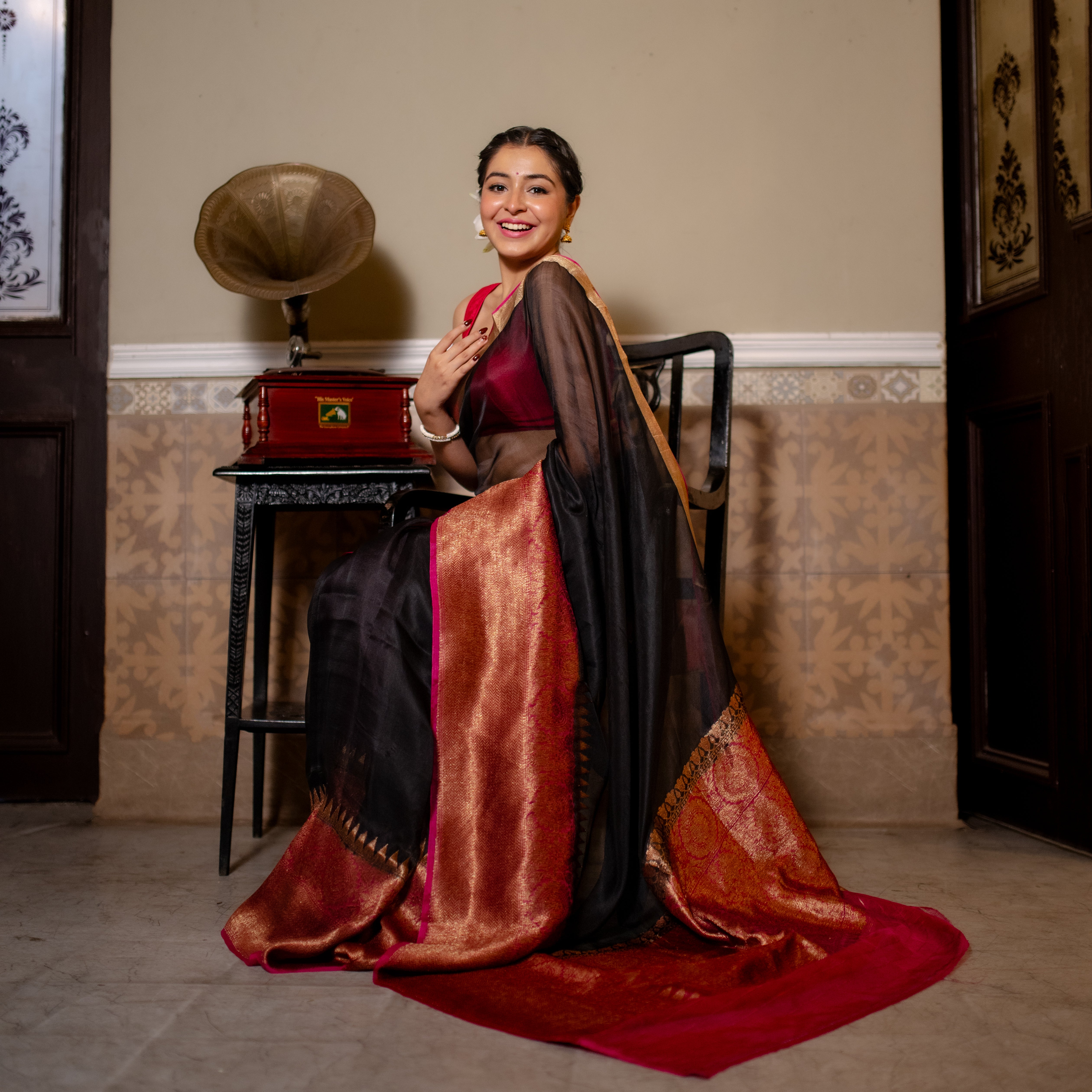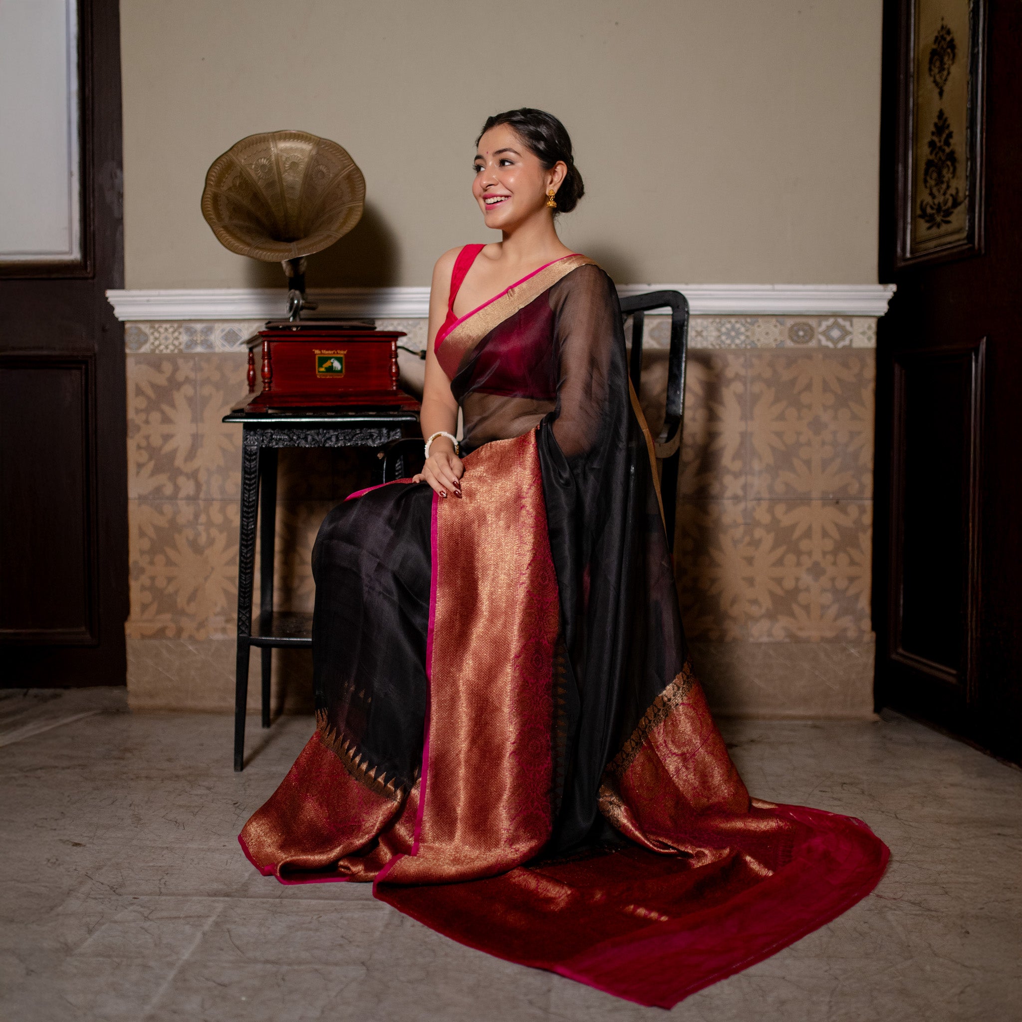 - Colour - Deep black with pink and gold zari accents.