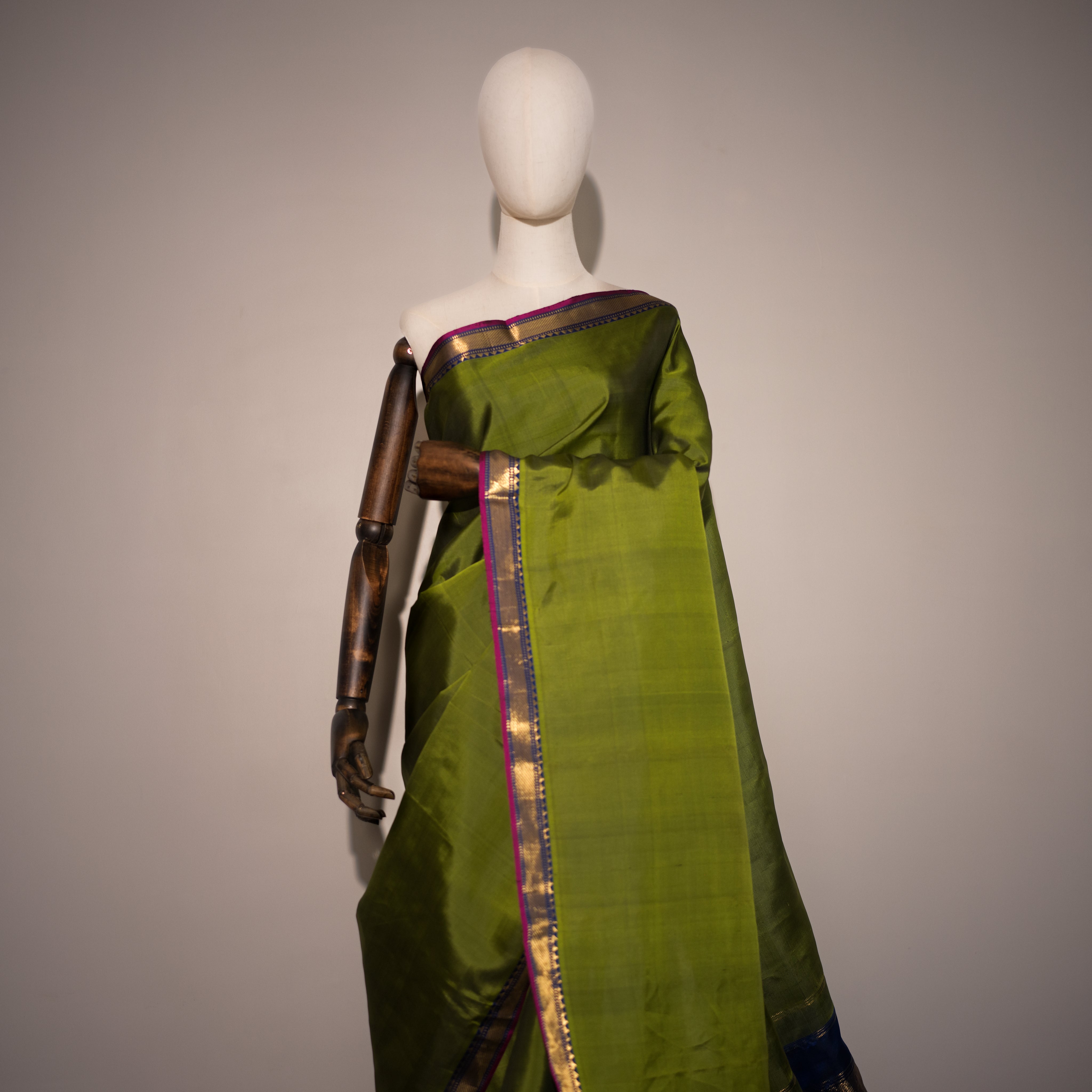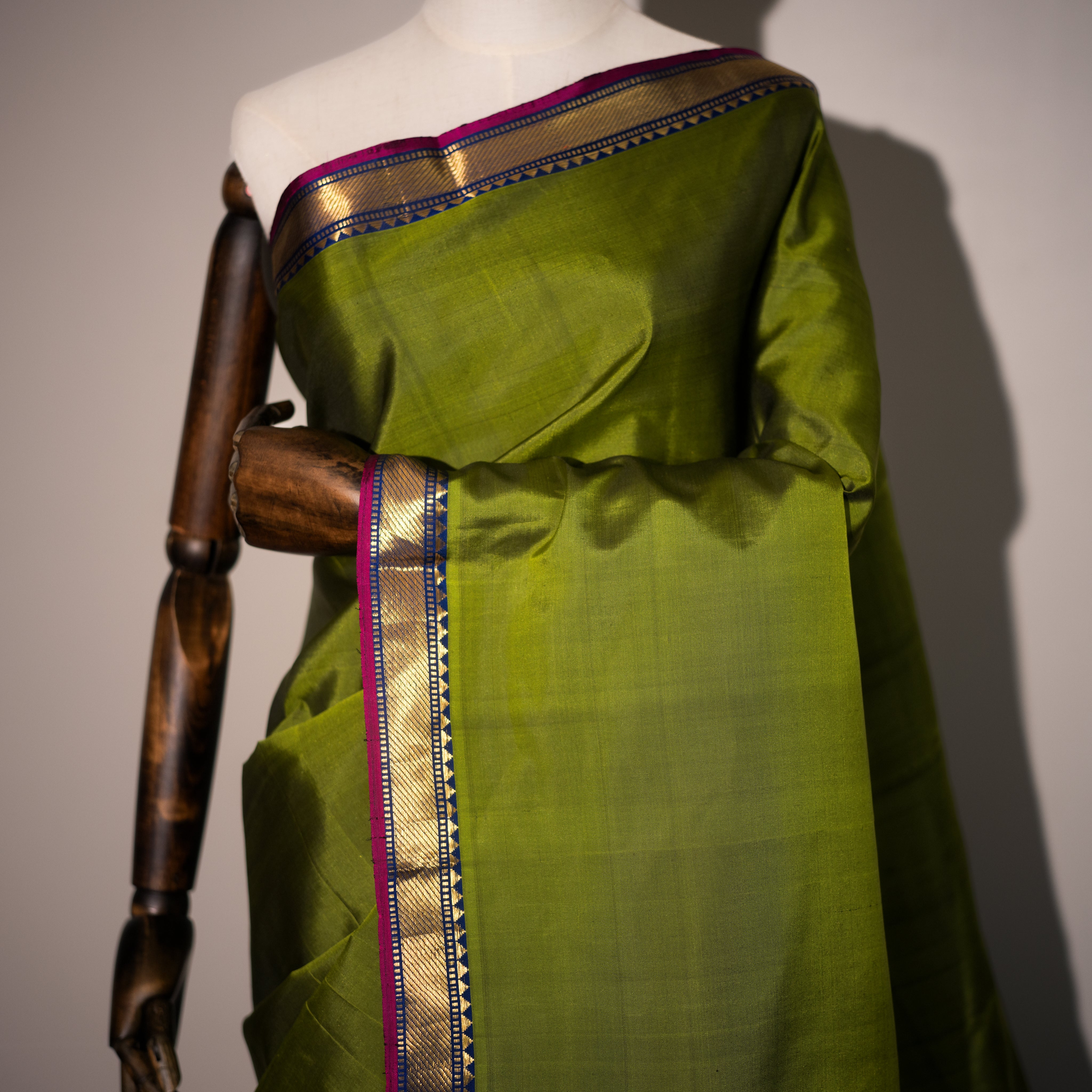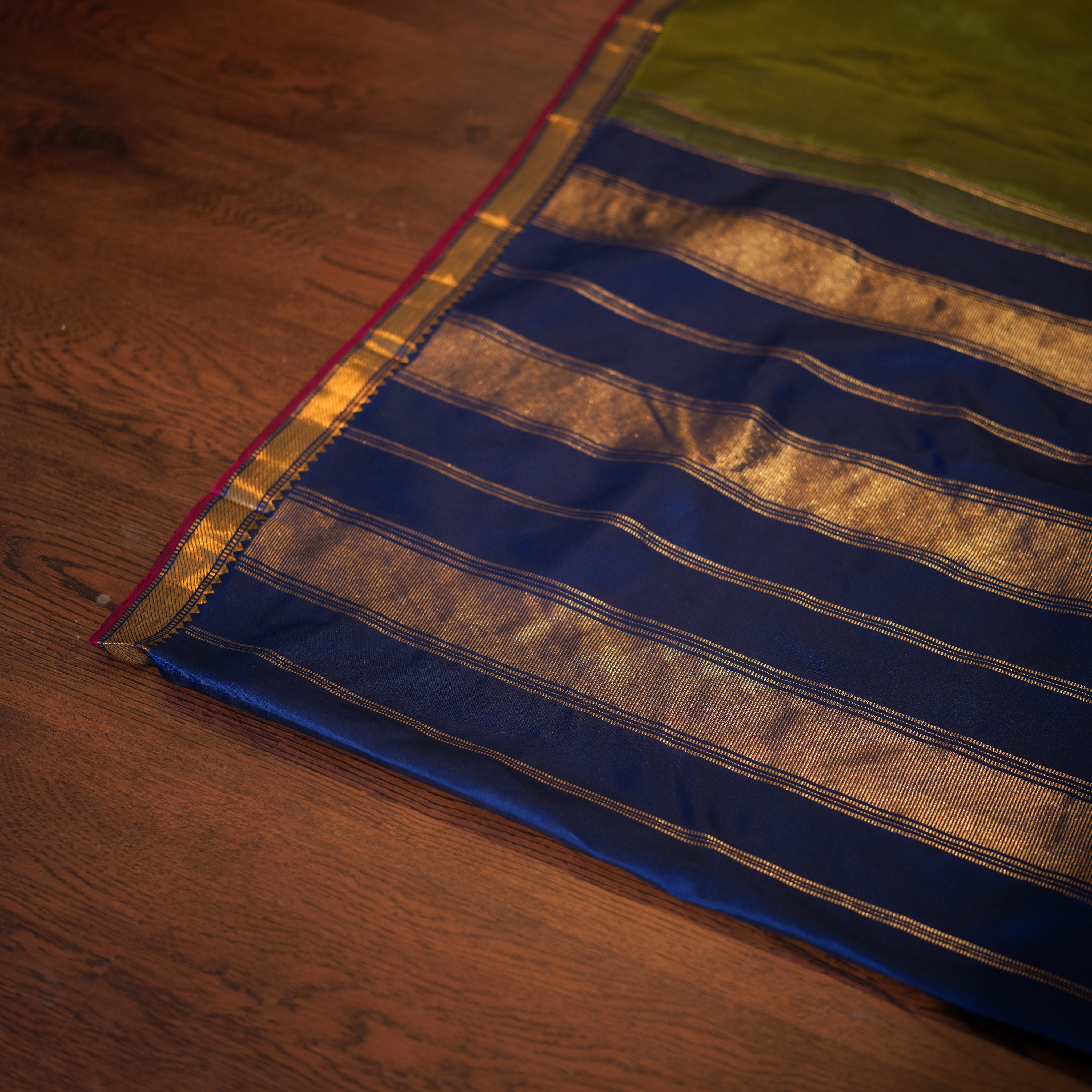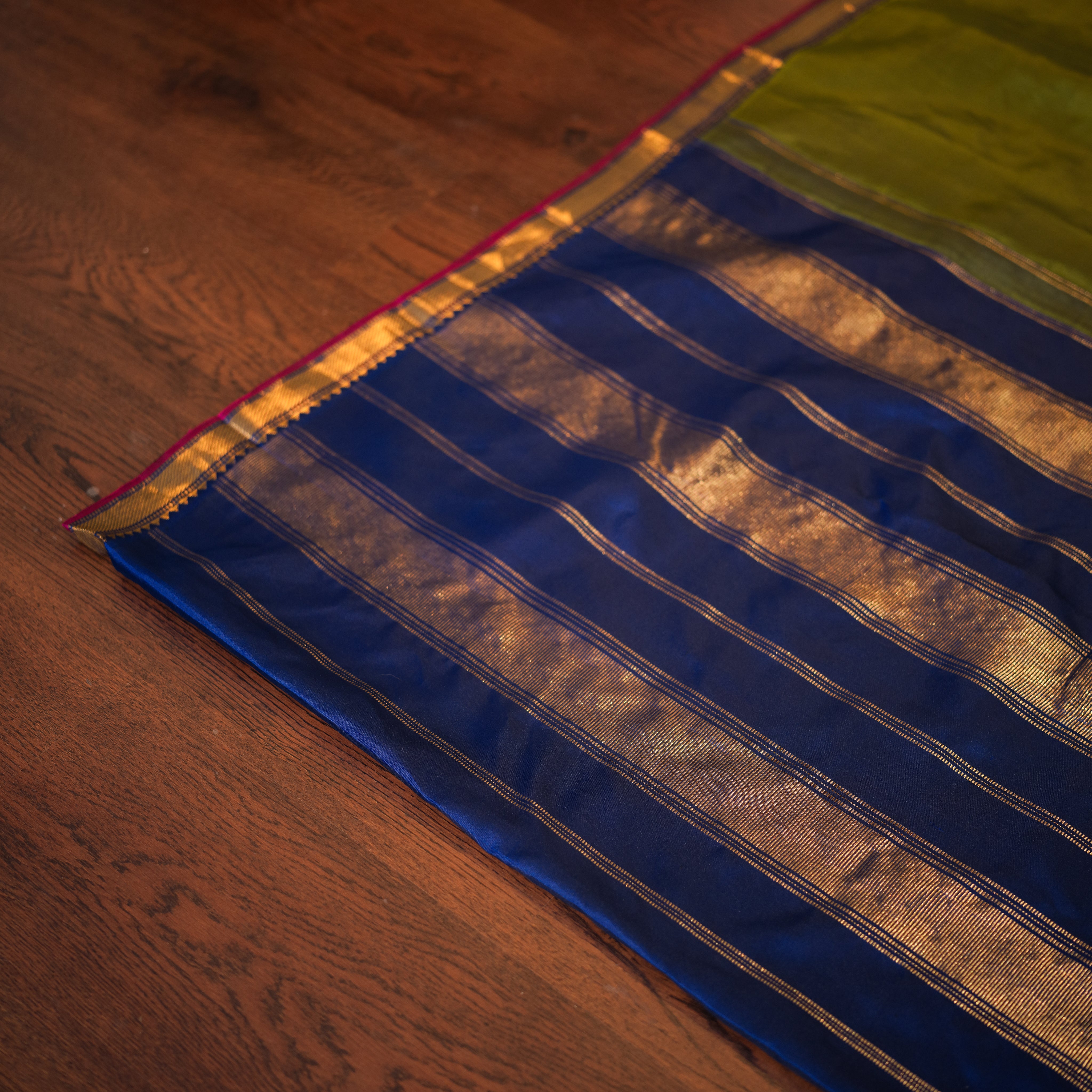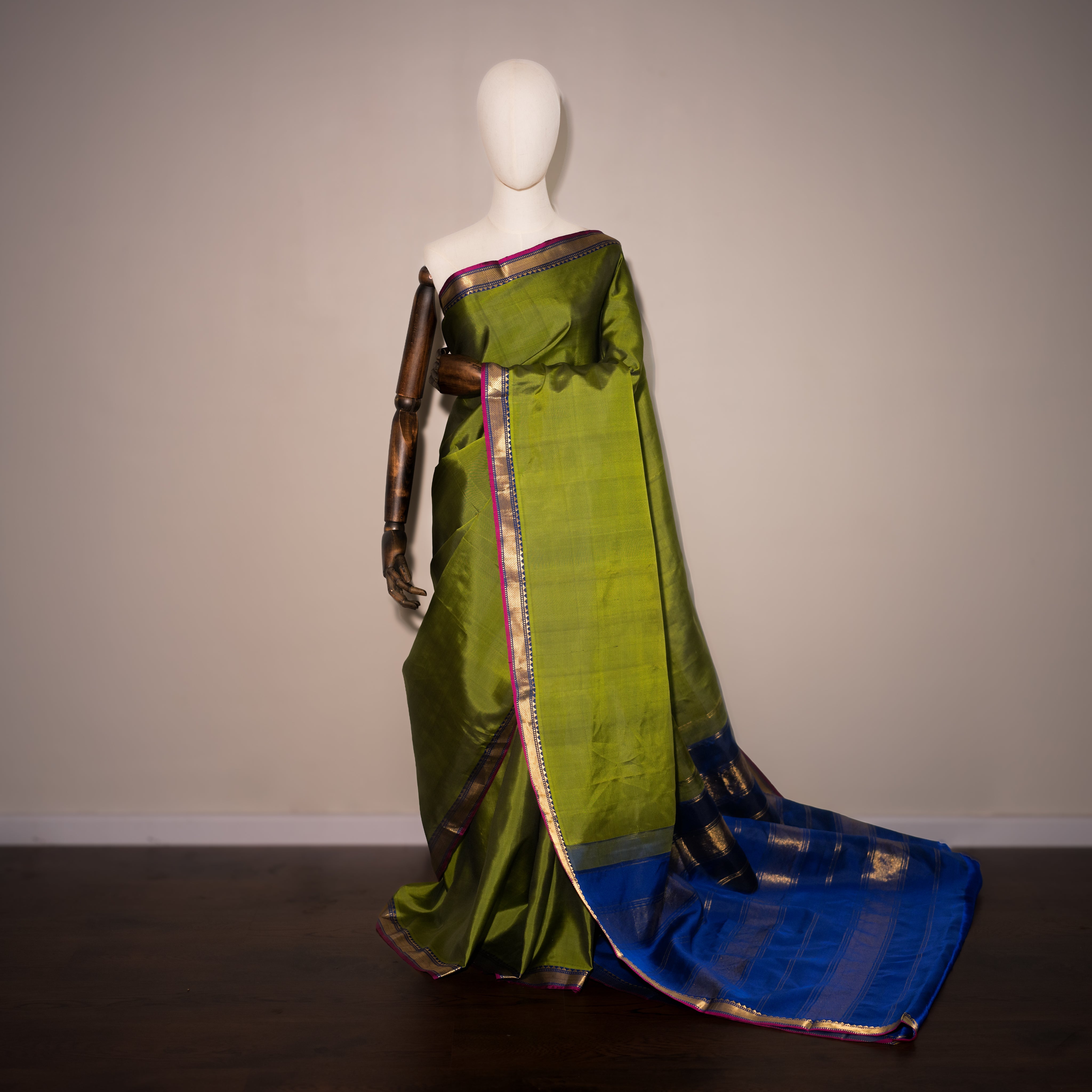 Color: Vibrant Parrot Green body with Royal Blue pallu, Magenta border and Gold Zari work