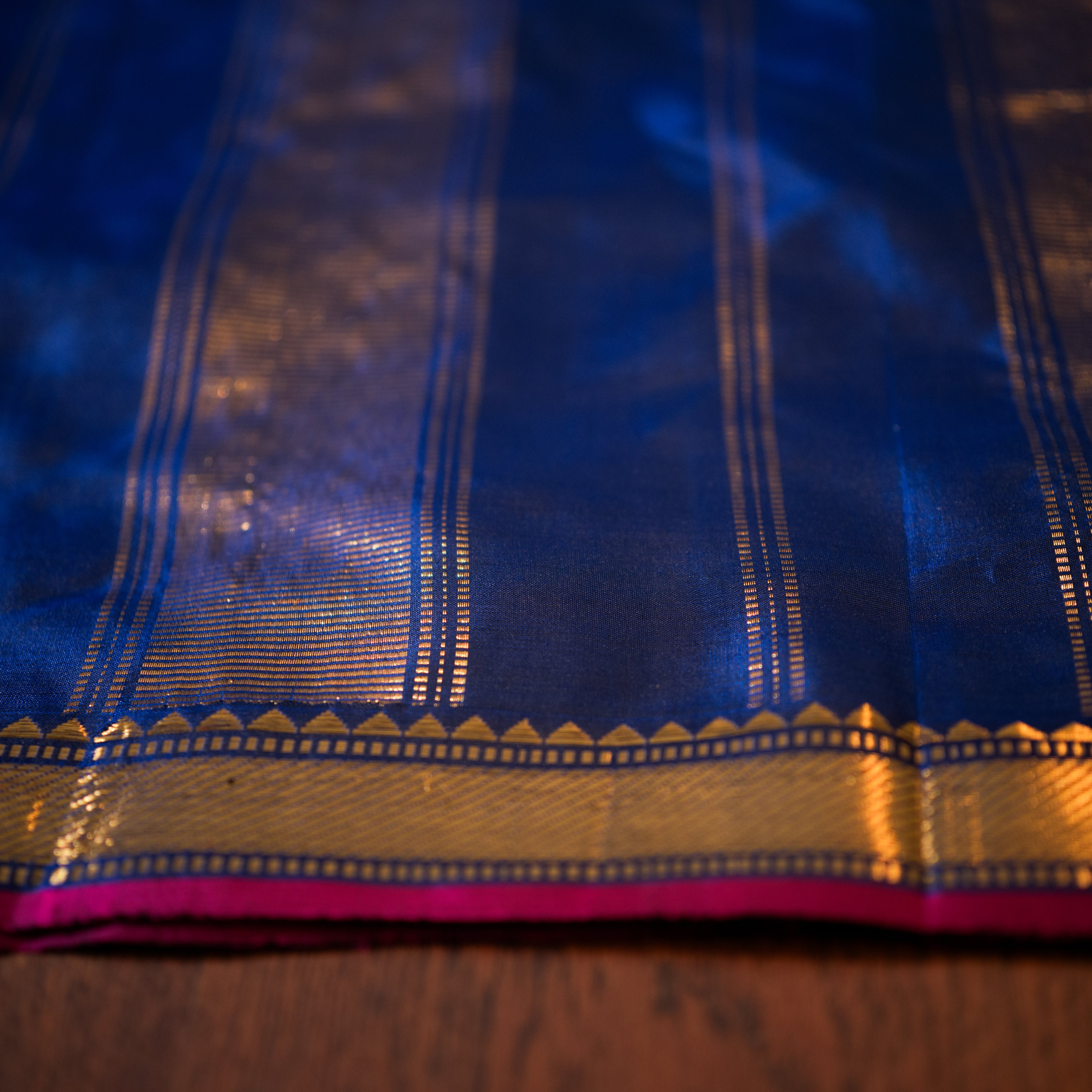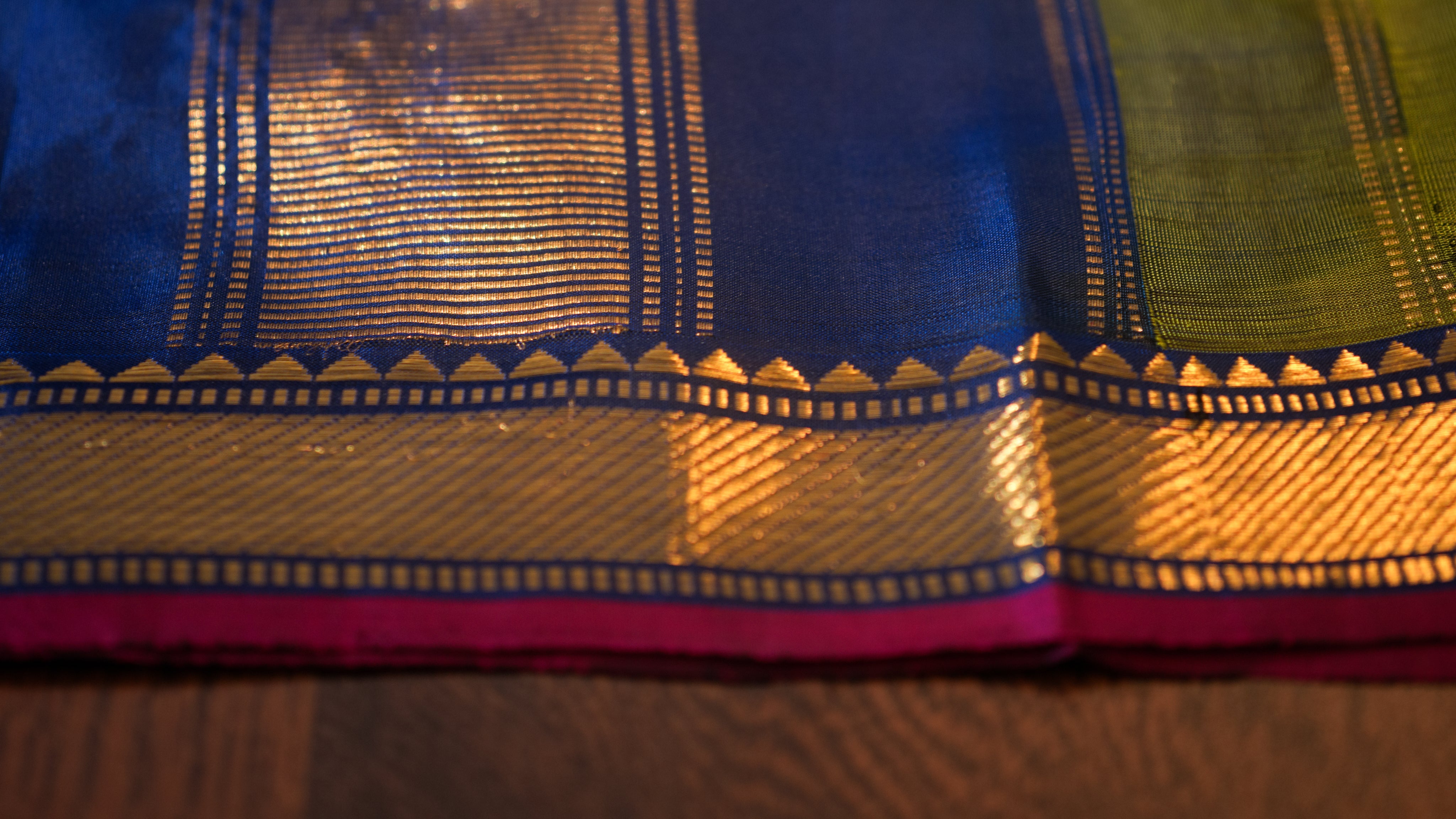 The pallu unfurls in a striking contrast of deep royal blue, adorned with intricate gold zari stripes, creating a majestic flow of shimmer and color. The interplay of green and blue, balanced with rich zari highlights, makes this saree both regal and radiant, perfect for festive occasions, weddings, and timeless celebrations.