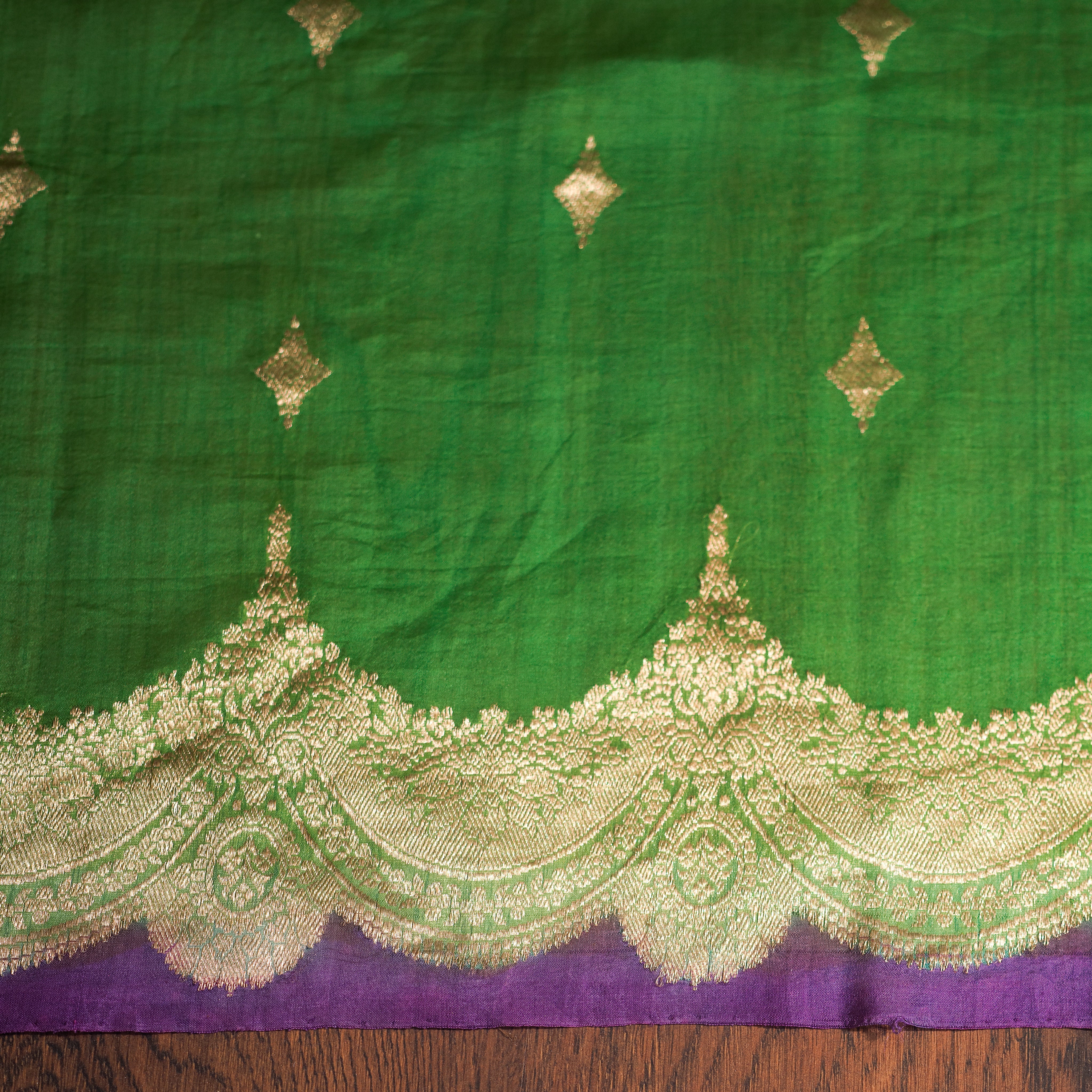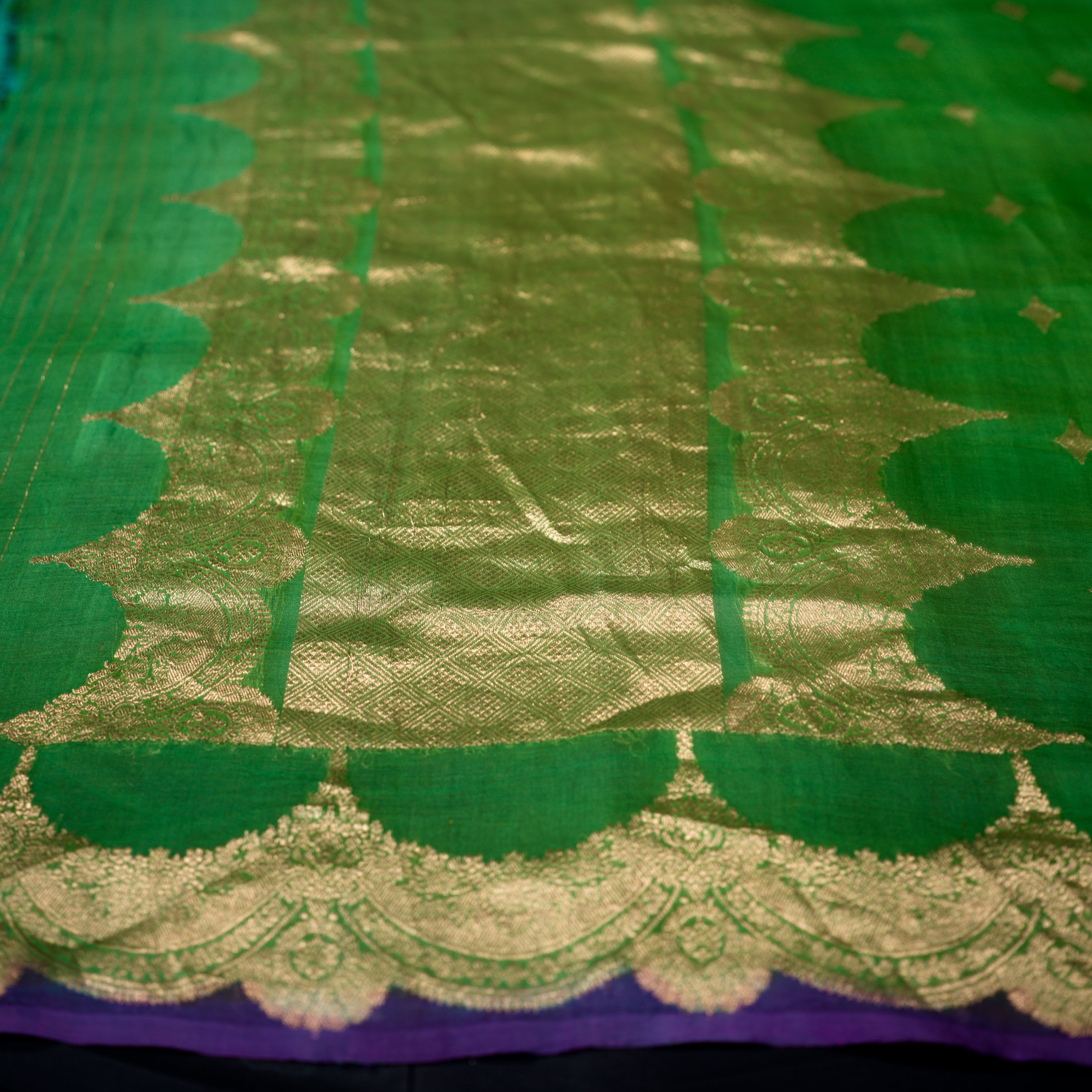 Color – Emerald green body with golden zari motifs and purple-edged gold border
