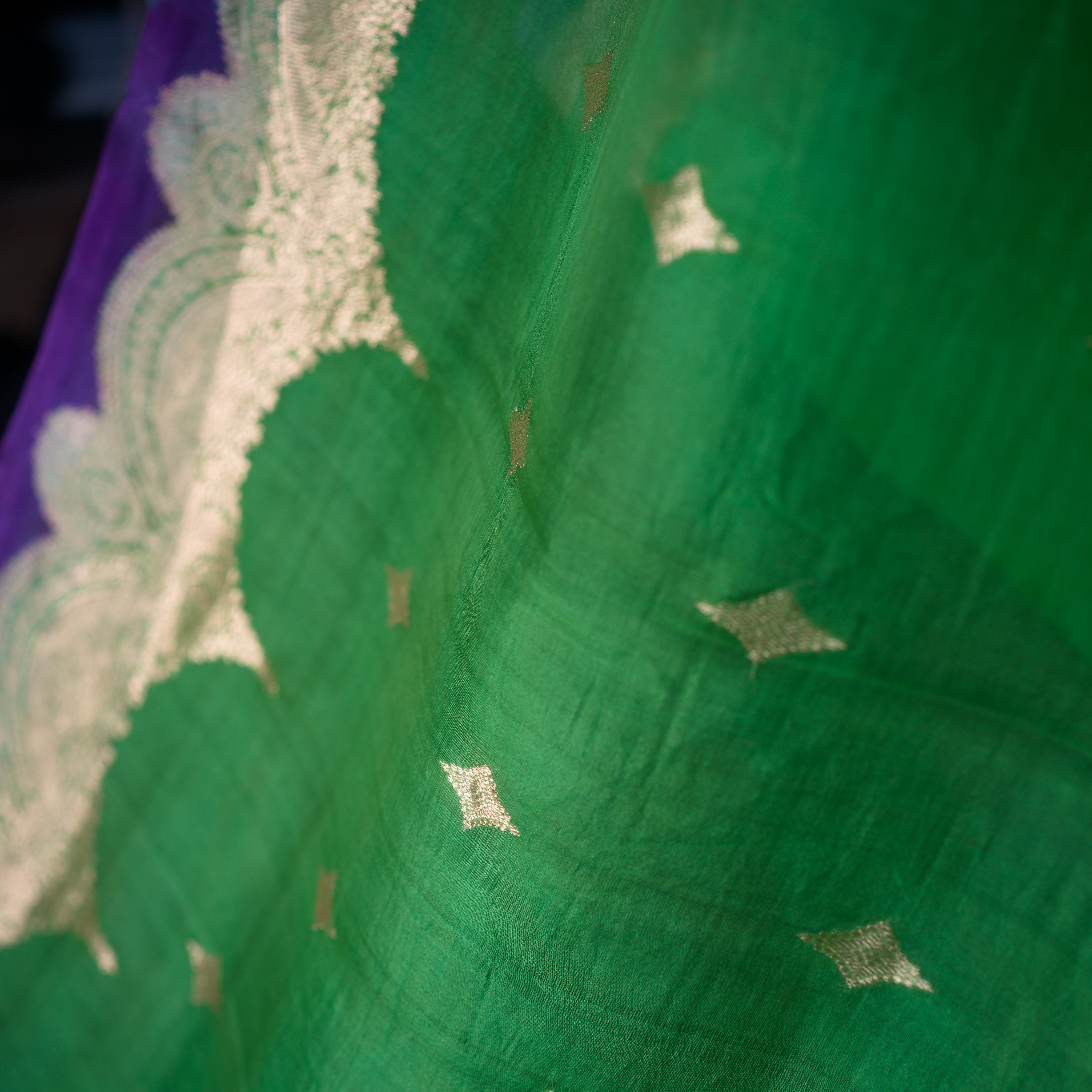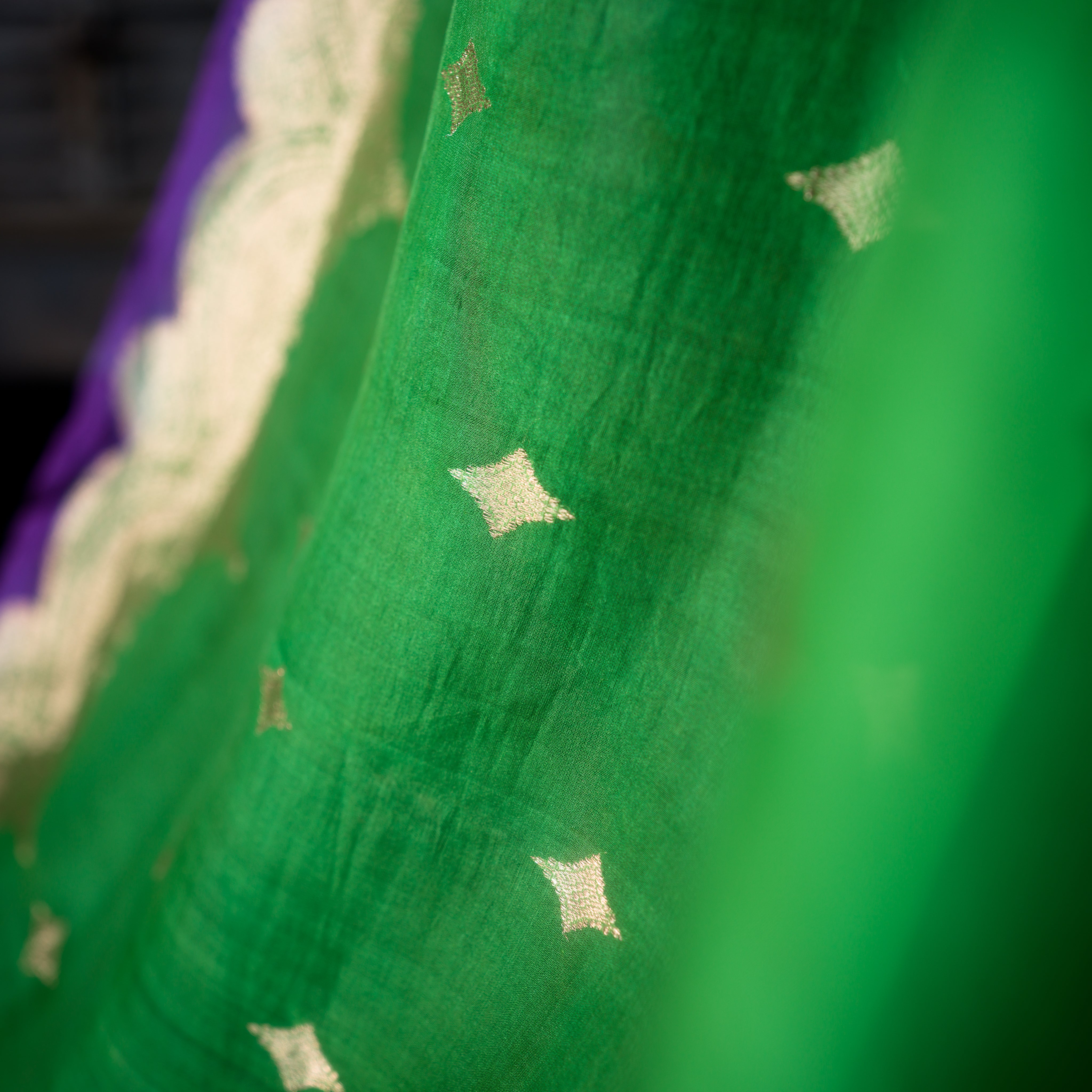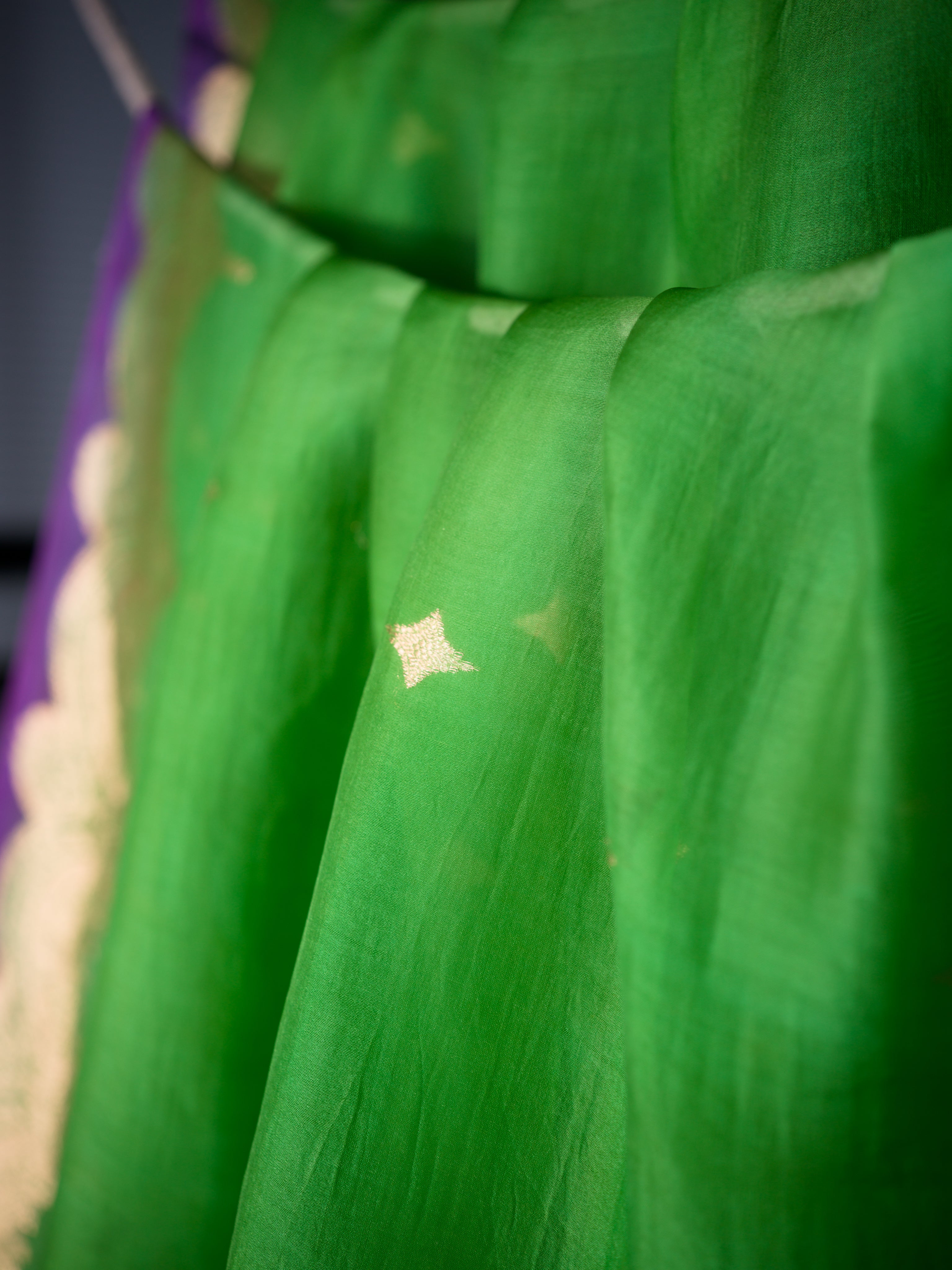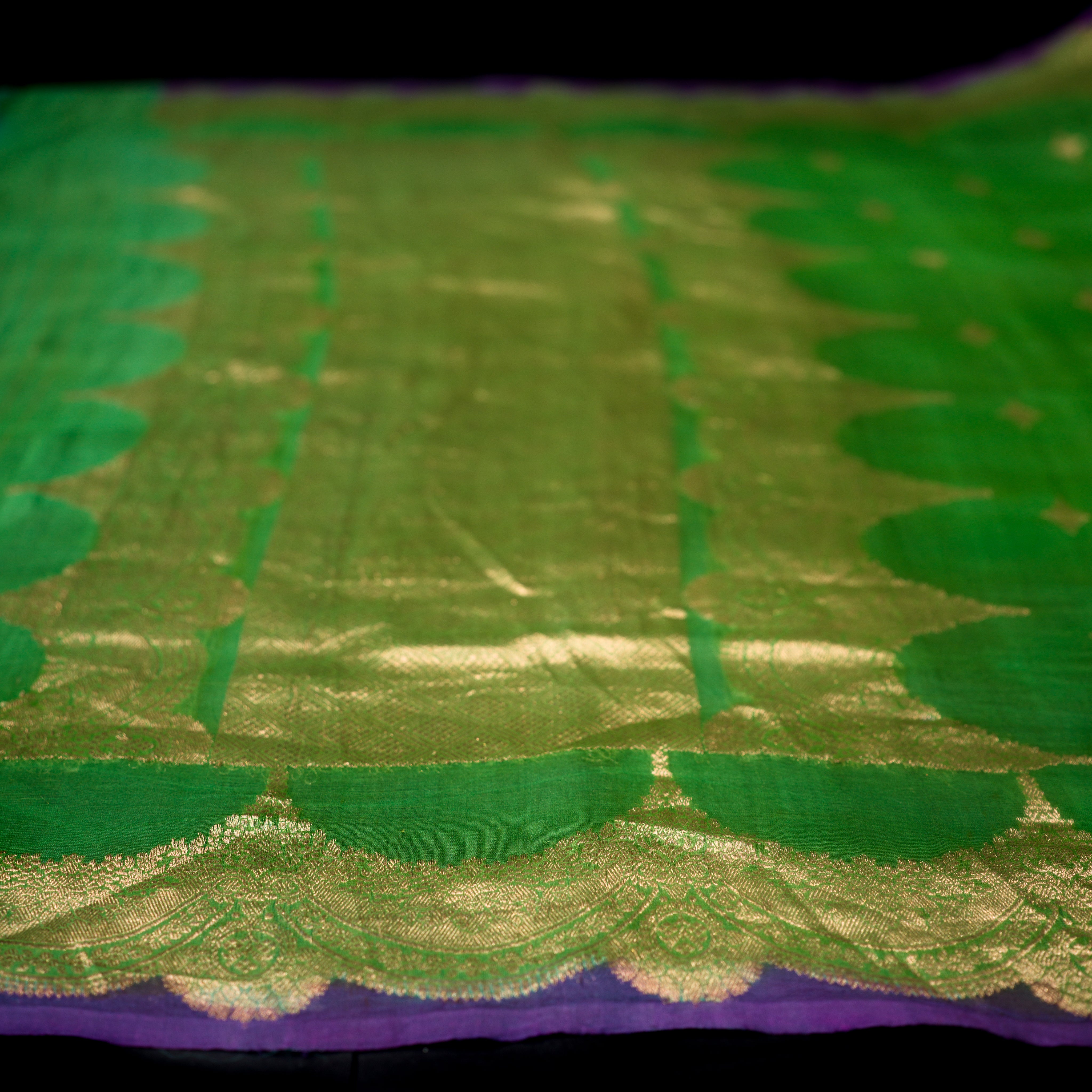 This exquisite pure Banarasi Kora silk saree is a masterpiece of timeless elegance. Woven by hand in the legendary weaving city of Banaras, it showcases the finesse of Kora silk, light, sheer, and ethereal in its drape. The lush emerald-green body is adorned with intricate golden zari motifs, while the scalloped borders in luminous gold with hints of regal purple bring a royal aura to the piece. Each detail reflects the grandeur and heritage of Banarasi craftsmanship, making it an ideal choice for weddings, festive occasions, and celebrations of grace.