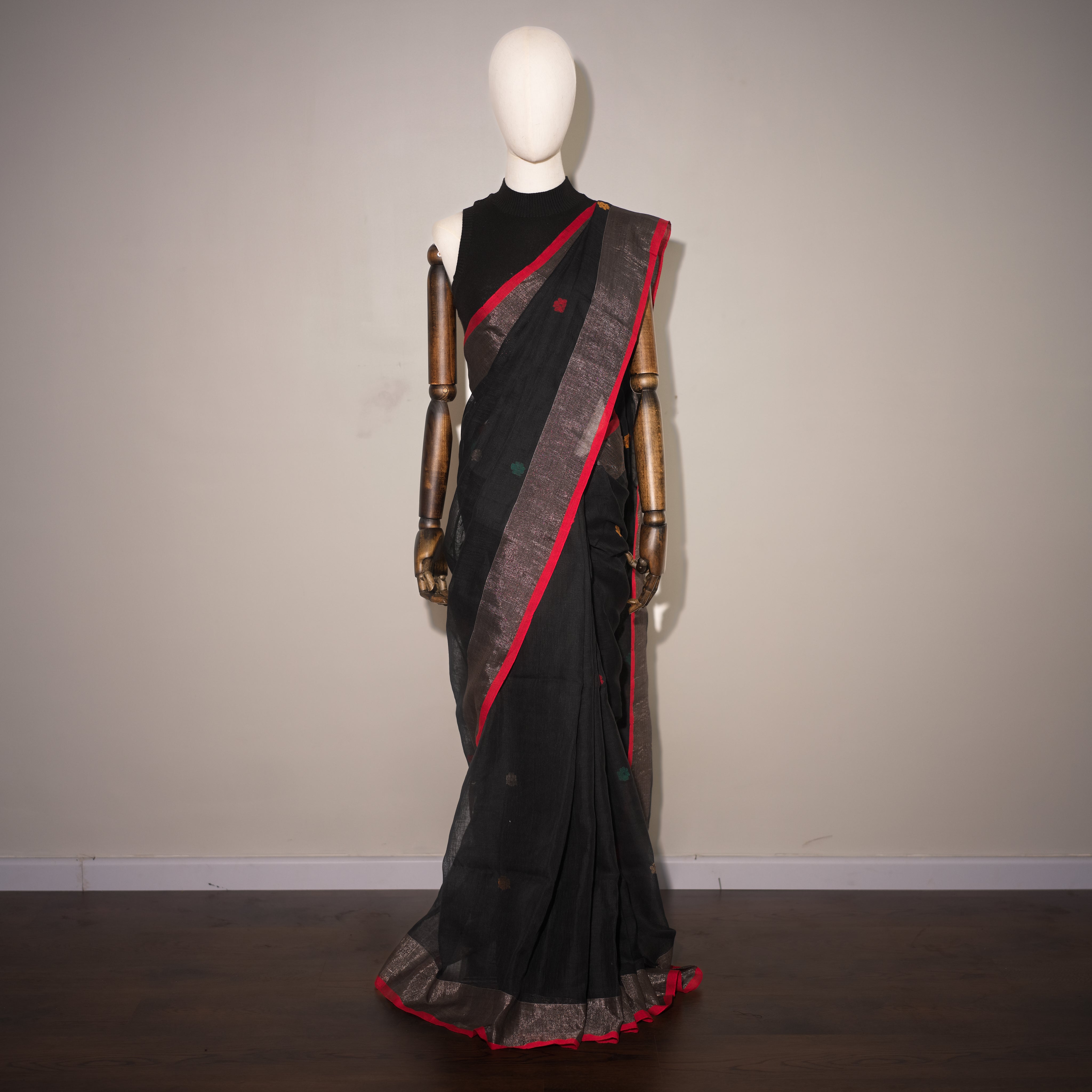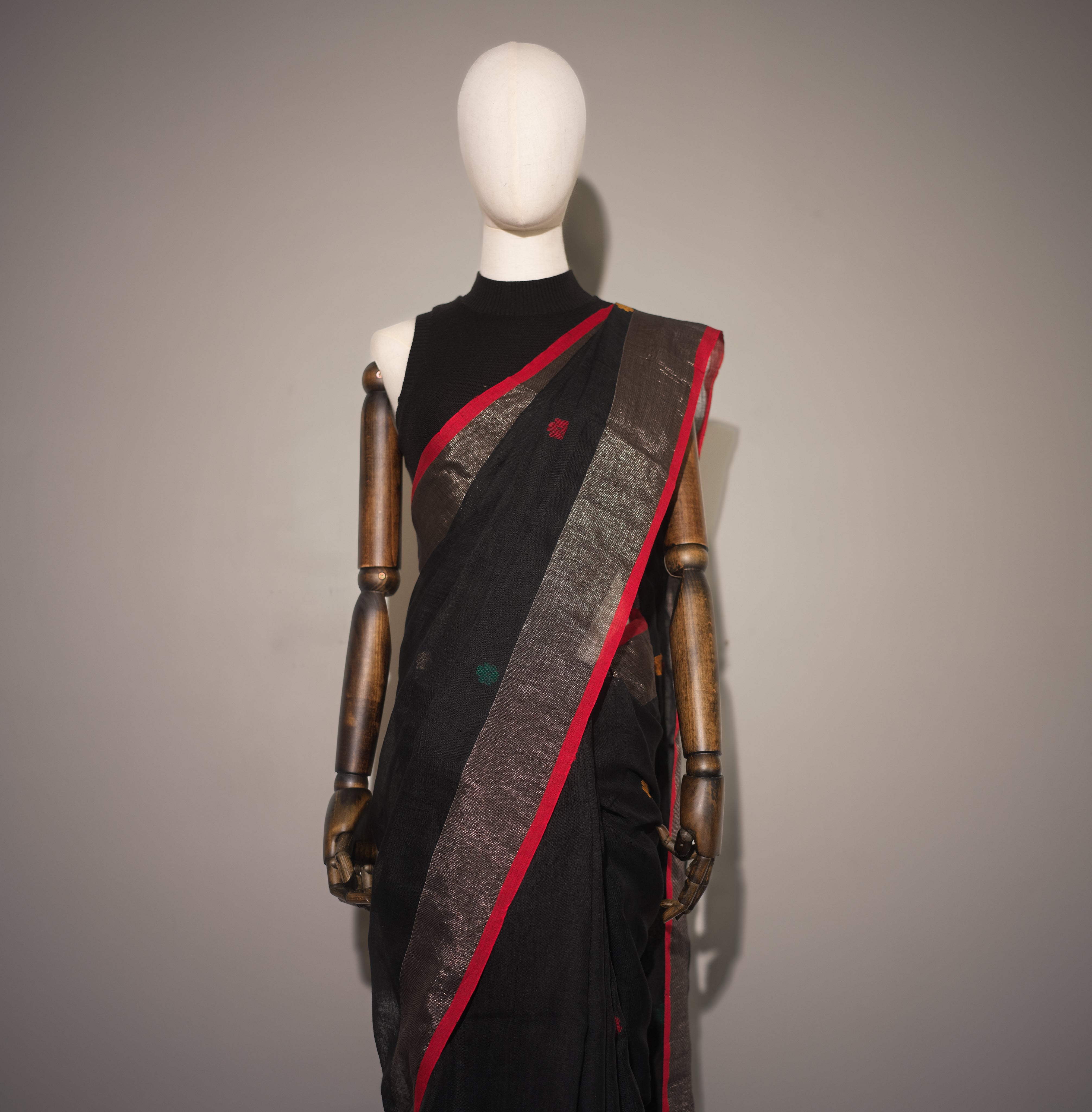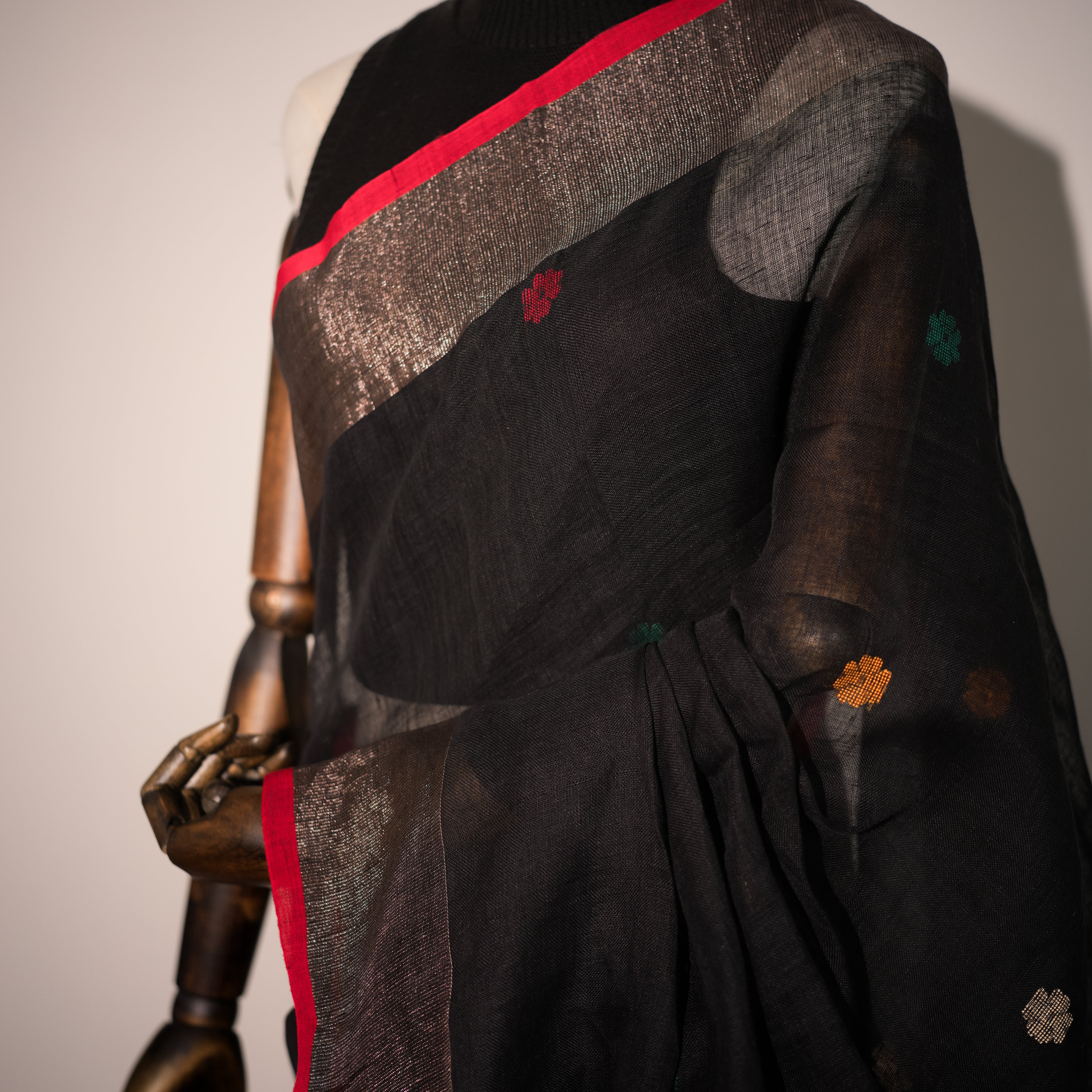 “Eternal Noir” - Black Linen Jamdani Saree with Dark Silver Border