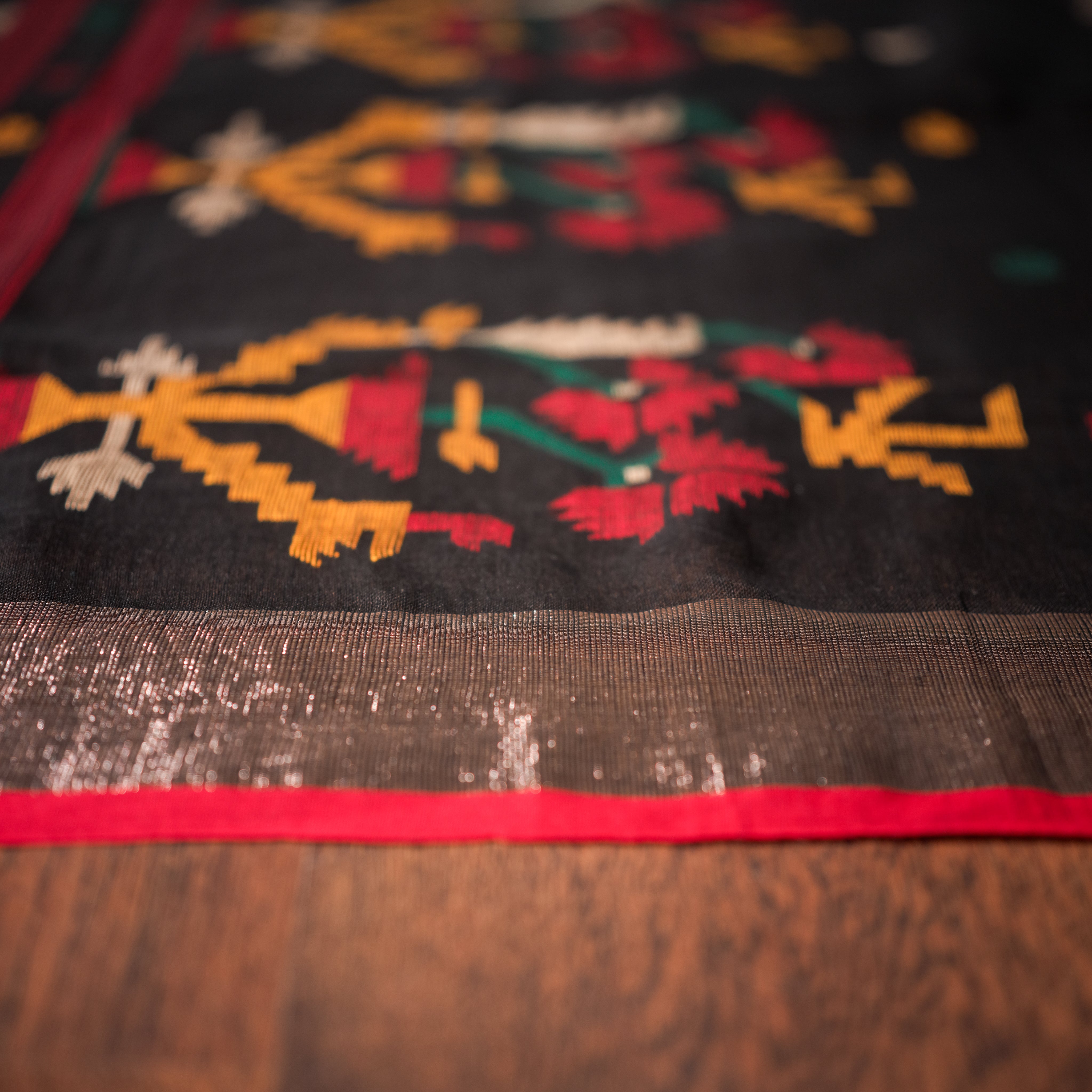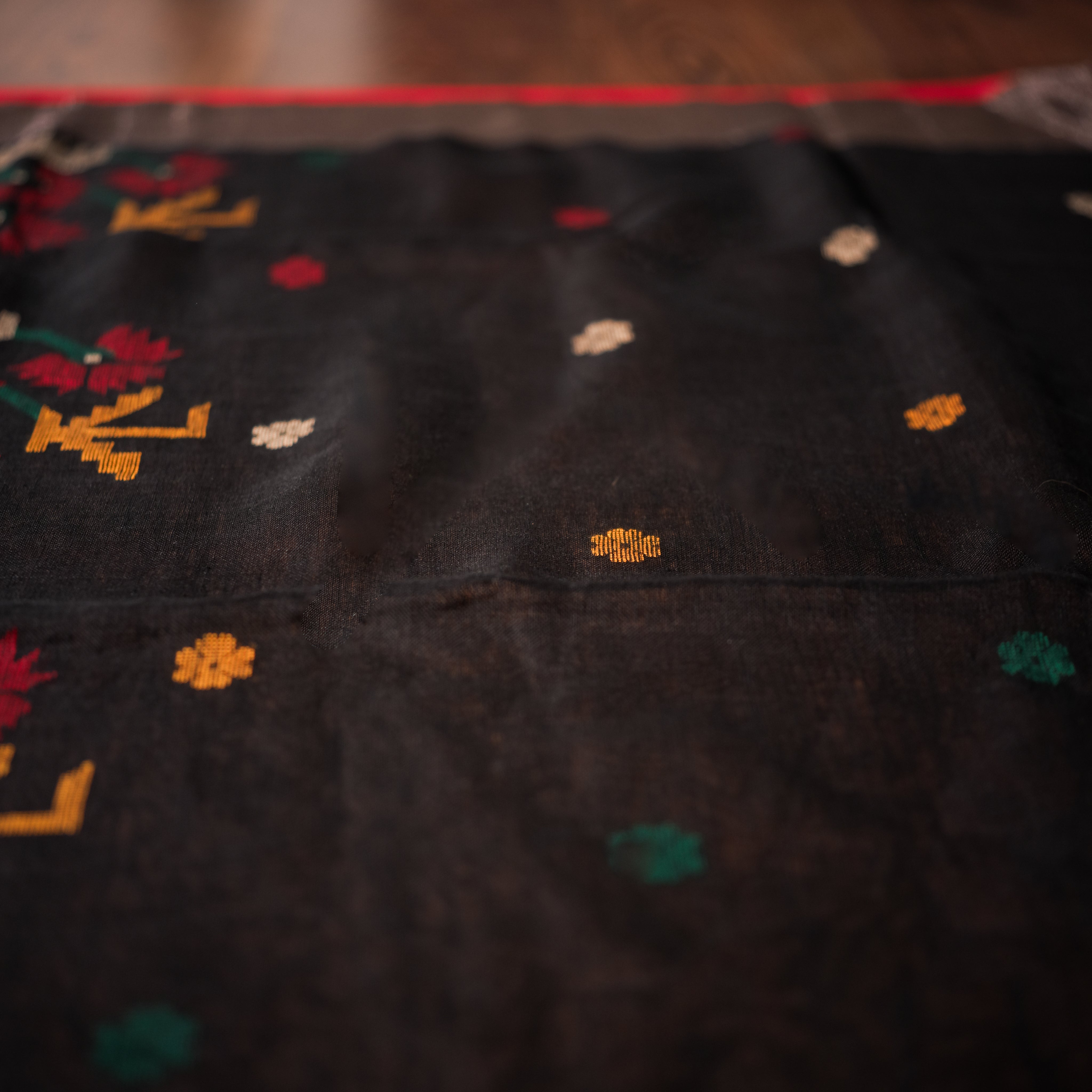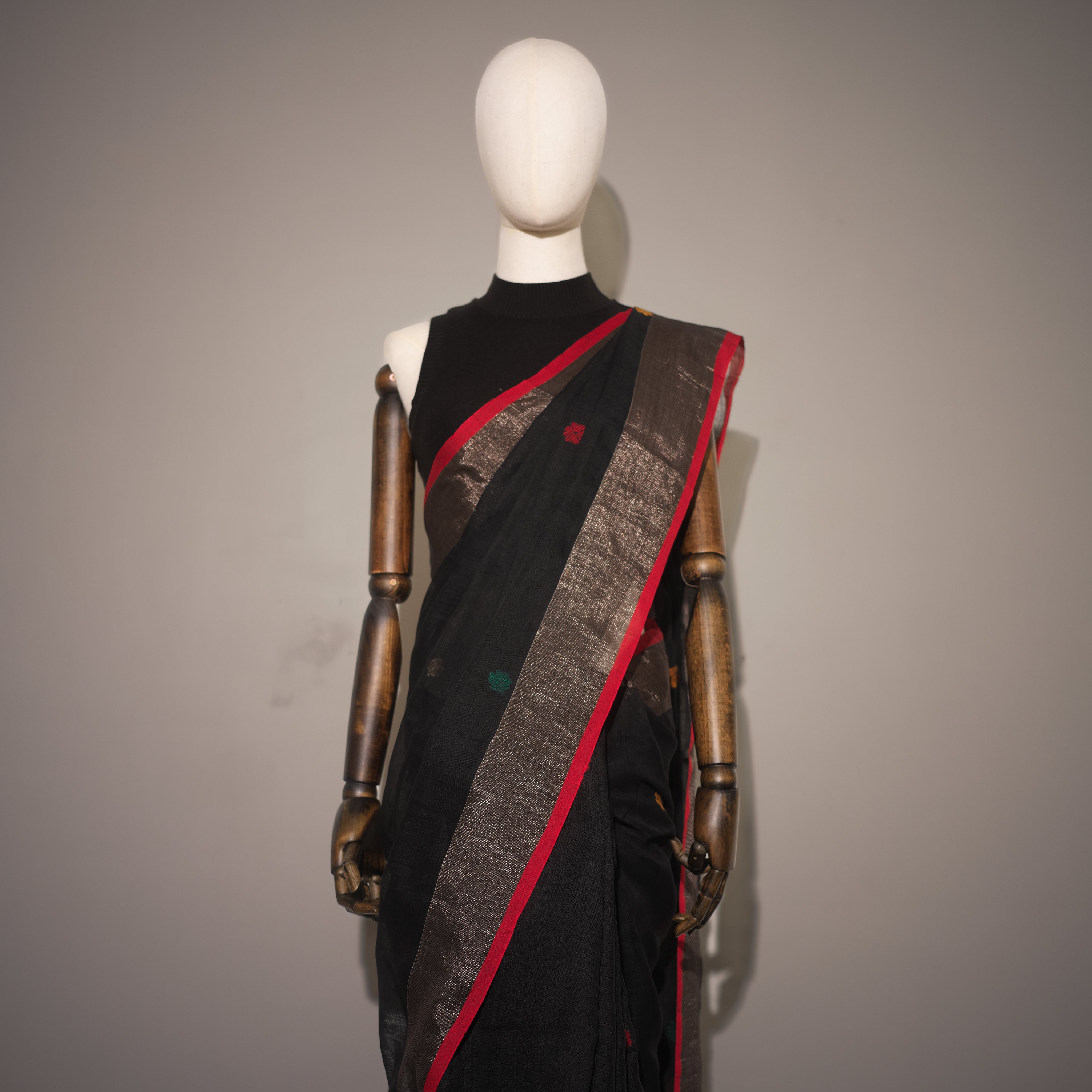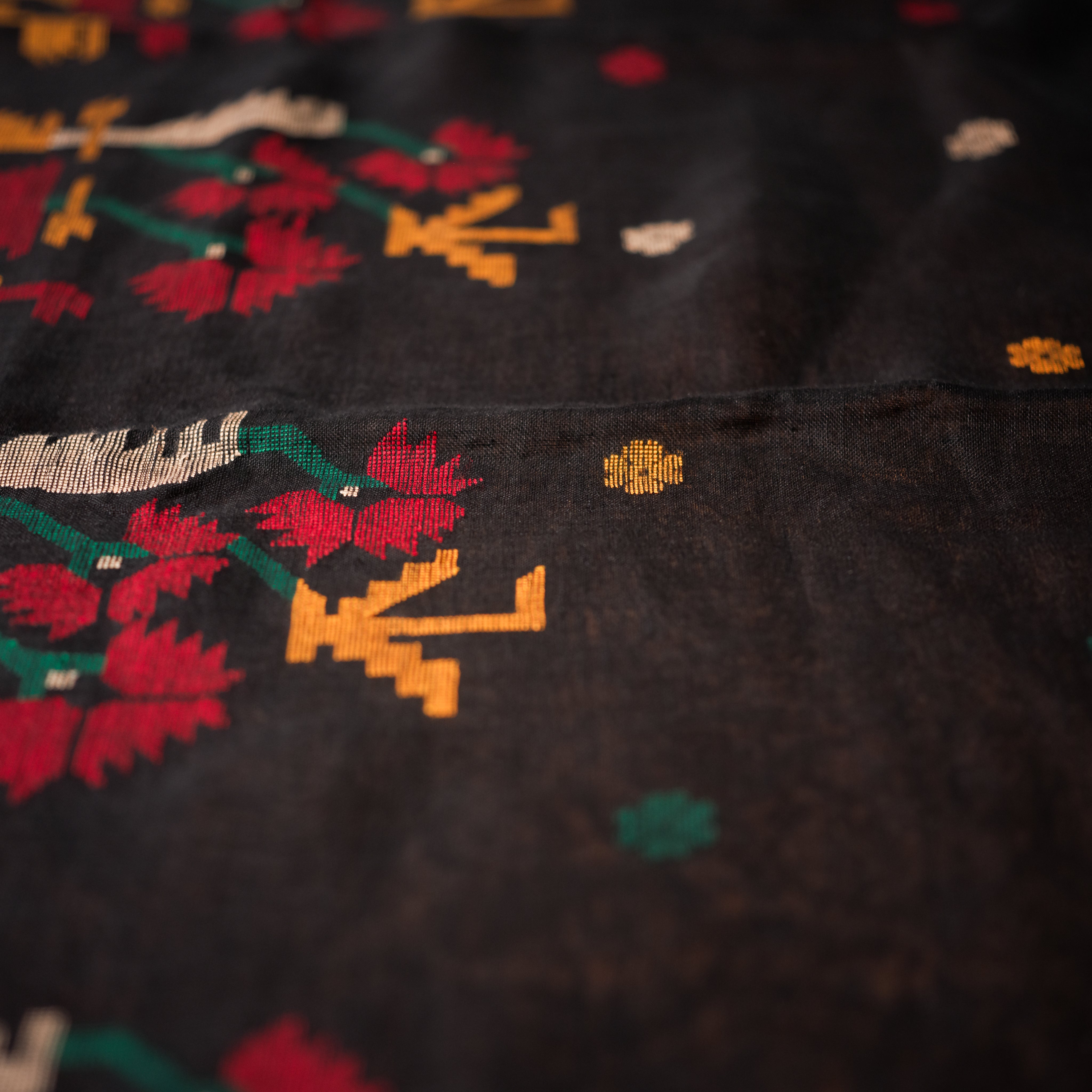 A saree that defines grace in its purest form, Eternal Noir brings together the richness of black with the quiet shimmer of dark silver. The body carries delicate Jamdani motifs , while the pallu blooms into vibrant floral patterns, woven with patience and devotion. The striking red selvedge adds a bold edge, making this saree a masterpiece of timeless sophistication, perfect for evenings when elegance must speak louder than words.