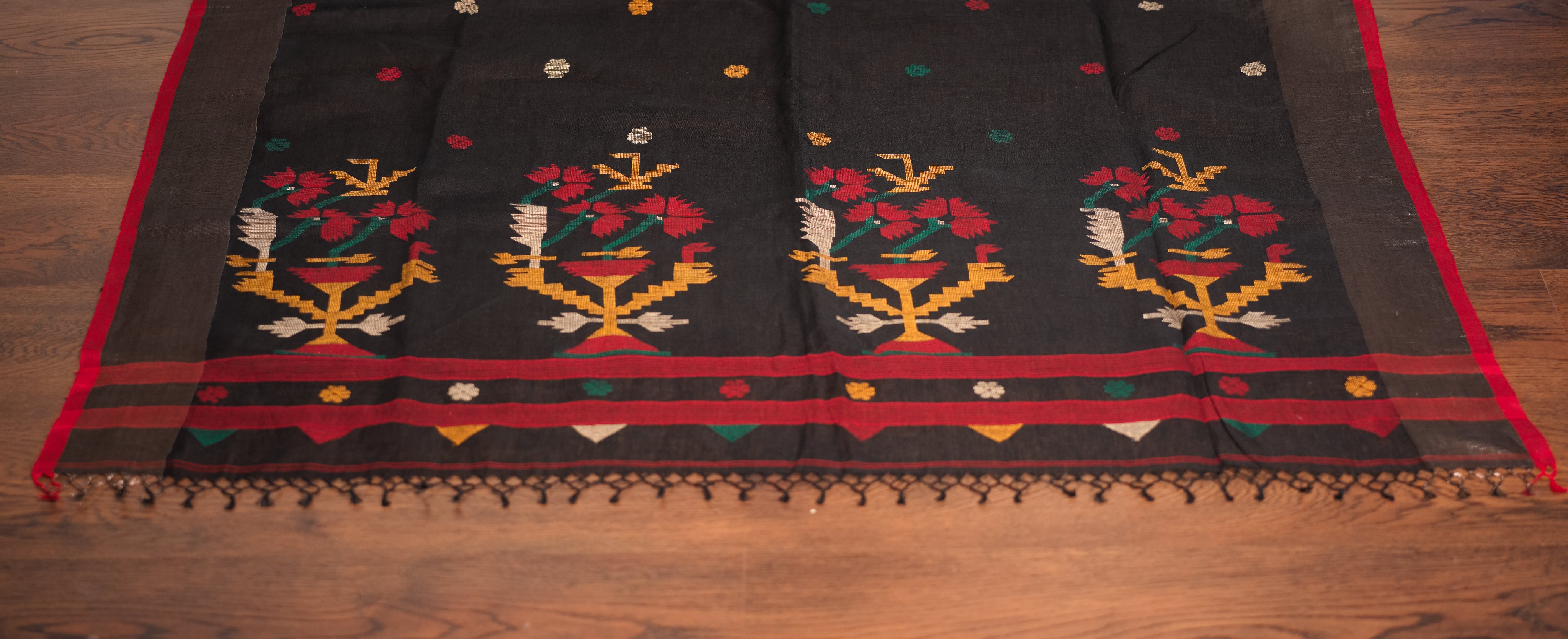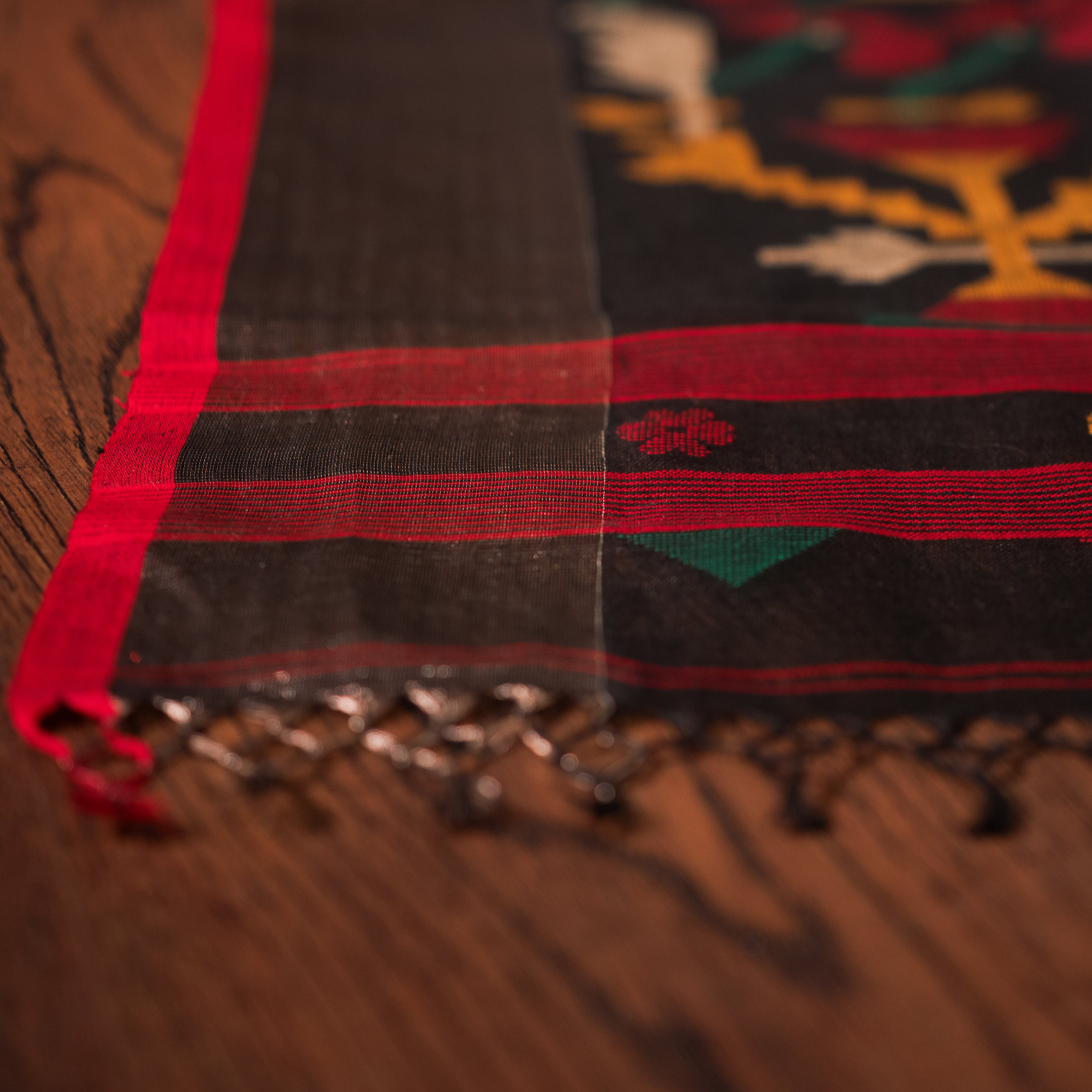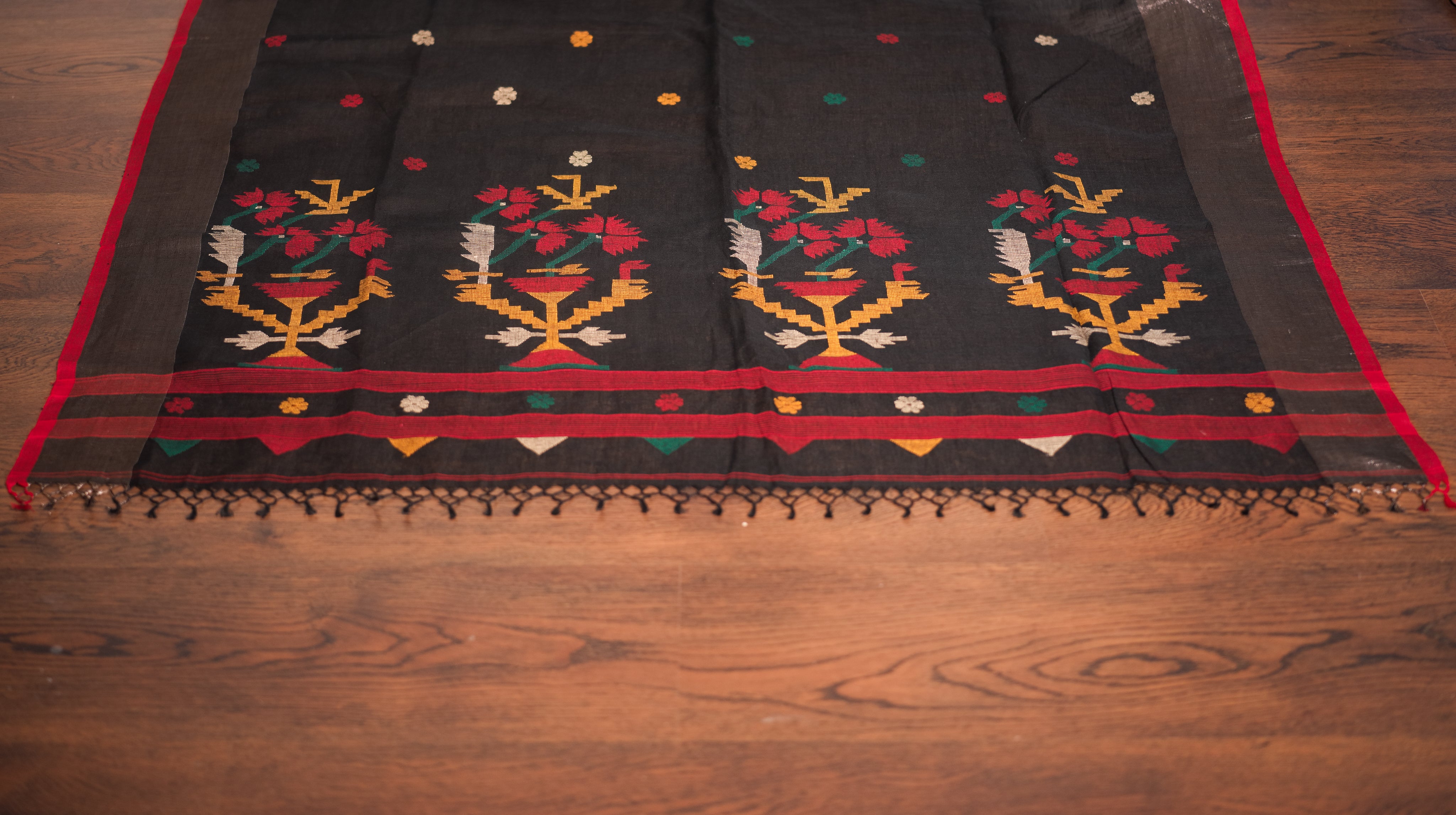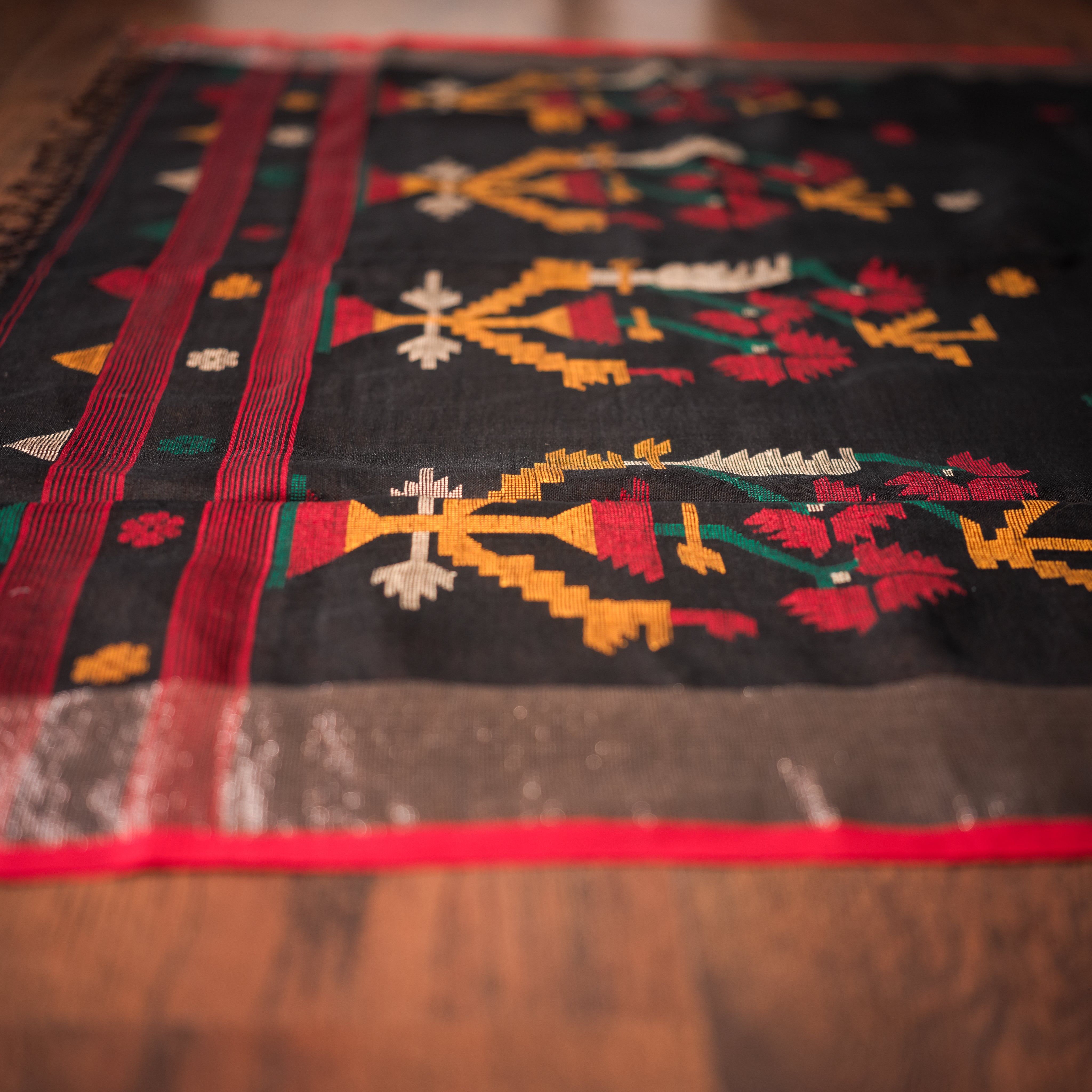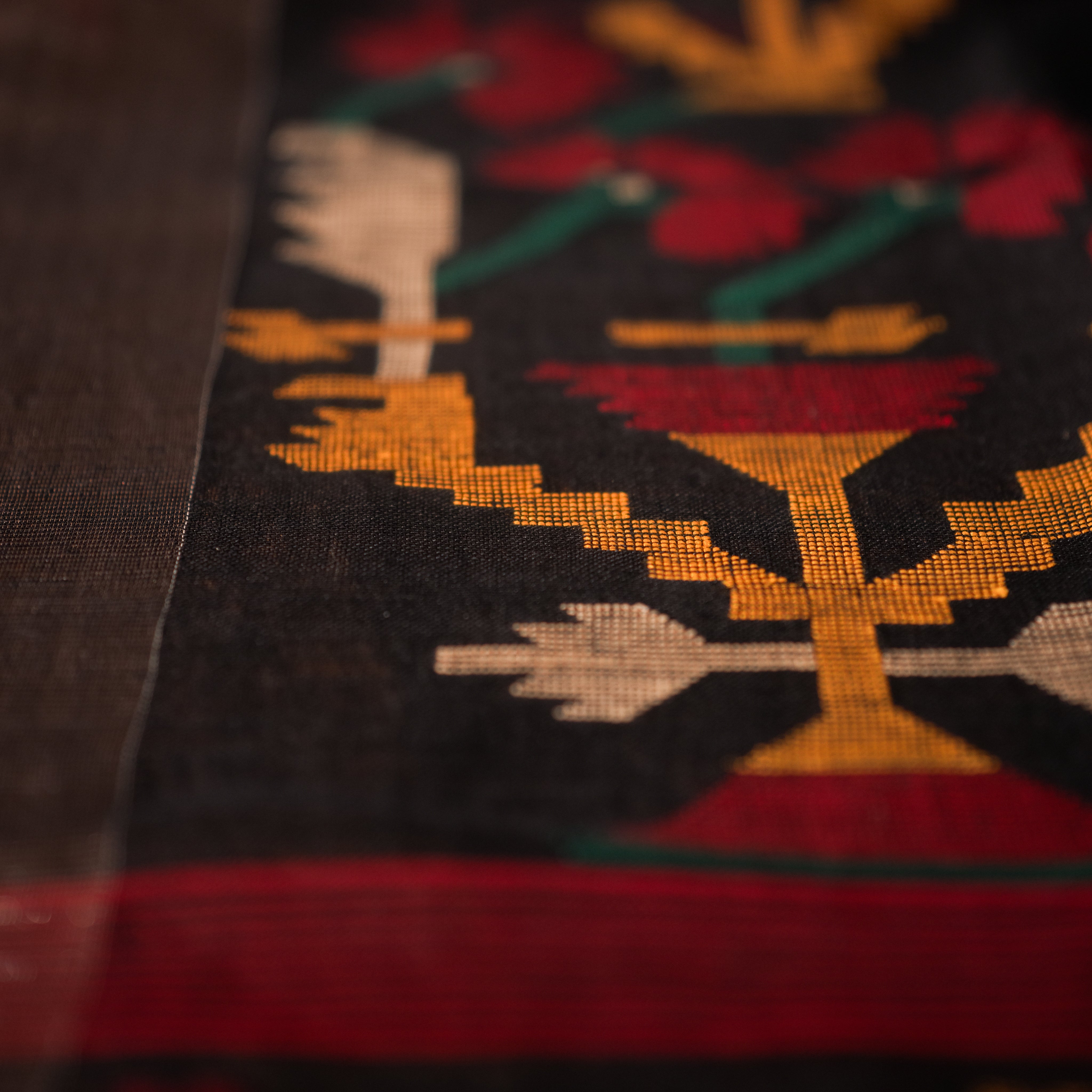 A saree that defines grace in its purest form, Eternal Noir brings together the richness of black with the quiet shimmer of dark silver. The body carries delicate Jamdani motifs , while the pallu blooms into vibrant floral patterns, woven with patience and devotion. The striking red selvedge adds a bold edge, making this saree a masterpiece of timeless sophistication, perfect for evenings when elegance must speak louder than words.