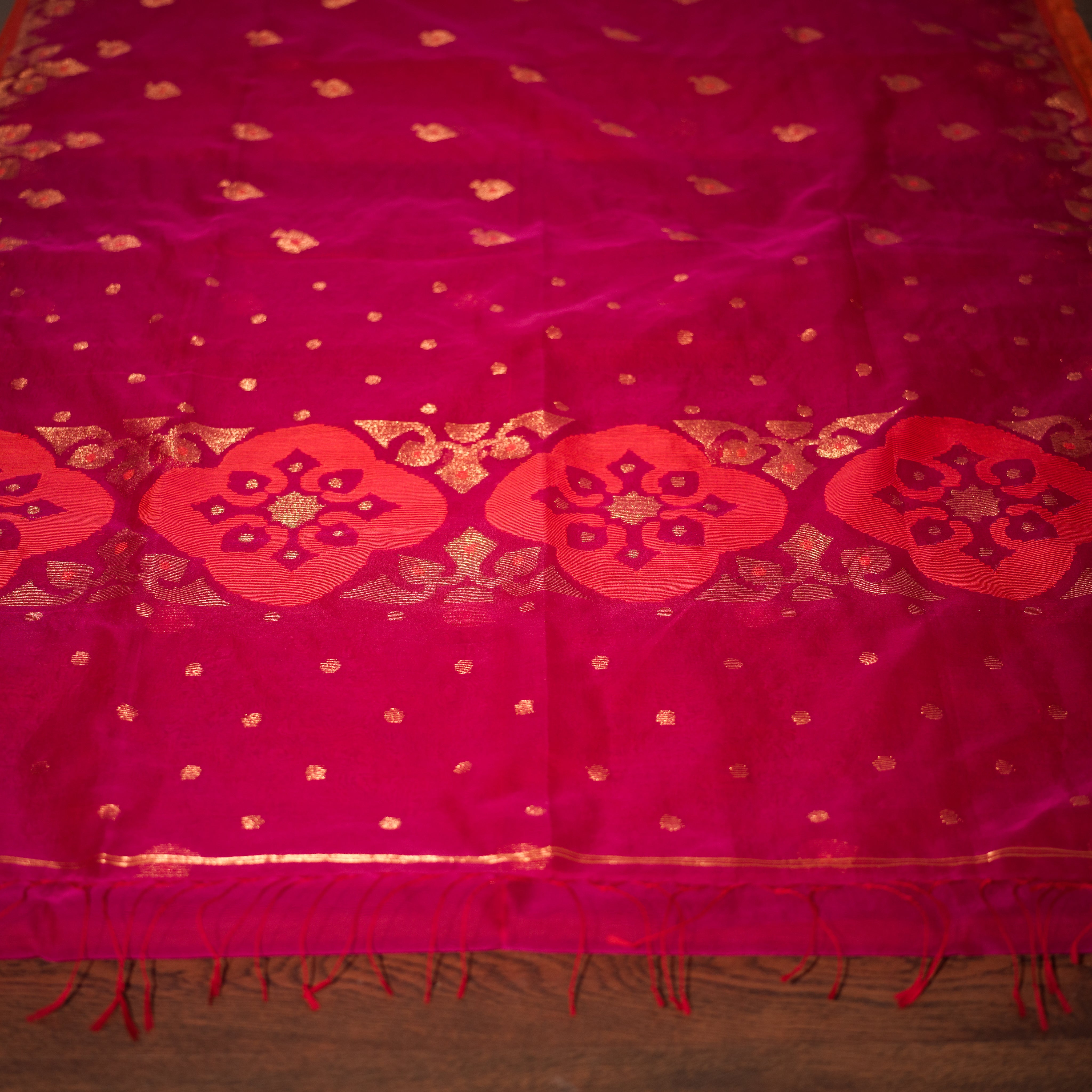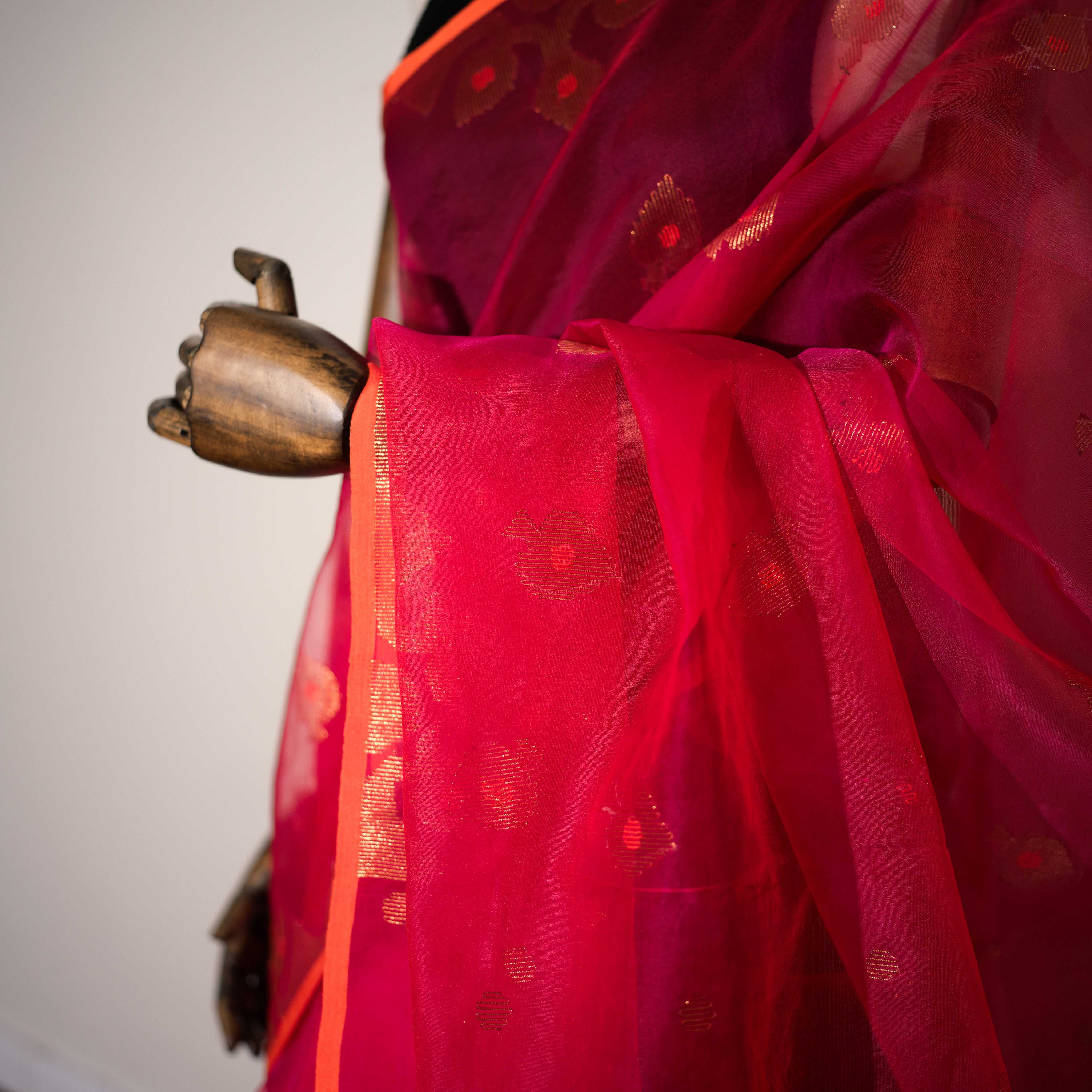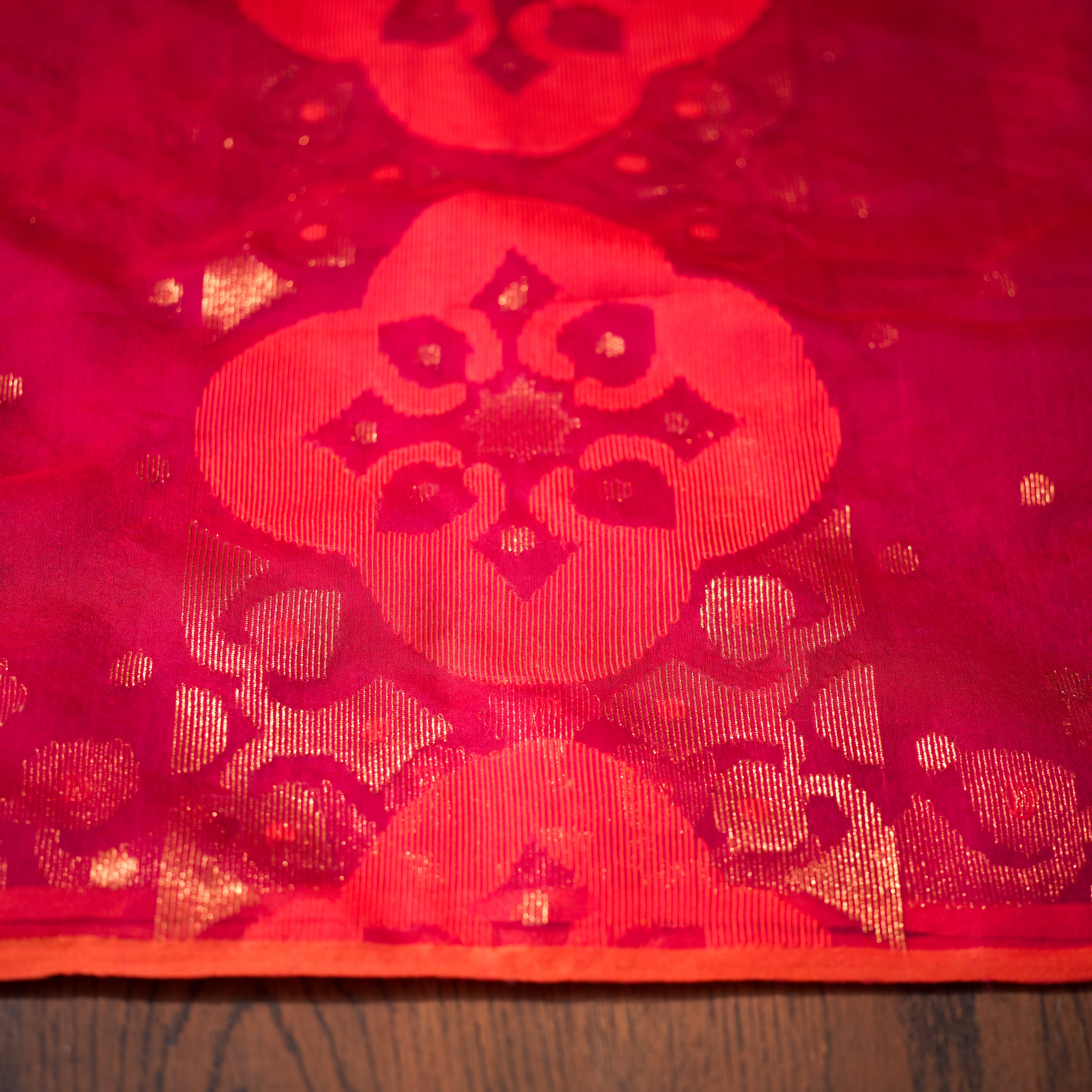 A timeless creation woven with grace and artistry, this exquisite Jamdani saree radiates elegance in every fold. The luminous red fabric glows like a flame, adorned with intricately handwoven floral butas in resplendent golden and crimson threads. The sheer texture gives it an ethereal lightness, while the bold motifs along the pallu and border add a statement of grandeur. Draping this saree is like wrapping oneself in centuries of tradition reimagined with a modern sophistication.