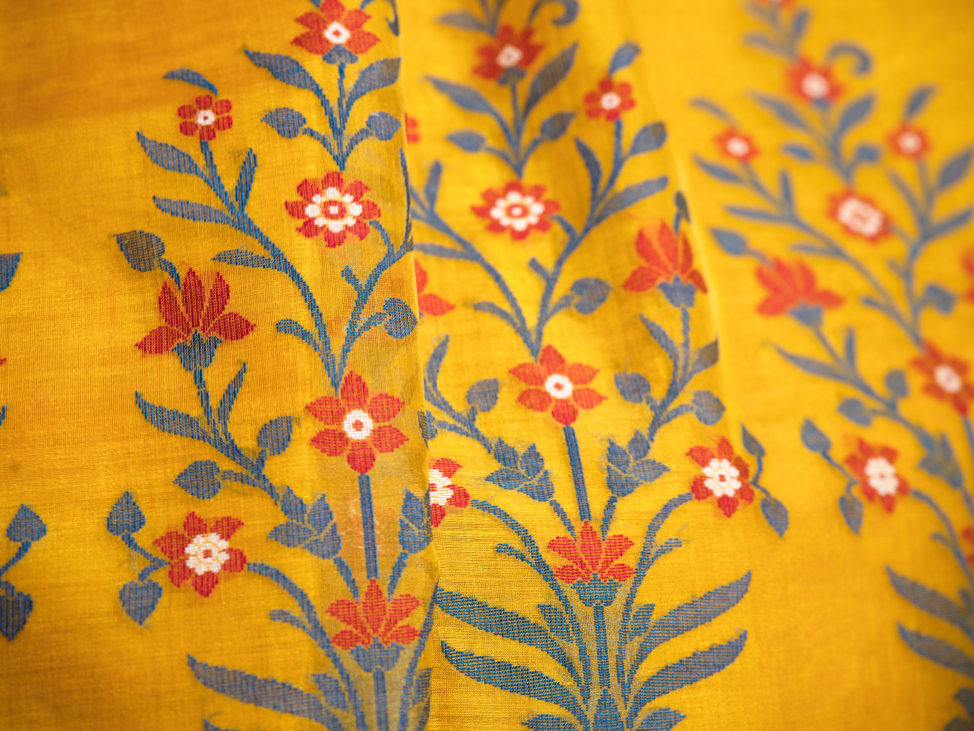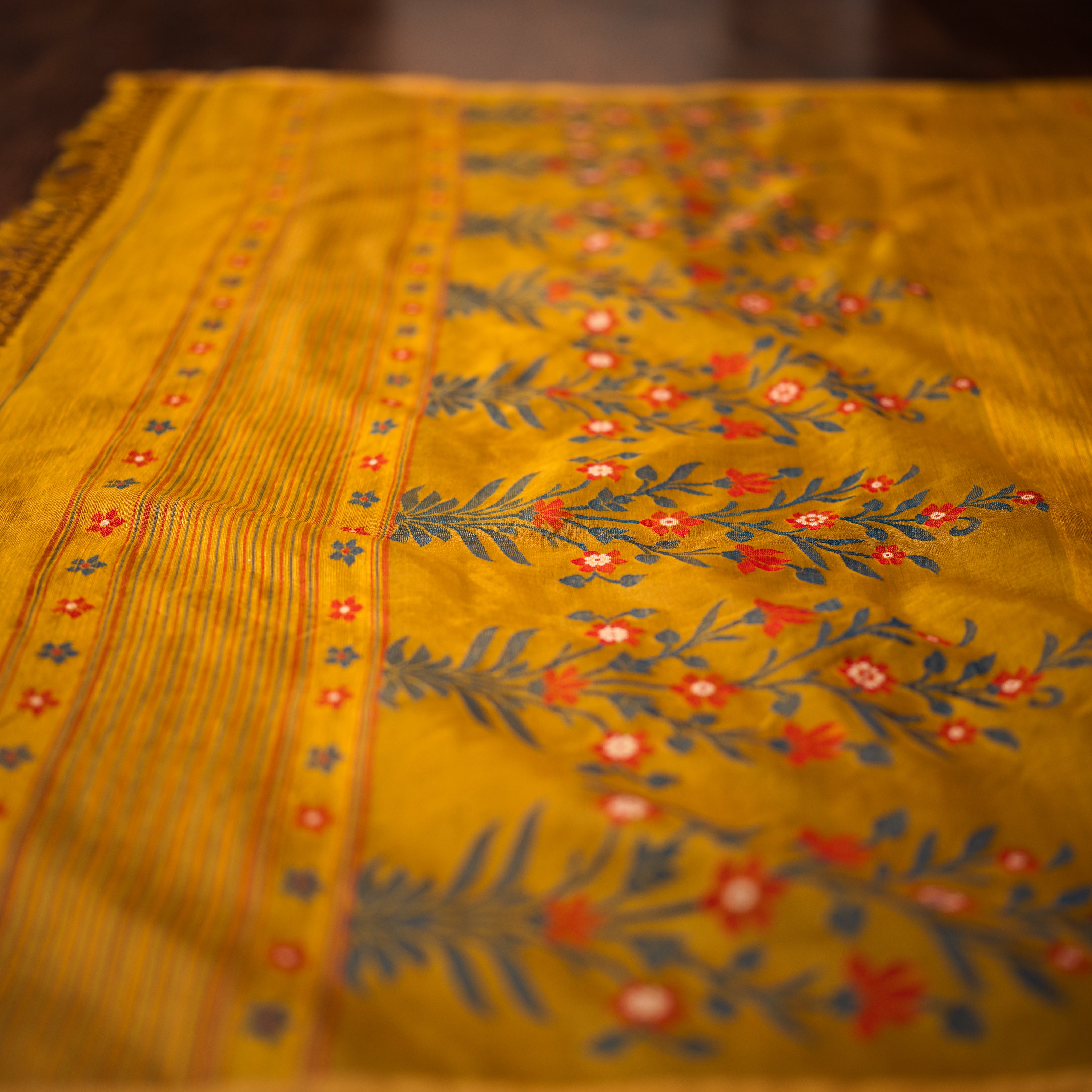 Color - Vibrant Mustard-Yellow with multicolored Jamdani motifs