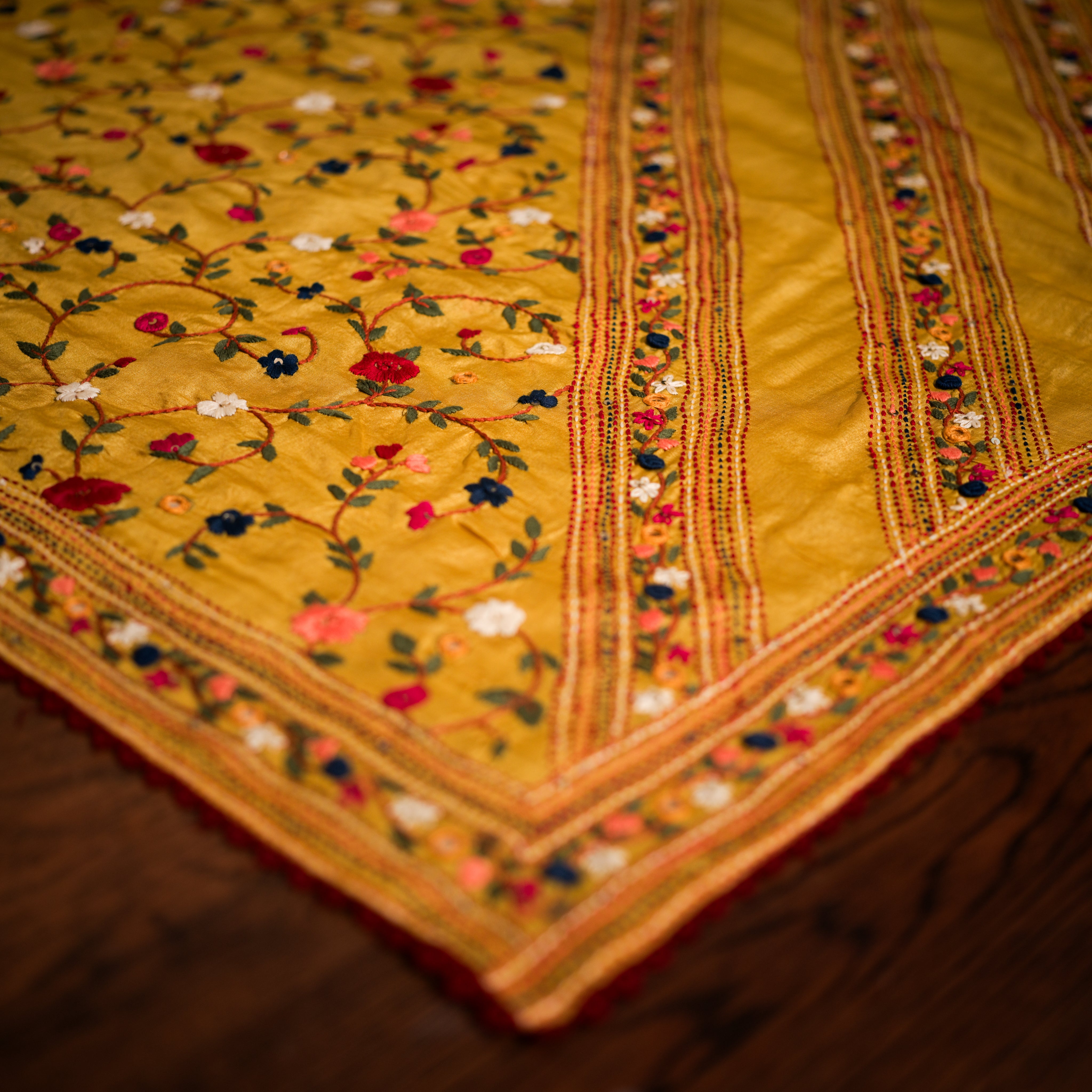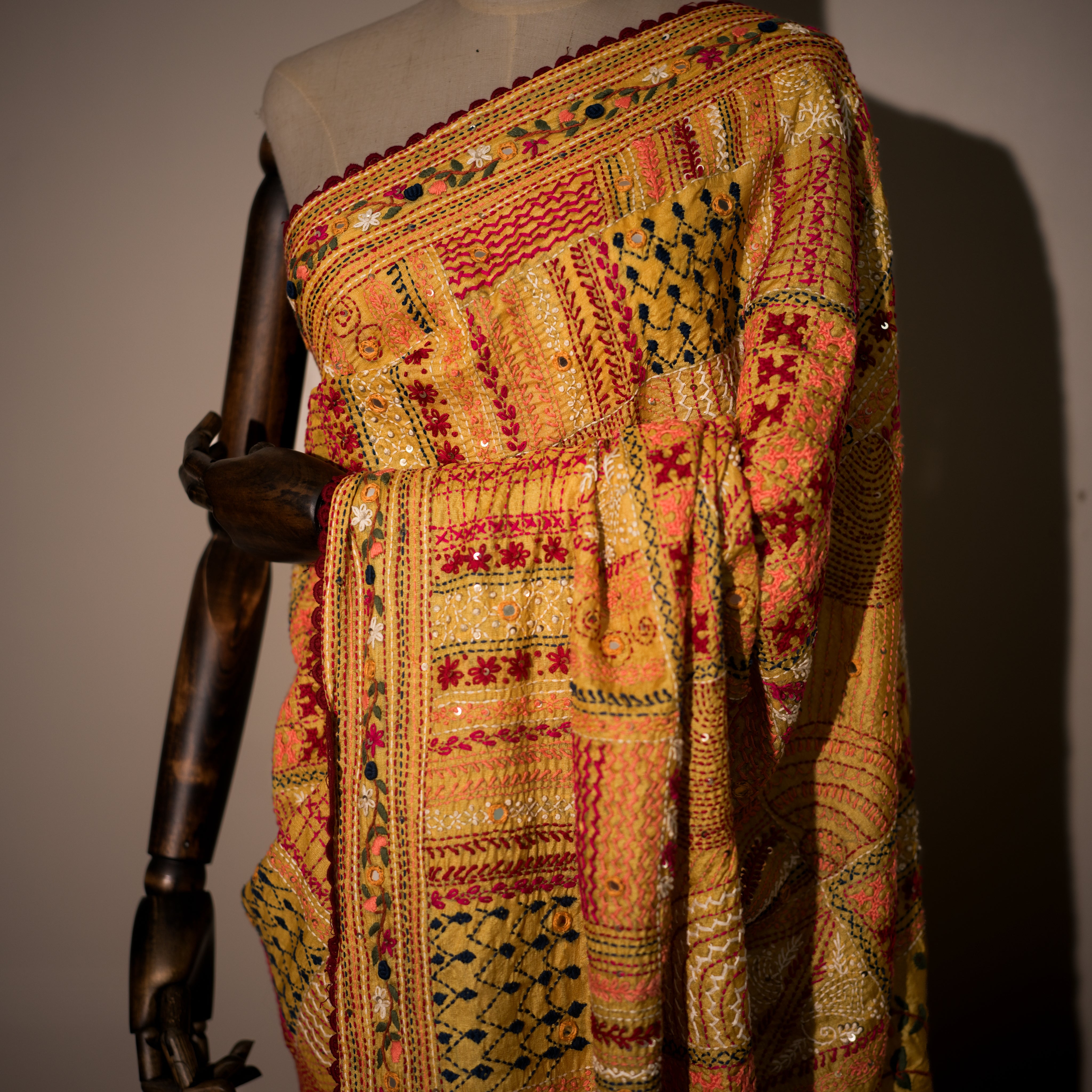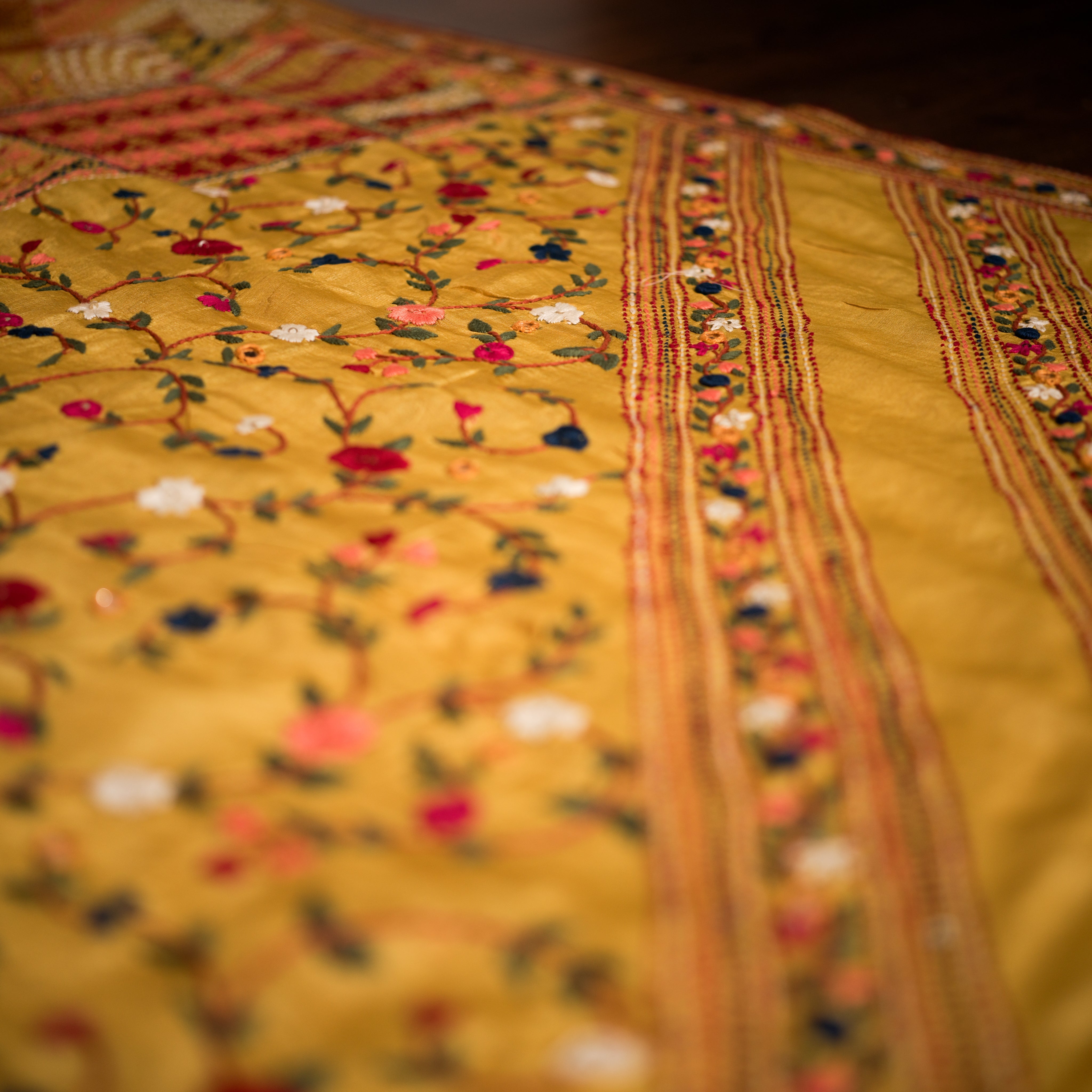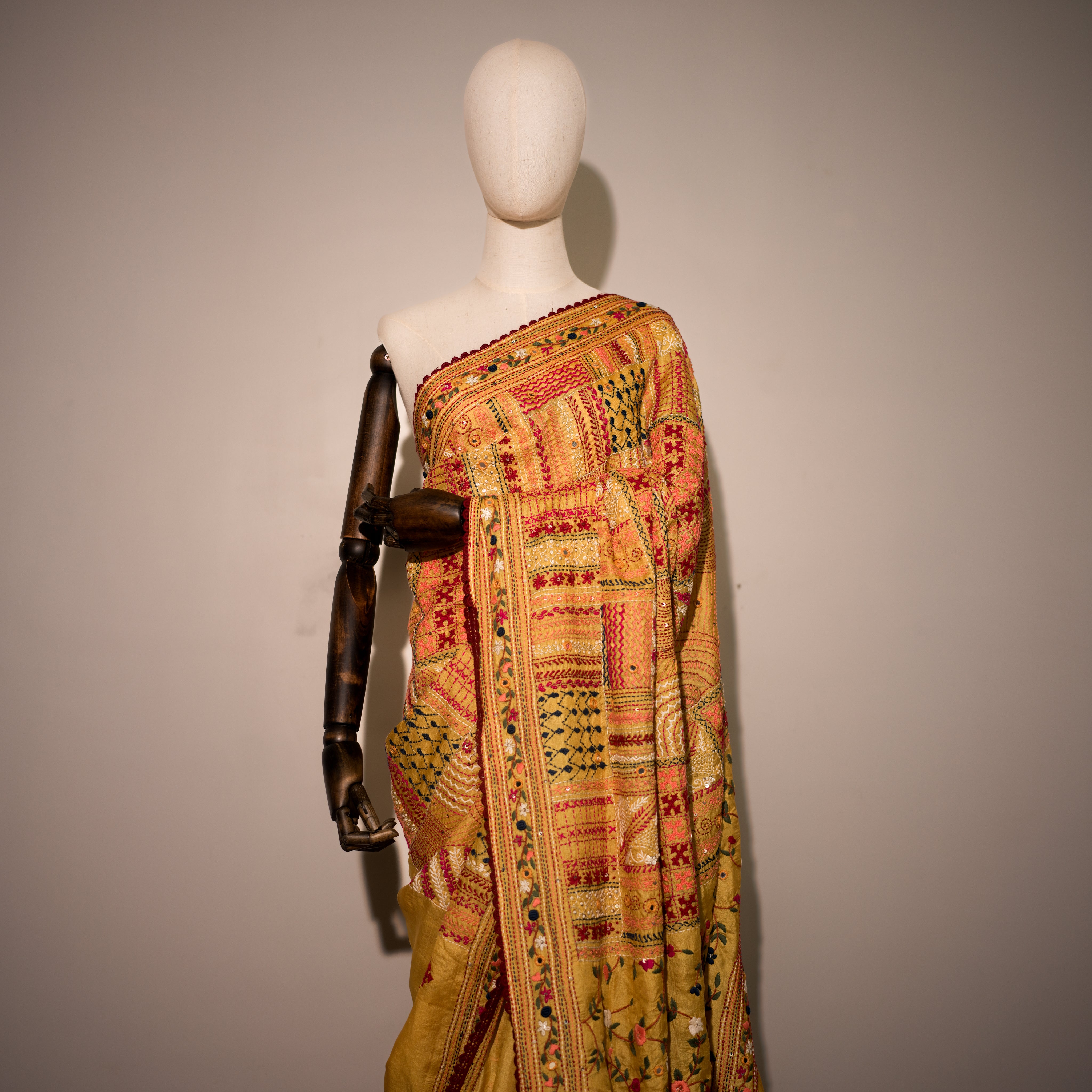 Sunlit Elegance, Yellow Saree with multicolor hand embroidery throughout