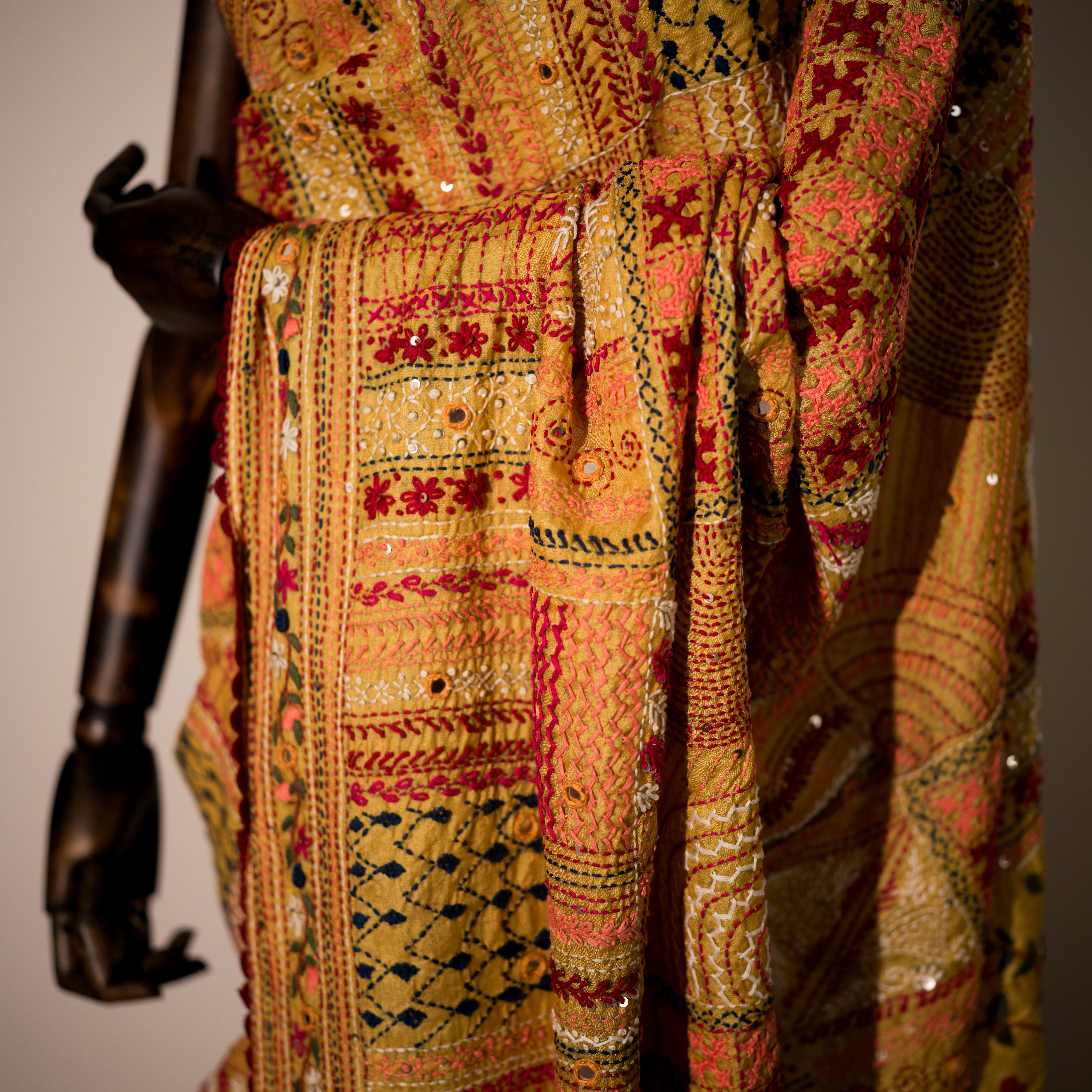 Embroidery Technique: This sari is a beautiful fusion of two intricate embroidery techniques: the delicate bullion stitch and the traditional hand-stitched embroidery from the Kutch region. Together, they create a striking blend of craftsmanship and artistry, making this sari truly unique.