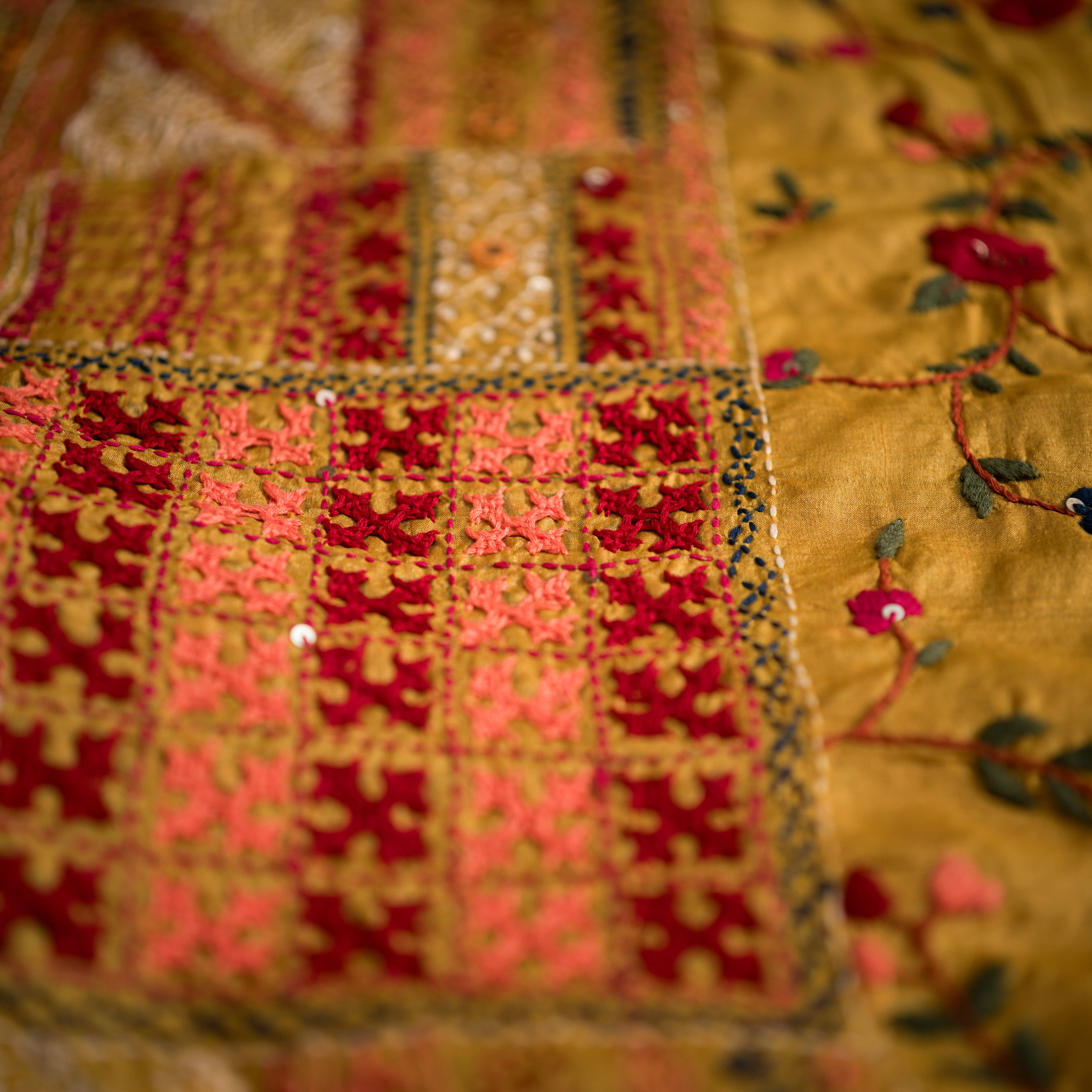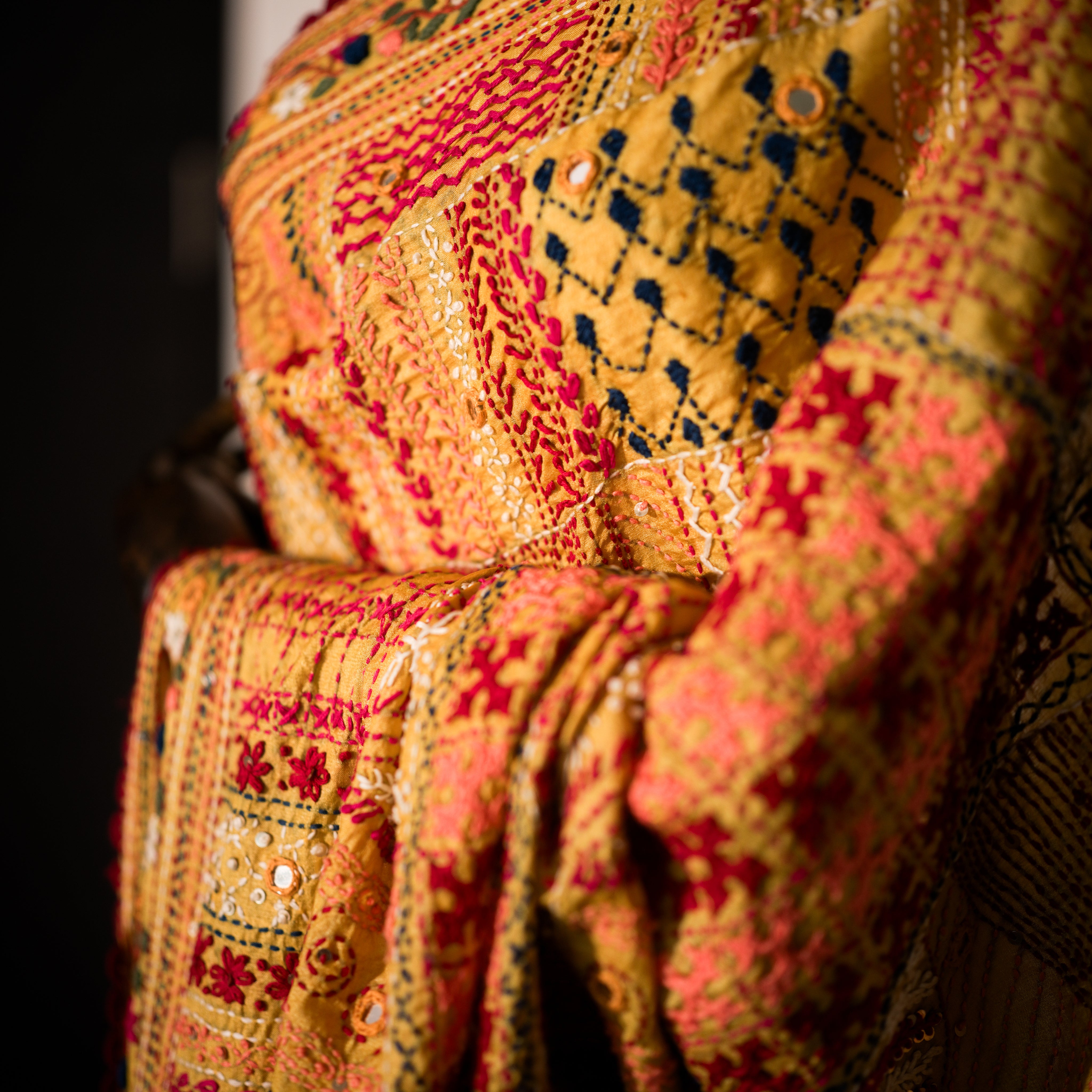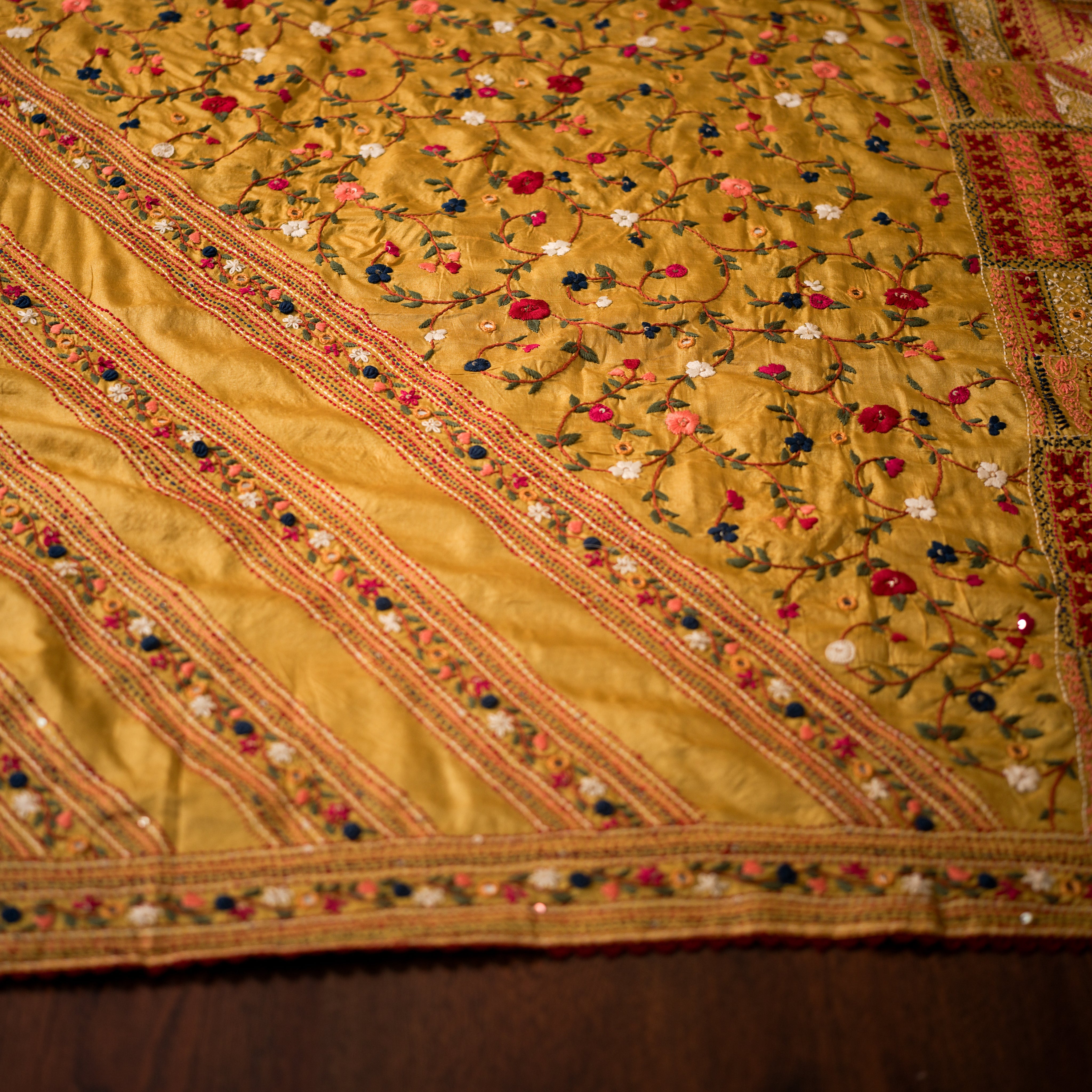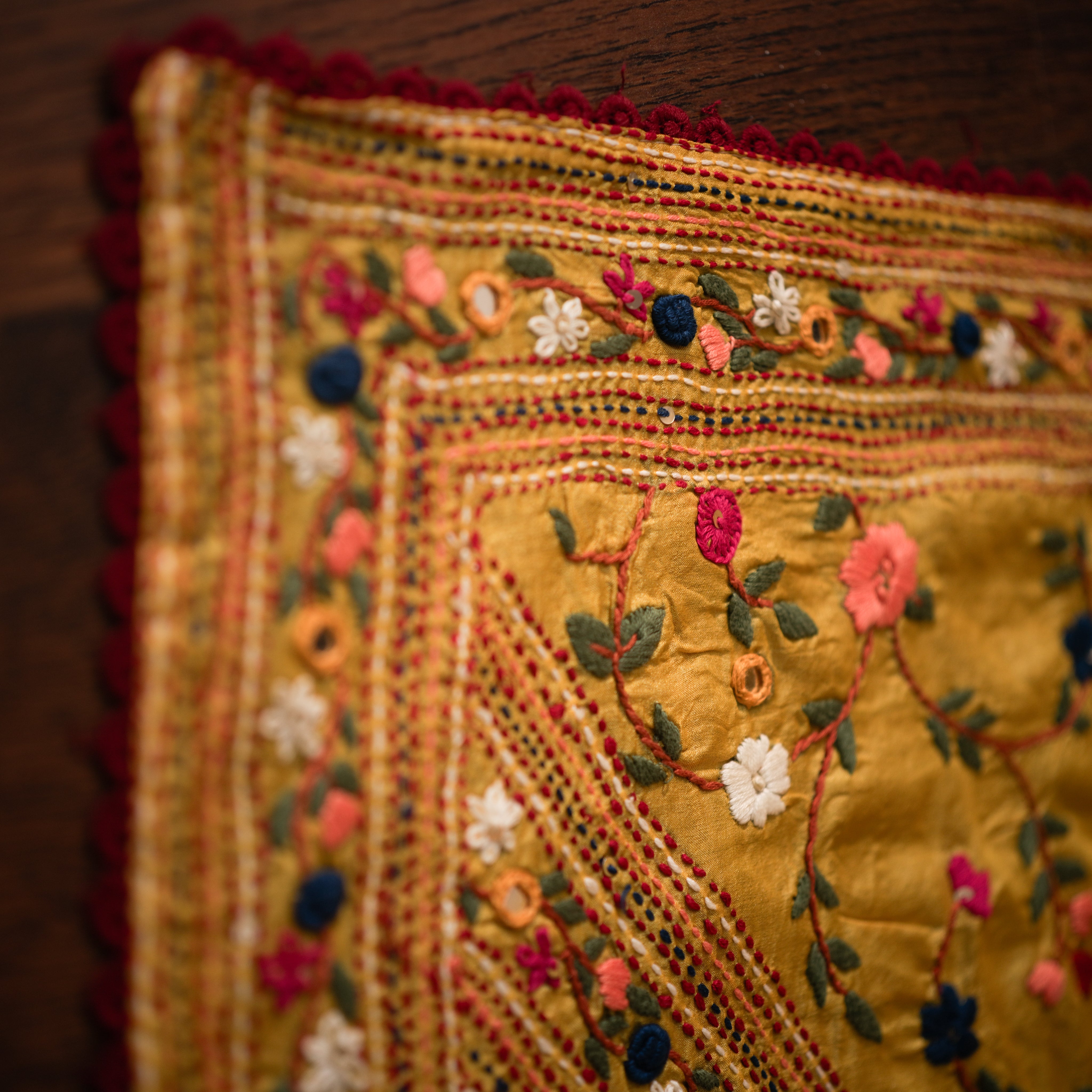 Color: Bright golden yellow base with multicolored bullion stitch embroidery