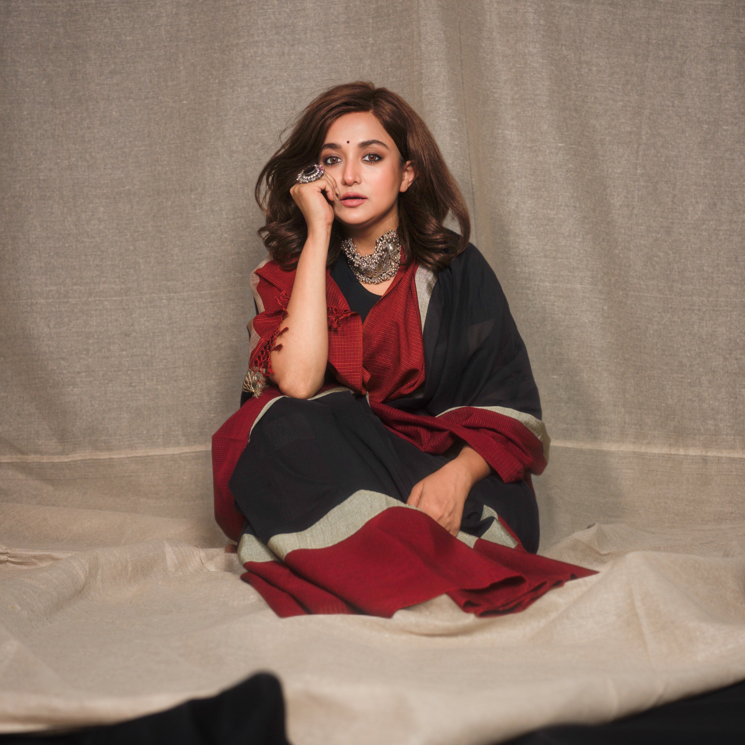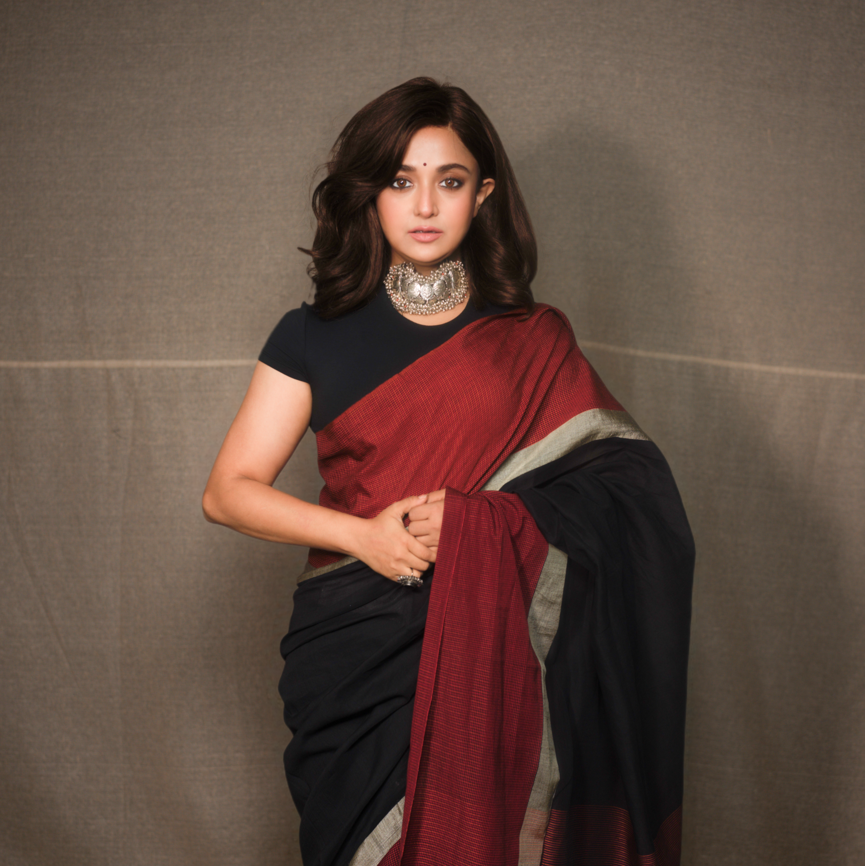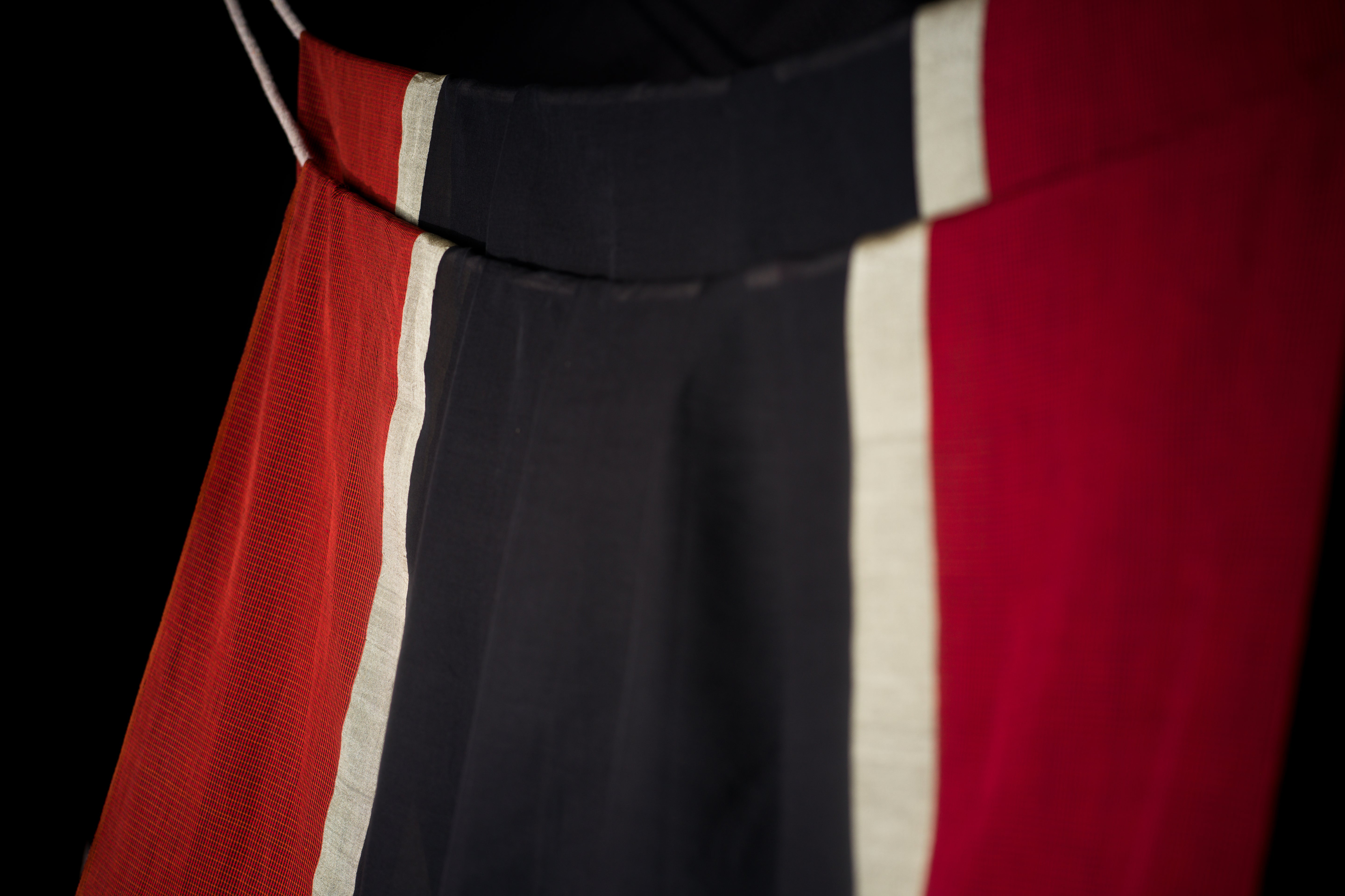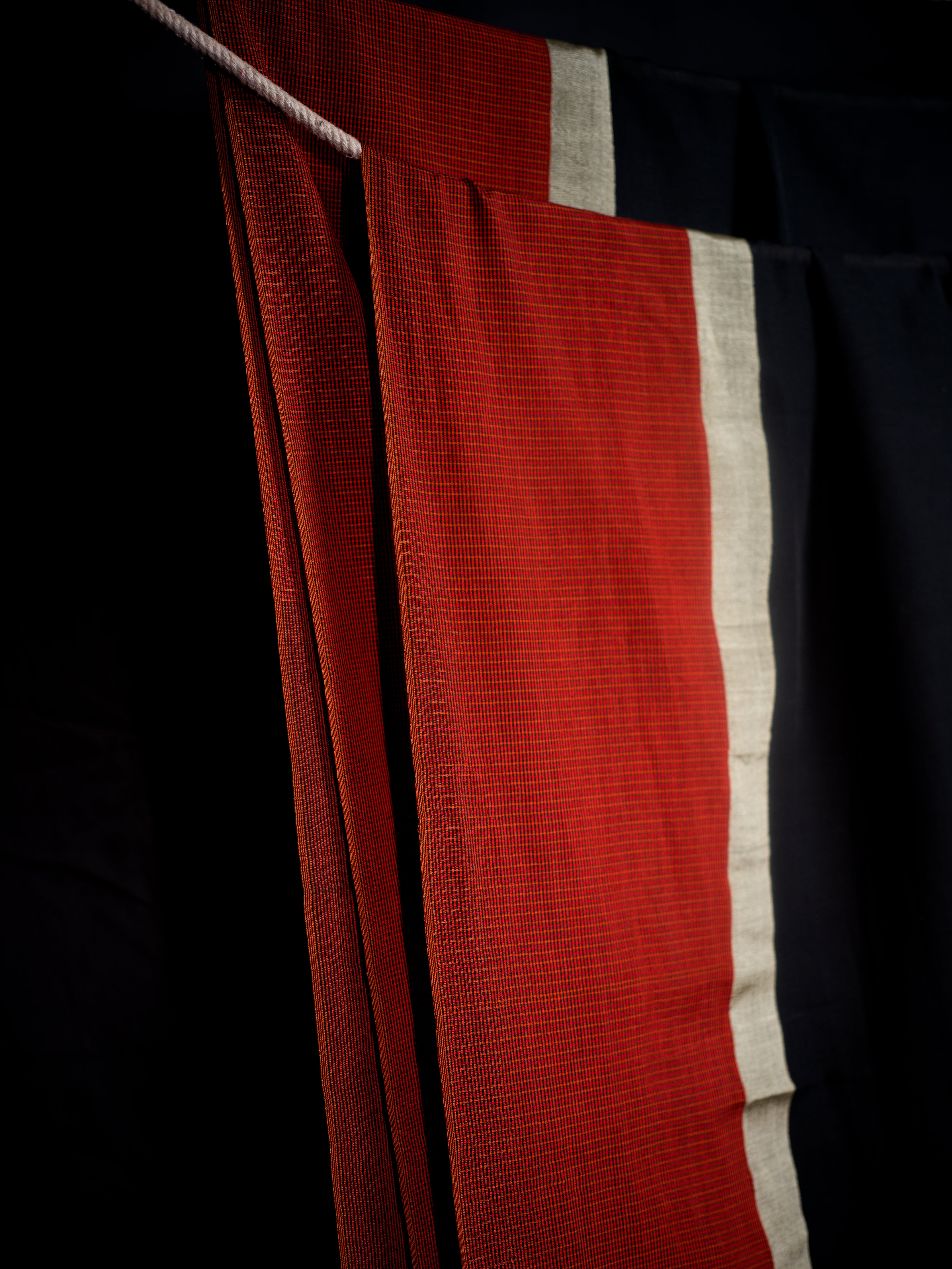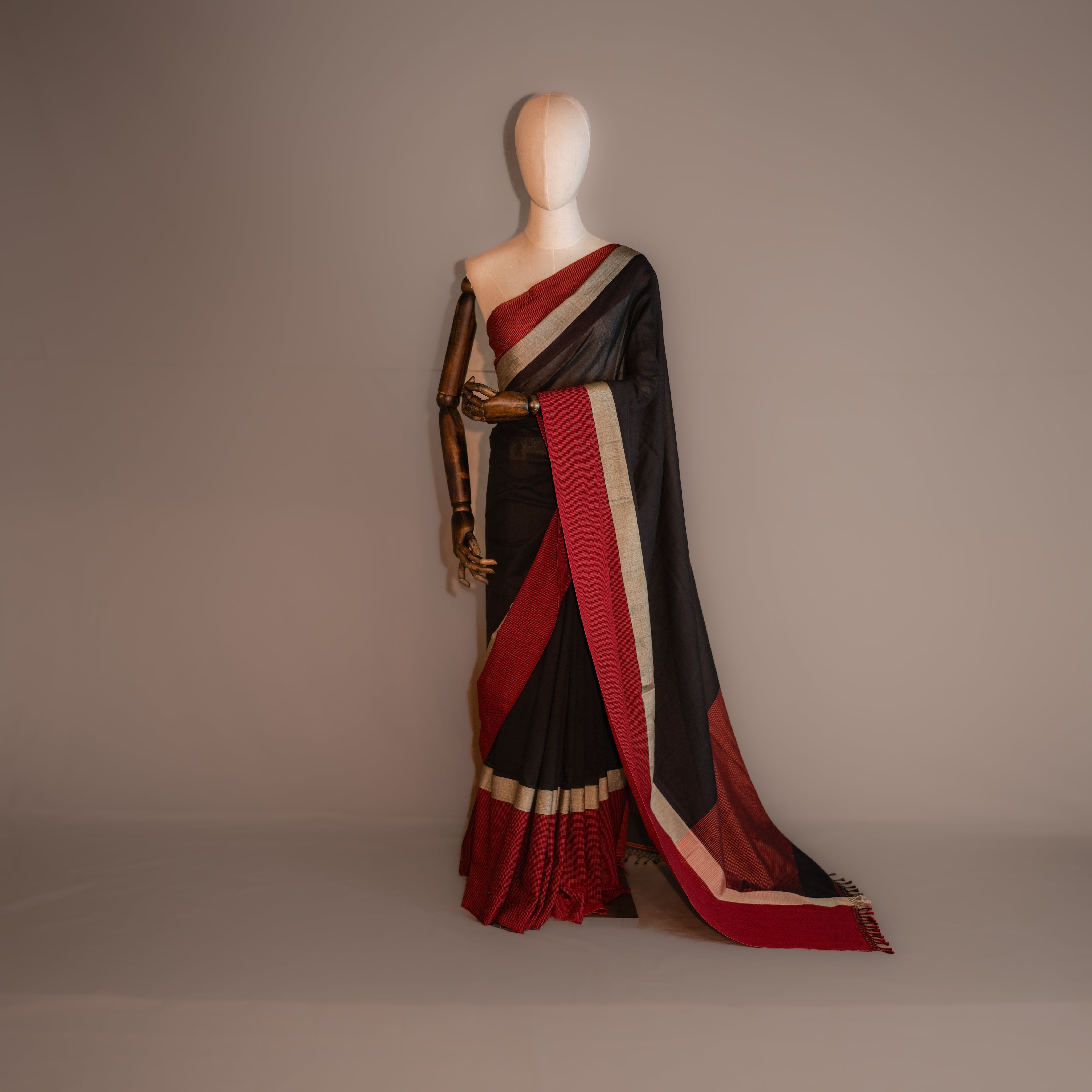 Striking in its simplicity, this pure cotton saree is a celebration of bold contrasts and refined craftsmanship. Handwoven from breathable cotton khadi, it features deep black panels flanked by rich crimson sides and accented with sleek ivory borders. The minimal design and strong color blocking lends it a powerful, modern aesthetic making it perfect for evening events, formal events or cultural gatherings, or days when you want your style to speak volumes.