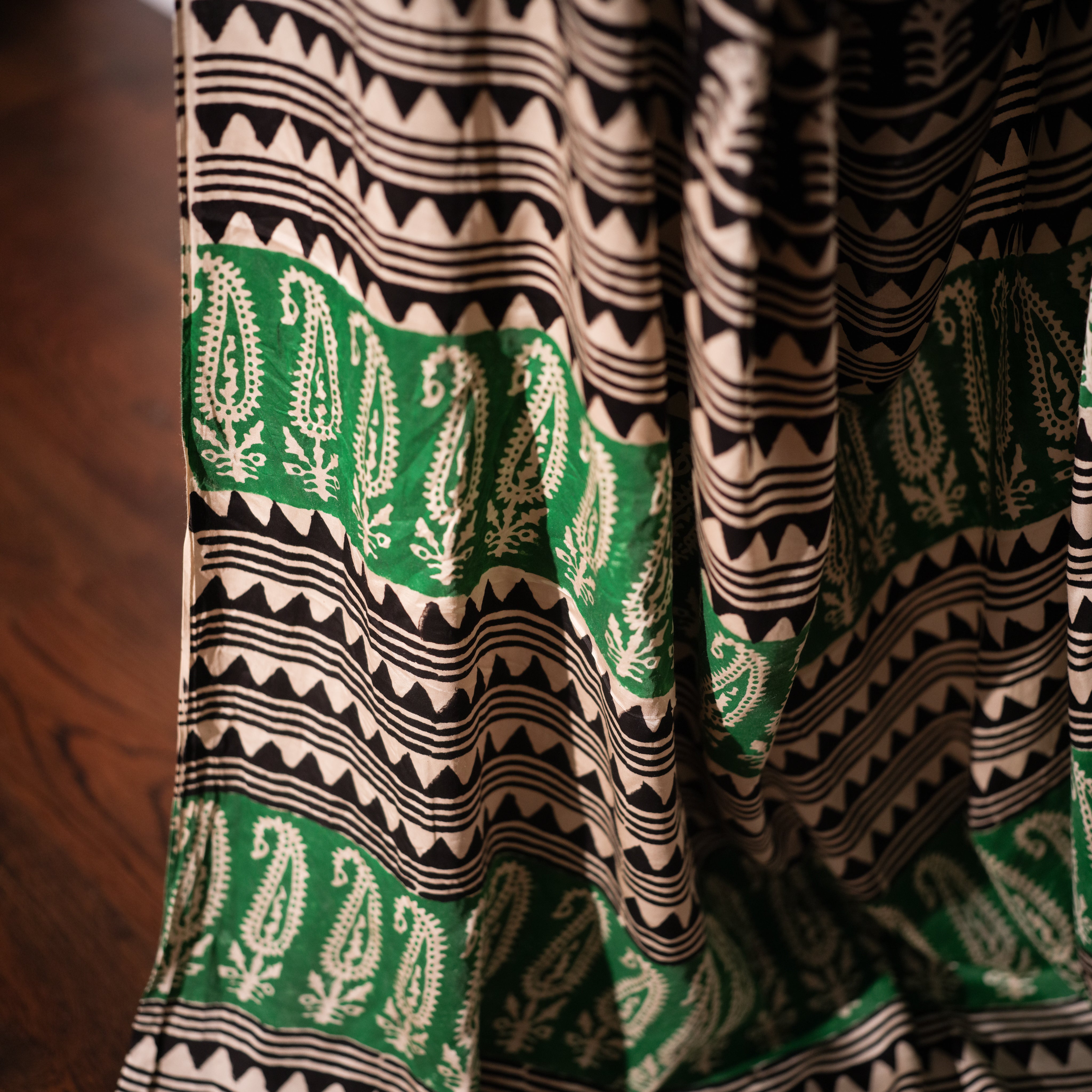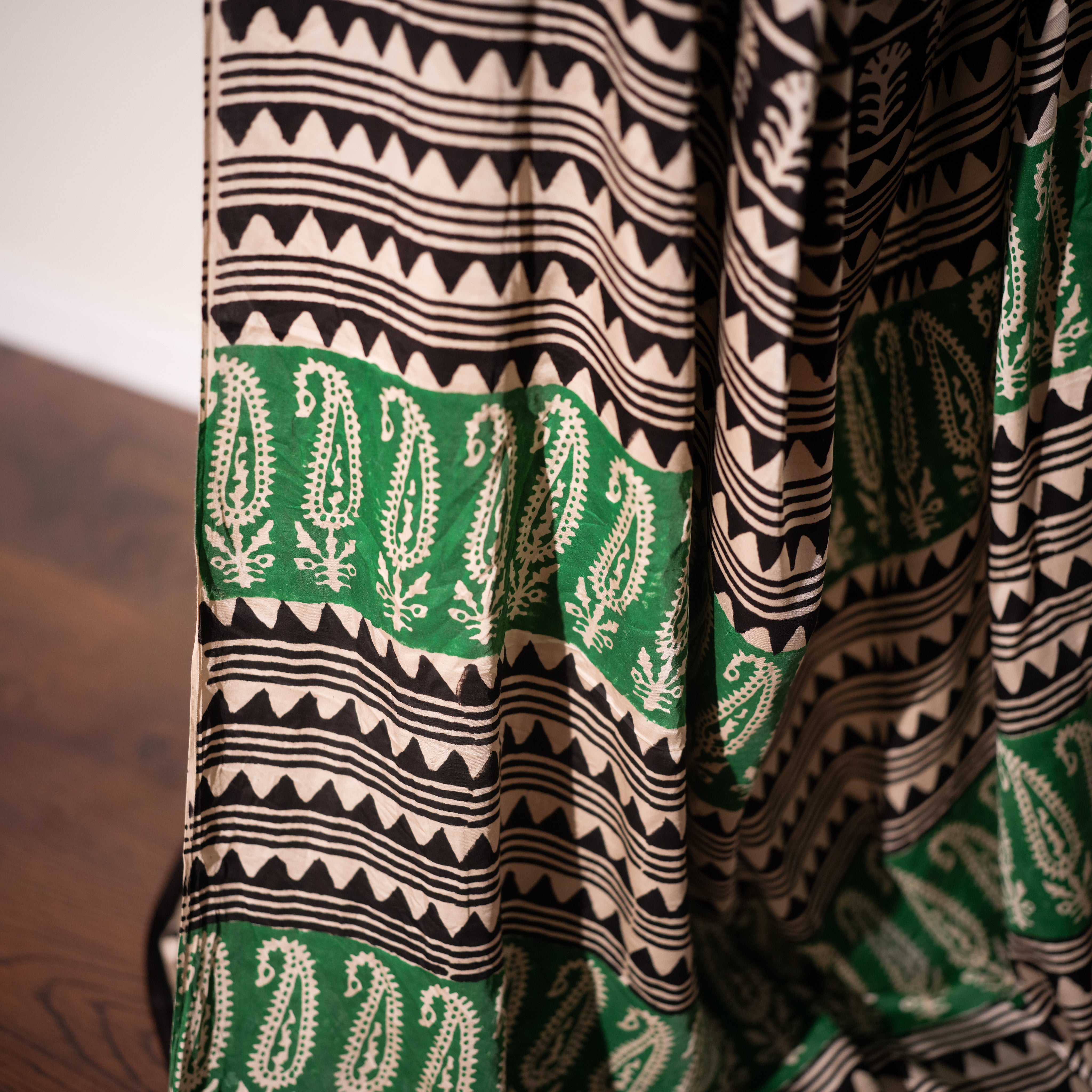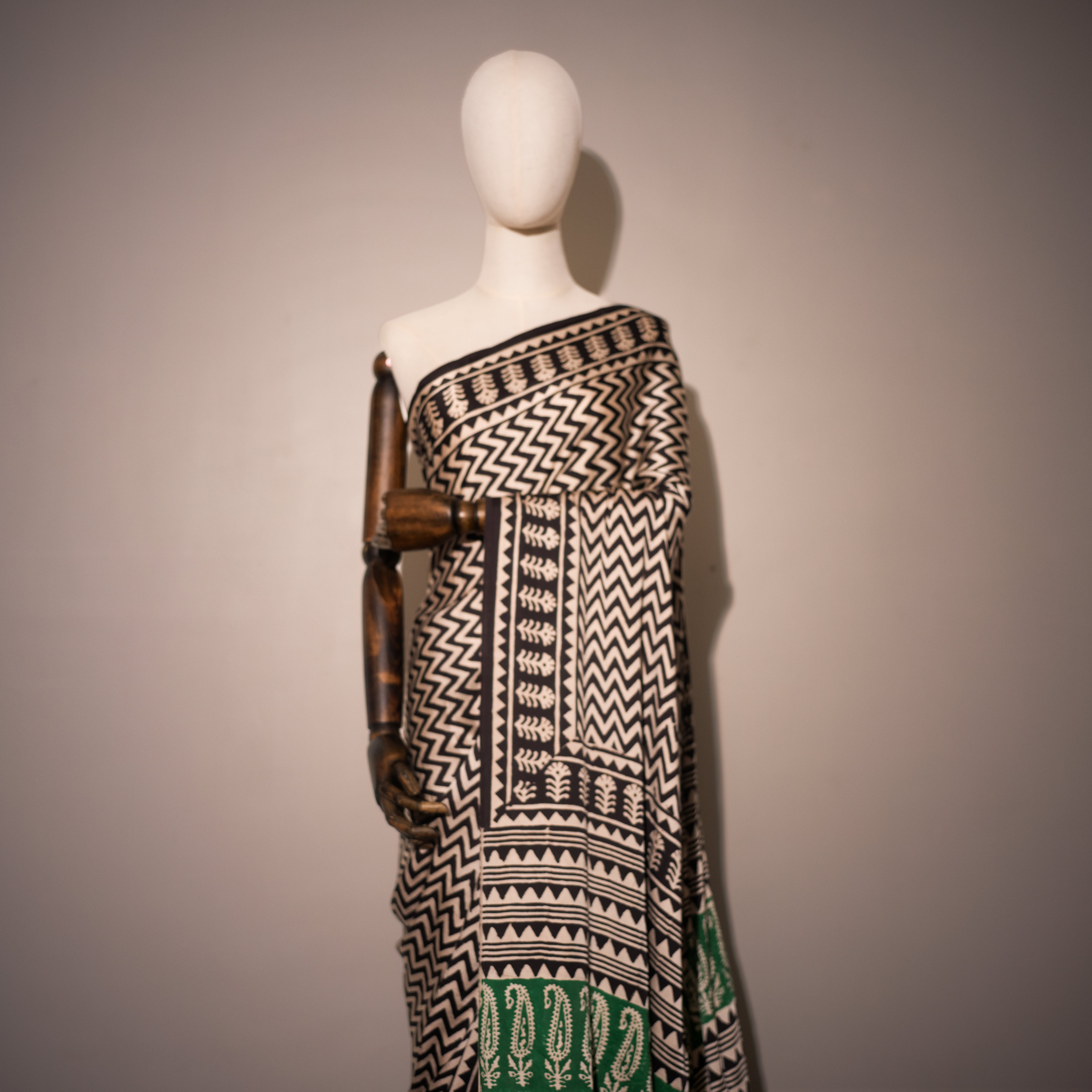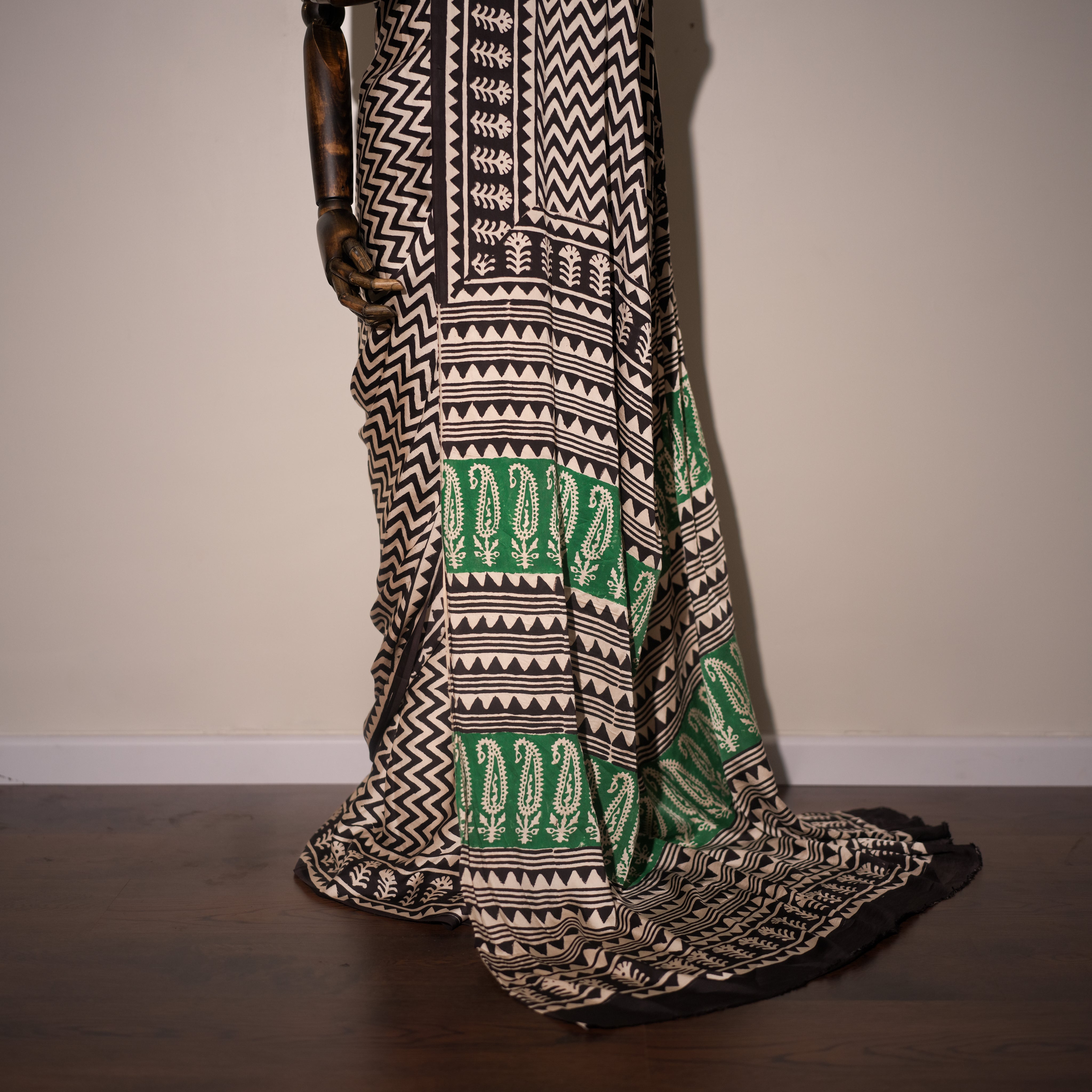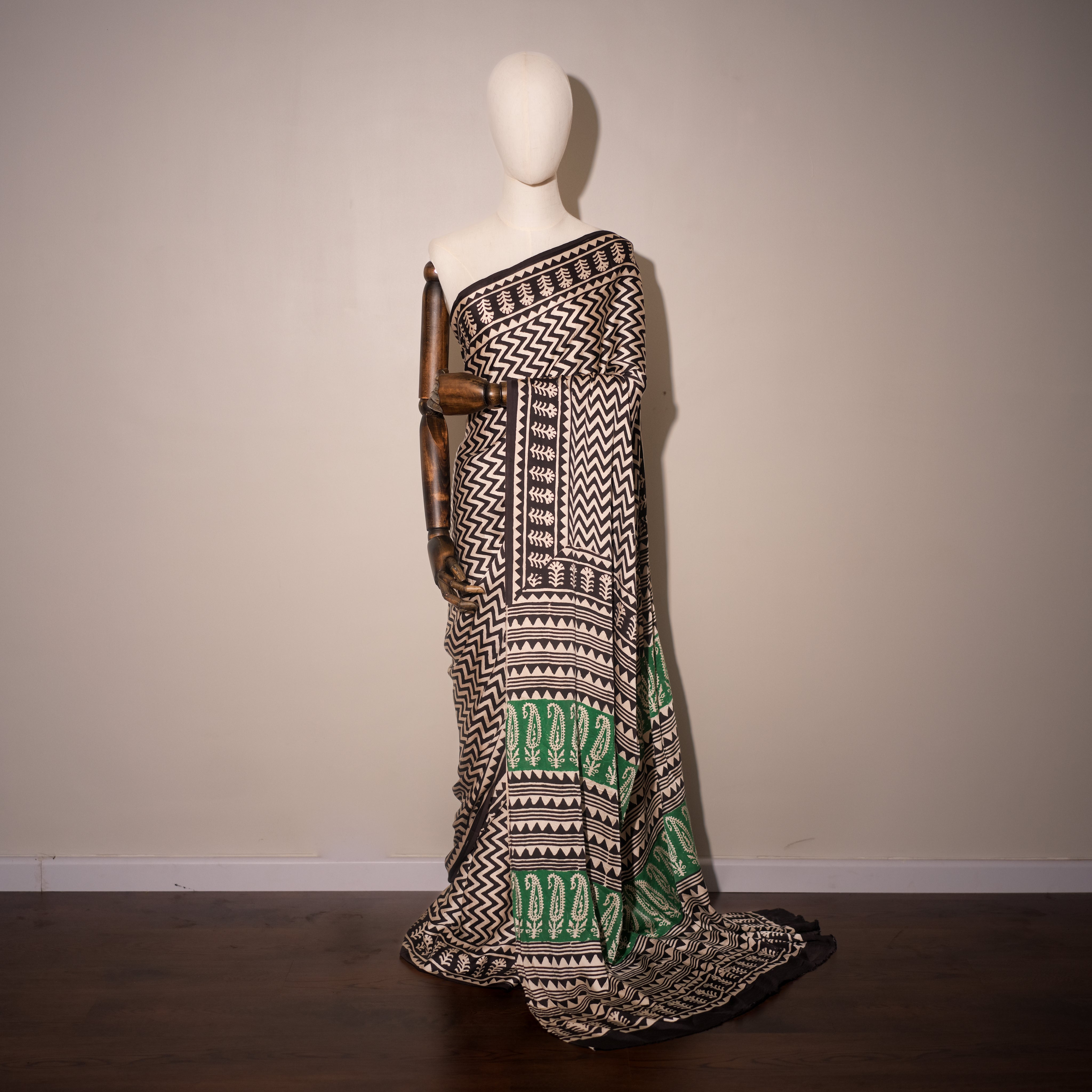 Color – Ivory base with black geometric patterns and green paisley accents