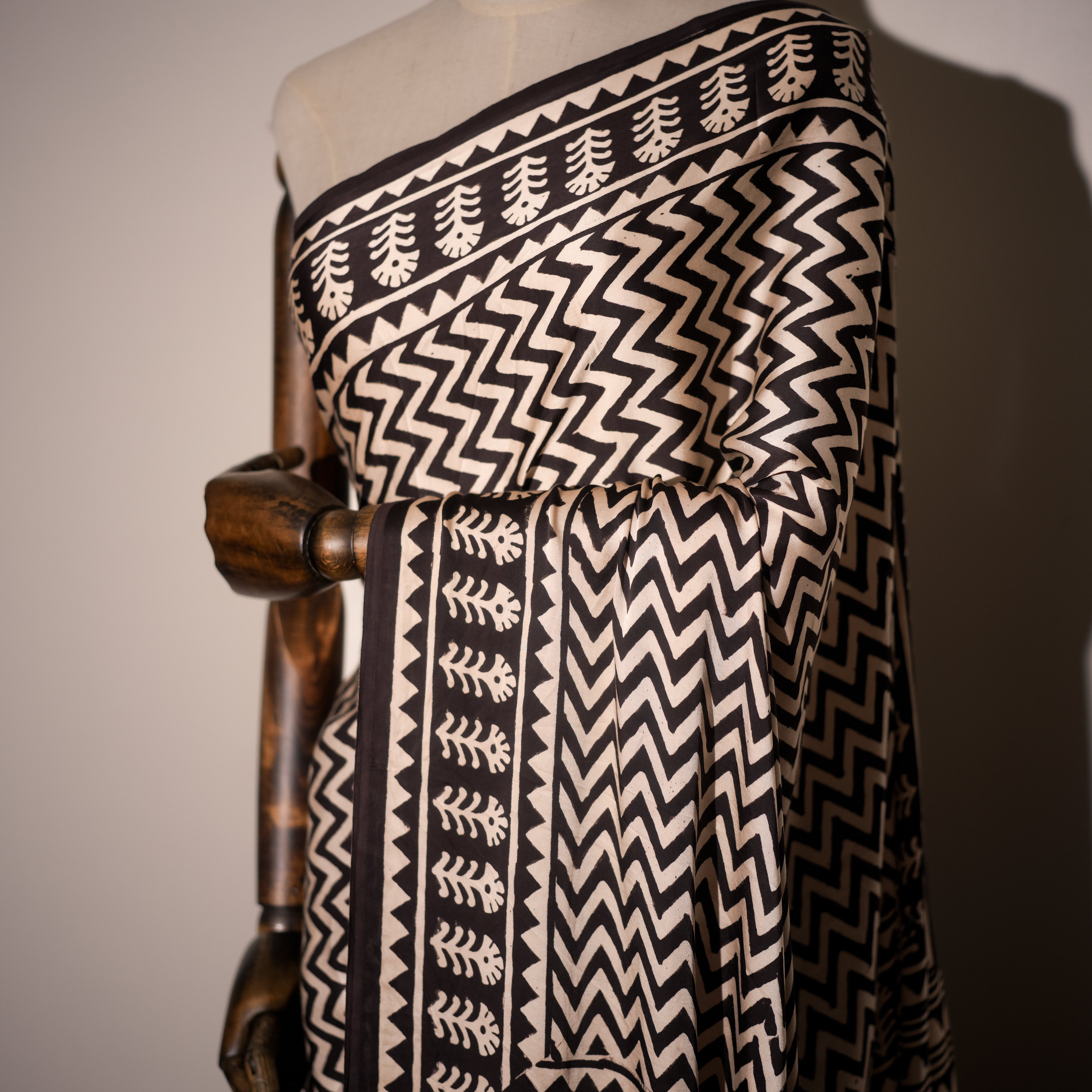 Geometric Symphony in Ivory & Black Silk Saree
