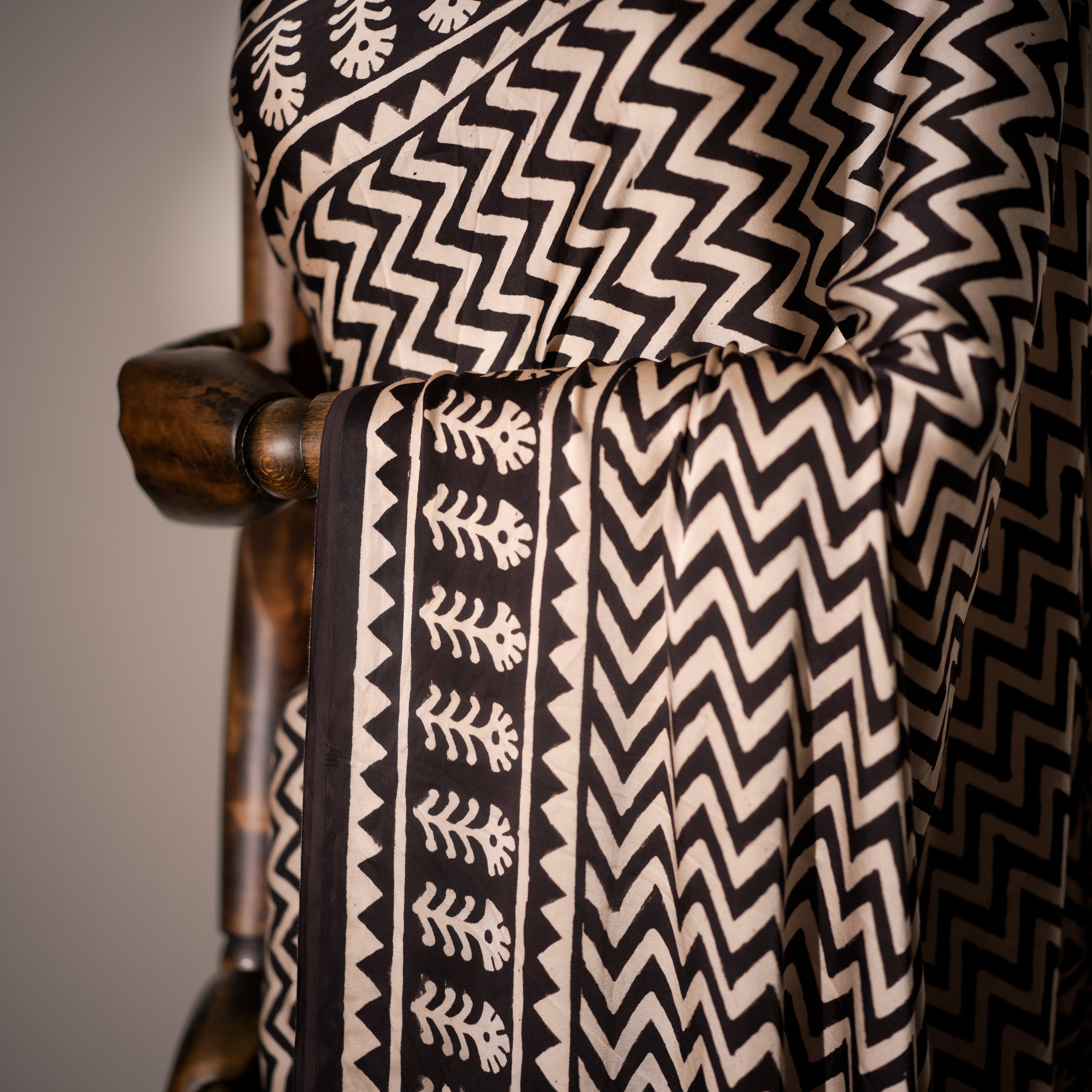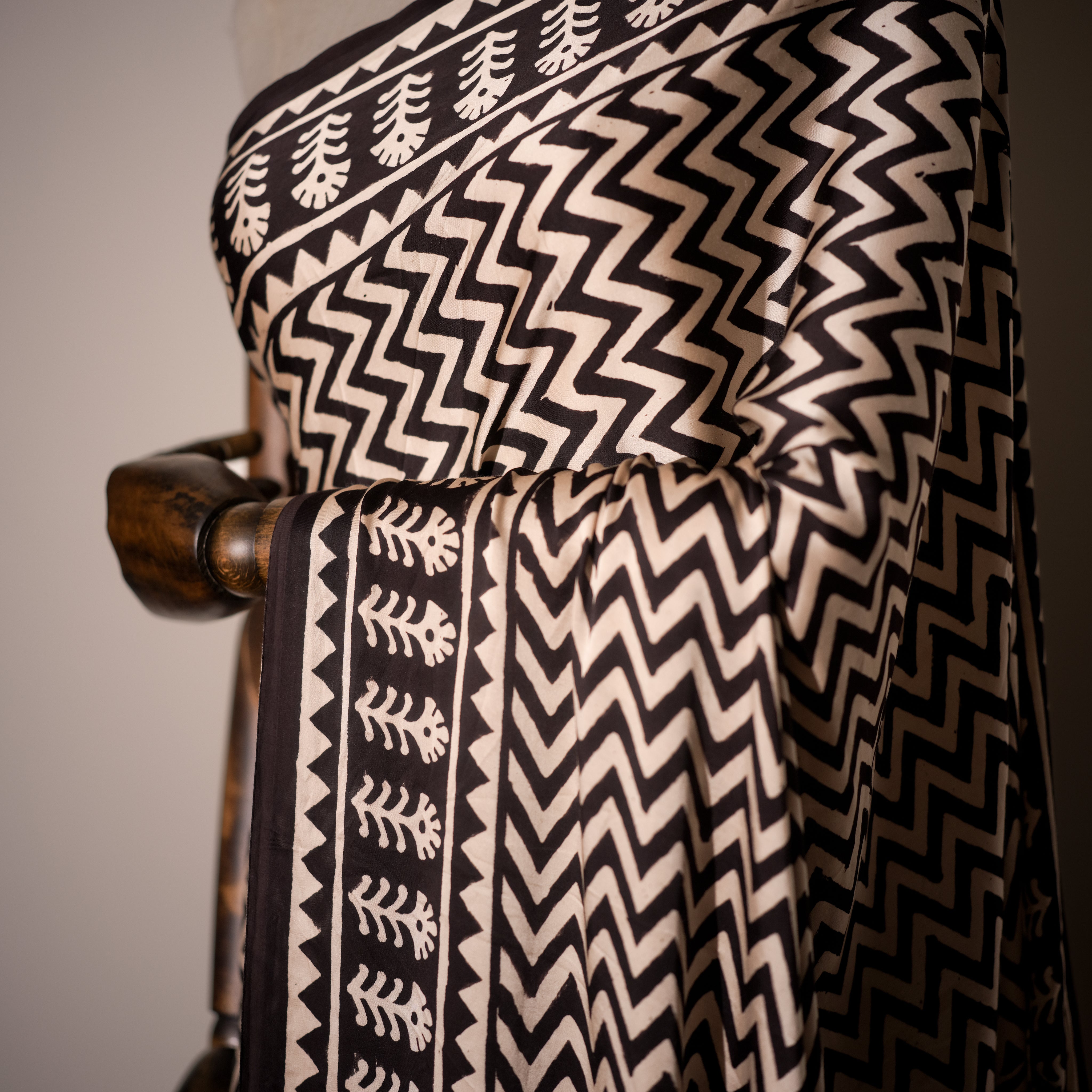 This exquisite saree in modal silk celebrates the harmony of geometry and tradition. Its ivory base comes alive with bold black zig-zag, chevron, and tribal-inspired motifs, creating a striking contrast that feels both timeless and contemporary. The saree is further enhanced by a touch of deep green paisley blocks along the drape, lending it a refreshing accent of color that balances the monochrome elegance. Perfect for those who admire minimalism with a statement, this saree is versatile—ideal for both formal occasions and artistic gatherings.