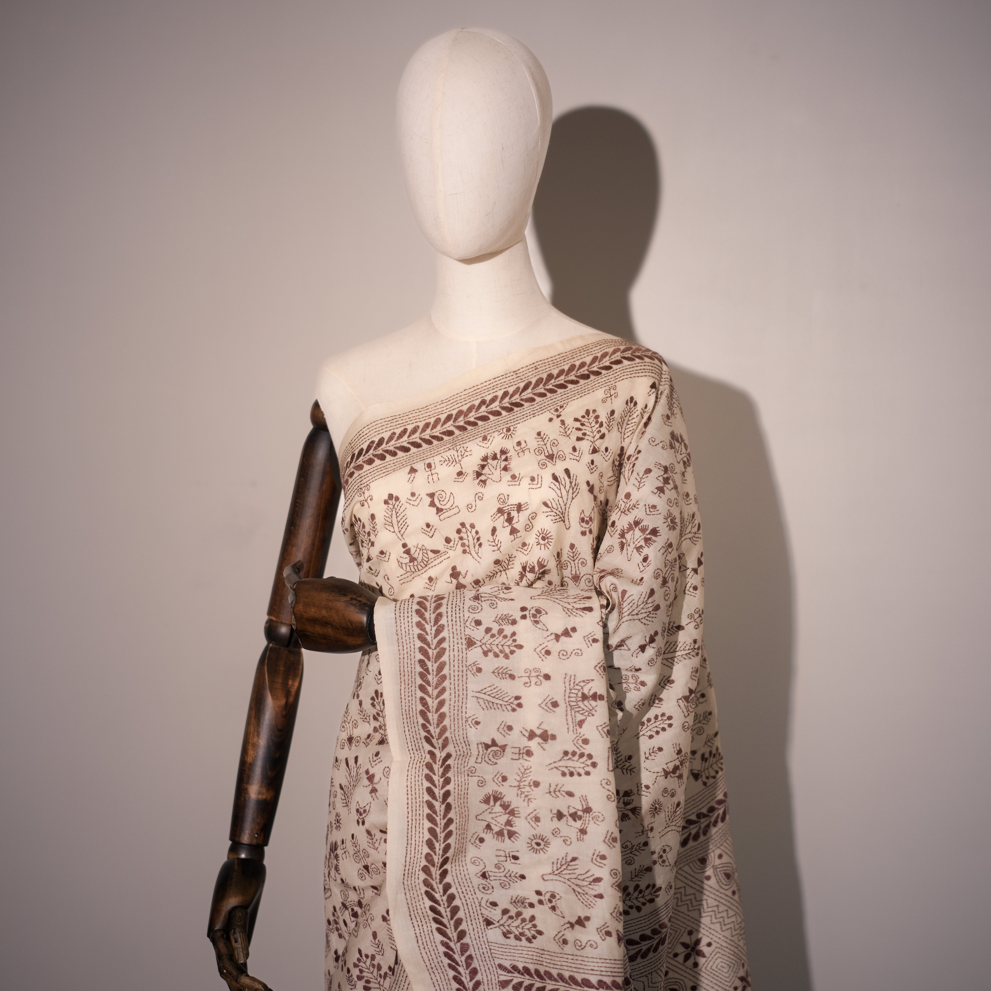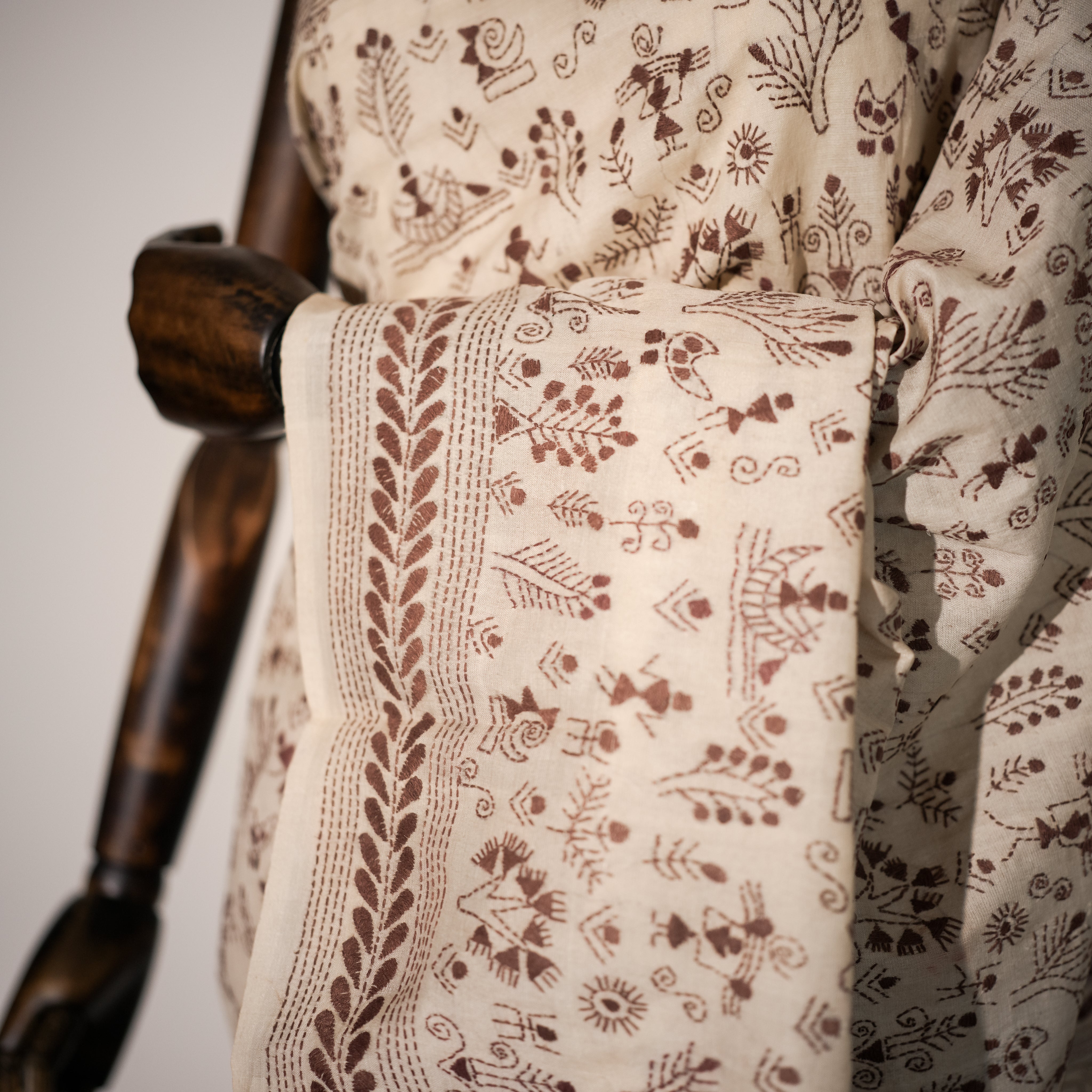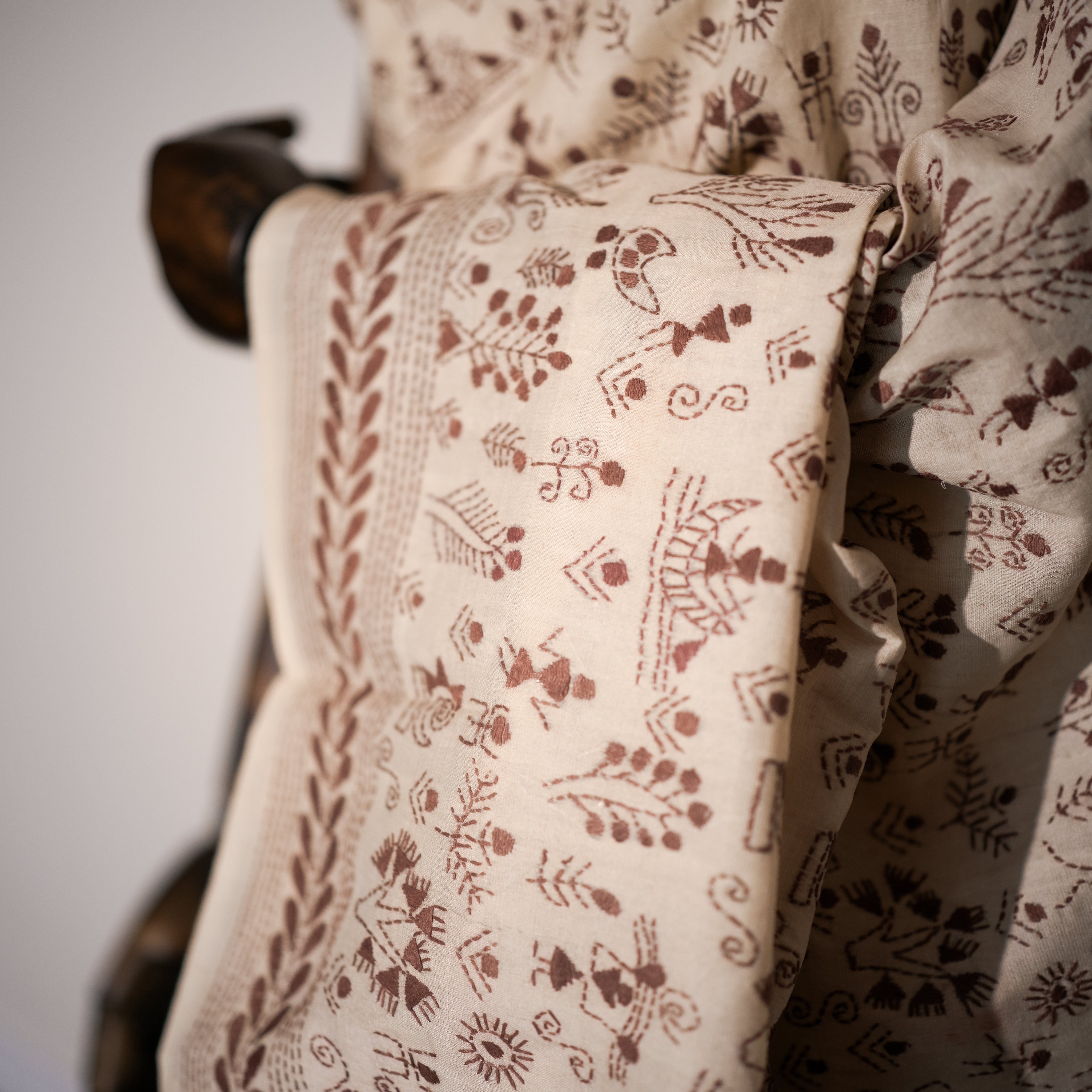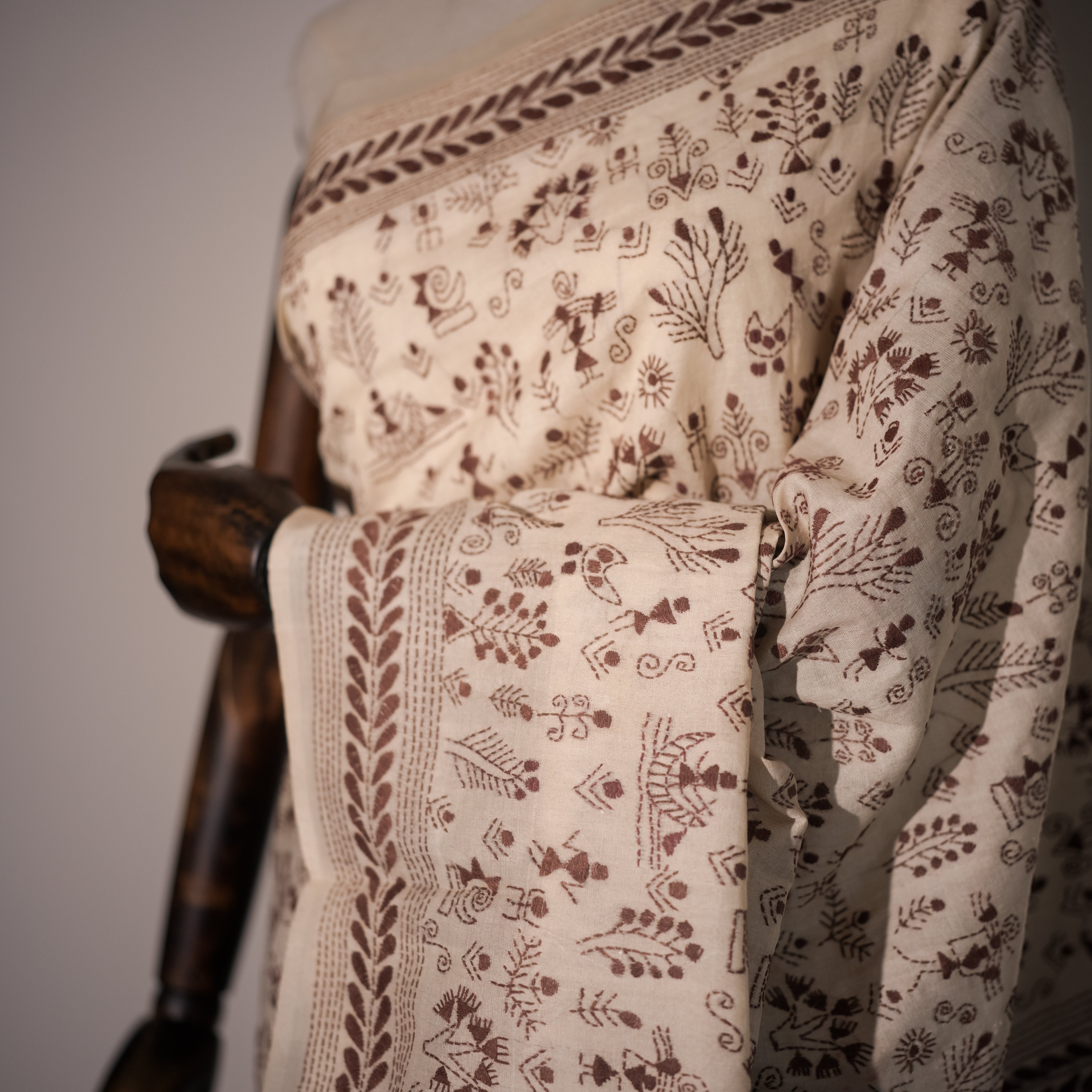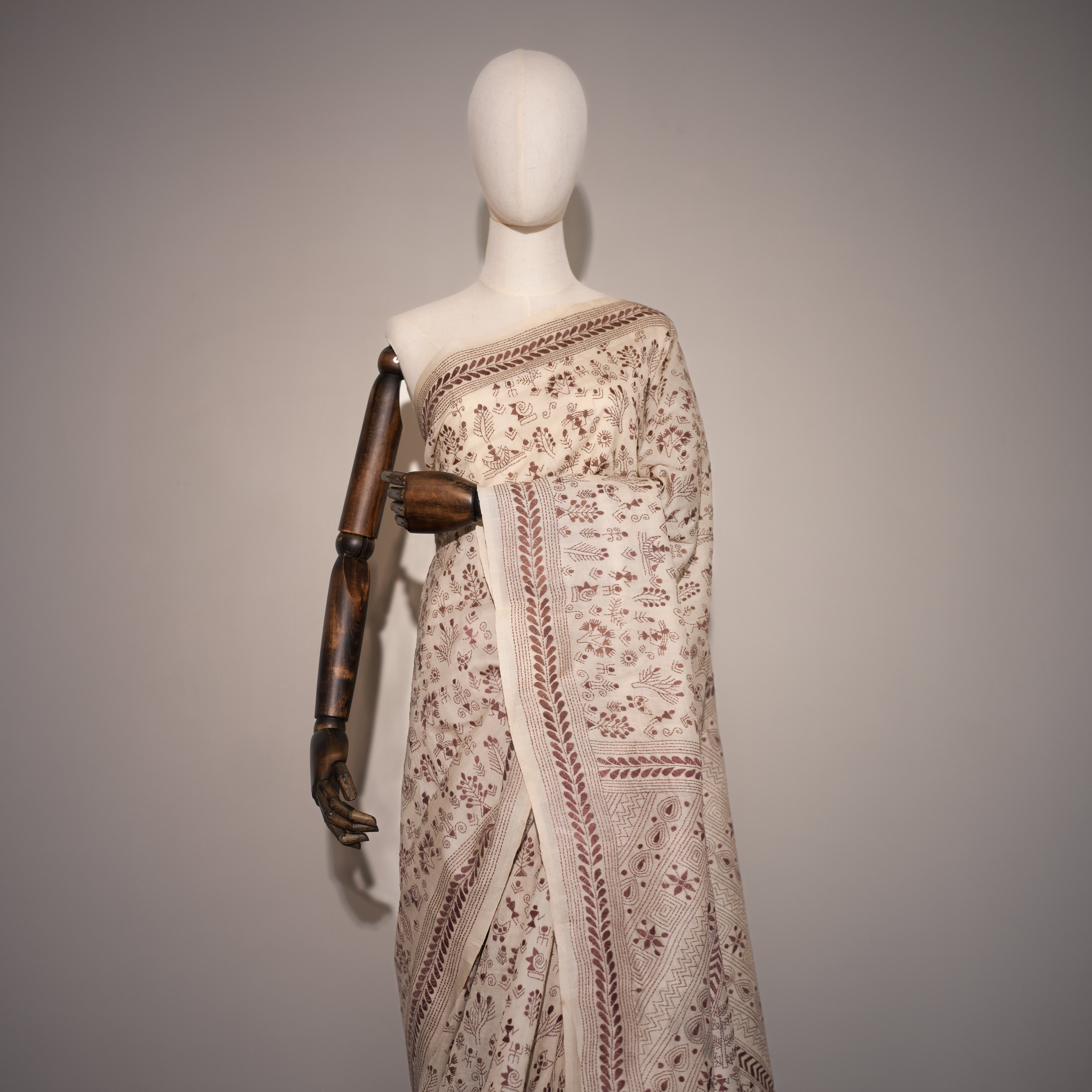 This exquisite ivory Katha stitch saree is meticulously hand-embroidered with intricate maroon threadwork. The fabric radiates elegance, while the detailed motifs capture traditional artistry, featuring florals, foliage, and narrative-inspired patterns that bring the textile to life. The contrasting maroon embroidery on the soft ivory base gives it a timeless grace, perfect for both cultural celebrations and elegant soirées. Each stitch reflects the artisan’s devotion, turning this saree into a wearable story of heritage and craftsmanship.