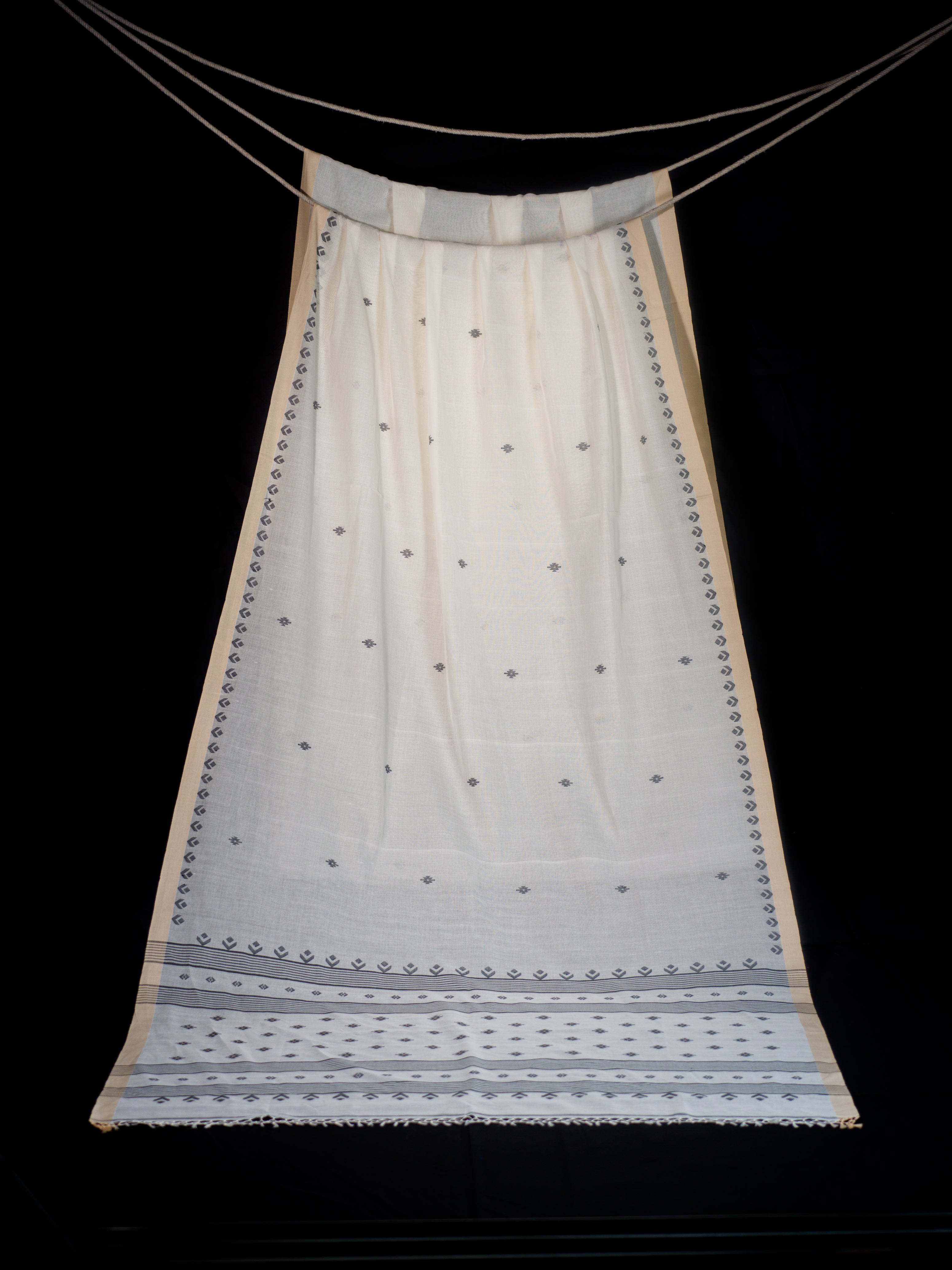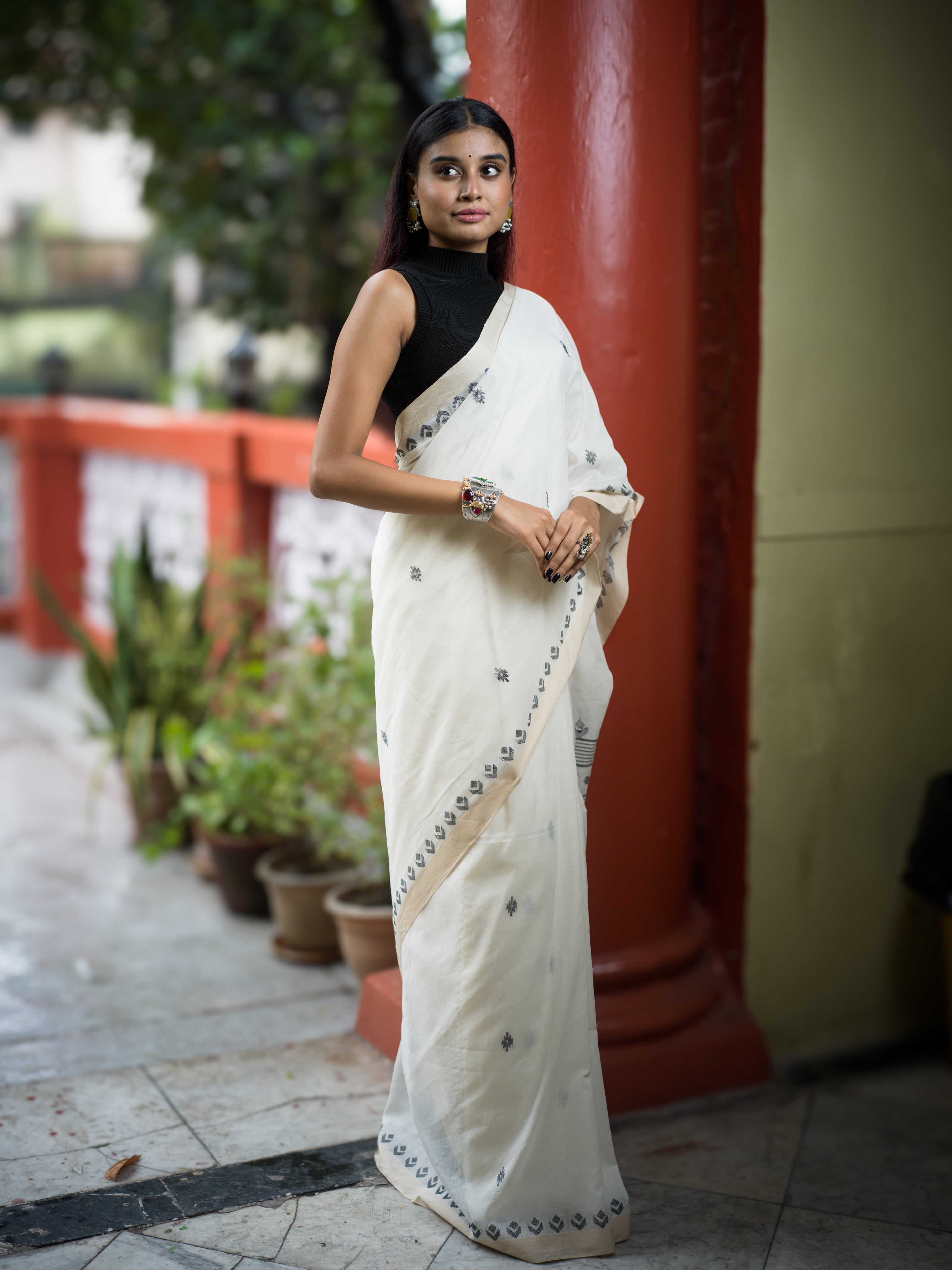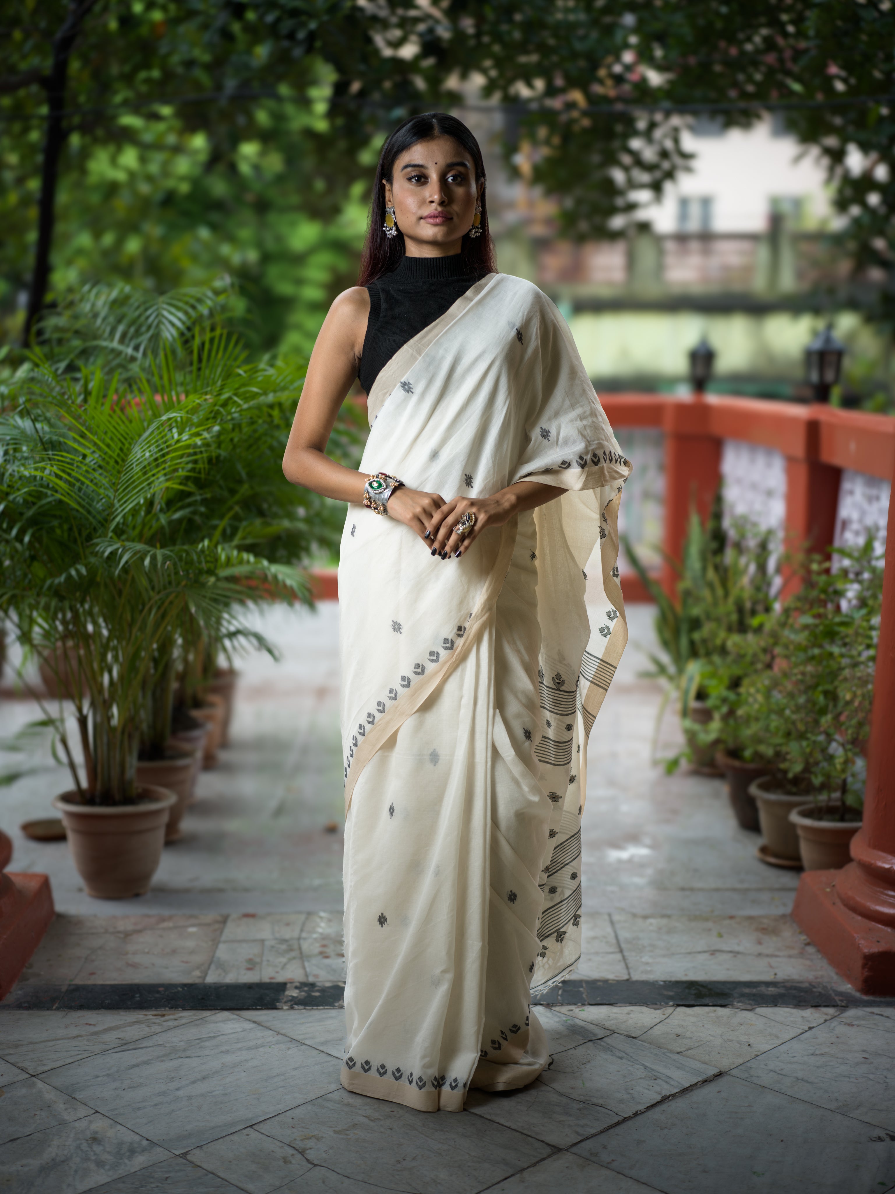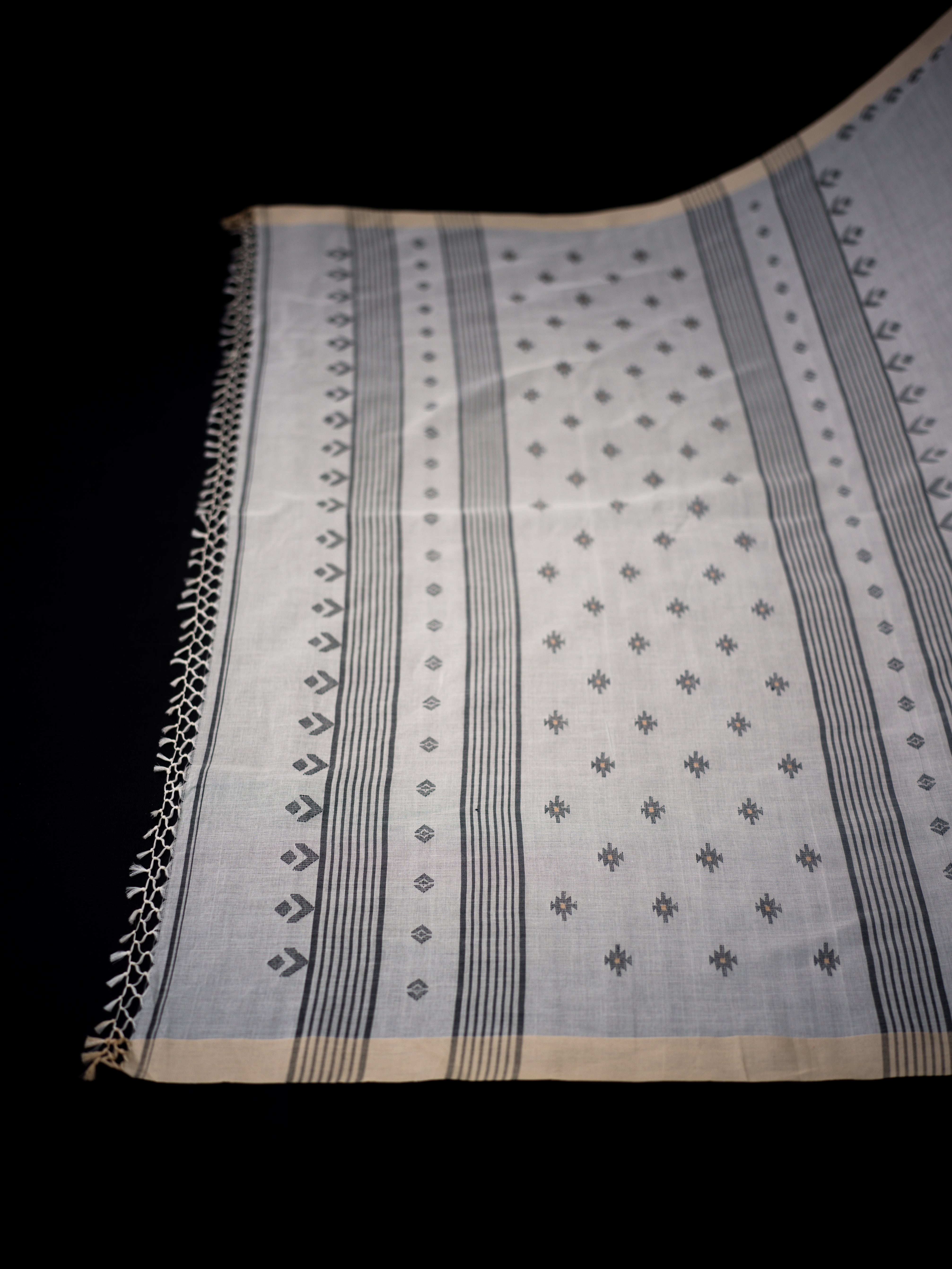 Clean and classic, this ivory cotton khadi Jamdaani saree features subtle grey butis arranged across the body and geometric vine borders. The pallu is adorned with linear striped detailing, offering a sophisticated edge to its traditional weave. Ideal for daytime occasions, cultural events, or minimal festive styling.