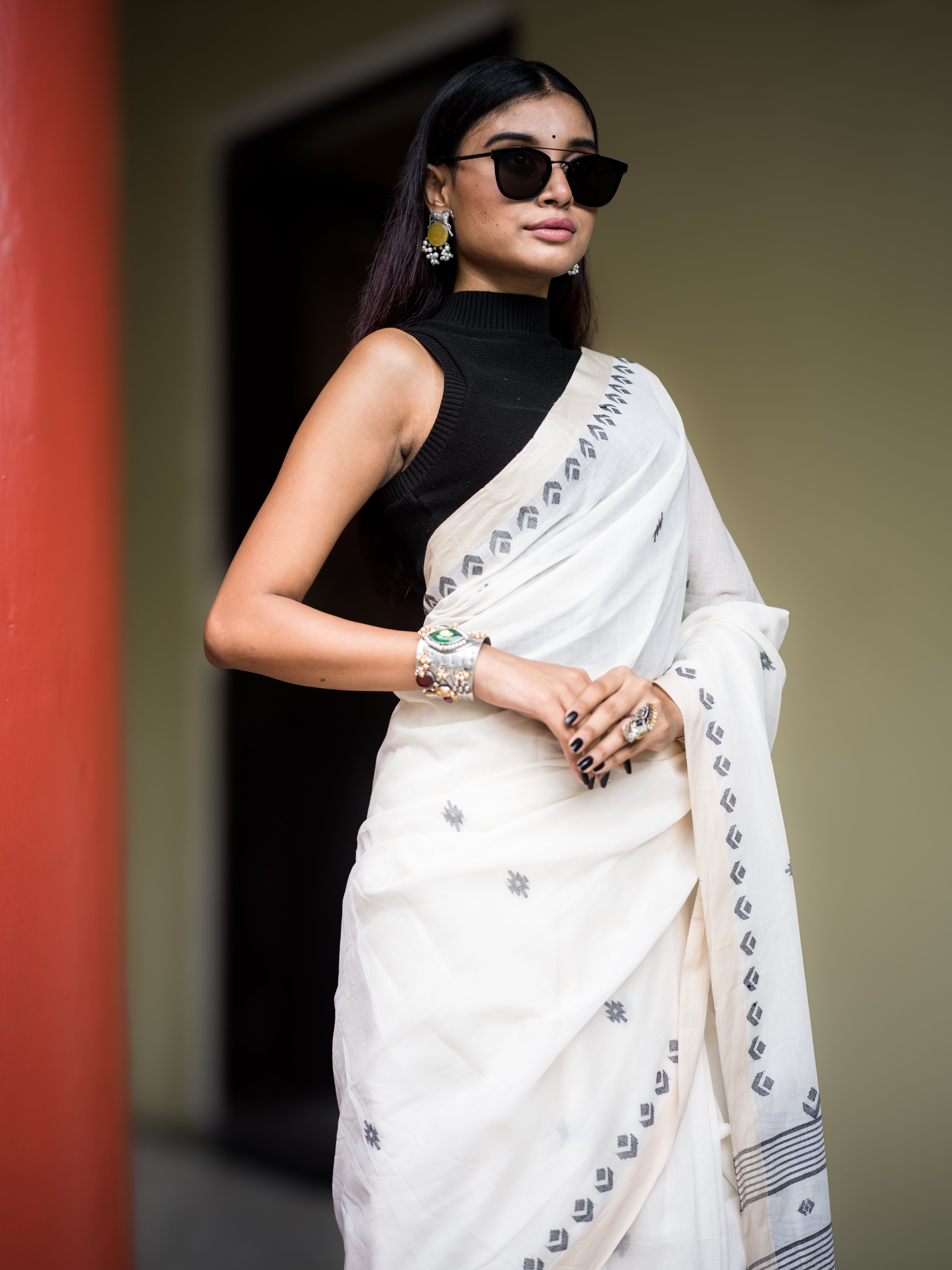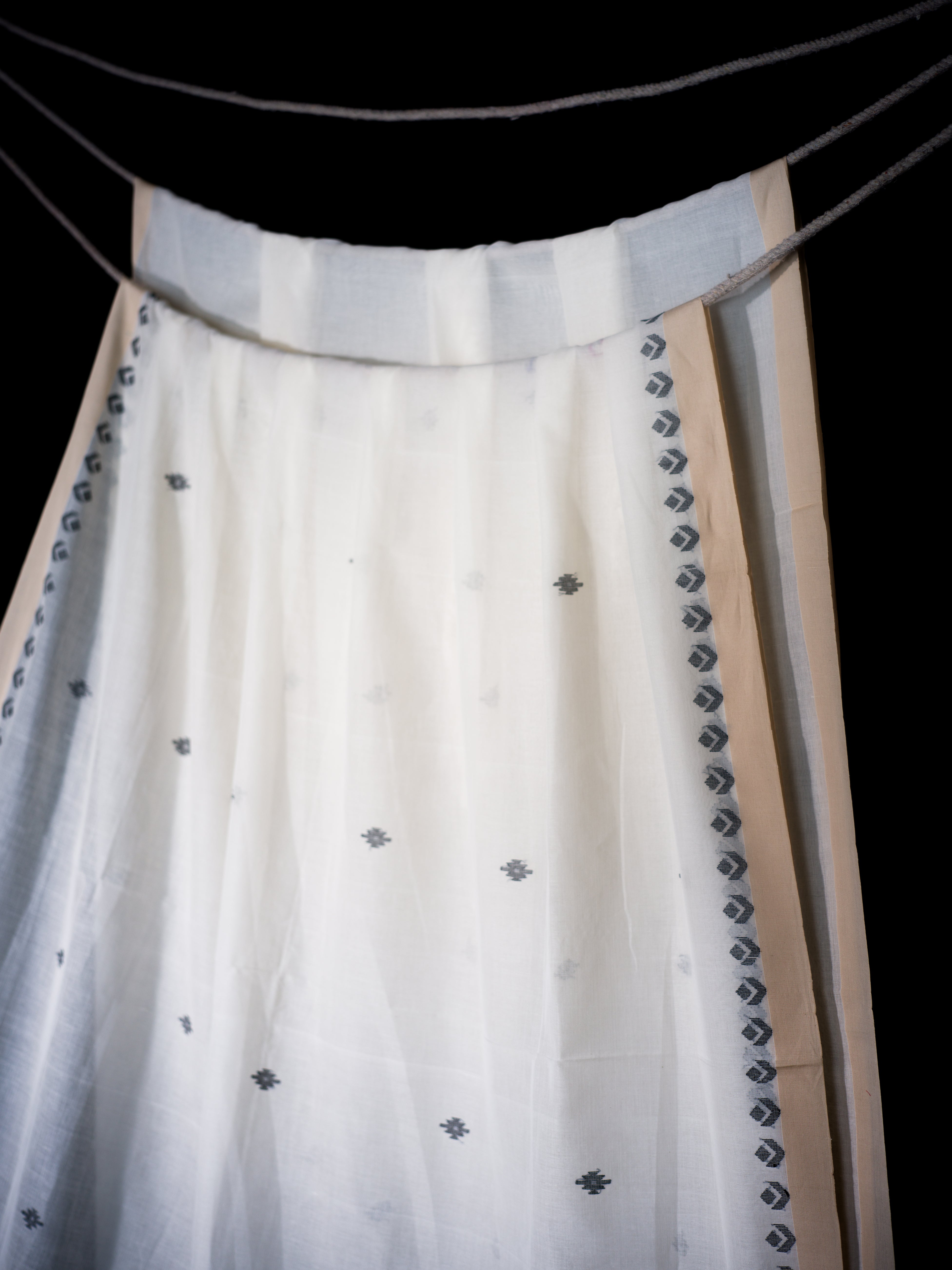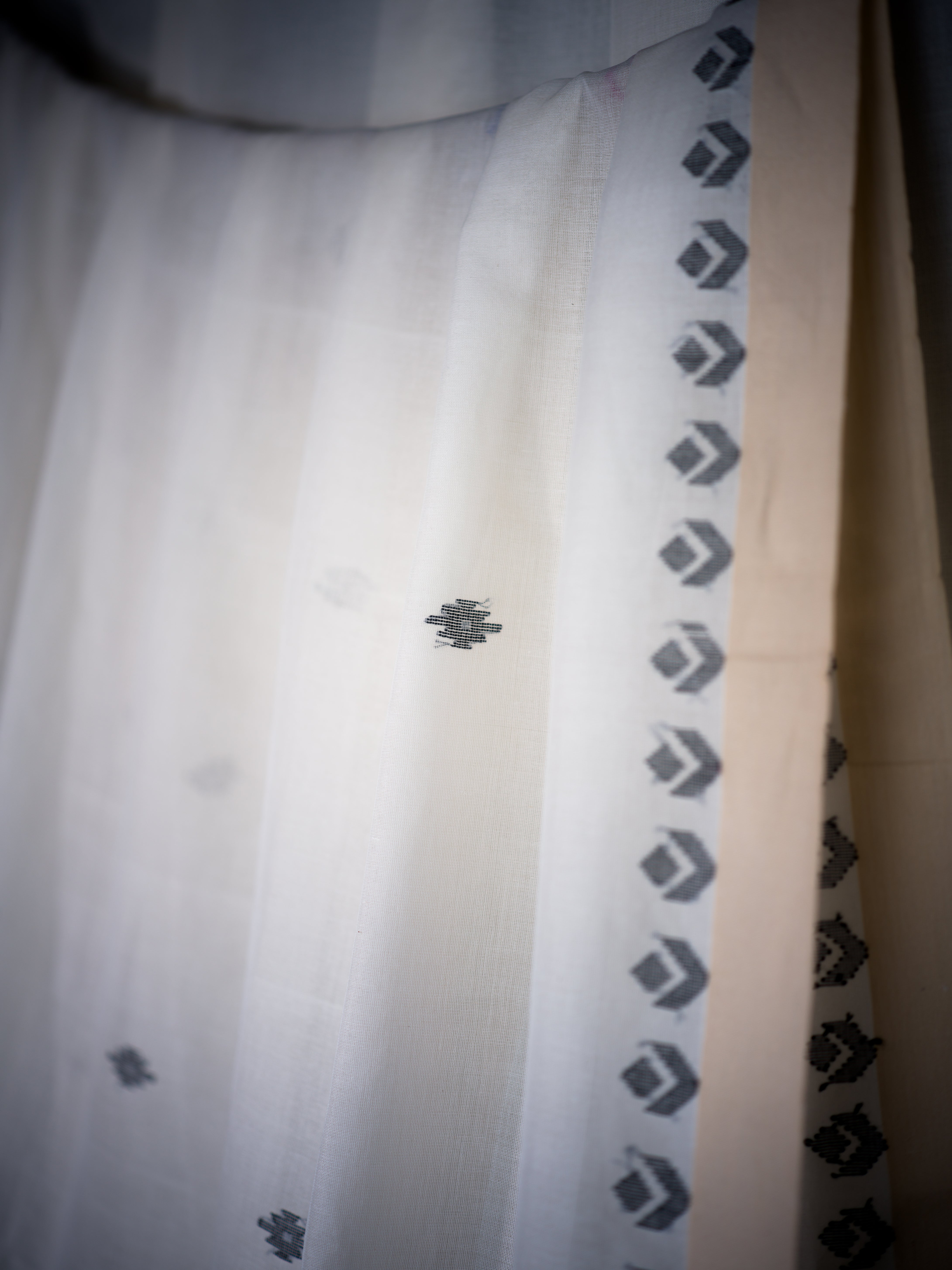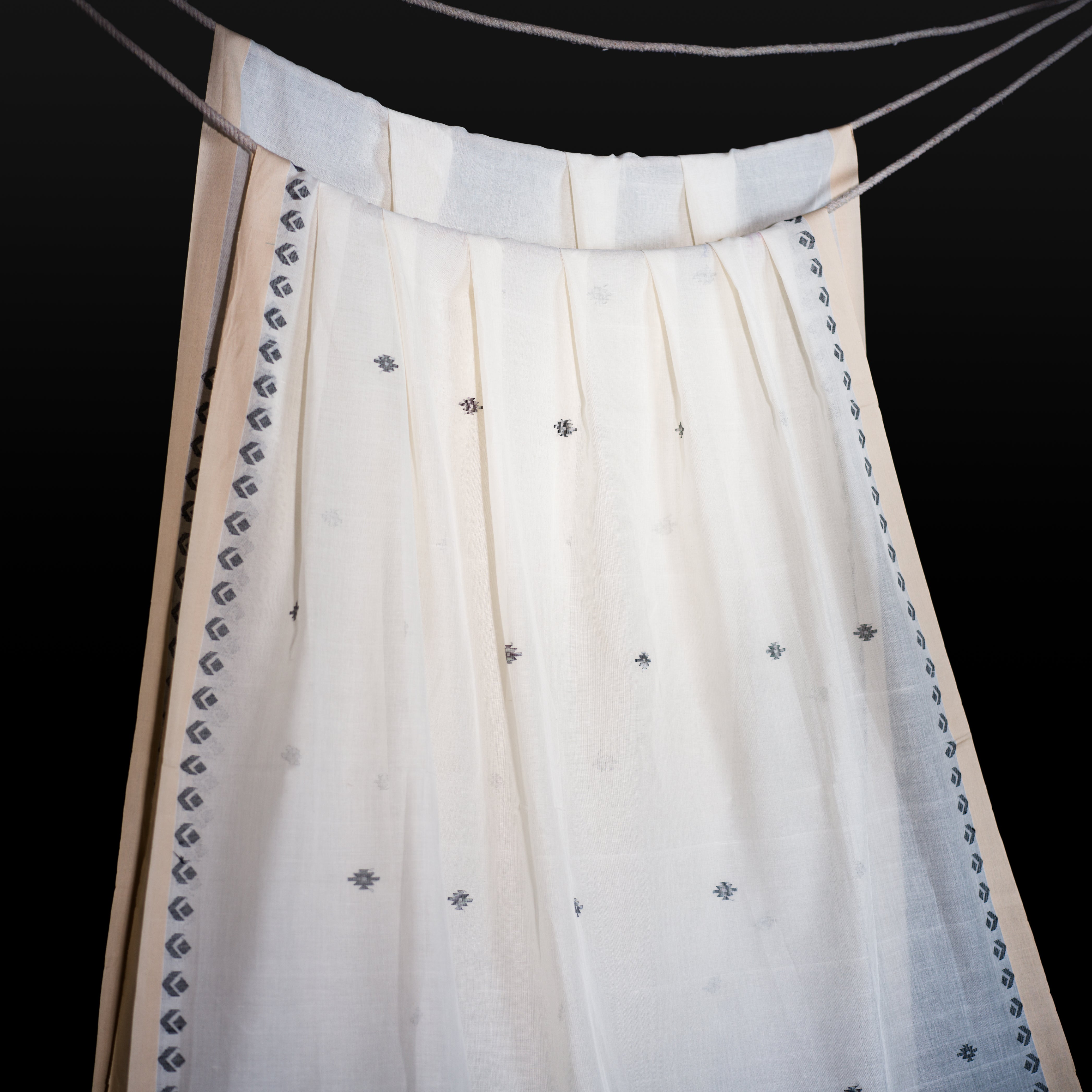 Clean and classic, this ivory cotton khadi Jamdaani saree features subtle grey butis arranged across the body and geometric vine borders. The pallu is adorned with linear striped detailing, offering a sophisticated edge to its traditional weave. Ideal for daytime occasions, cultural events, or minimal festive styling.