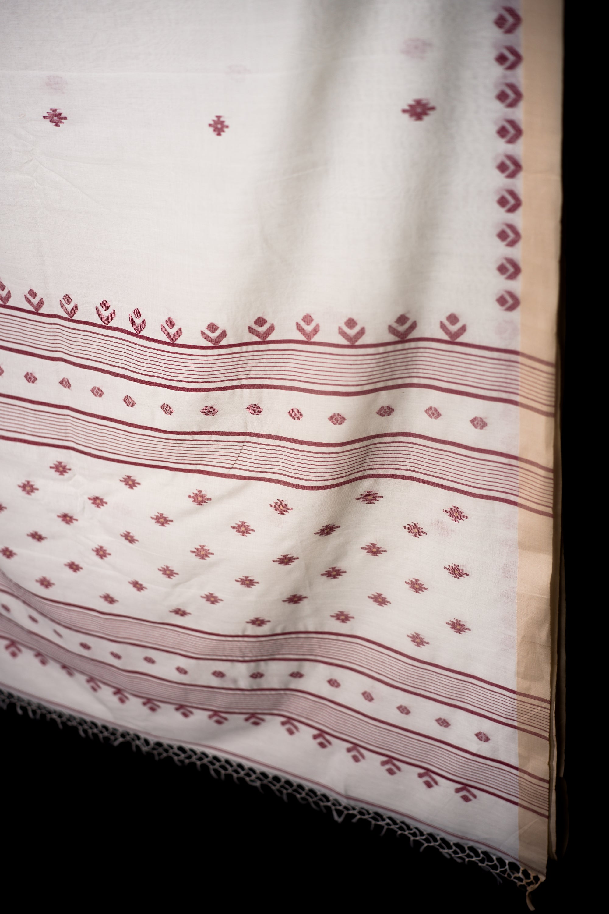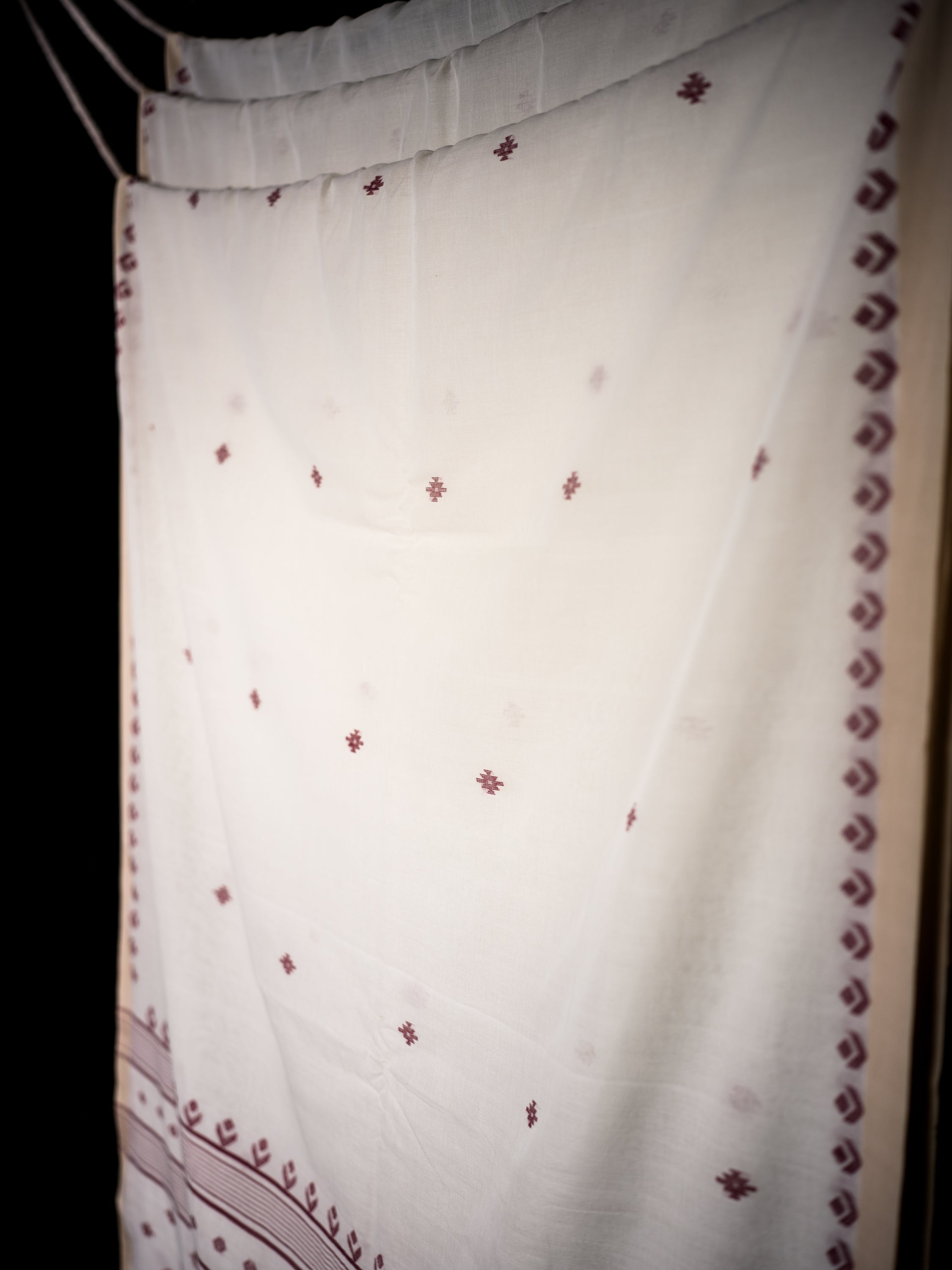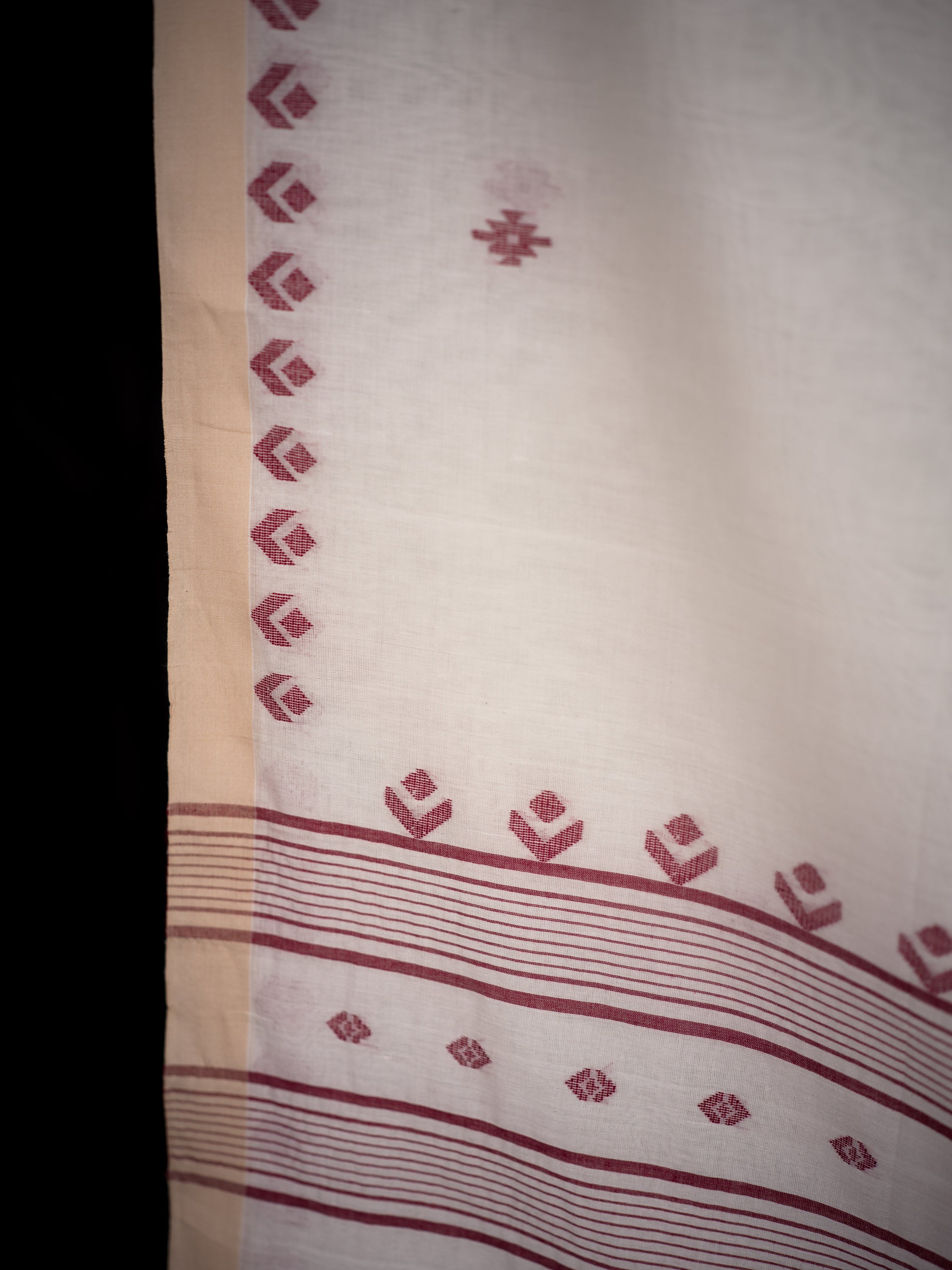 A vision of timeless sophistication, this pure cotton Jamdani saree embodies the quiet luxury of Bengal’s handloom heritage. Woven in a soft ivory-white base, it exudes an understated glow of purity and grace. Along its edges runs a delicate beige border, carrying a calm refinement, while maroon Jamdani motifs are meticulously woven along the border and scattered gracefully across the body. The pallu extends this harmony, balancing minimalism with fine artistry, making the saree a piece of both heritage and modern elegance.