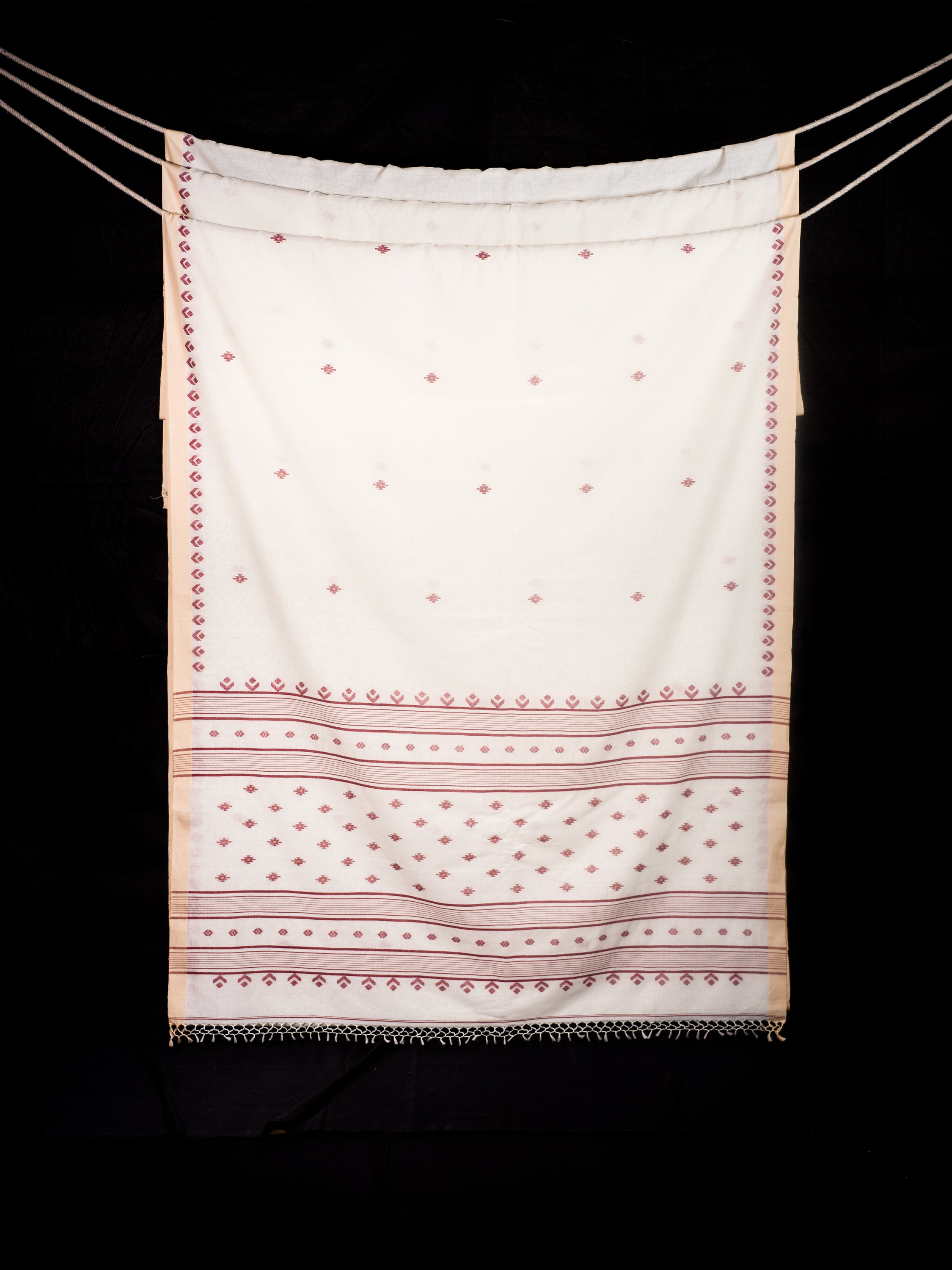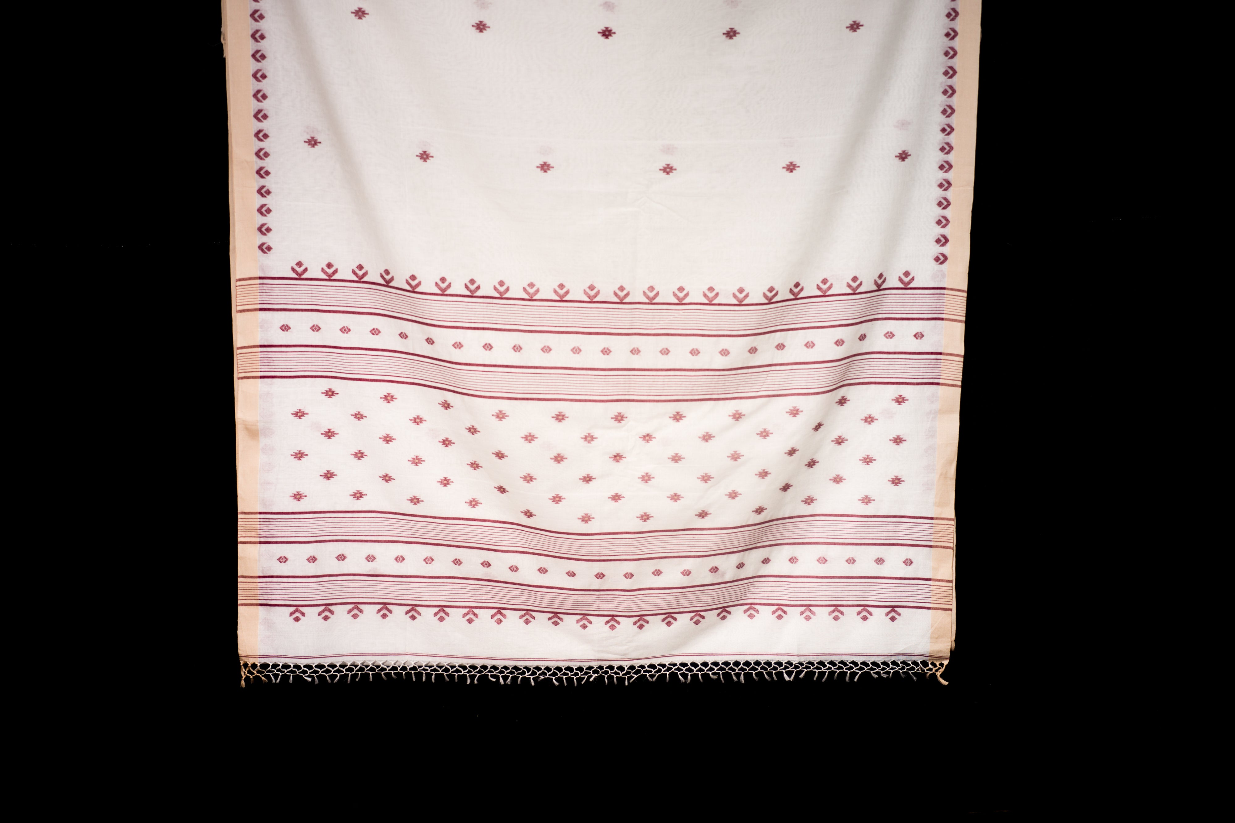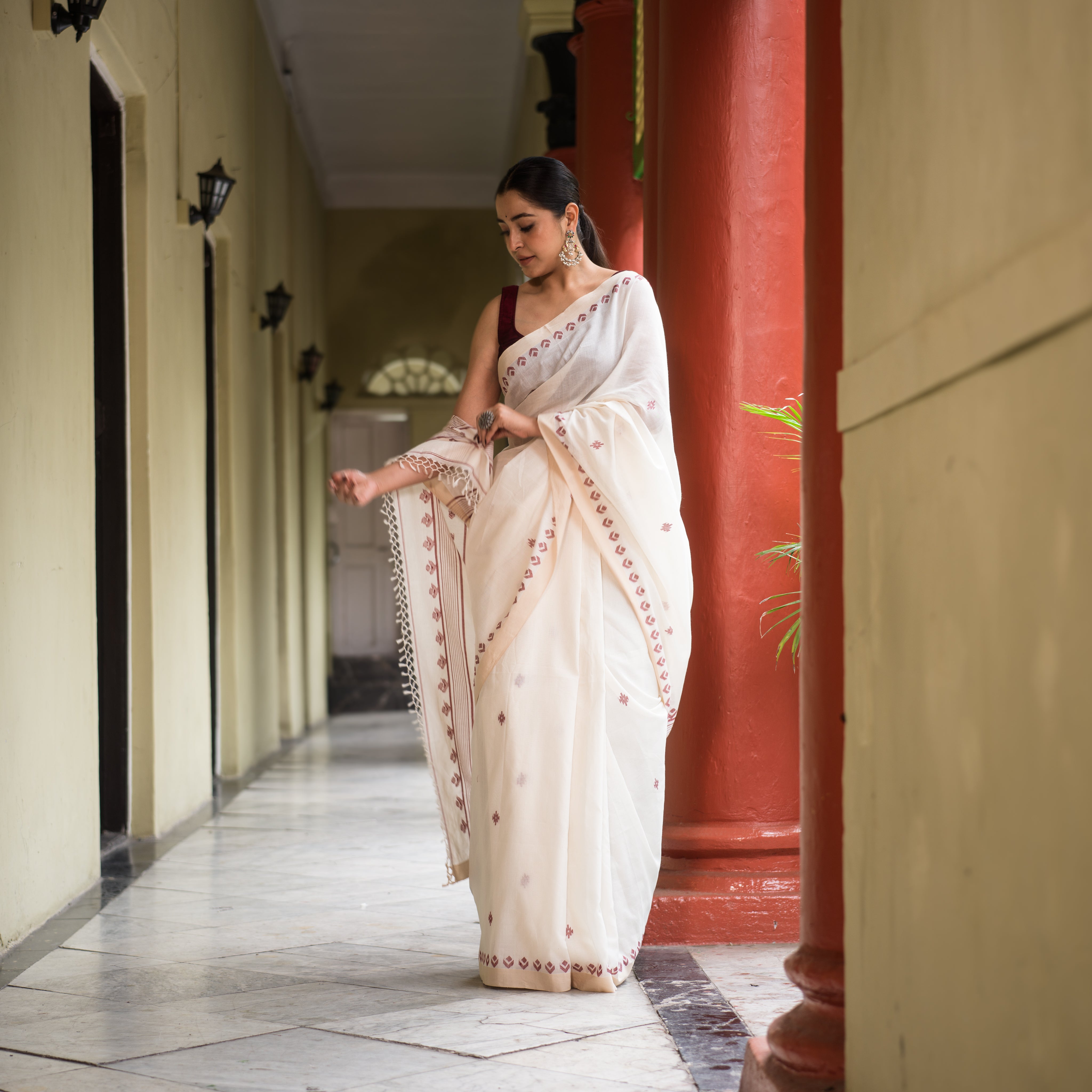 A vision of timeless sophistication, this pure cotton Jamdani saree embodies the quiet luxury of Bengal’s handloom heritage. Woven in a soft ivory-white base, it exudes an understated glow of purity and grace. Along its edges runs a delicate beige border, carrying a calm refinement, while maroon Jamdani motifs are meticulously woven along the border and scattered gracefully across the body. The pallu extends this harmony, balancing minimalism with fine artistry, making the saree a piece of both heritage and modern elegance.