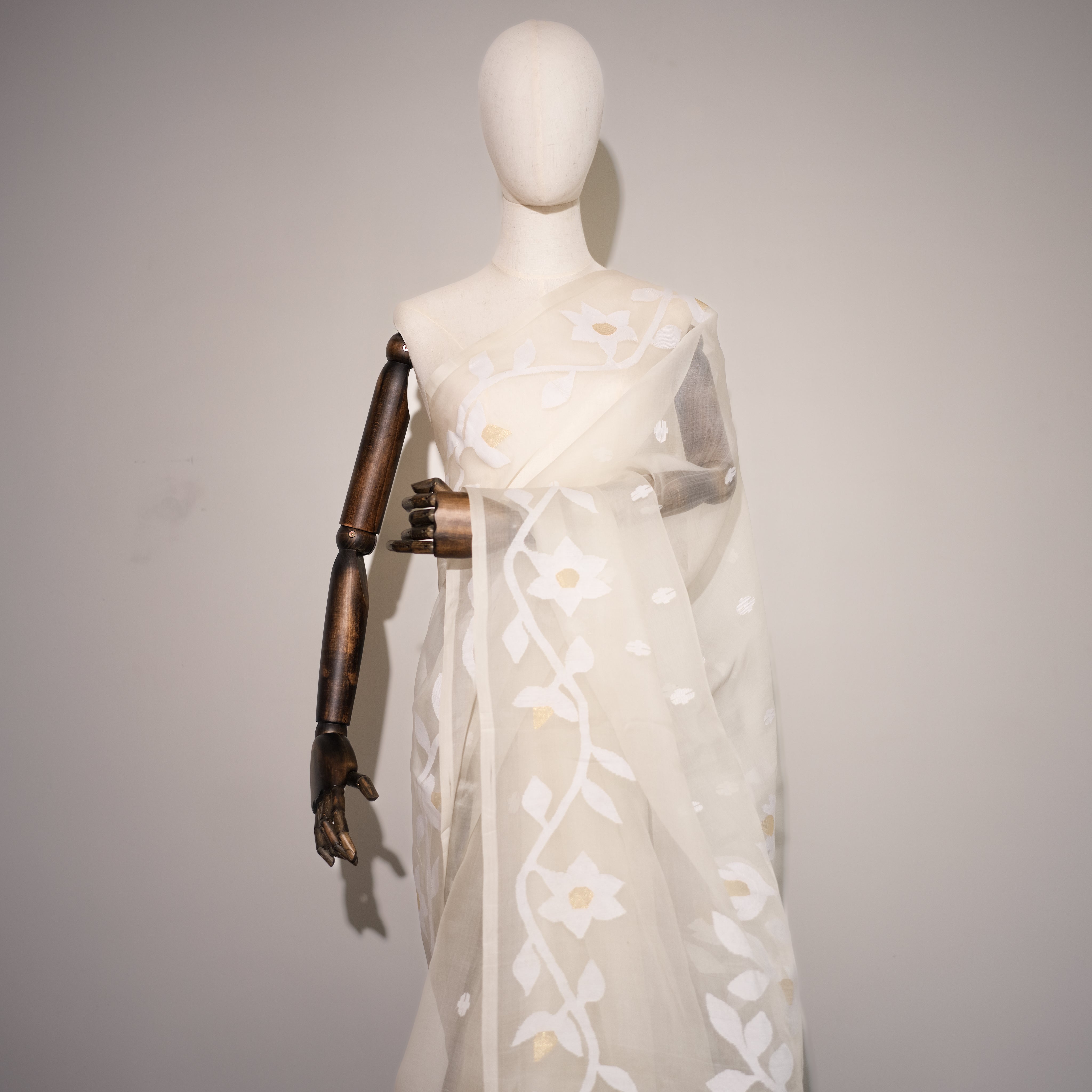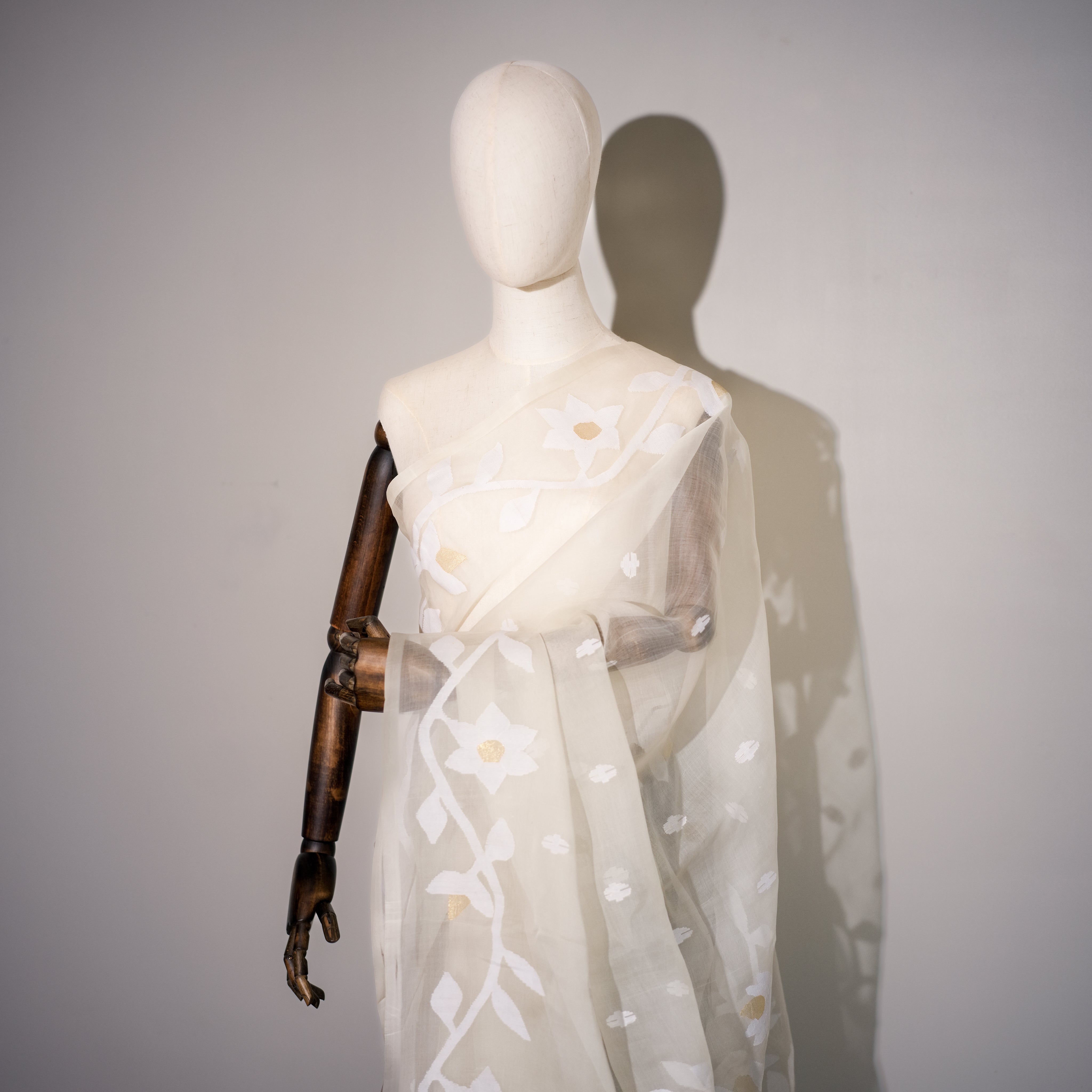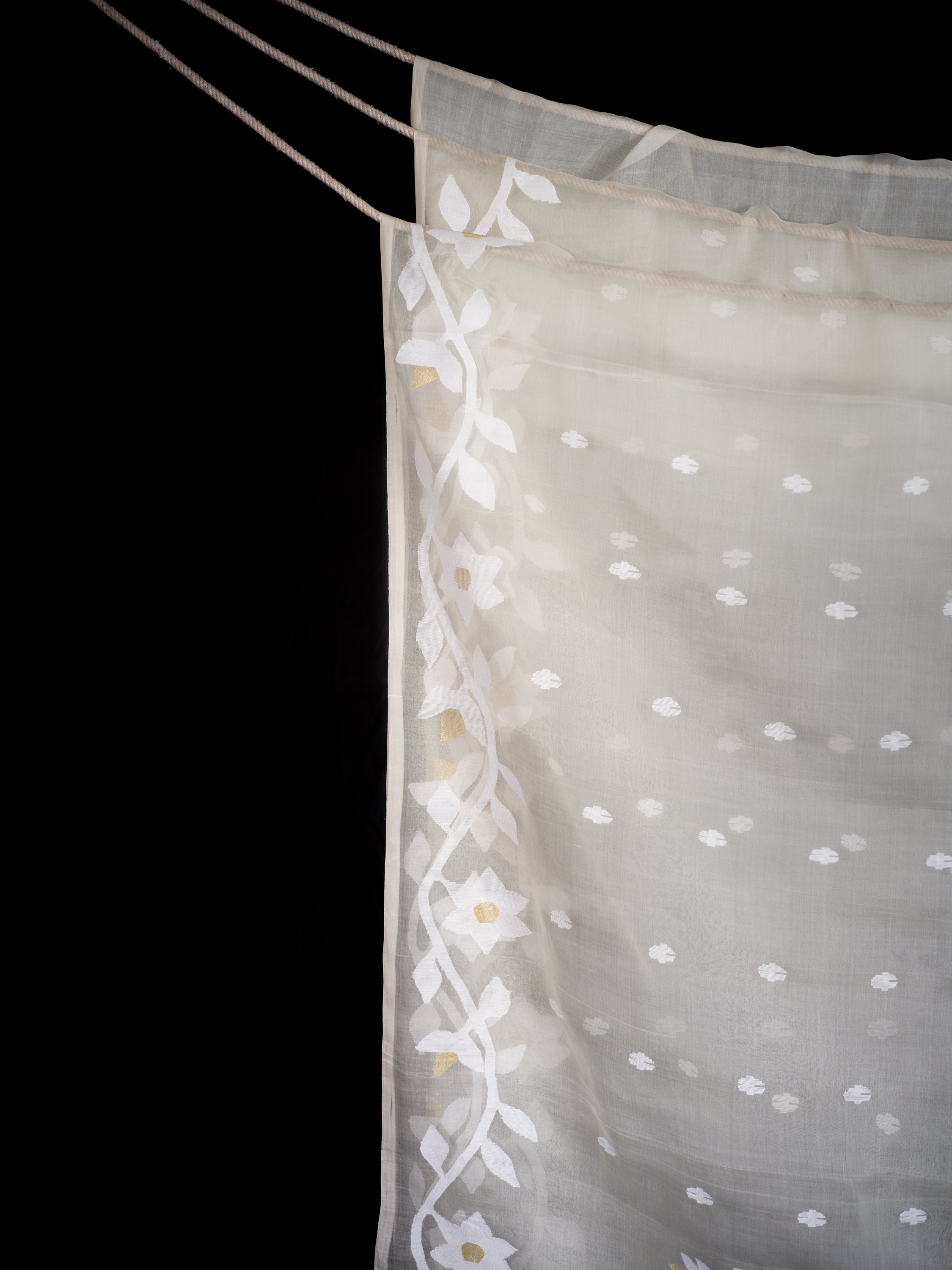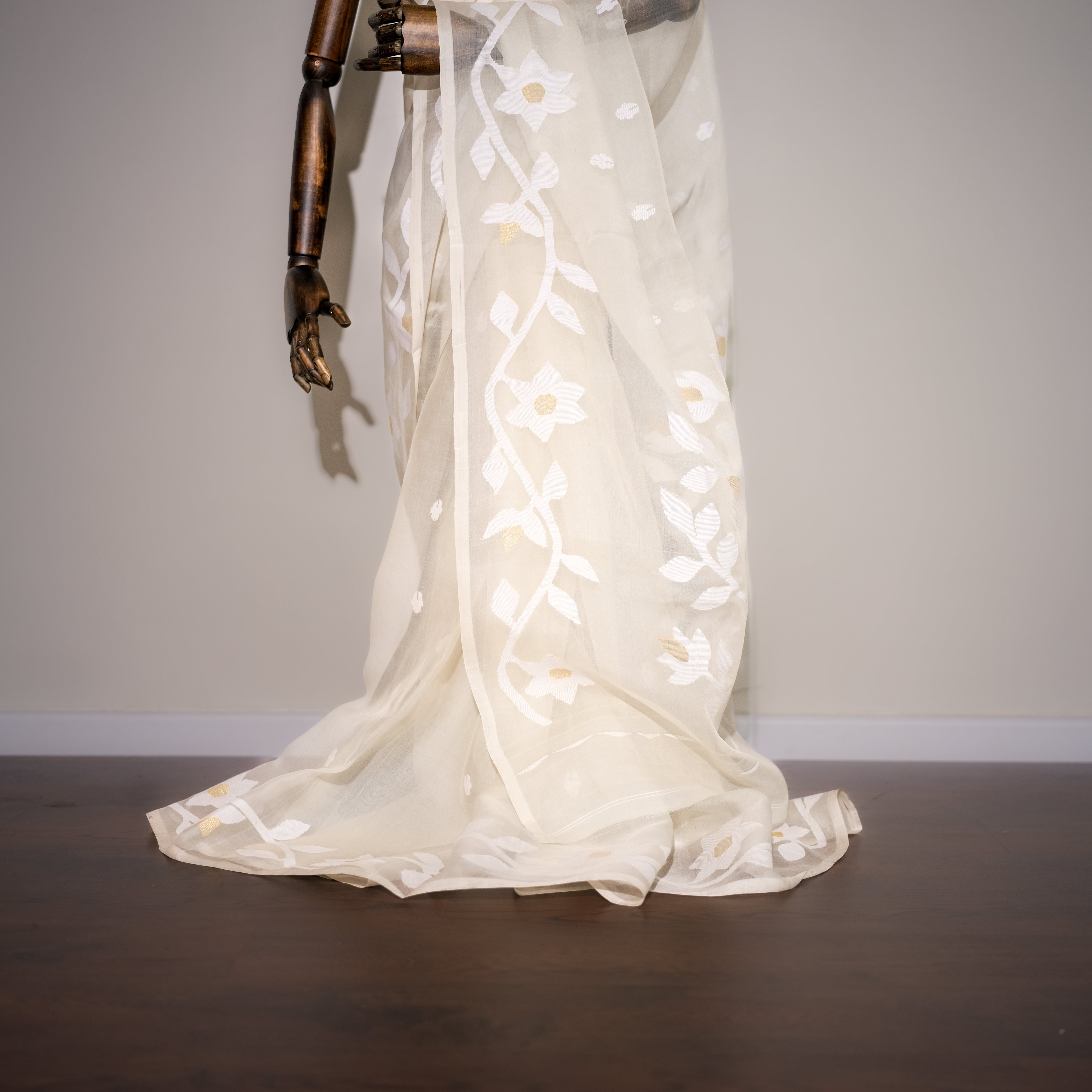 Whispers of Ivory Bloom - Ivory Jamdaani Saree with White Floral Vine Borders