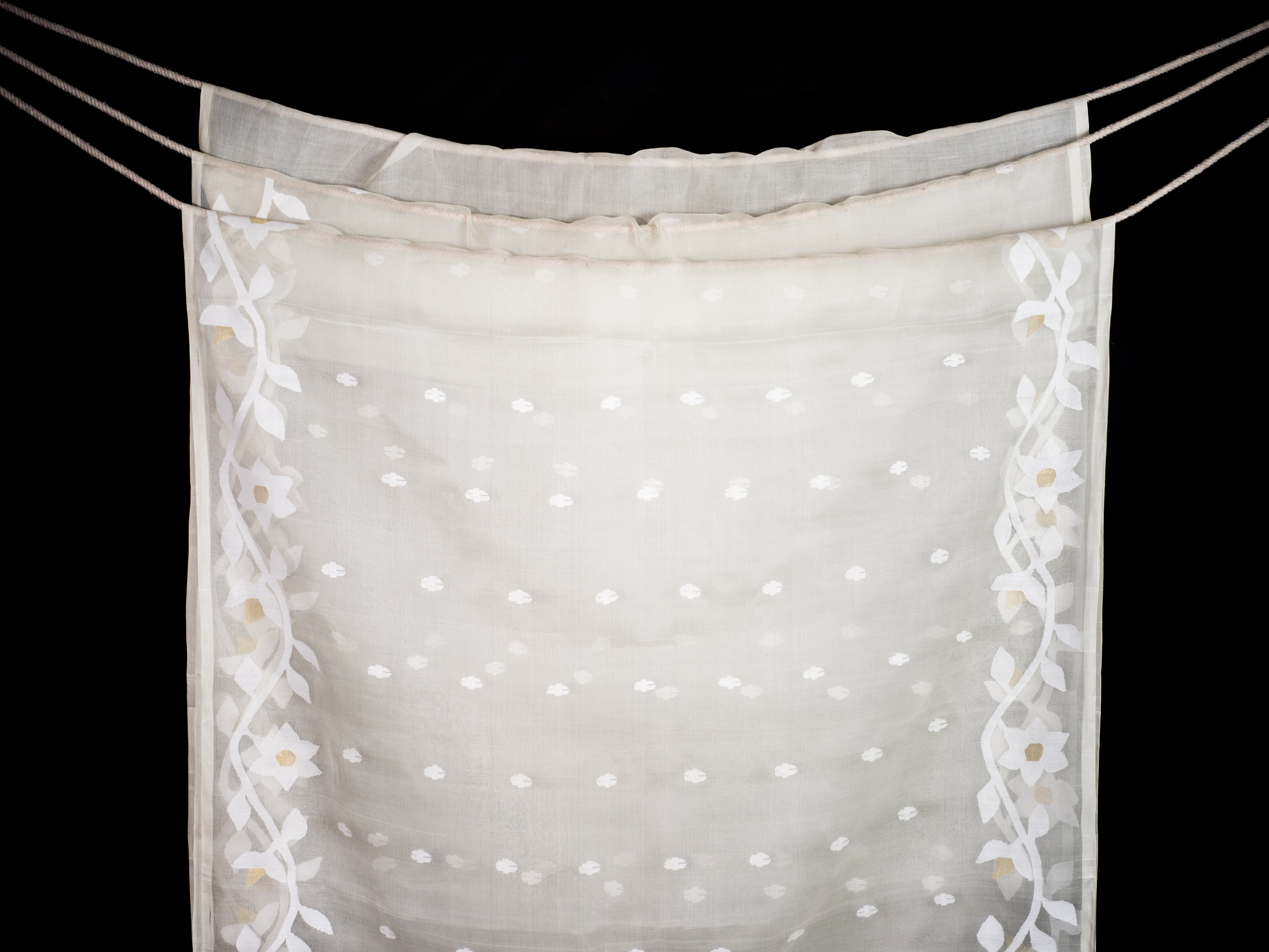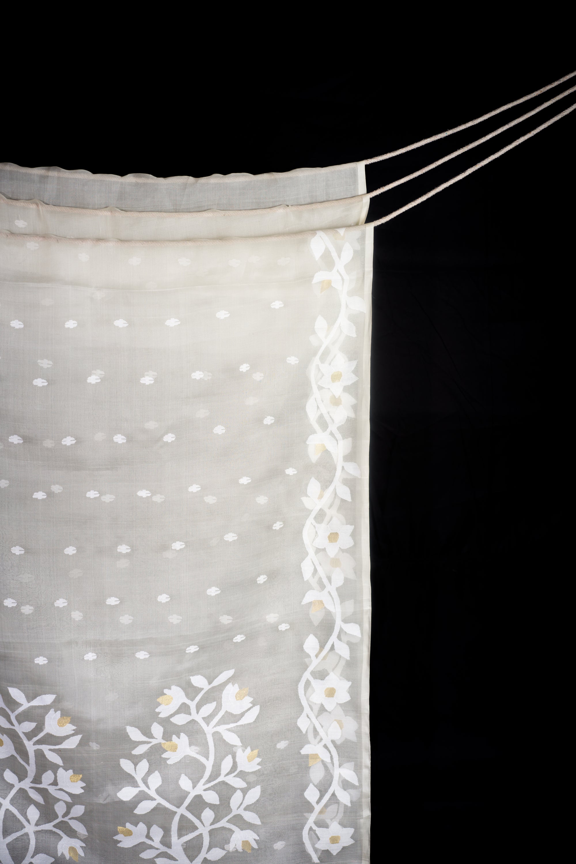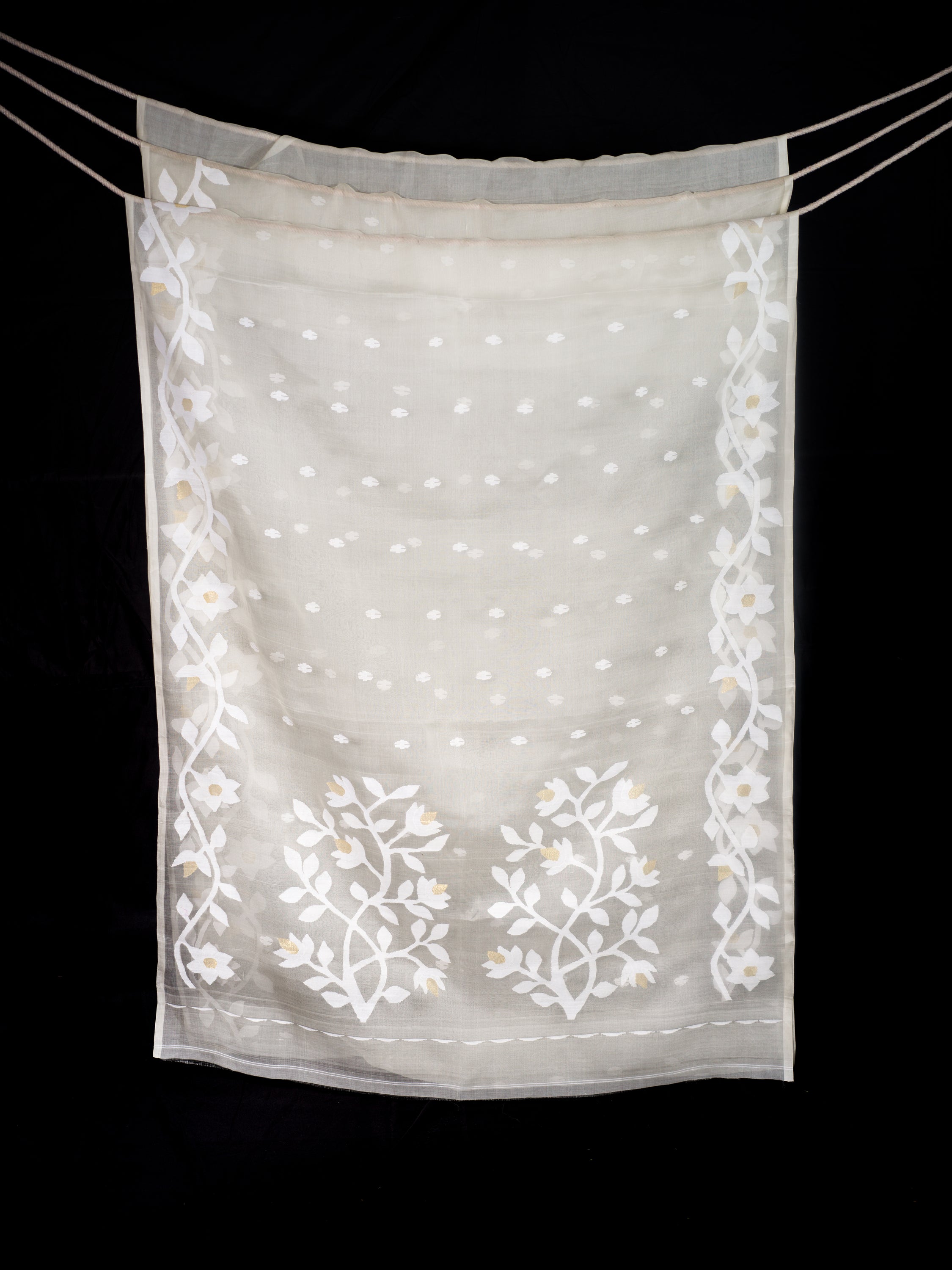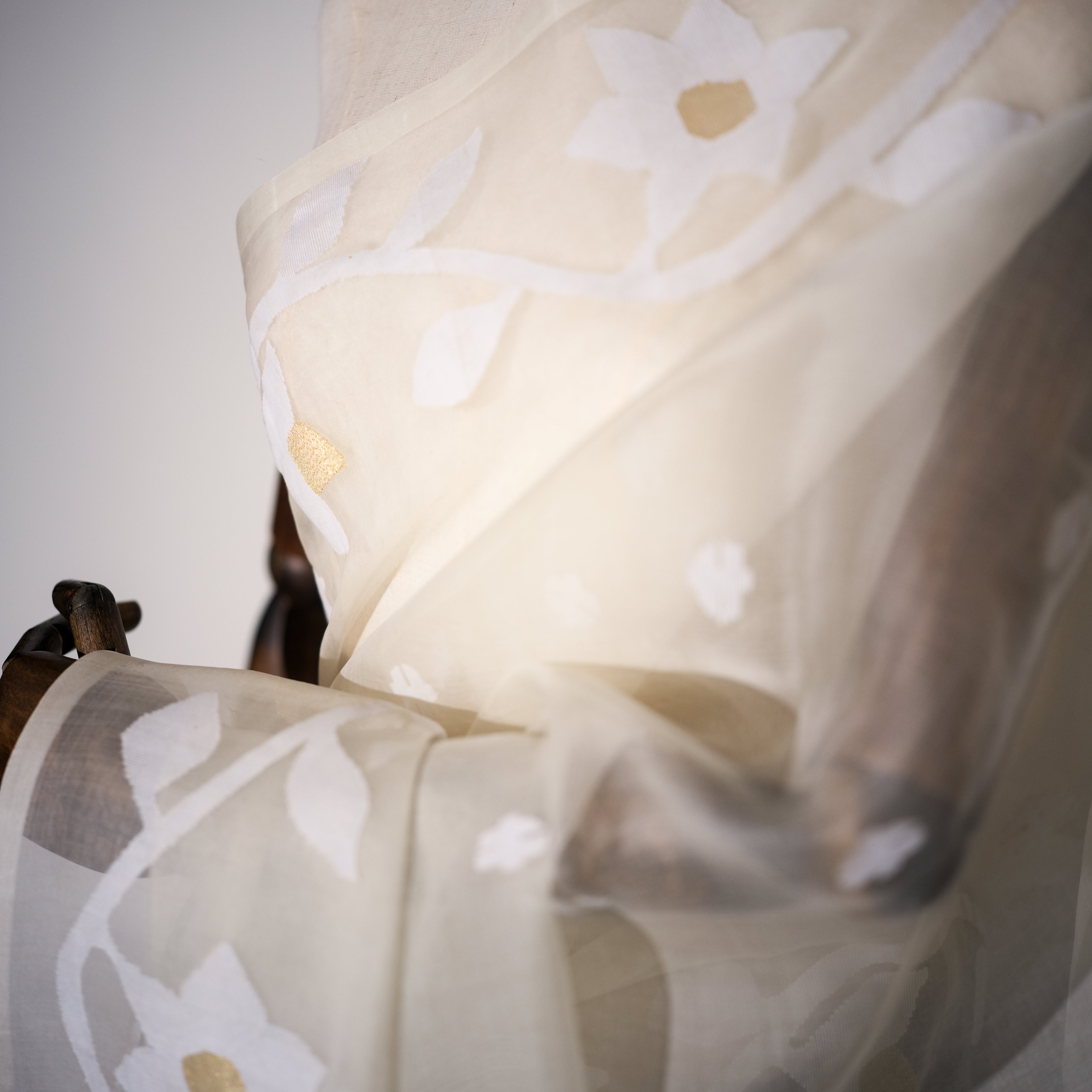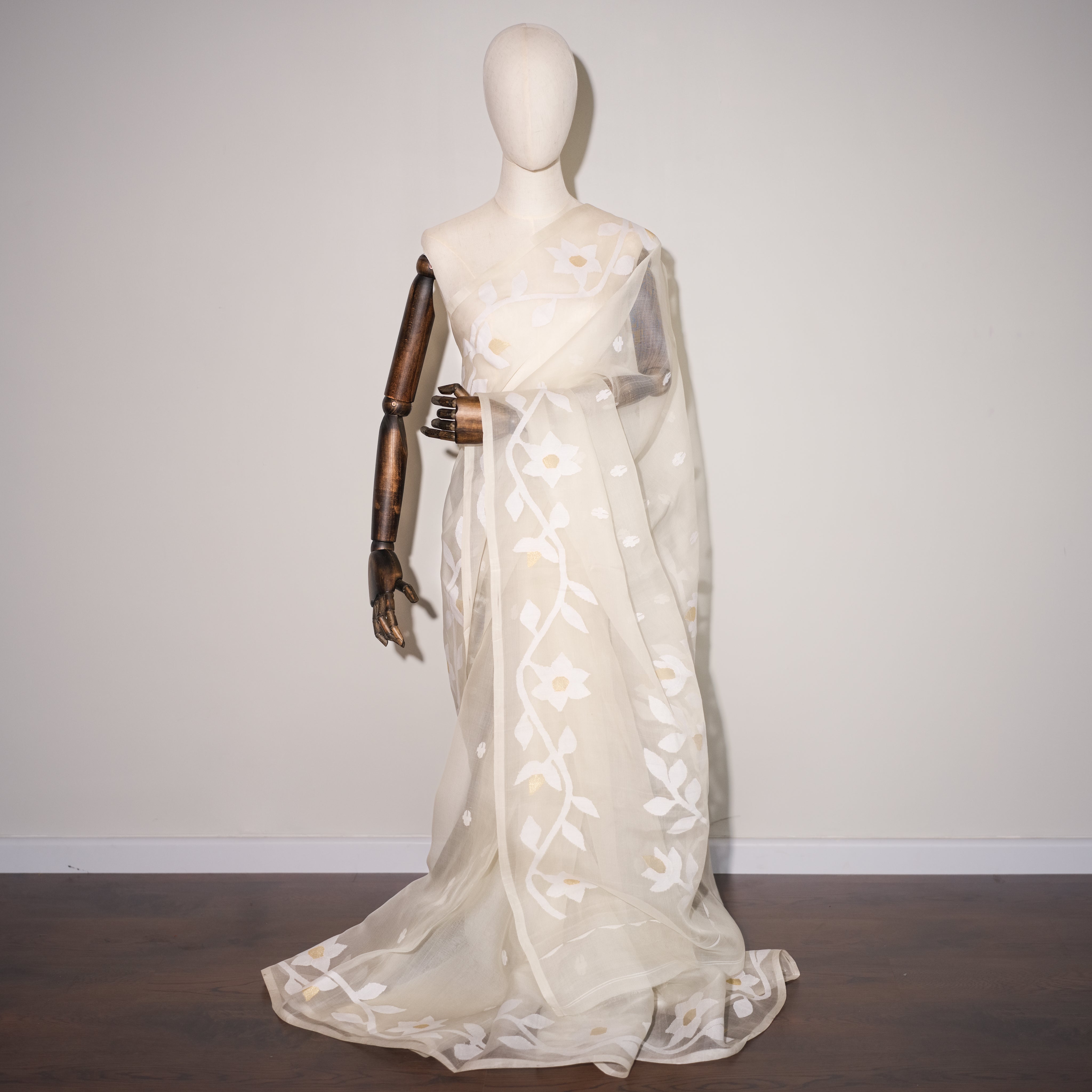 Whispers of Ivory Bloom - Ivory Jamdaani Saree with White Floral Vine Borders