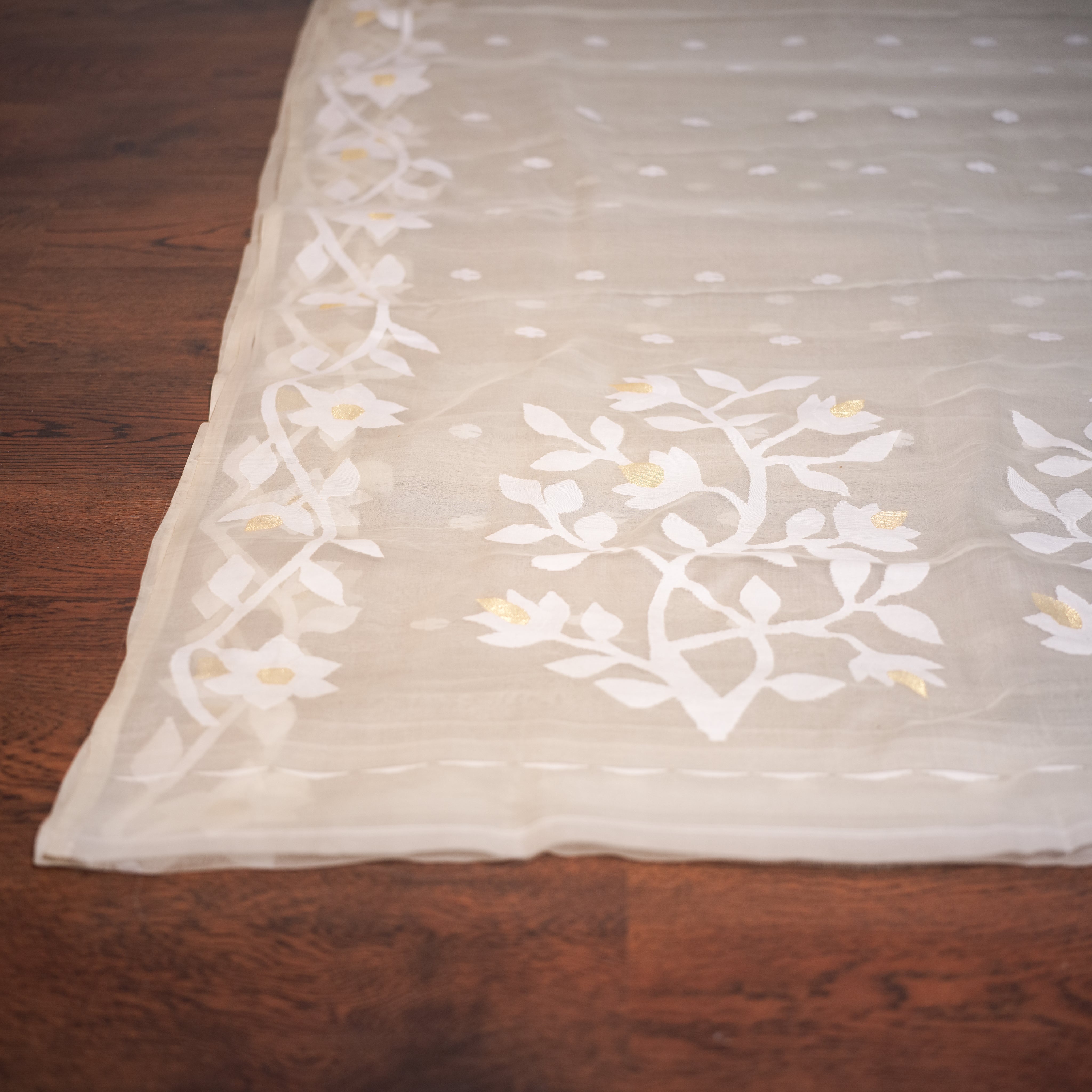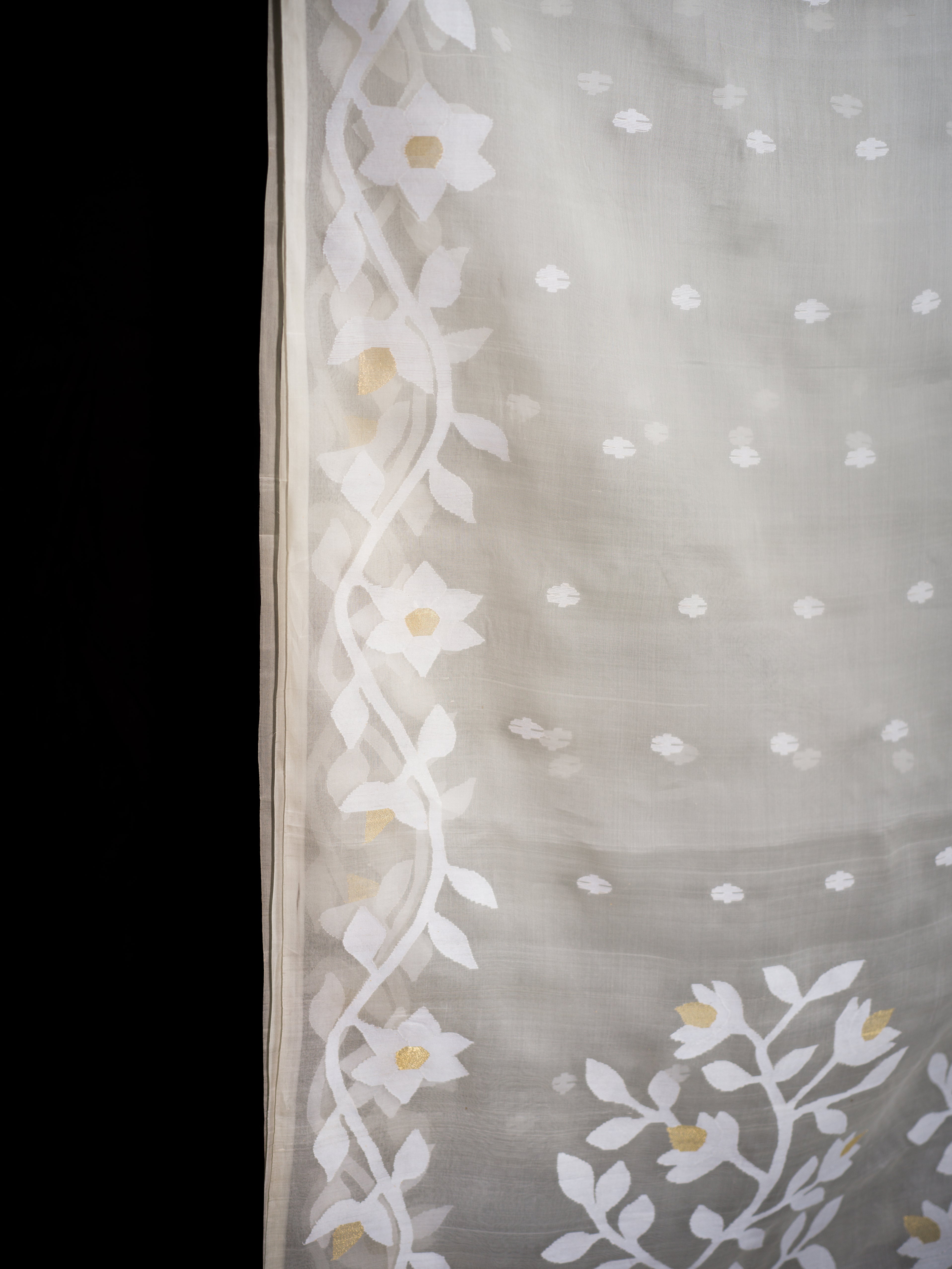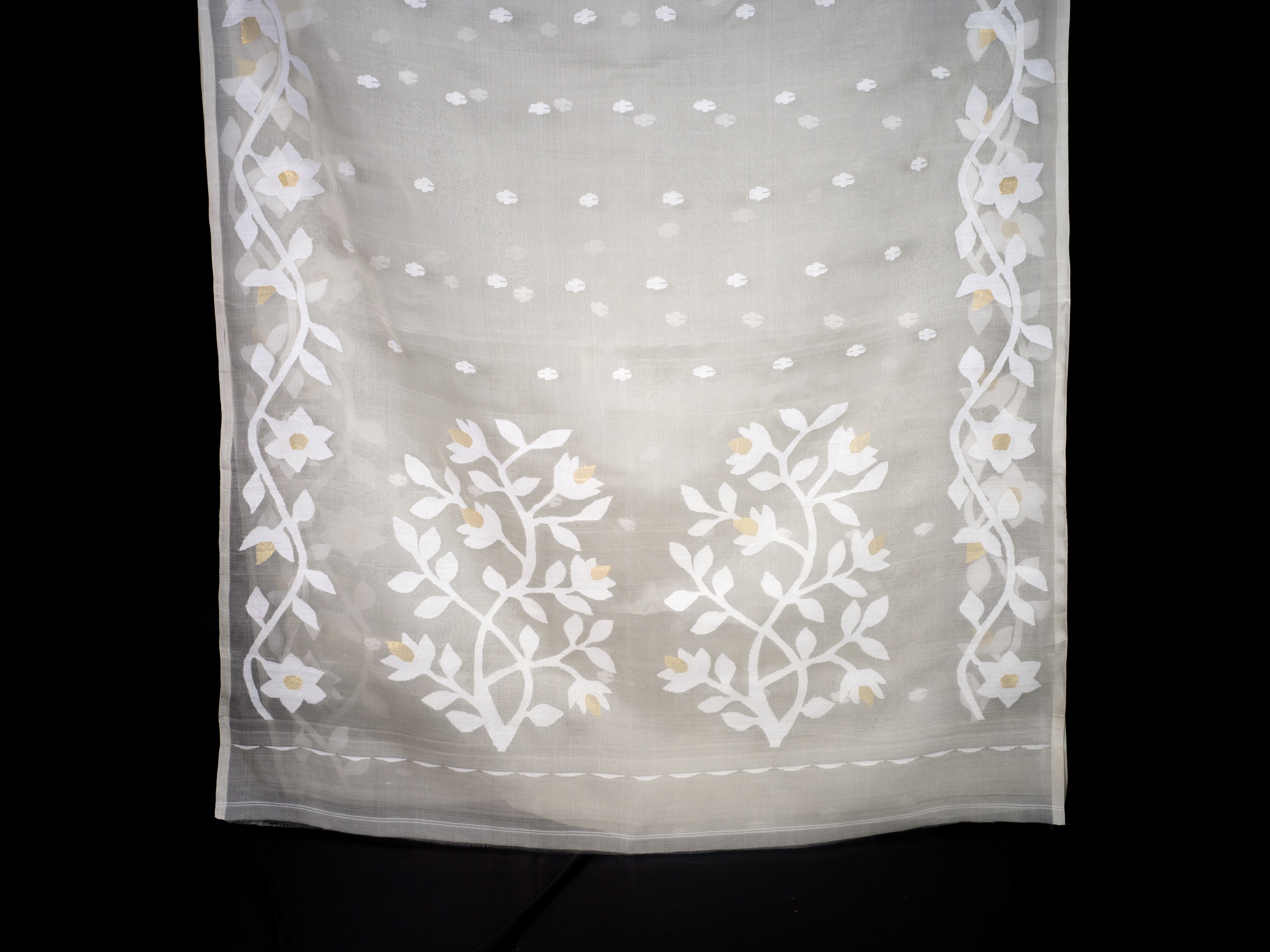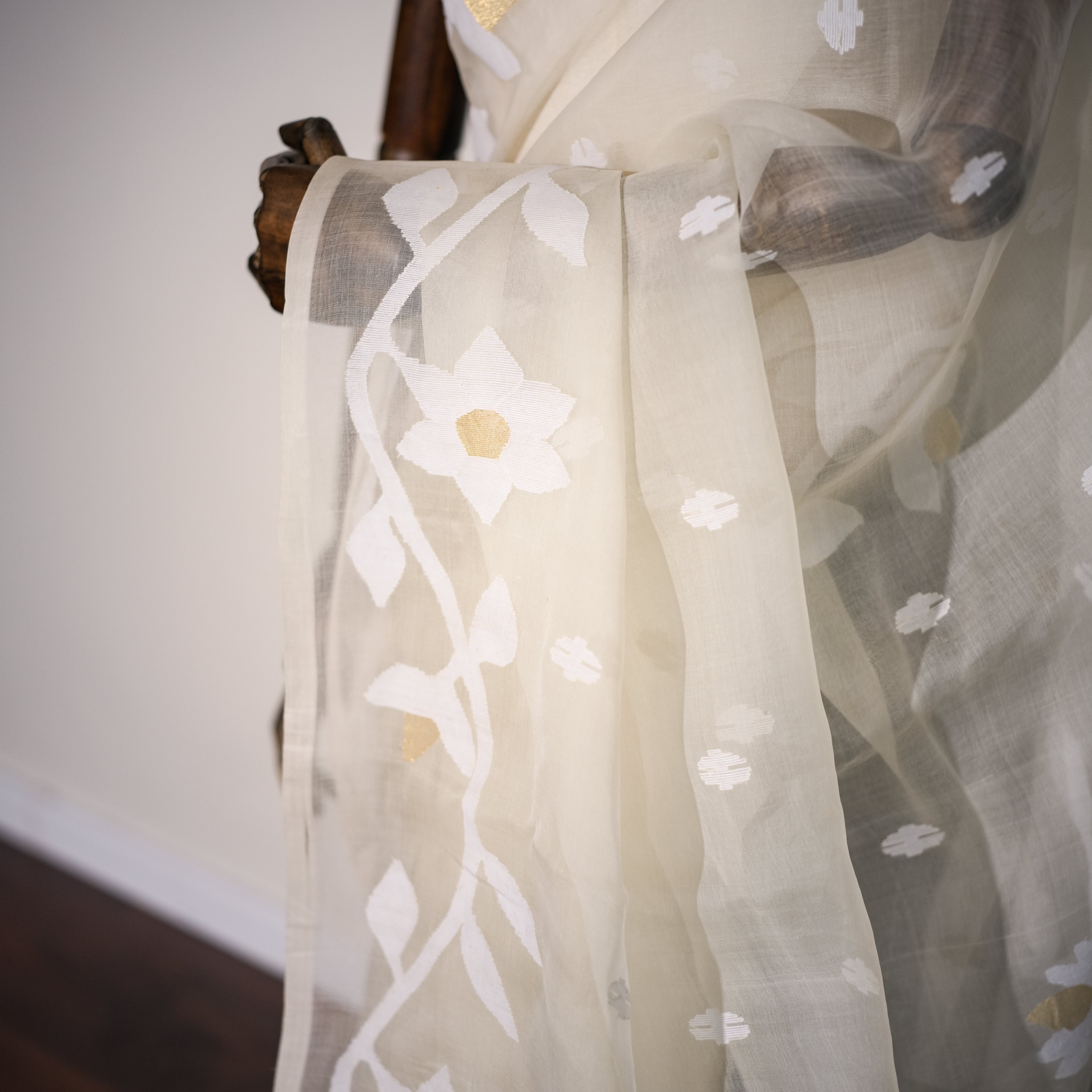 An ethereal creation in pure muslin, this Jamdani saree is the epitome of elegance and refinement. The delicate ivory base glows with an almost translucent softness, allowing the handwoven floral motifs in pristine white to blossom gracefully across its drape. Subtle accents of gold threads, nestled within the flowers and vines, add a quiet radiance, like morning sunlight glinting over fresh dew.