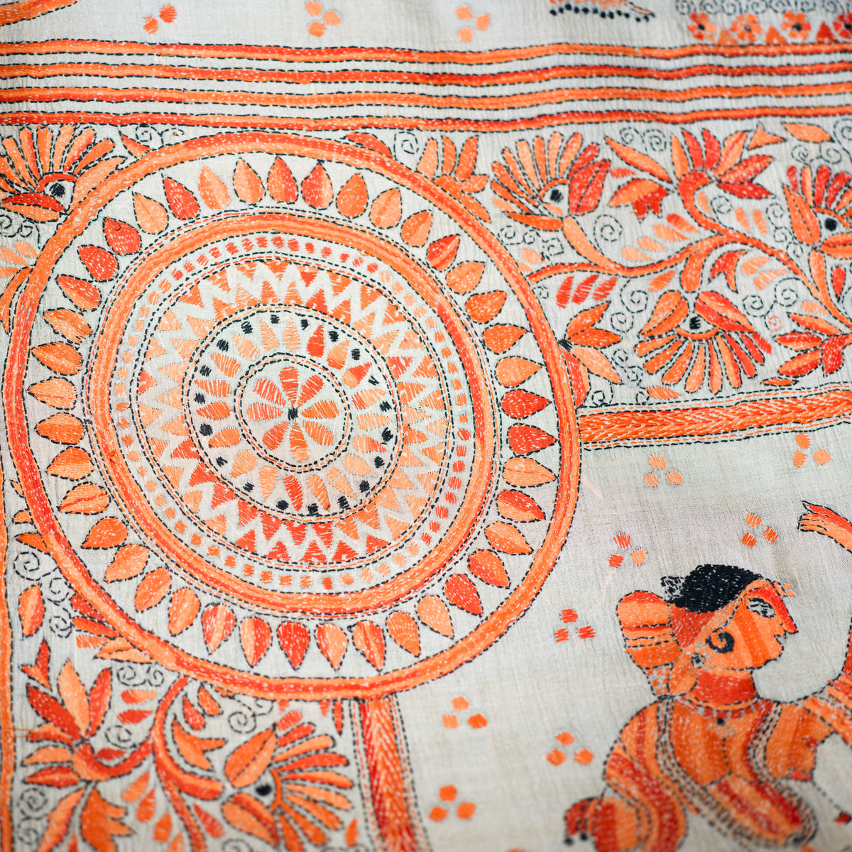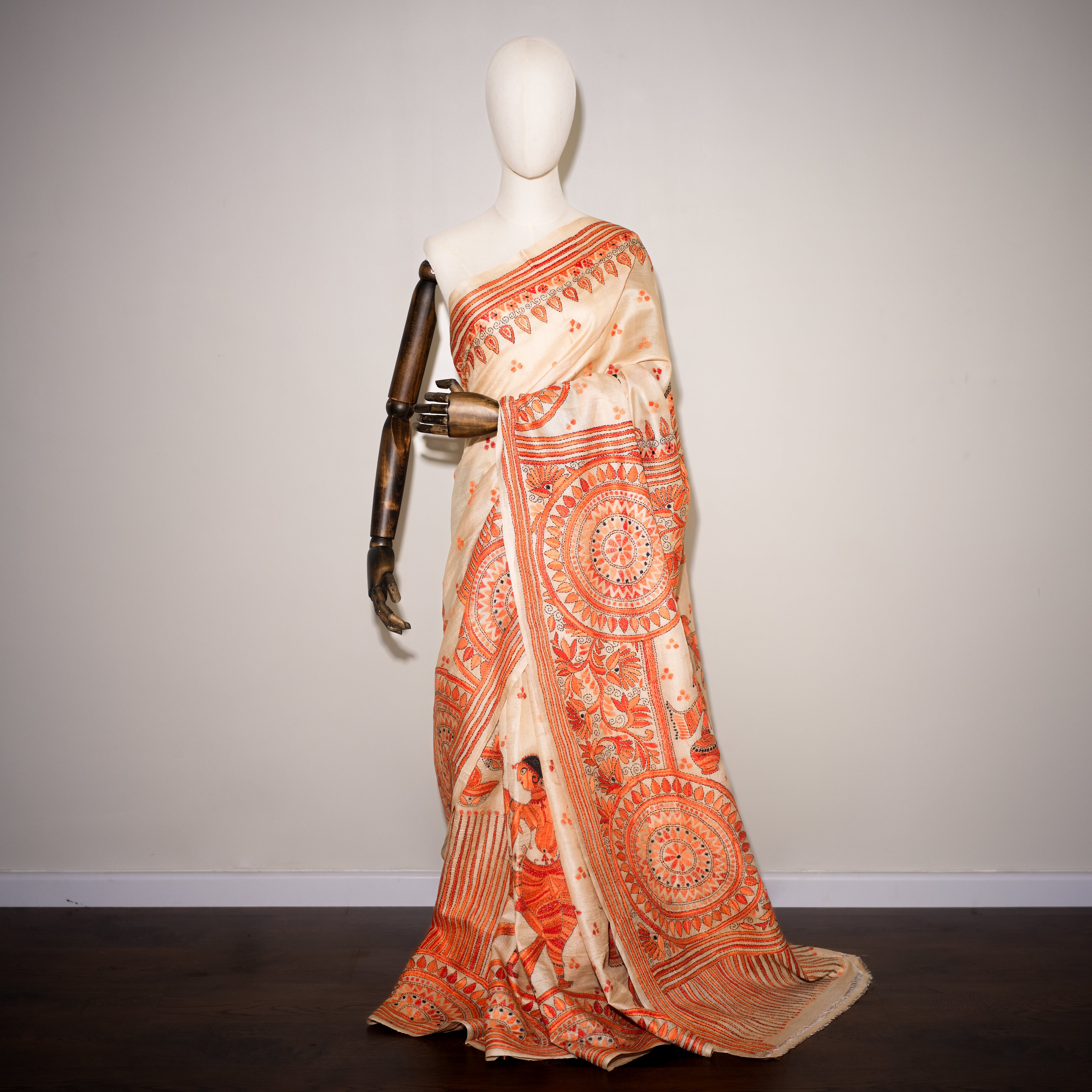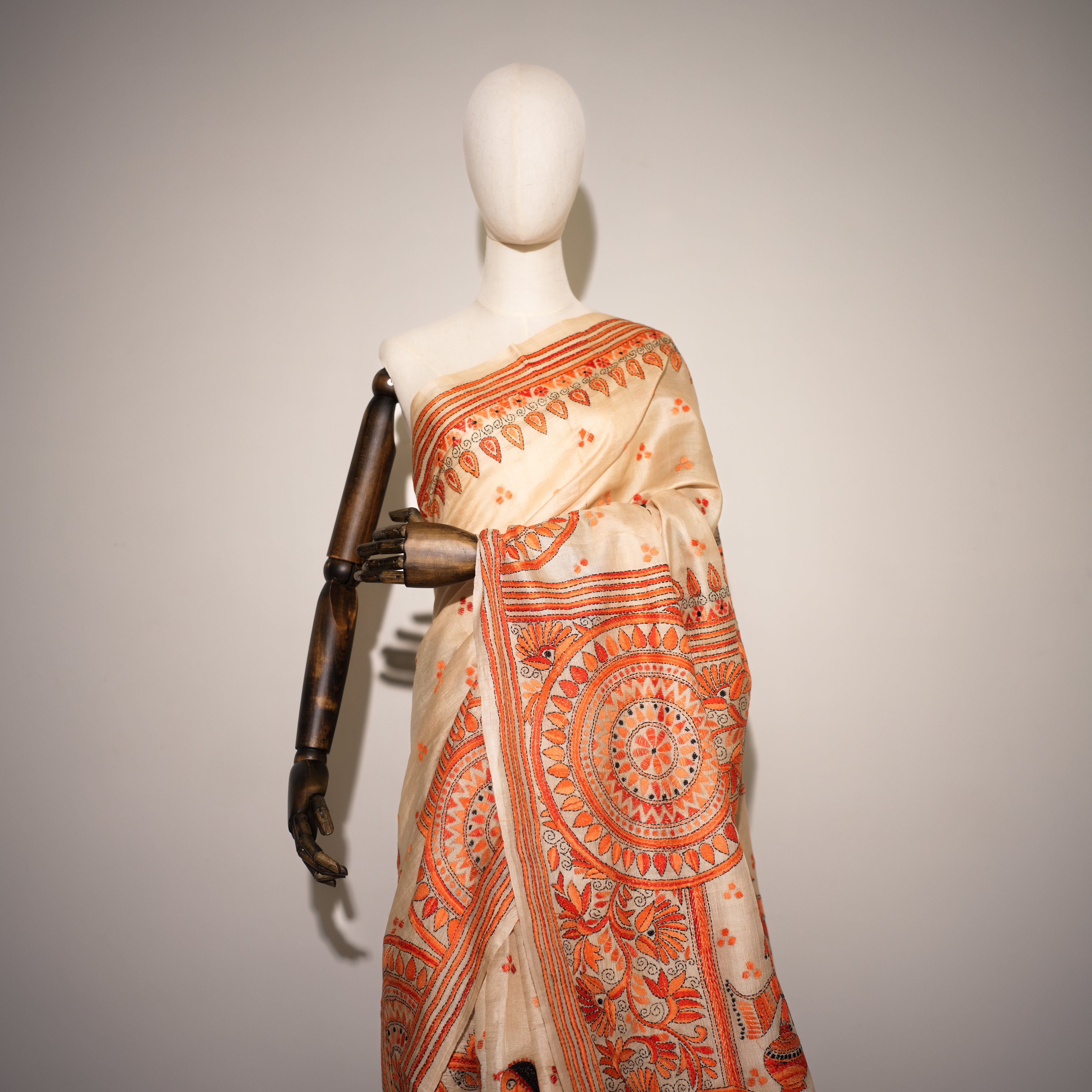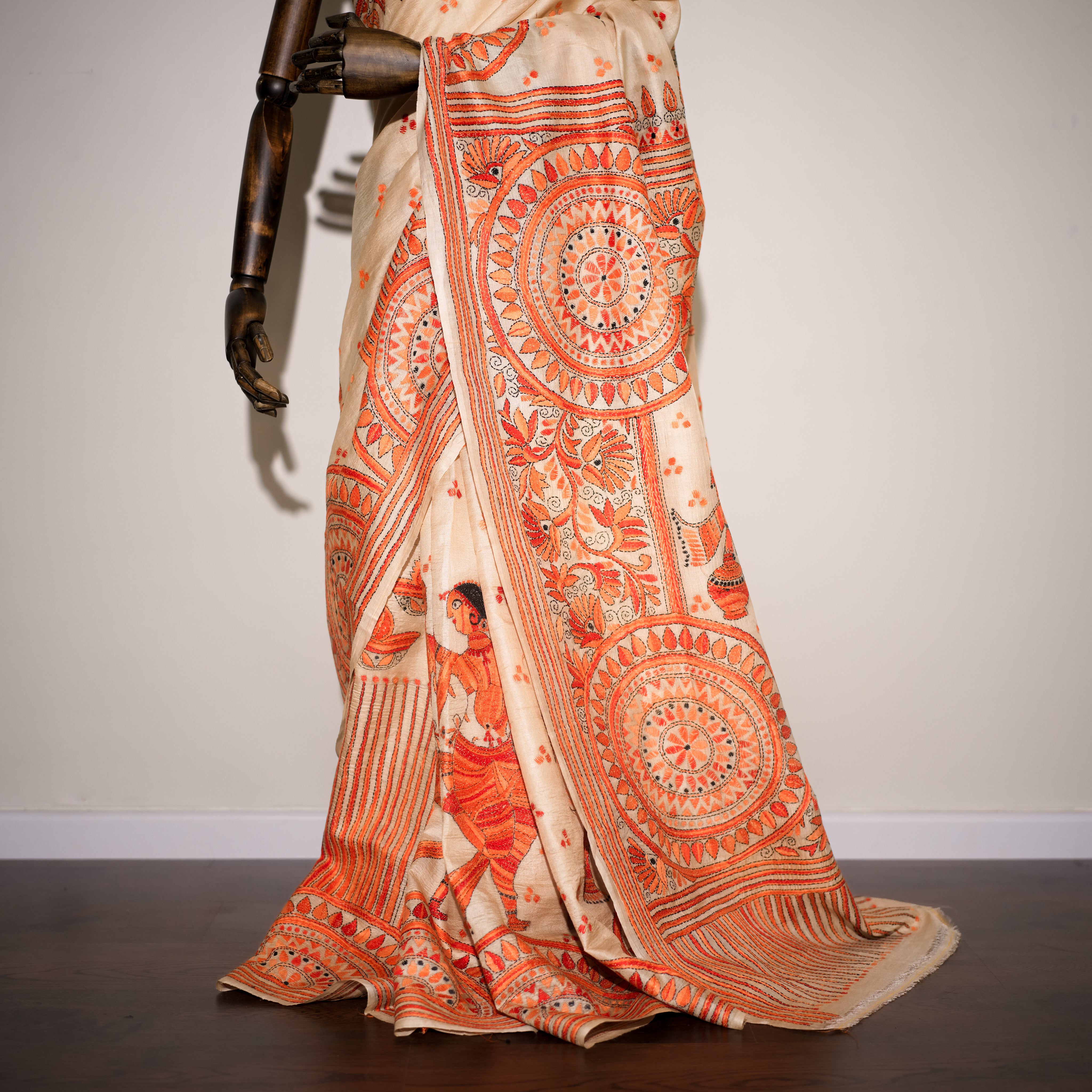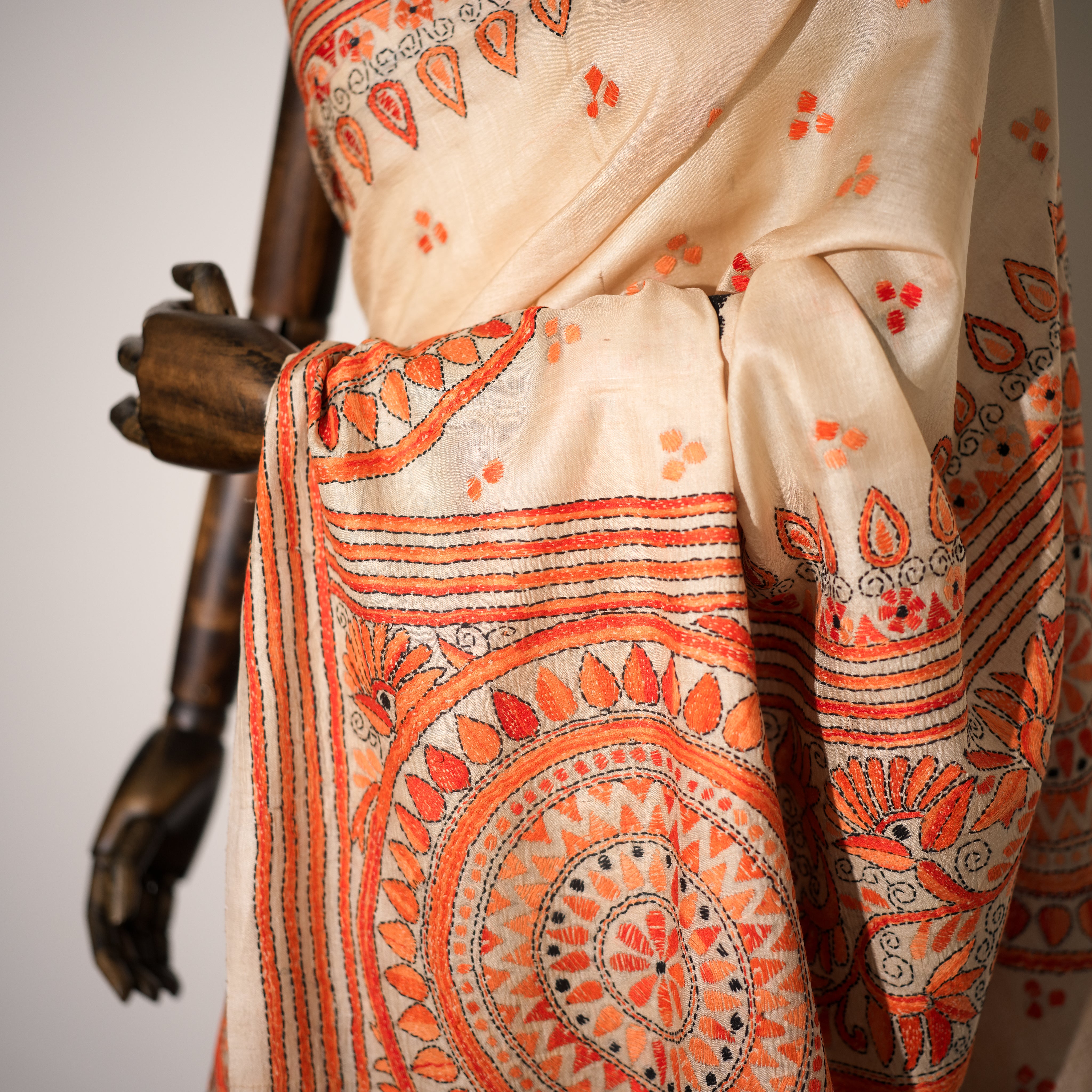 Ivory Radiance, Tassar Silk Kantha Saree with Terracotta and Black Folk Motifs