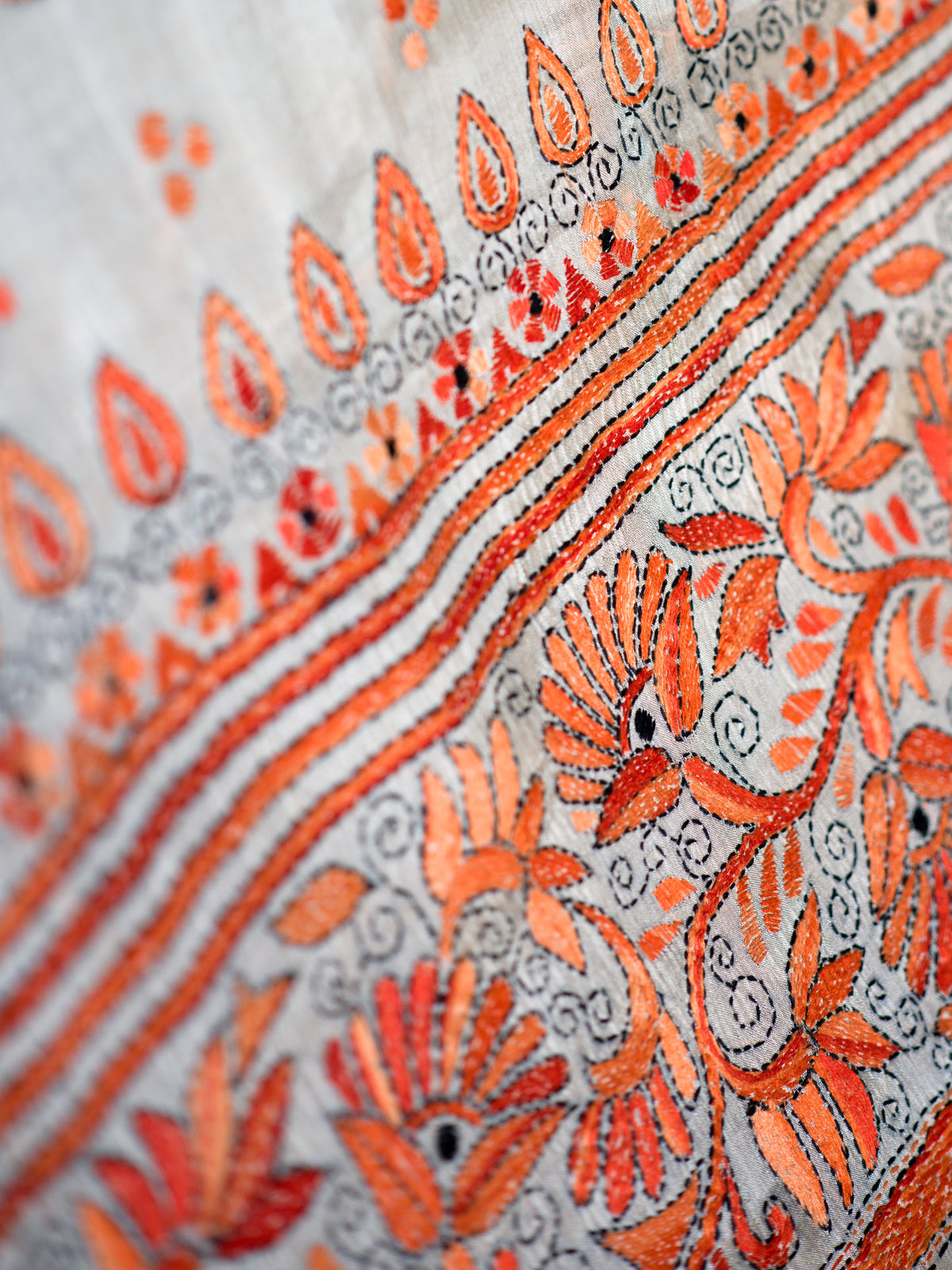 This exquisite saree is a timeless celebration of Bengal’s artistic heritage, woven in pure Tassar silk and adorned with the delicate intricacy of Kantha stitch embroidery. The fabric carries a natural golden-beige base, brought alive with vibrant rust orange and deep reddish orange hand-embroidered motifs, narrating stories of tradition and culture through every stitch.