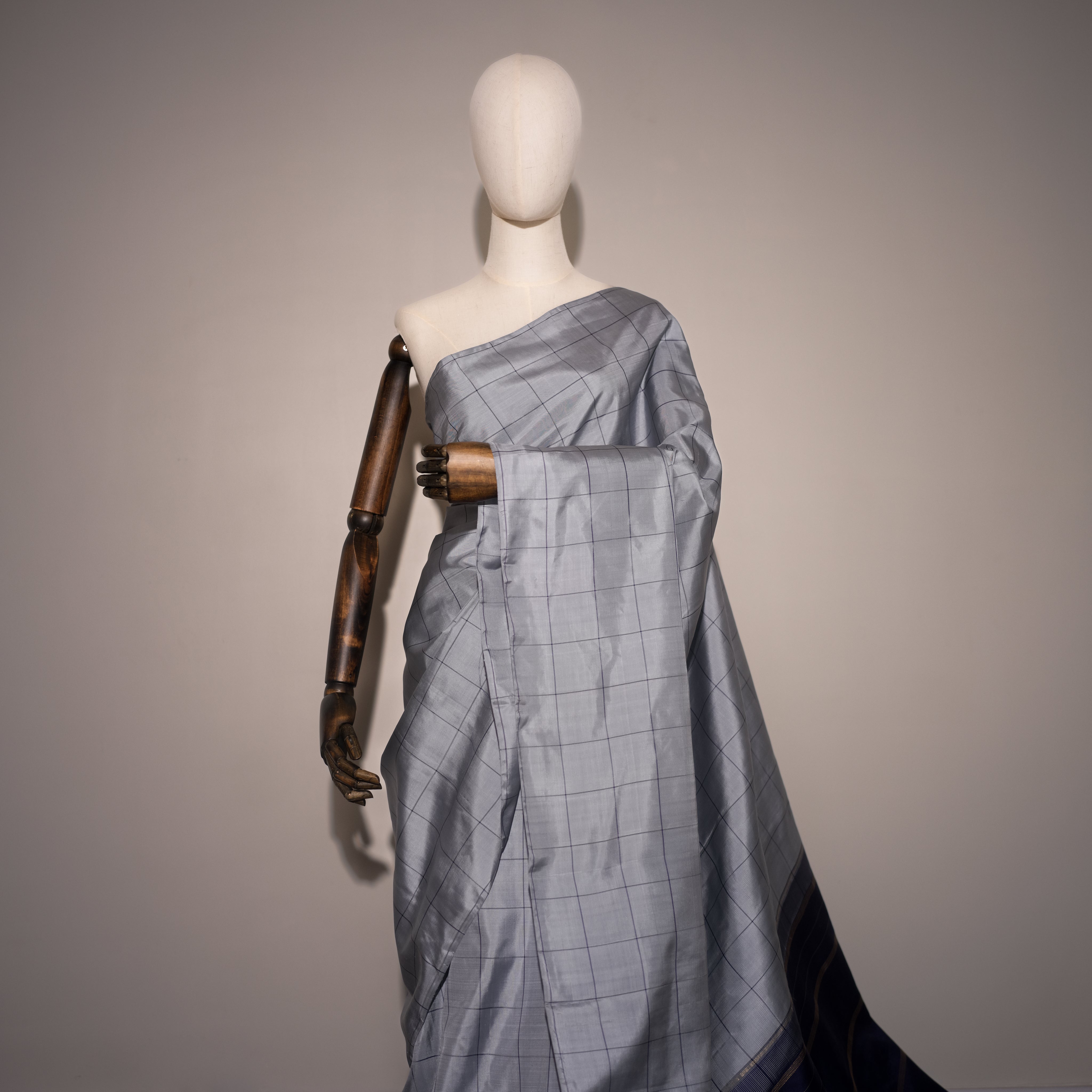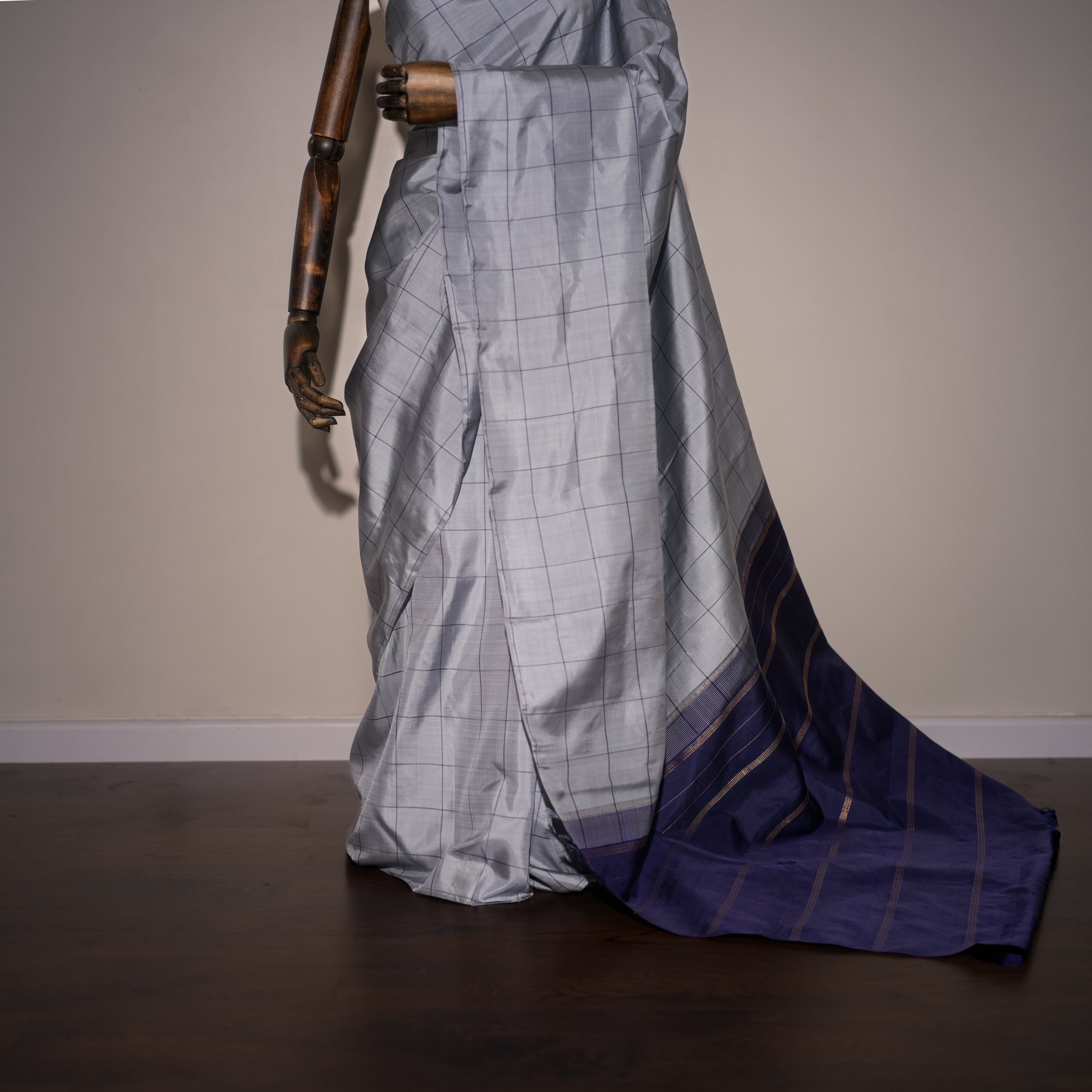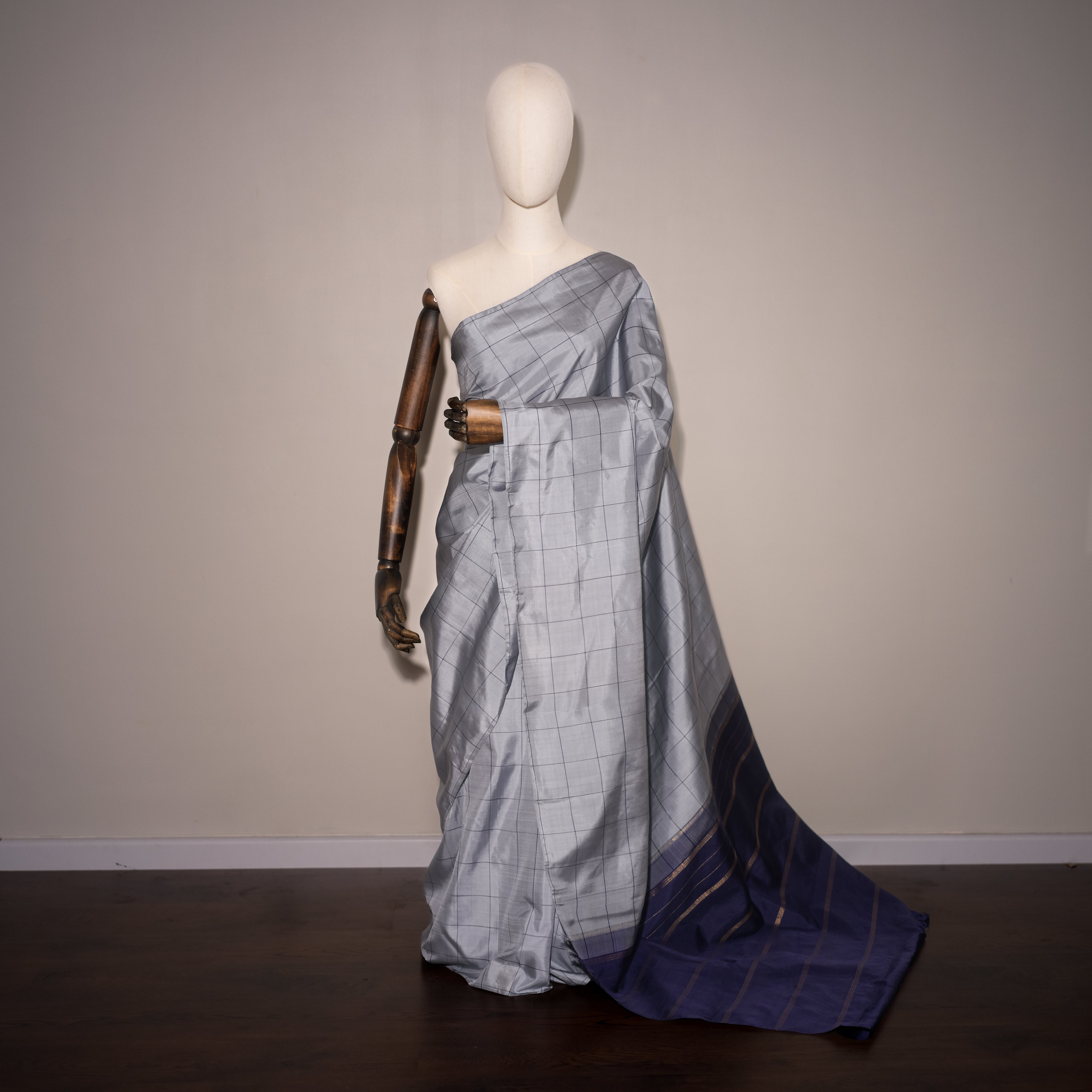 Color - Silver-grey body with midnight blue border and golden zari accents