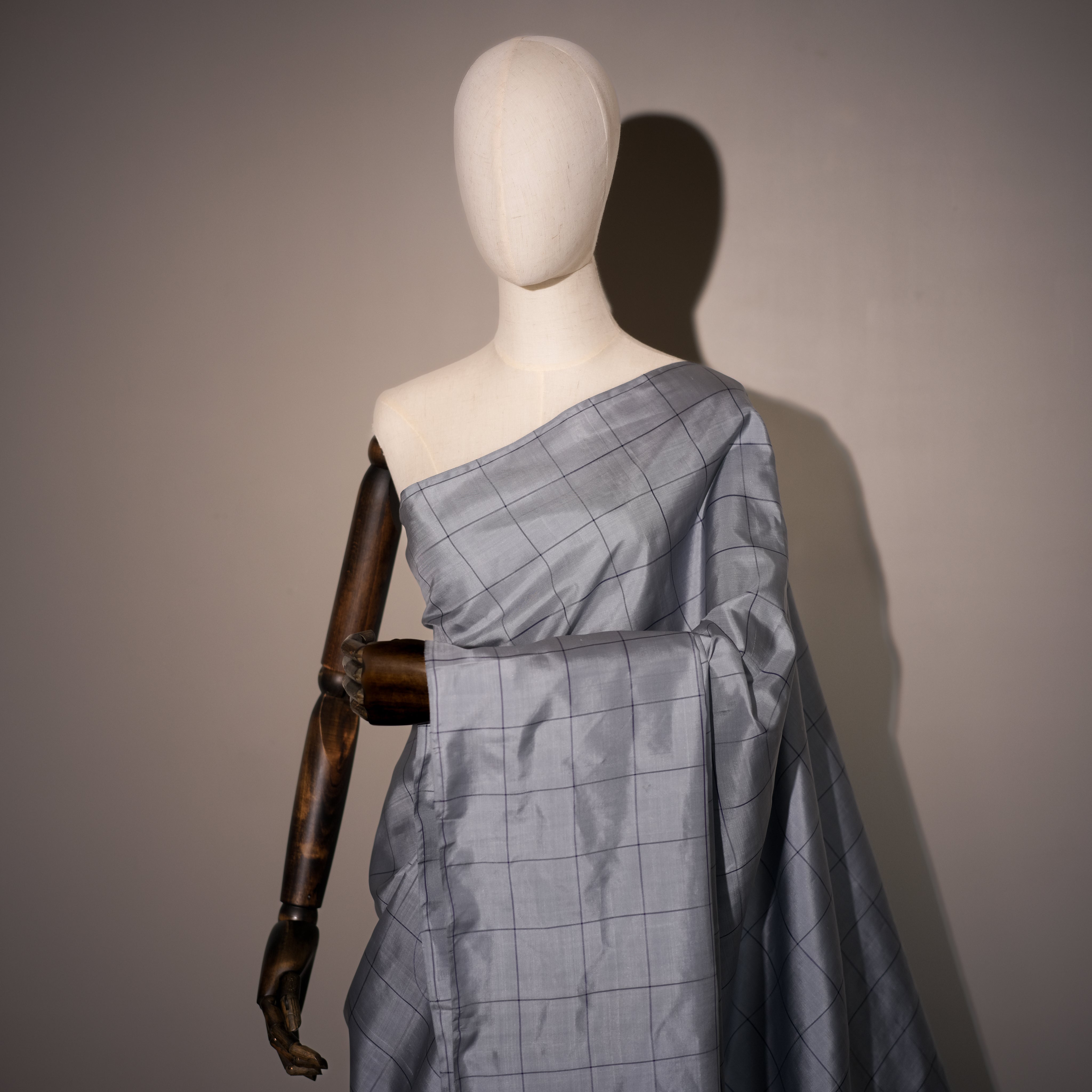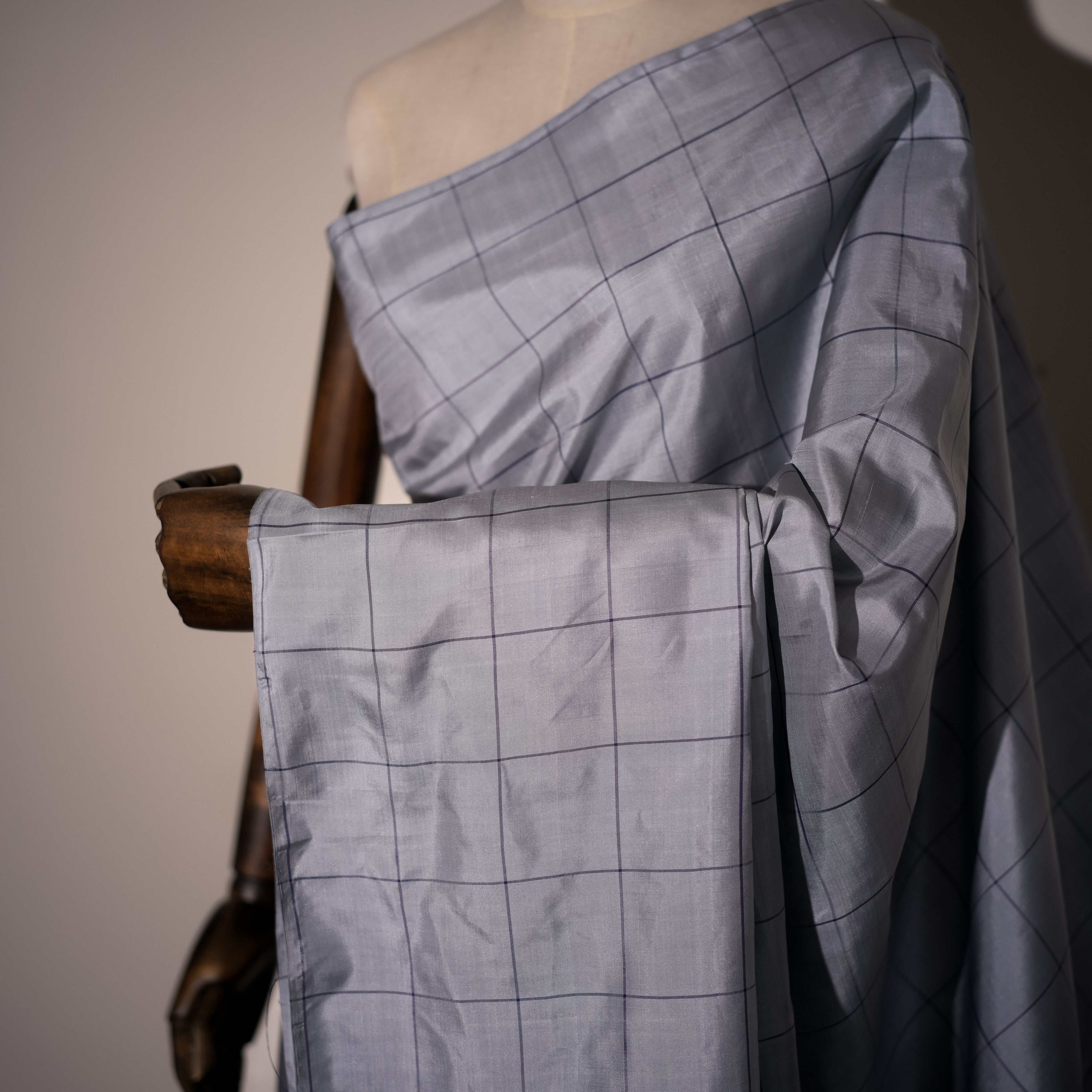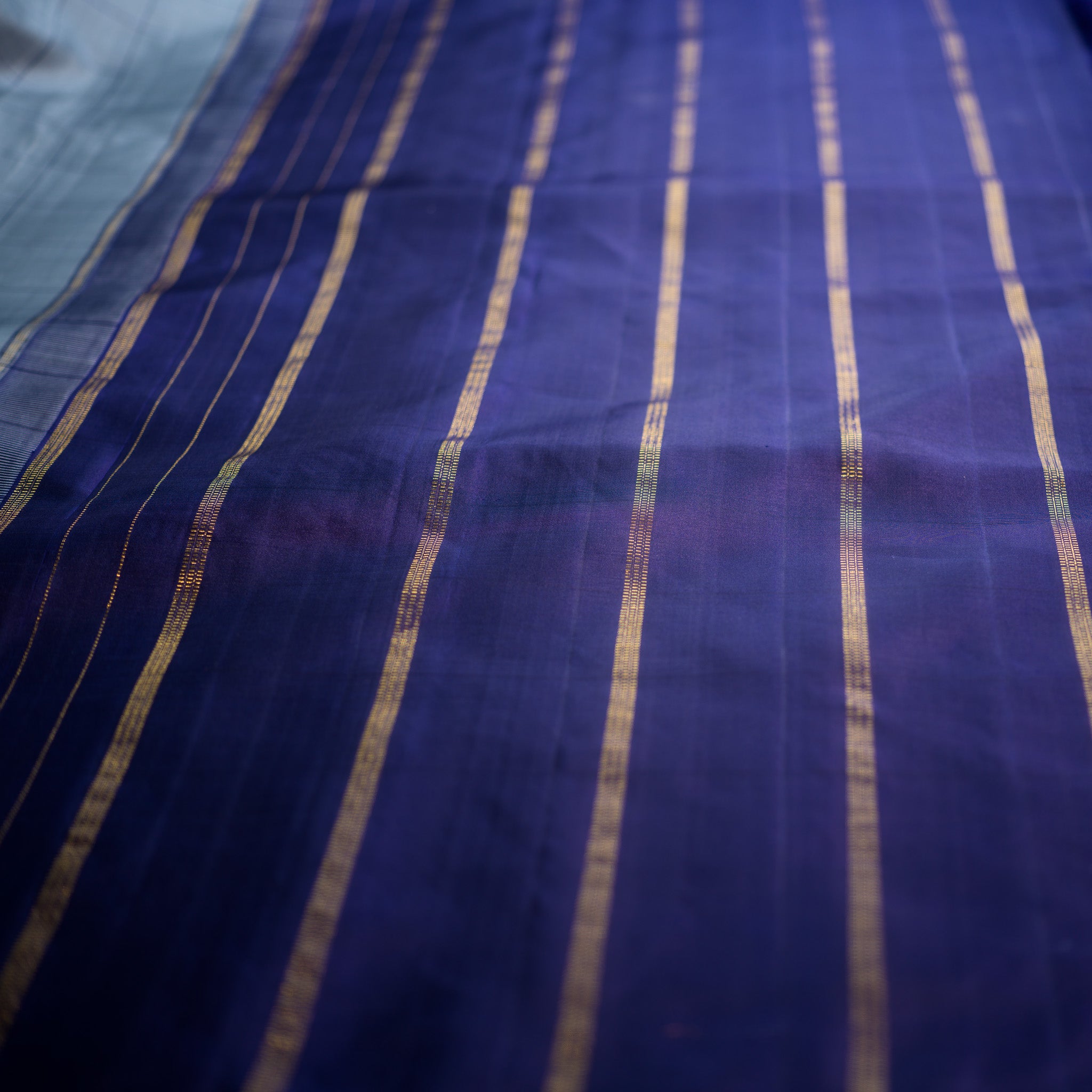 Color - Silver-grey body with midnight blue border and golden zari accents