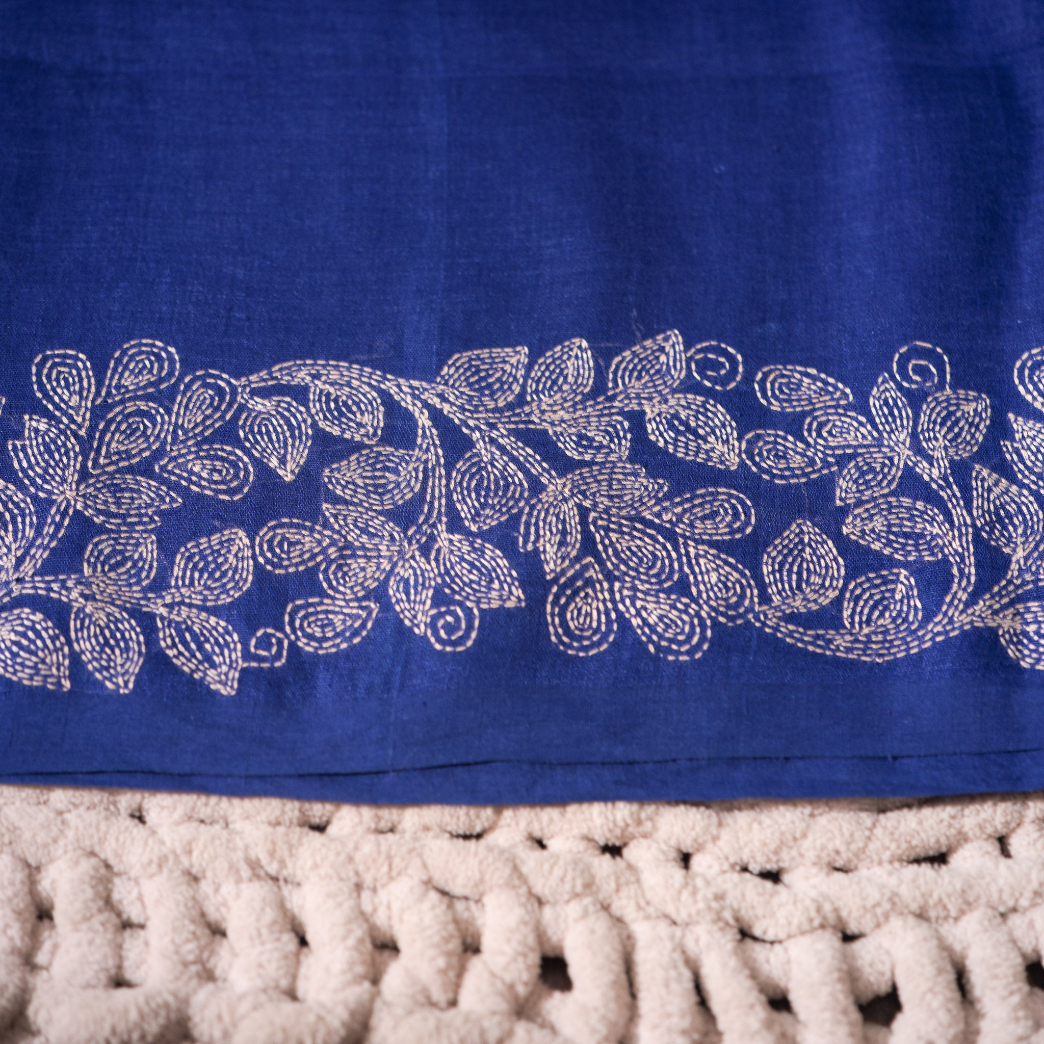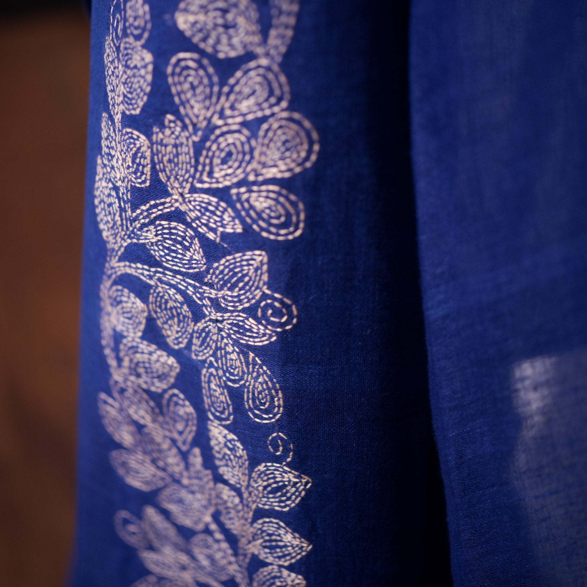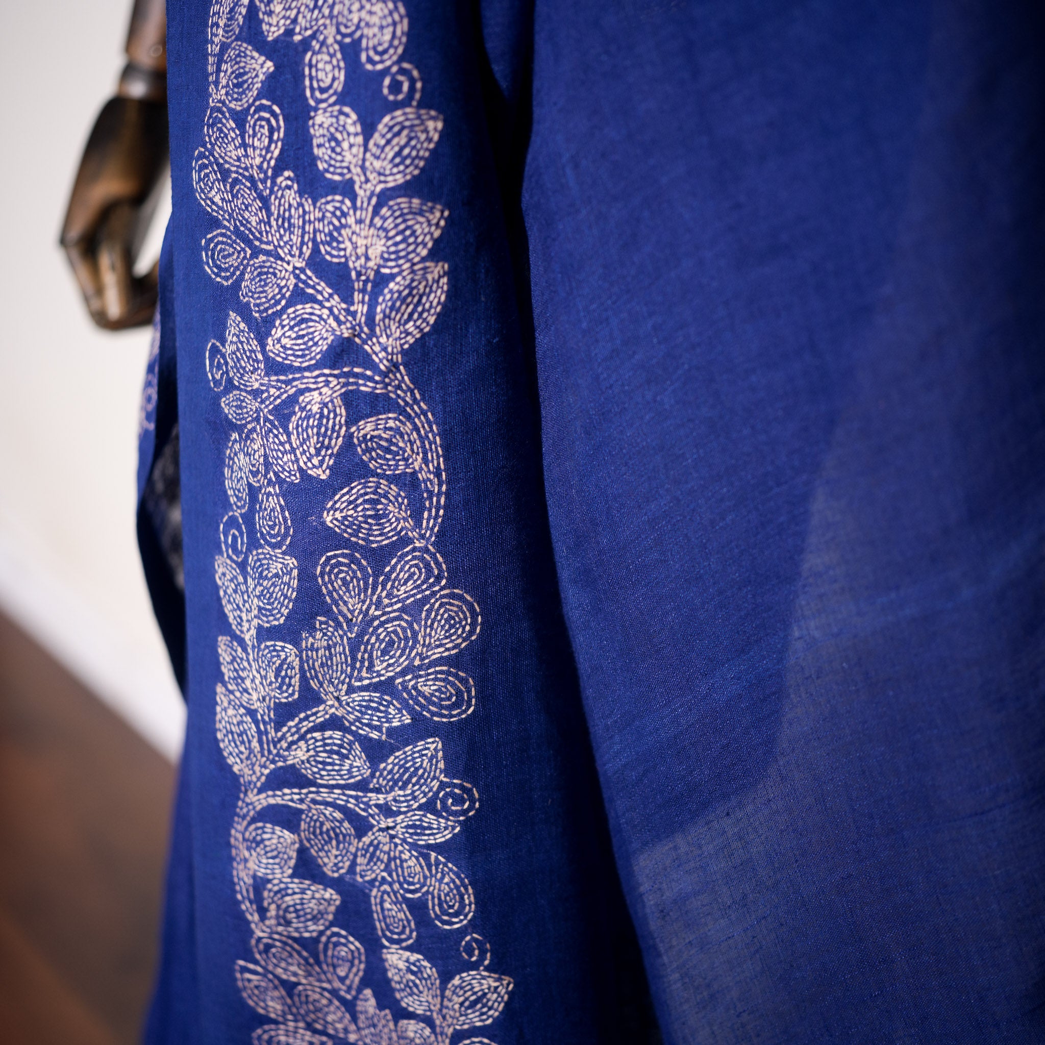 Lightweight yet structured, the linen drapes with fluid grace while maintaining its natural texture. The ivory embroidery adds luminous contrast against the bold indigo backdrop, creating a timeless and statement-worthy piece.