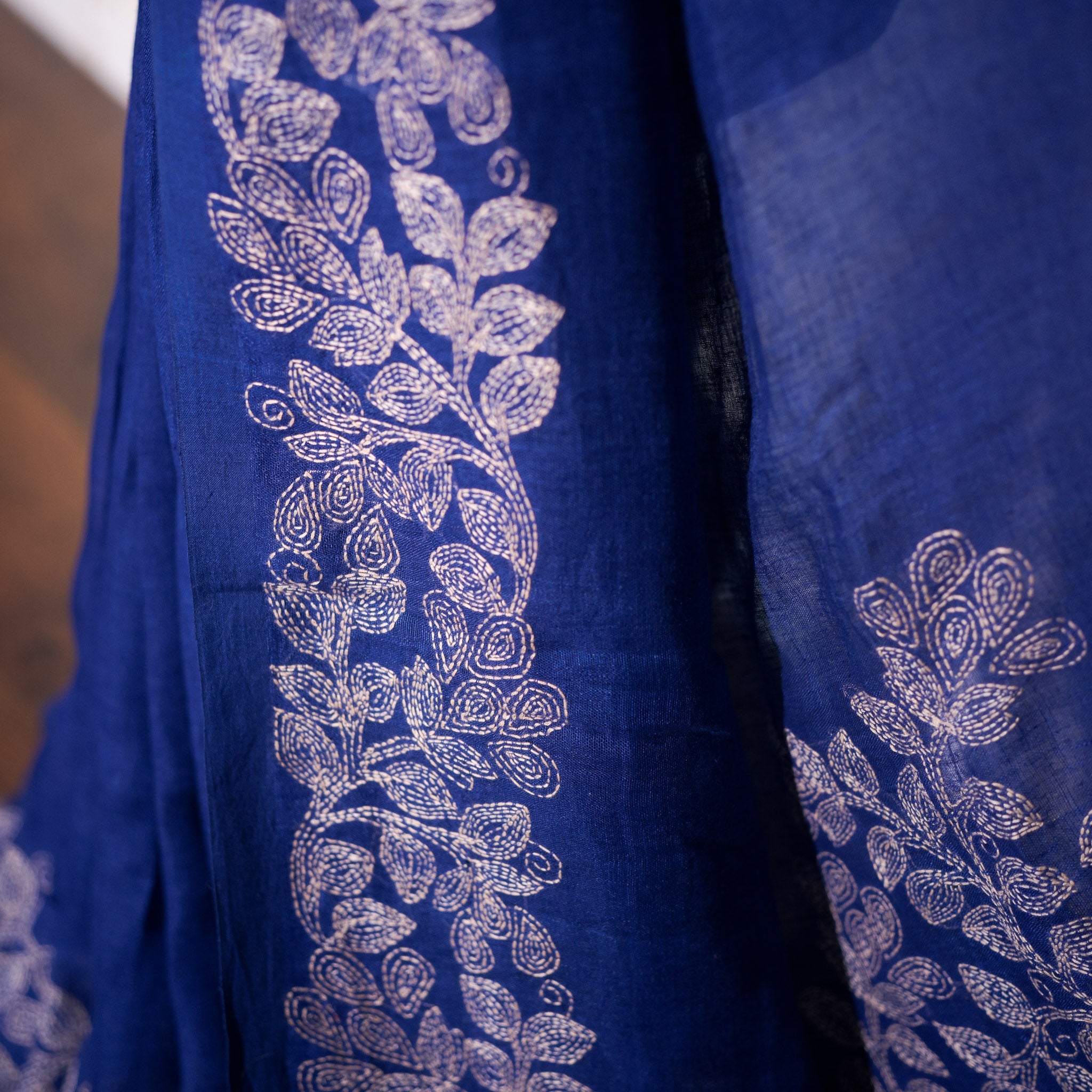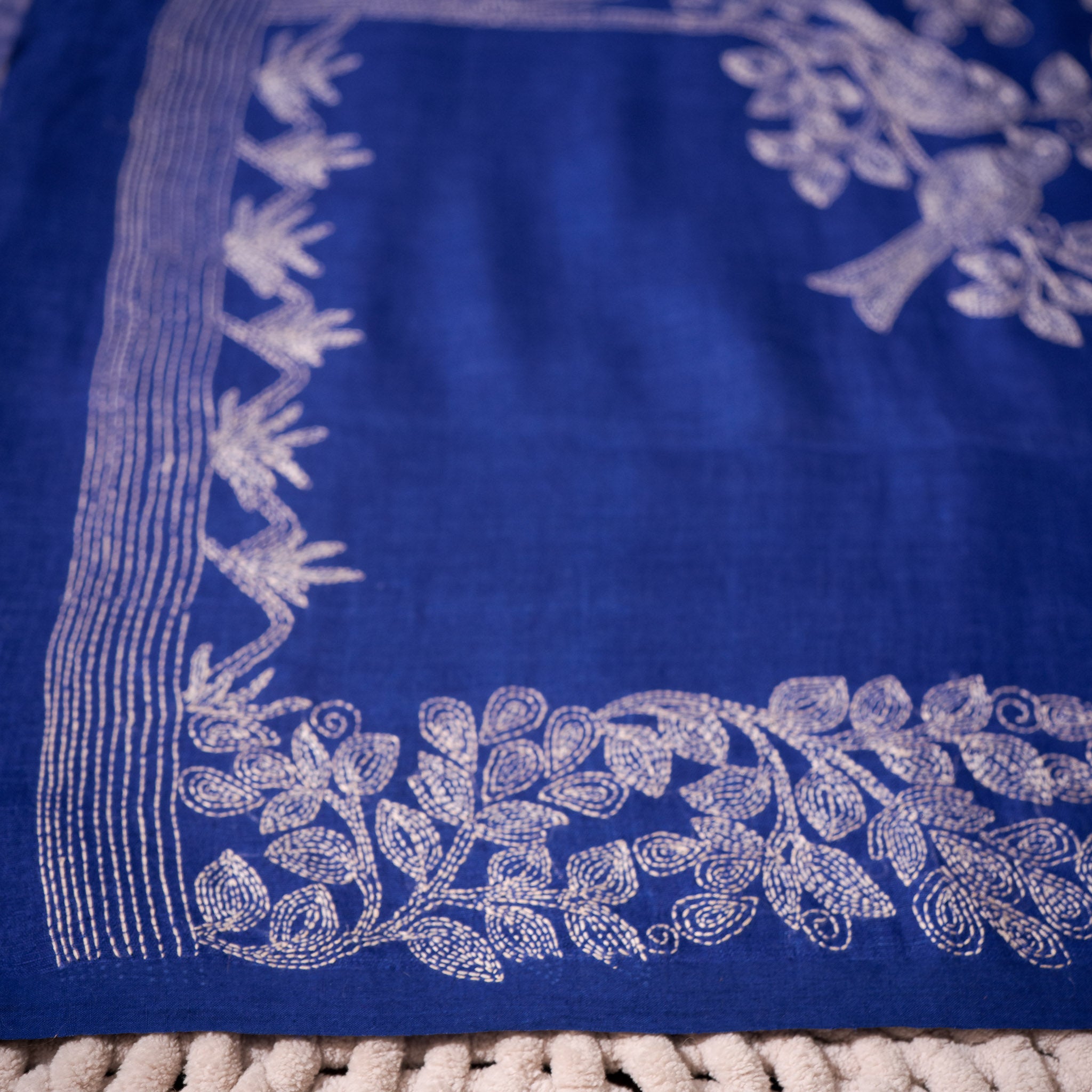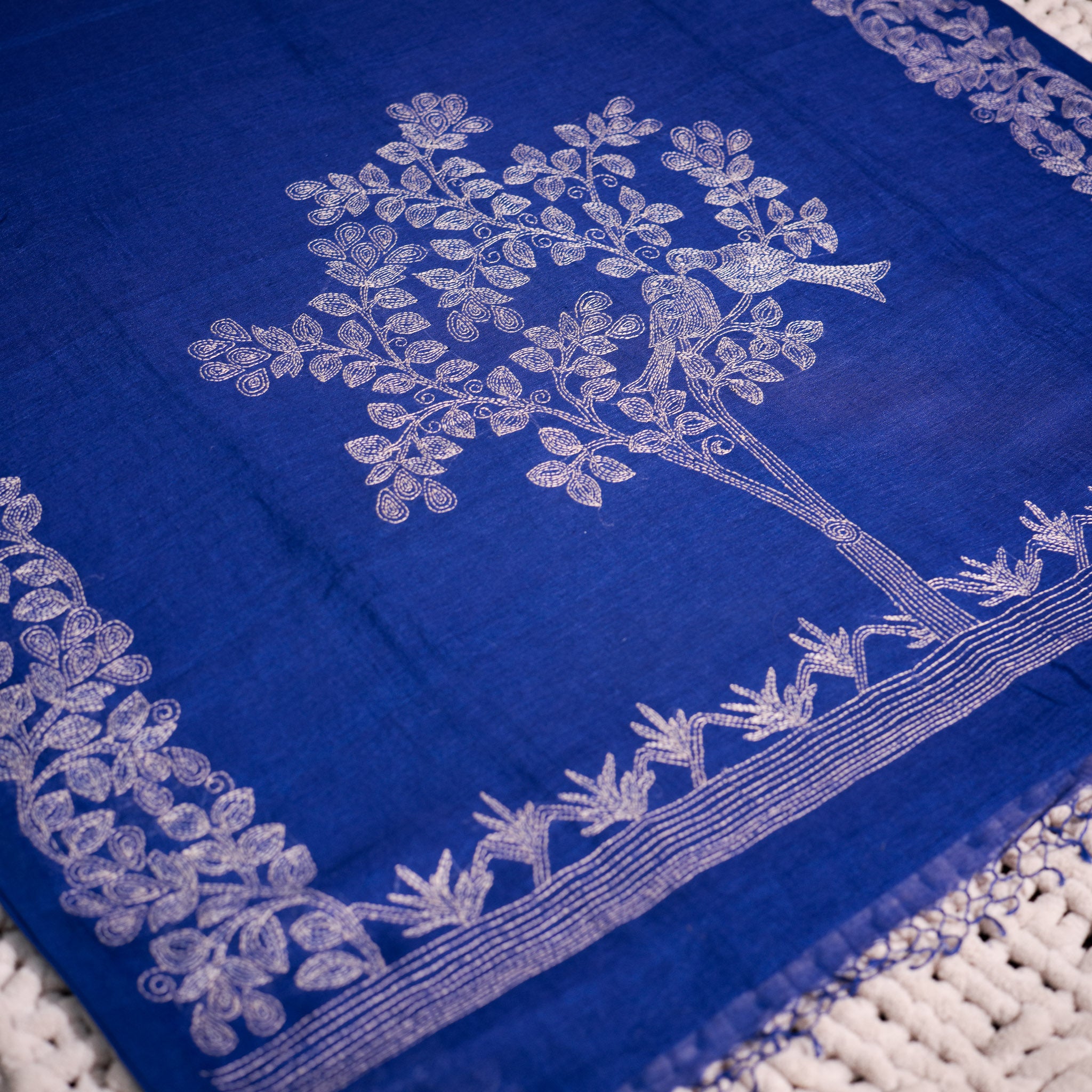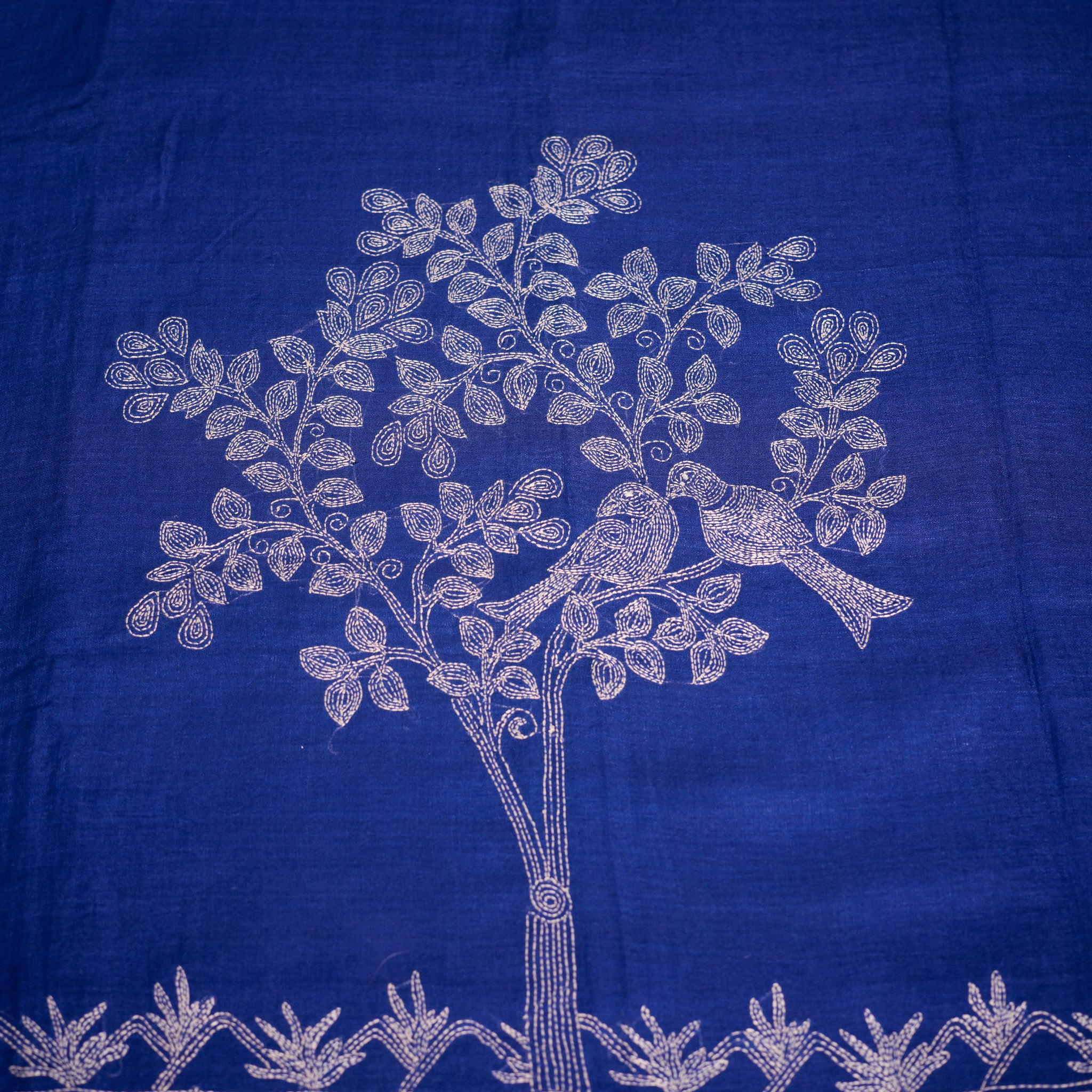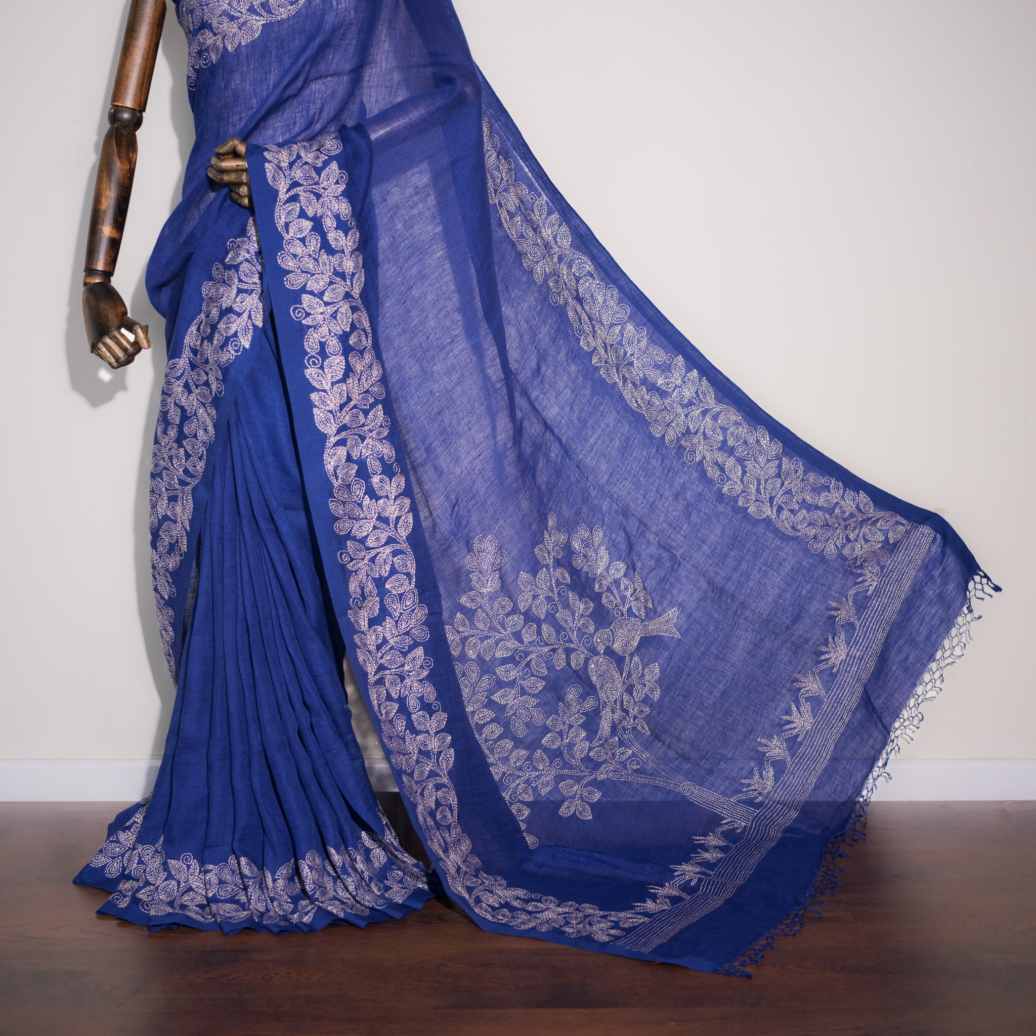 The rich blue base carries depth and sophistication, beautifully contrasted with delicate off-white Kantha stitch detailing. Flowing floral vine borders frame the saree, while the pallu features the signature tree-and-bird motif, rendered entirely in fine layered hand stitches.