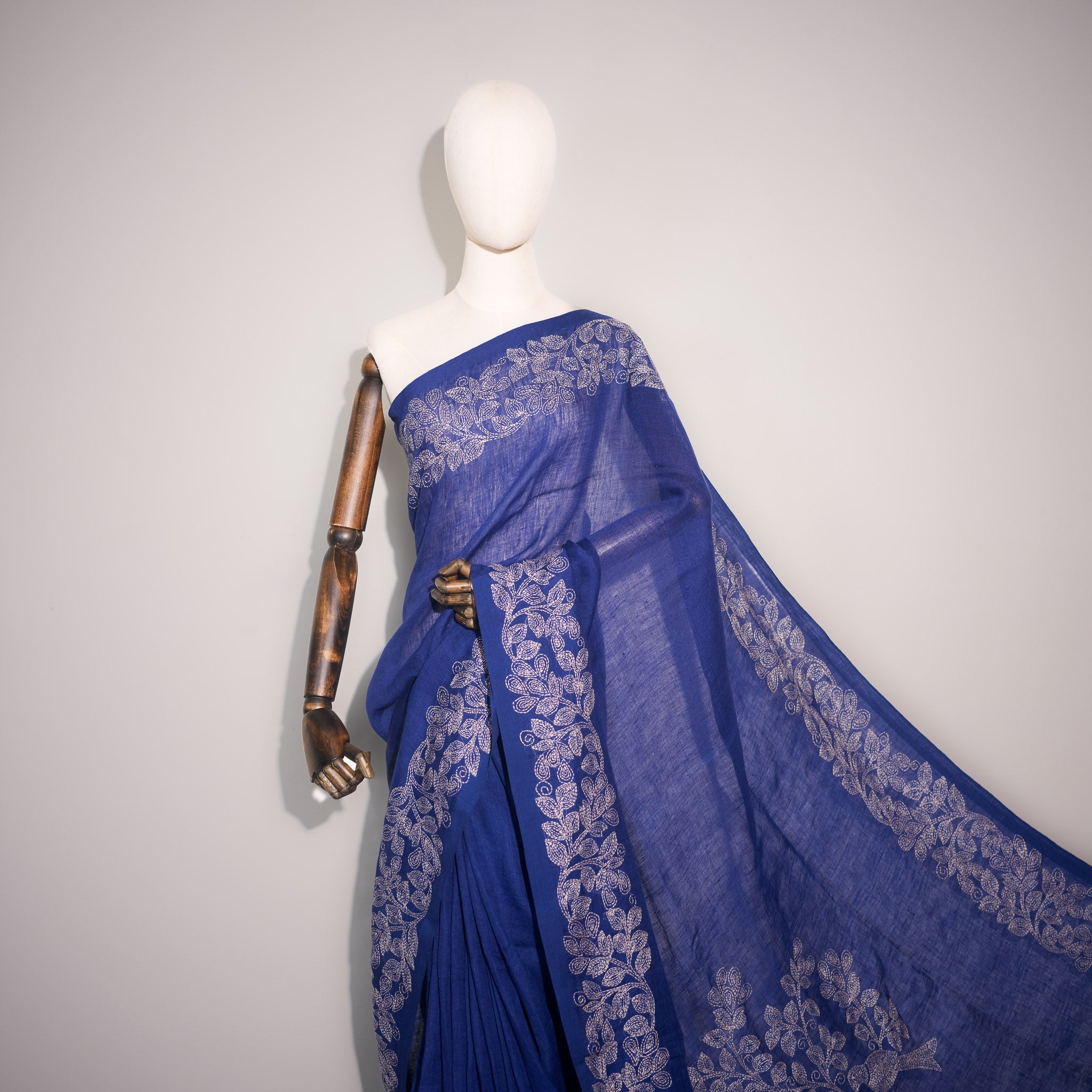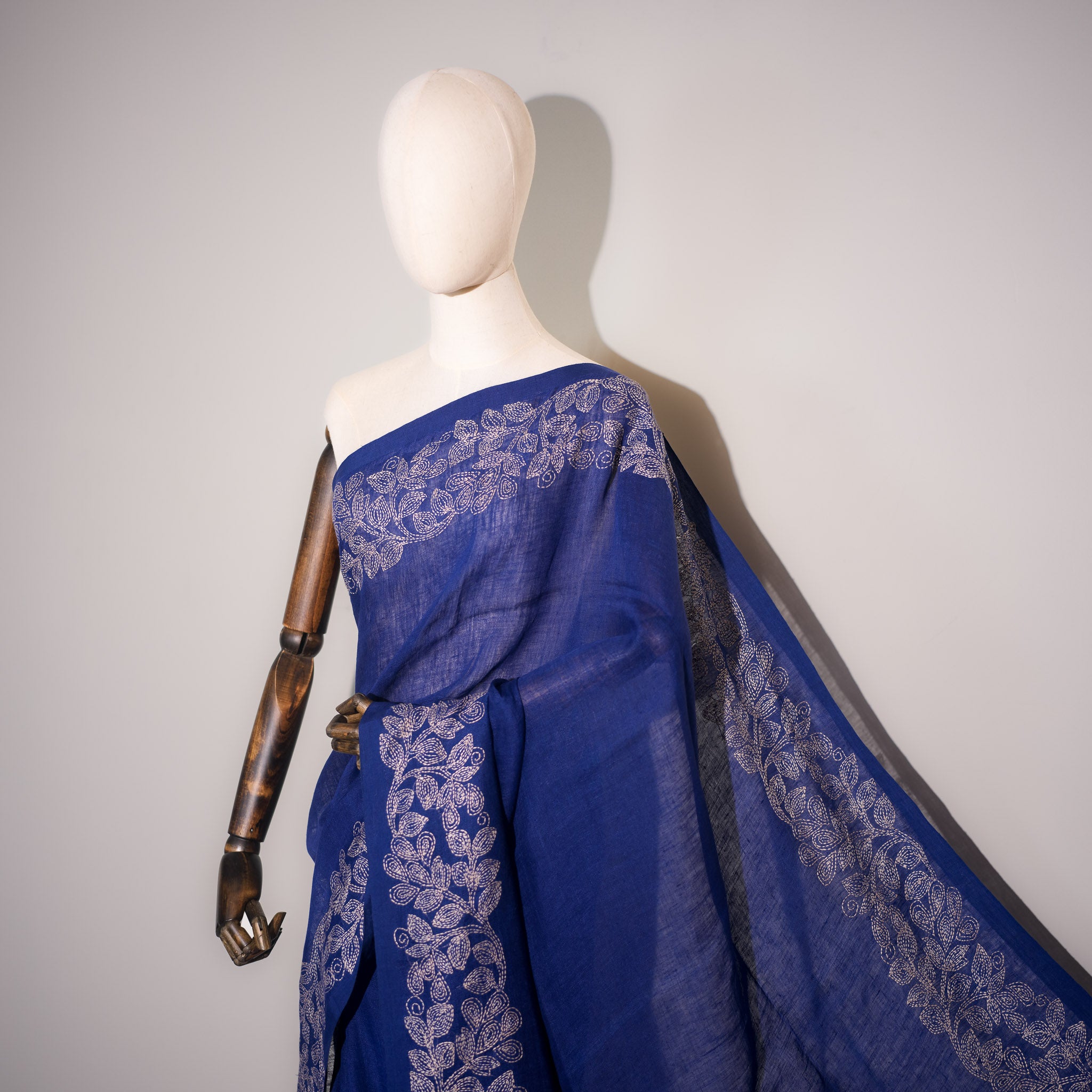 A powerful and elegant pure handwoven linen saree in a deep royal indigo blue, adorned with intricate hand Kantha embroidery in antique ivory.