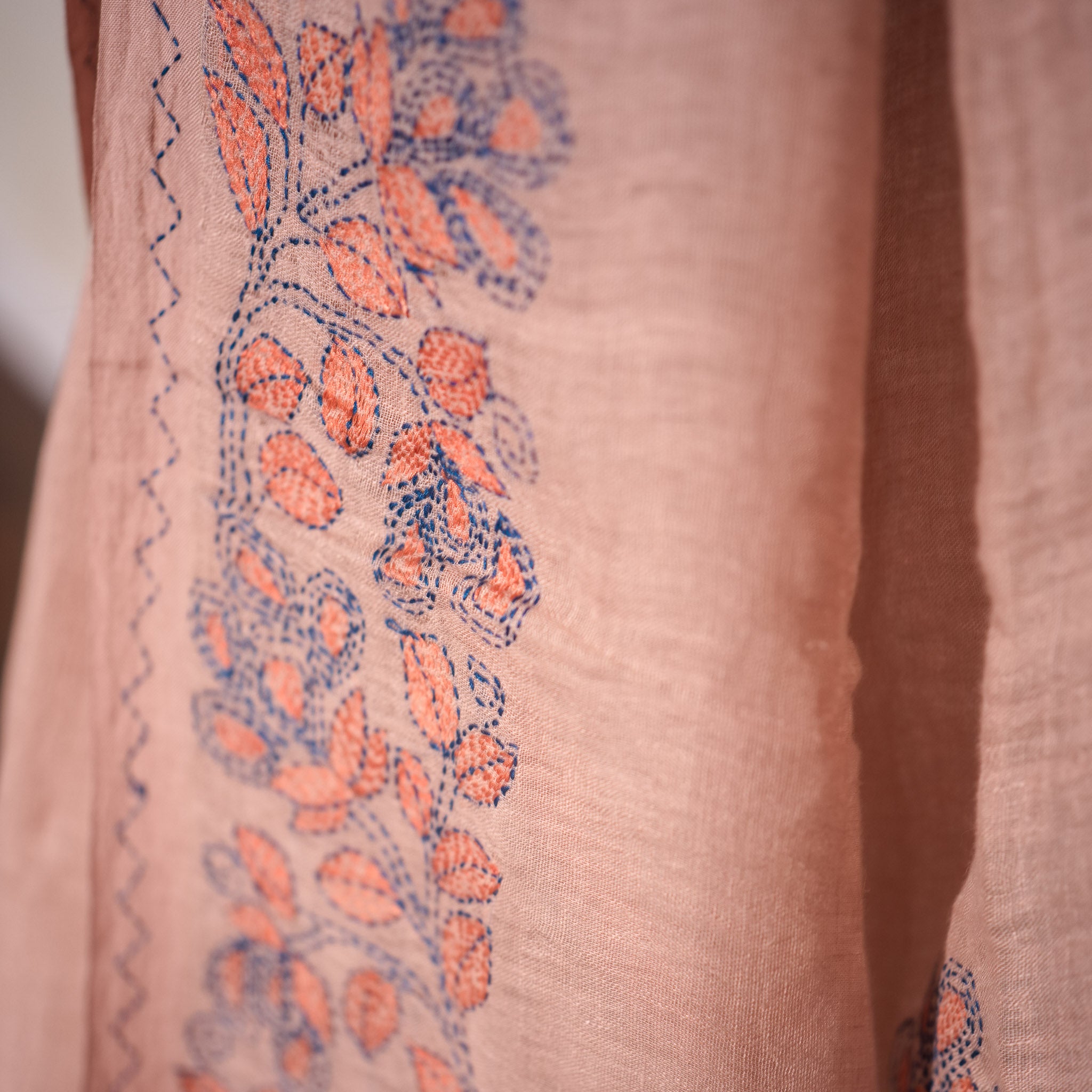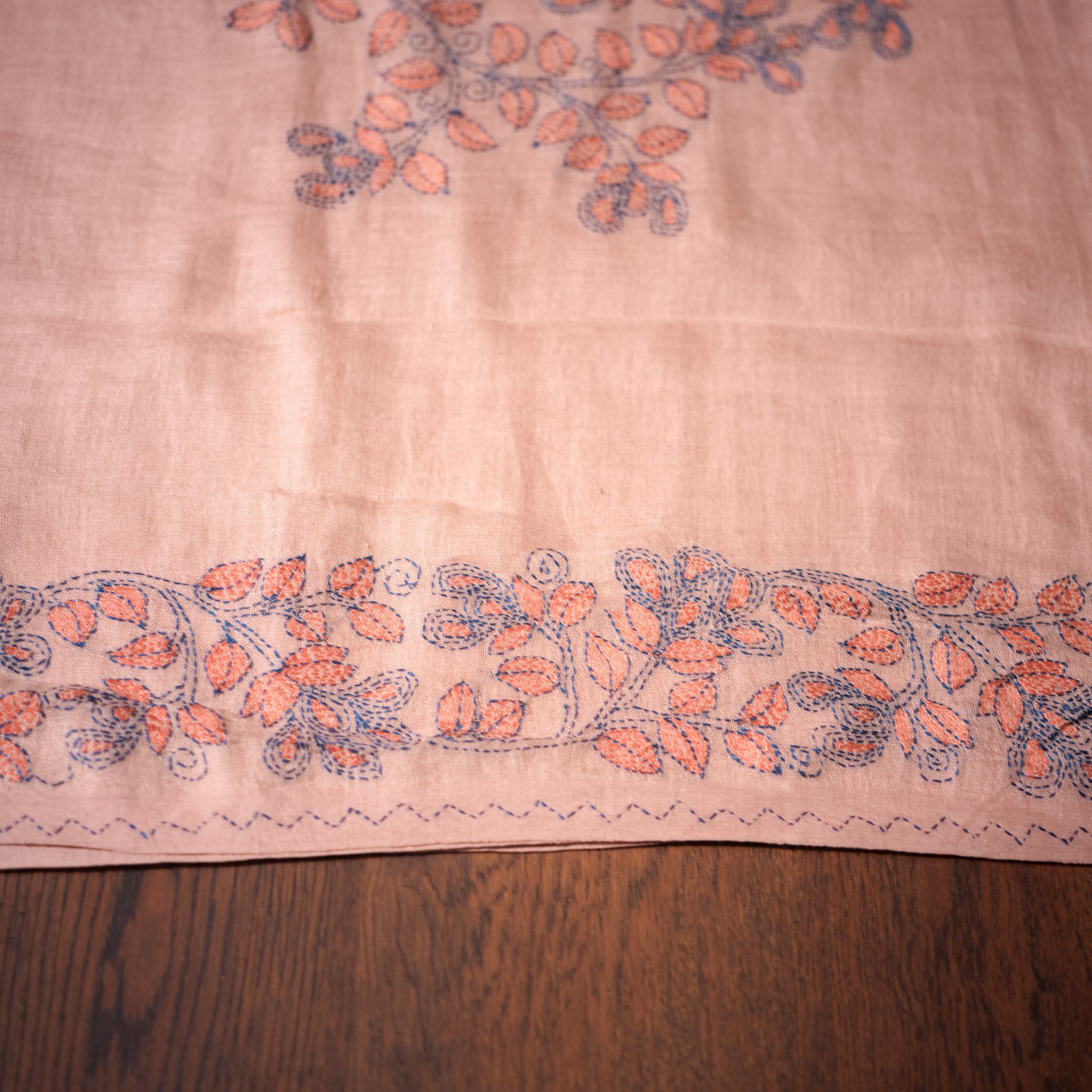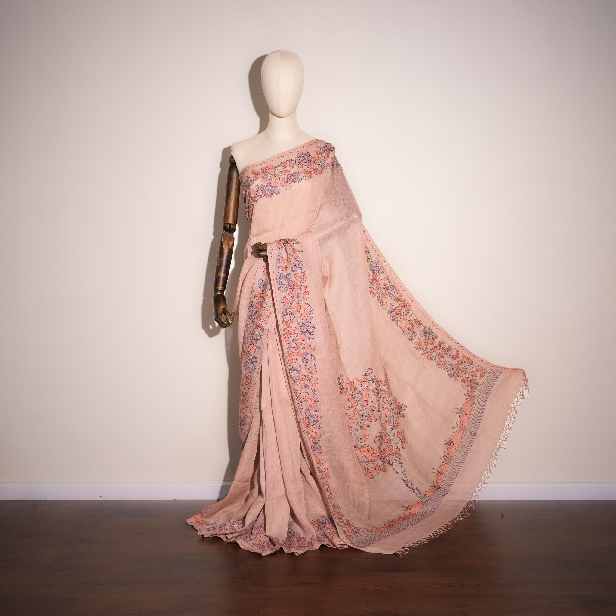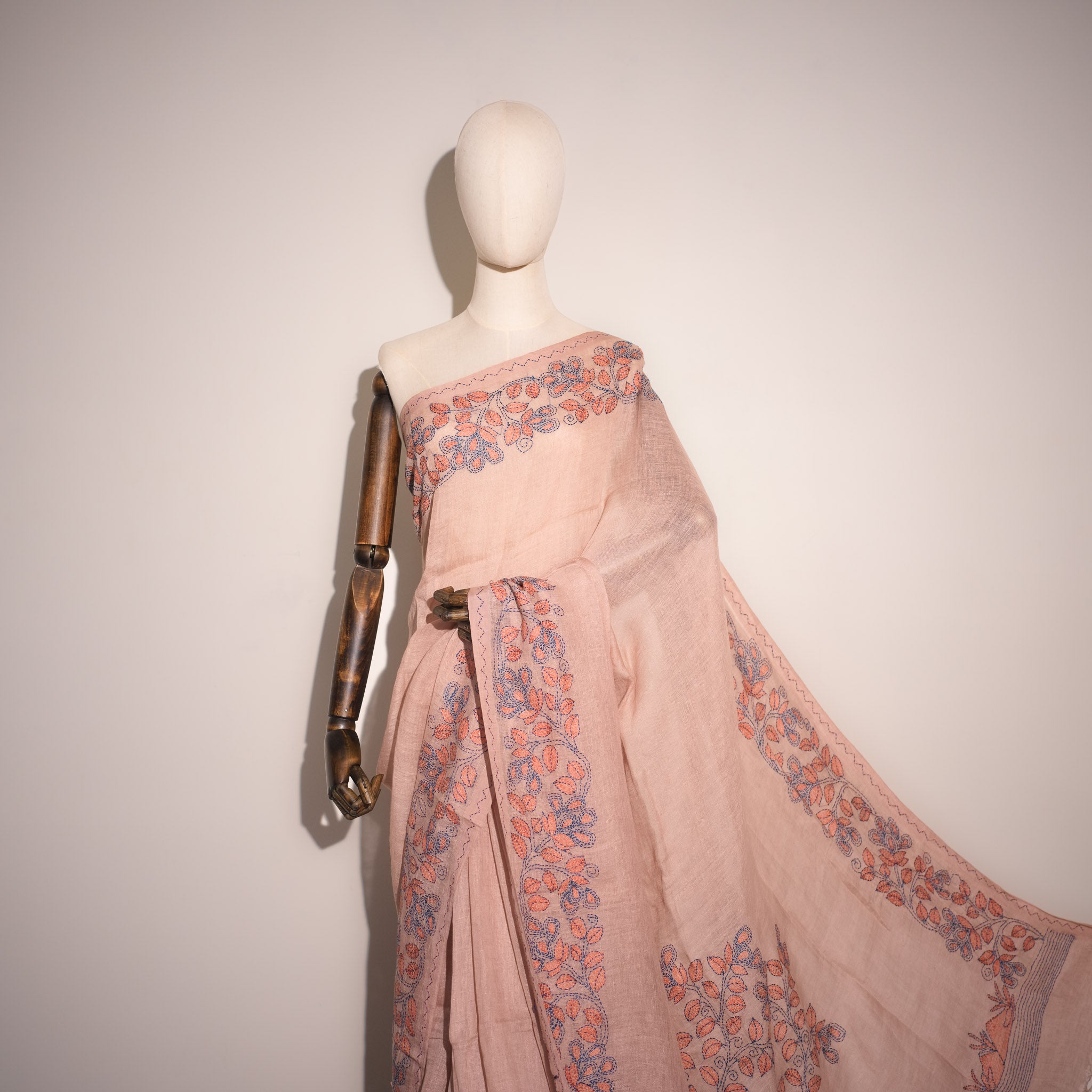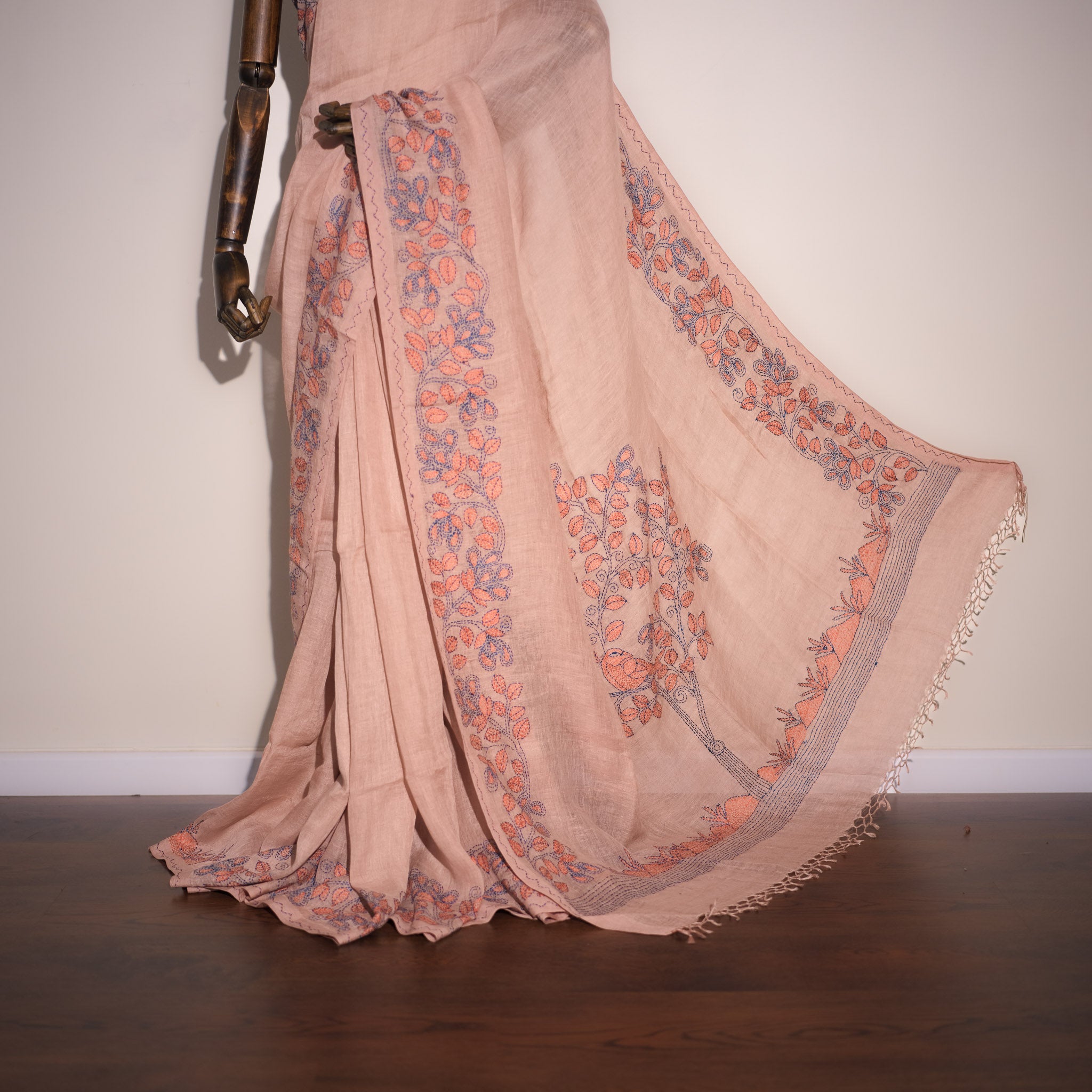 Kantha Vriksha Linen Saree – Dusty Blush Rose with Peach & Slate Blue Kantha Embroidery
