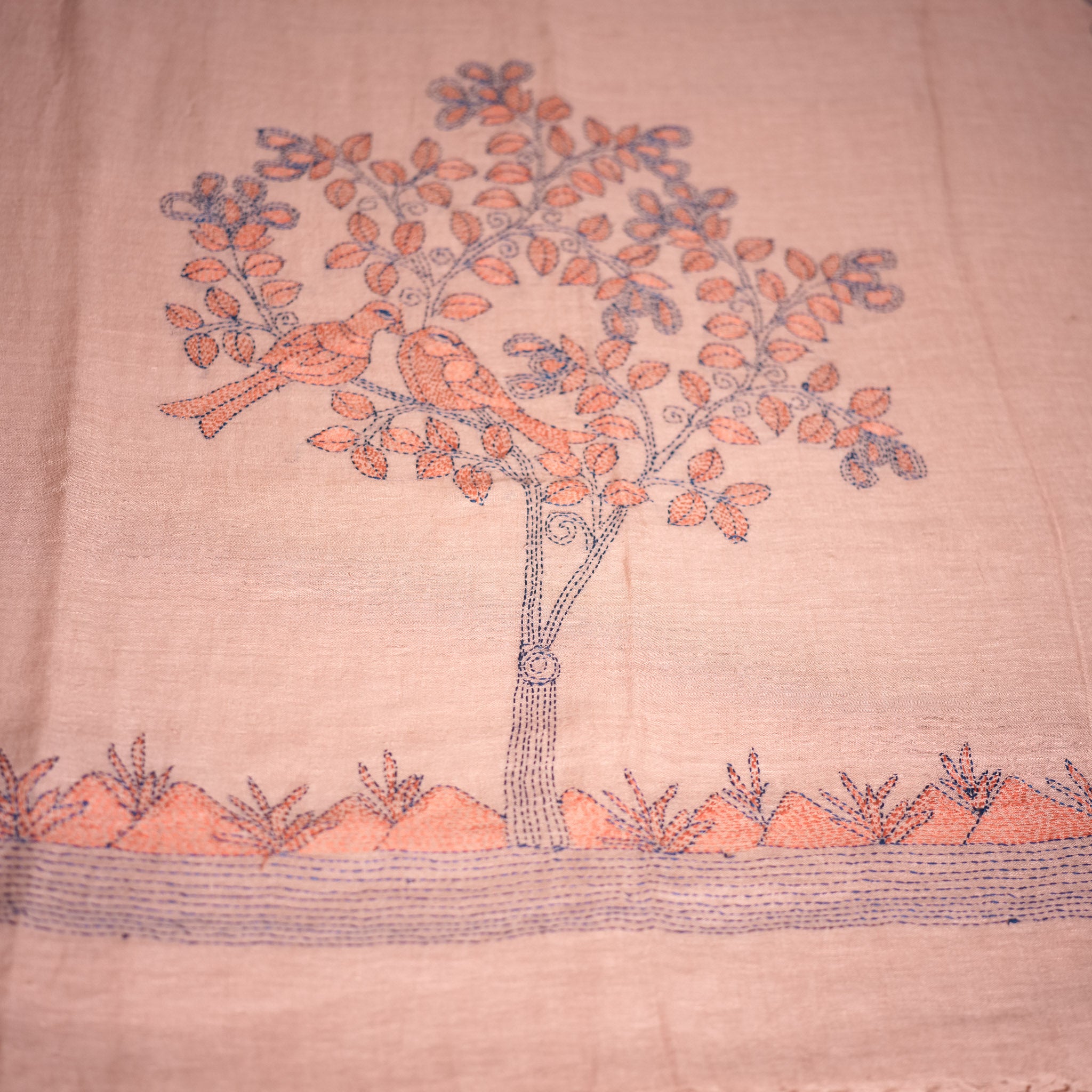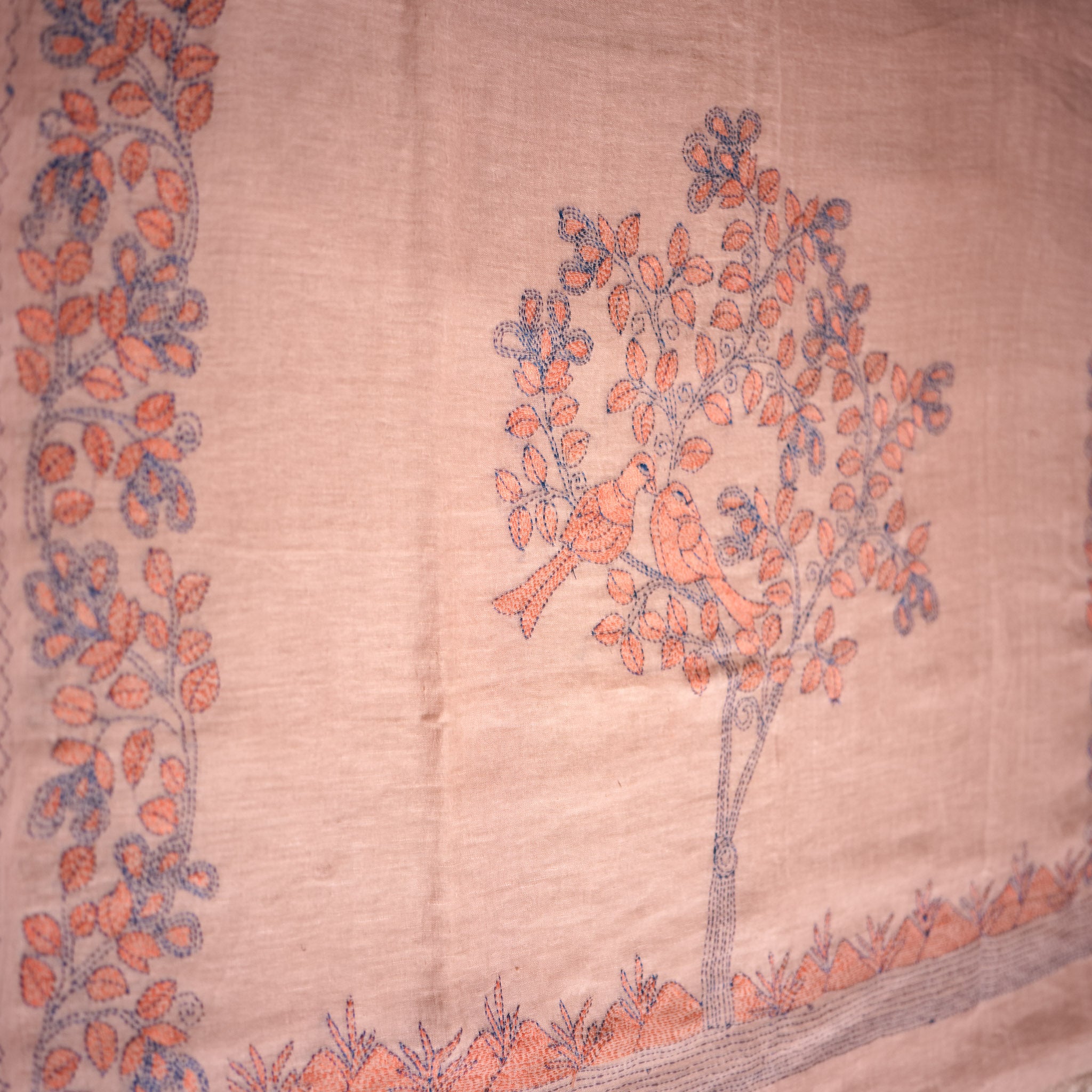 The muted rosy base carries a soft vintage warmth, delicately contrasted with peach coral leaf motifs and detailed slate blue Kantha outlining. The borders feature flowing floral vine patterns, while the pallu highlights the signature tree-and-bird composition rendered entirely in fine hand stitching.