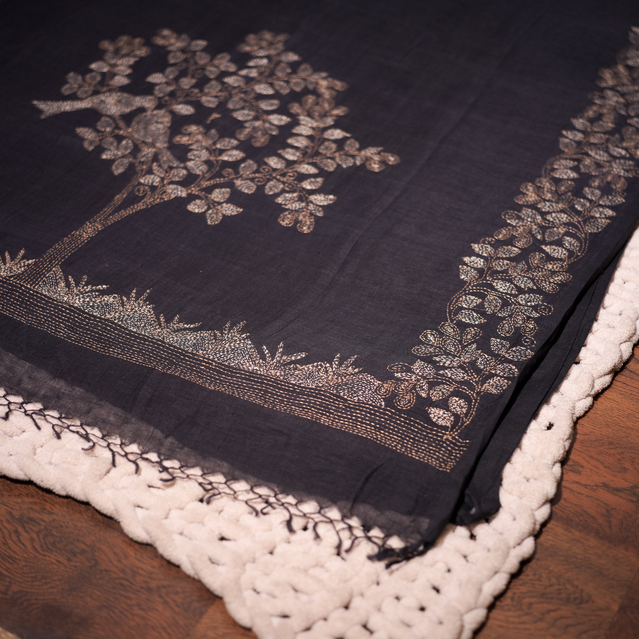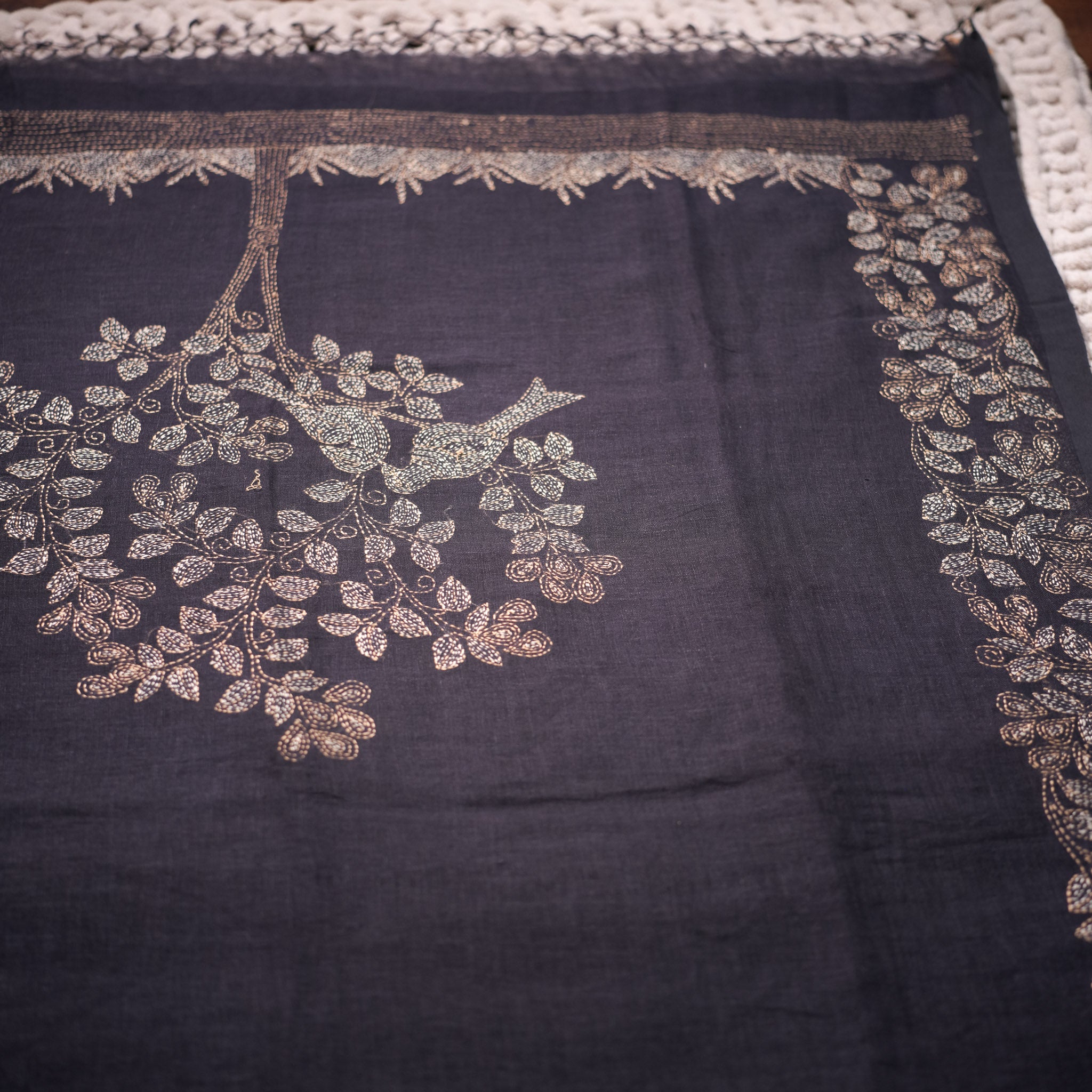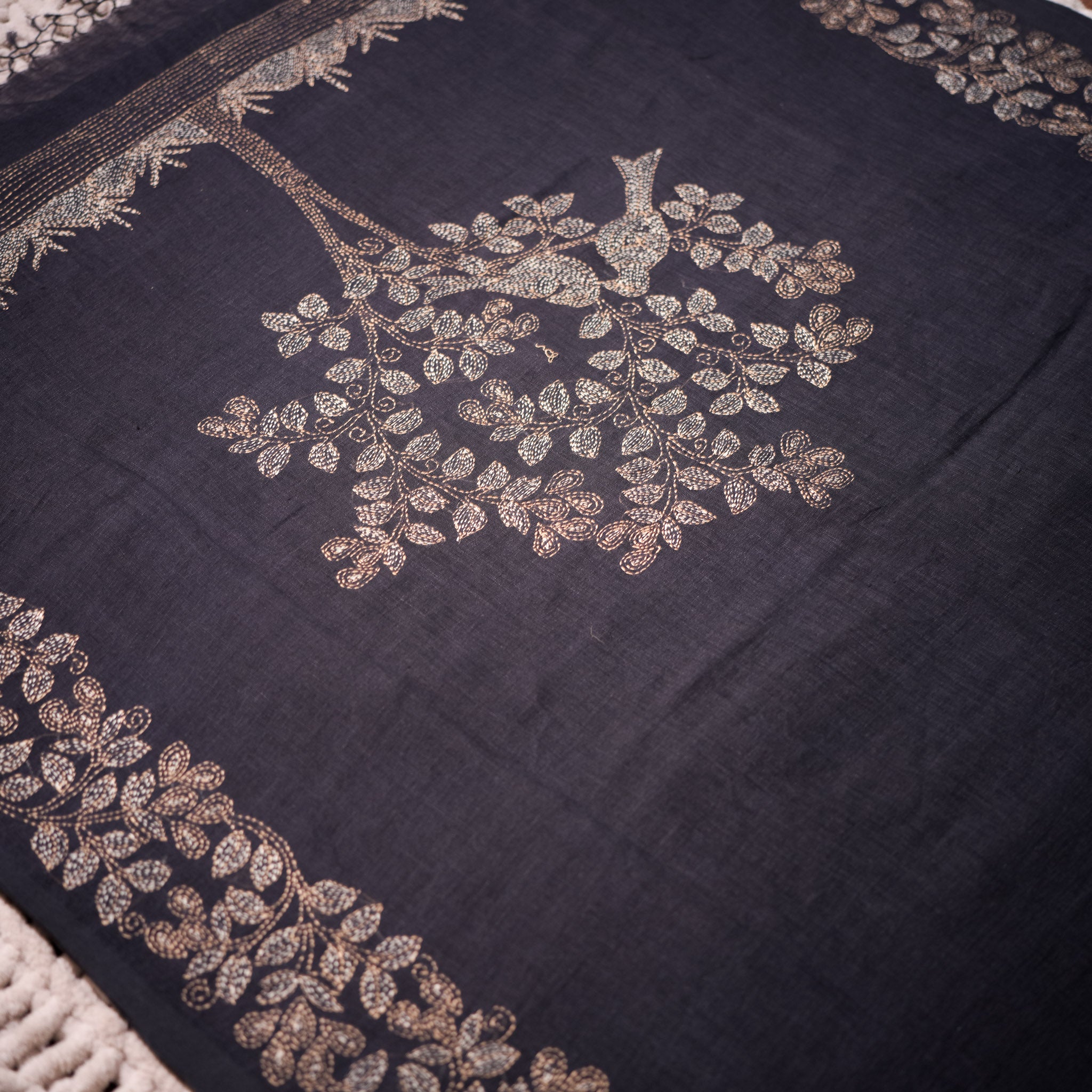 The matte charcoal base lends depth and quiet sophistication, creating a striking contrast against the antique beige Kantha stitching. Delicate floral vine motifs frame the borders, while the pallu features an elaborate tree-and-bird composition rendered entirely in fine hand stitch detailing. The embroidery carries a soft, earthy metallic warmth - understated and timeless in character.