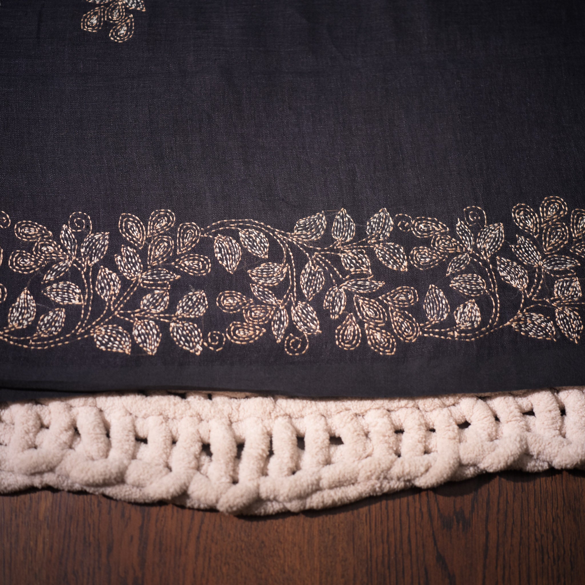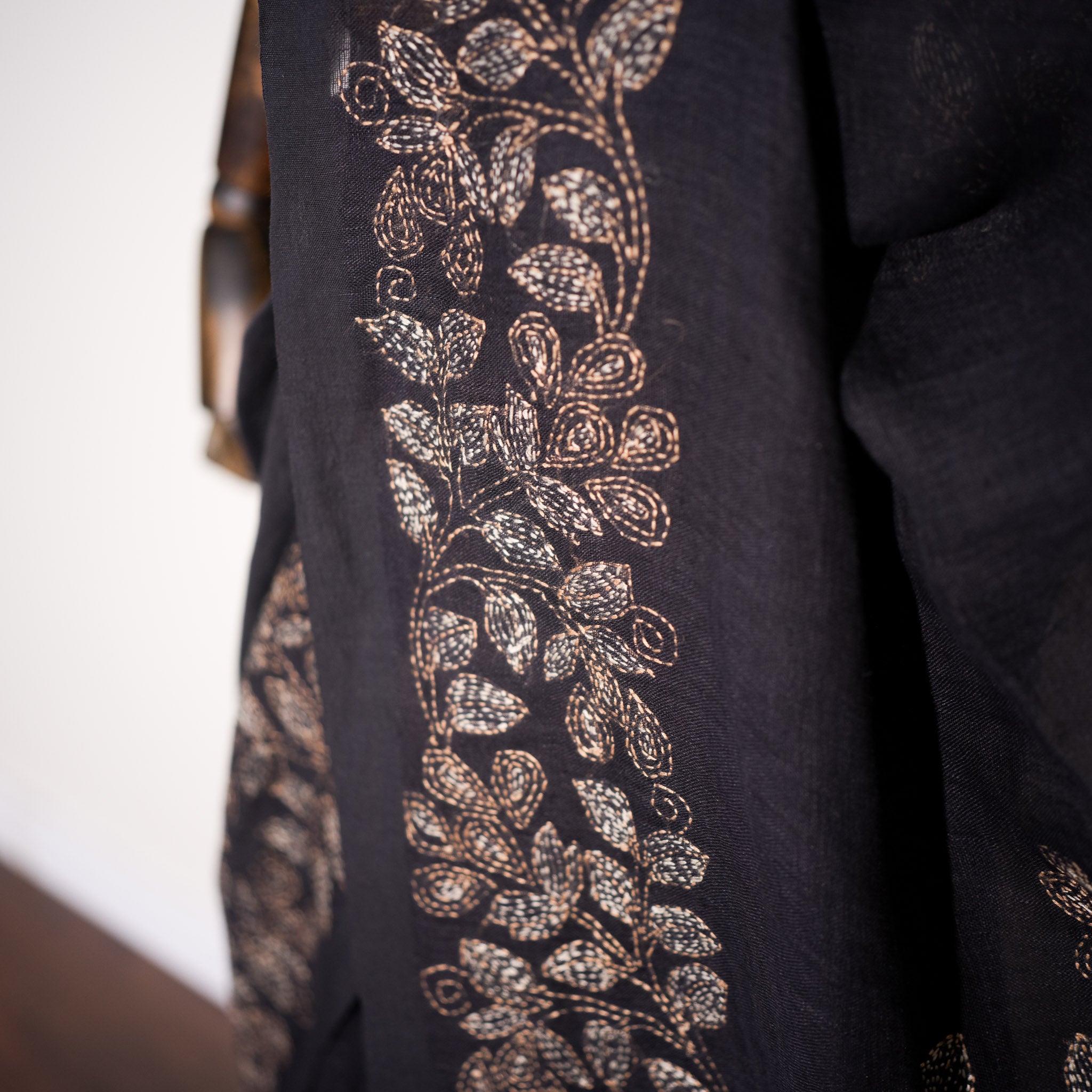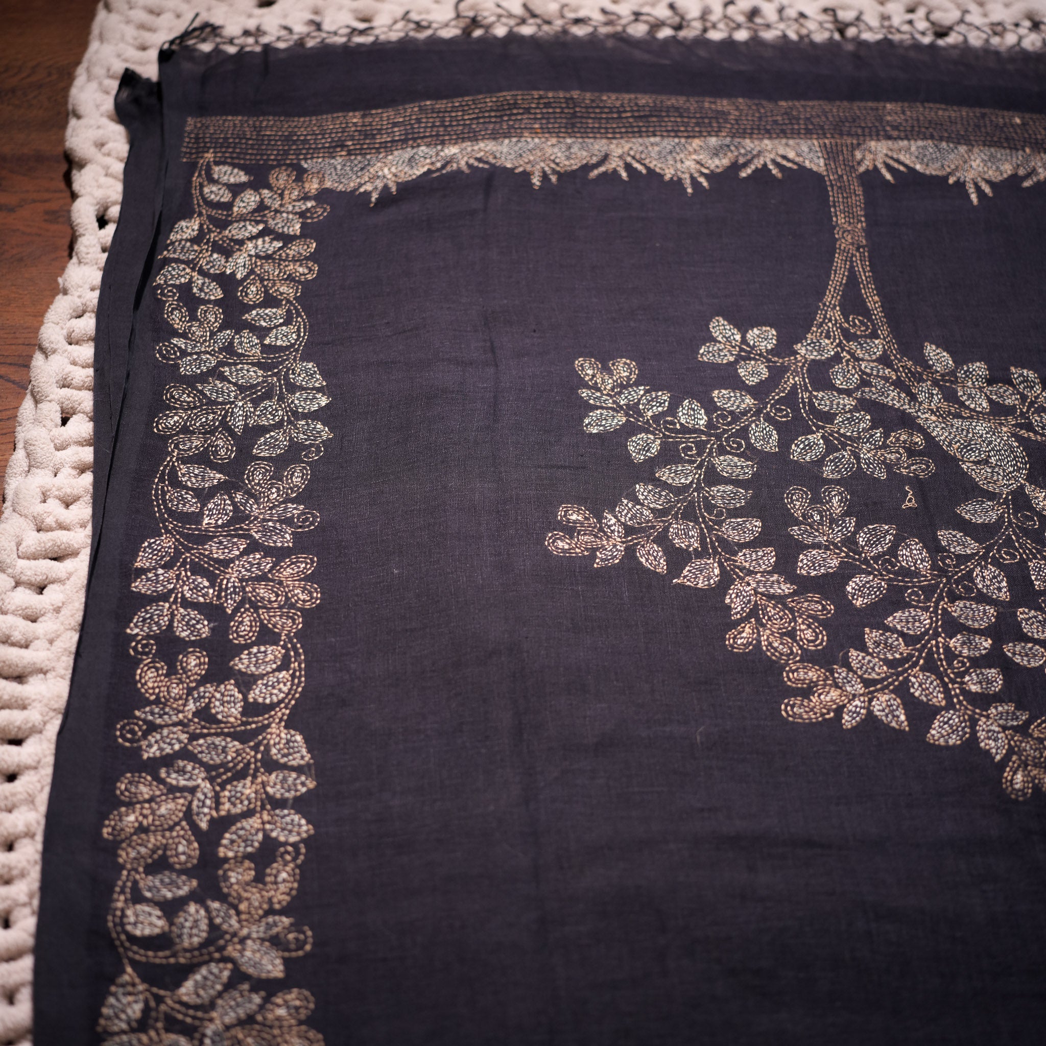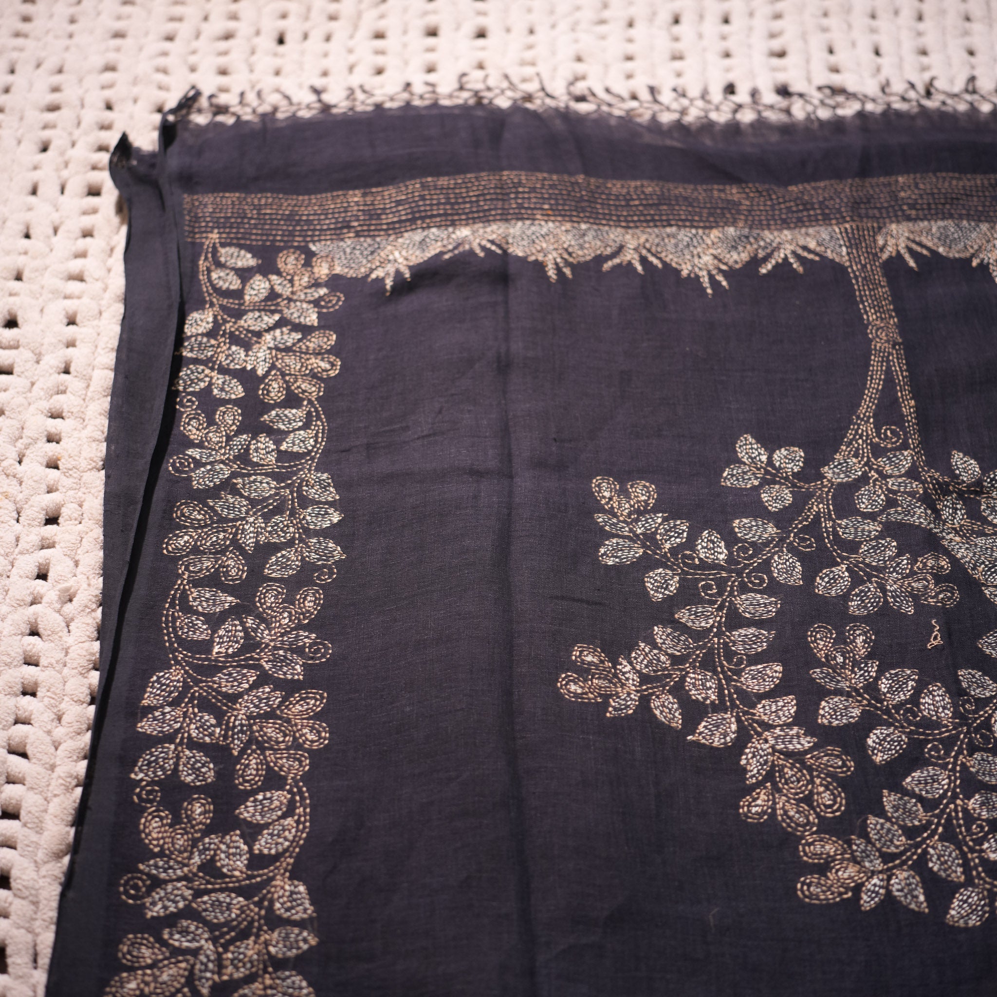 The matte charcoal base lends depth and quiet sophistication, creating a striking contrast against the antique beige Kantha stitching. Delicate floral vine motifs frame the borders, while the pallu features an elaborate tree-and-bird composition rendered entirely in fine hand stitch detailing. The embroidery carries a soft, earthy metallic warmth - understated and timeless in character.