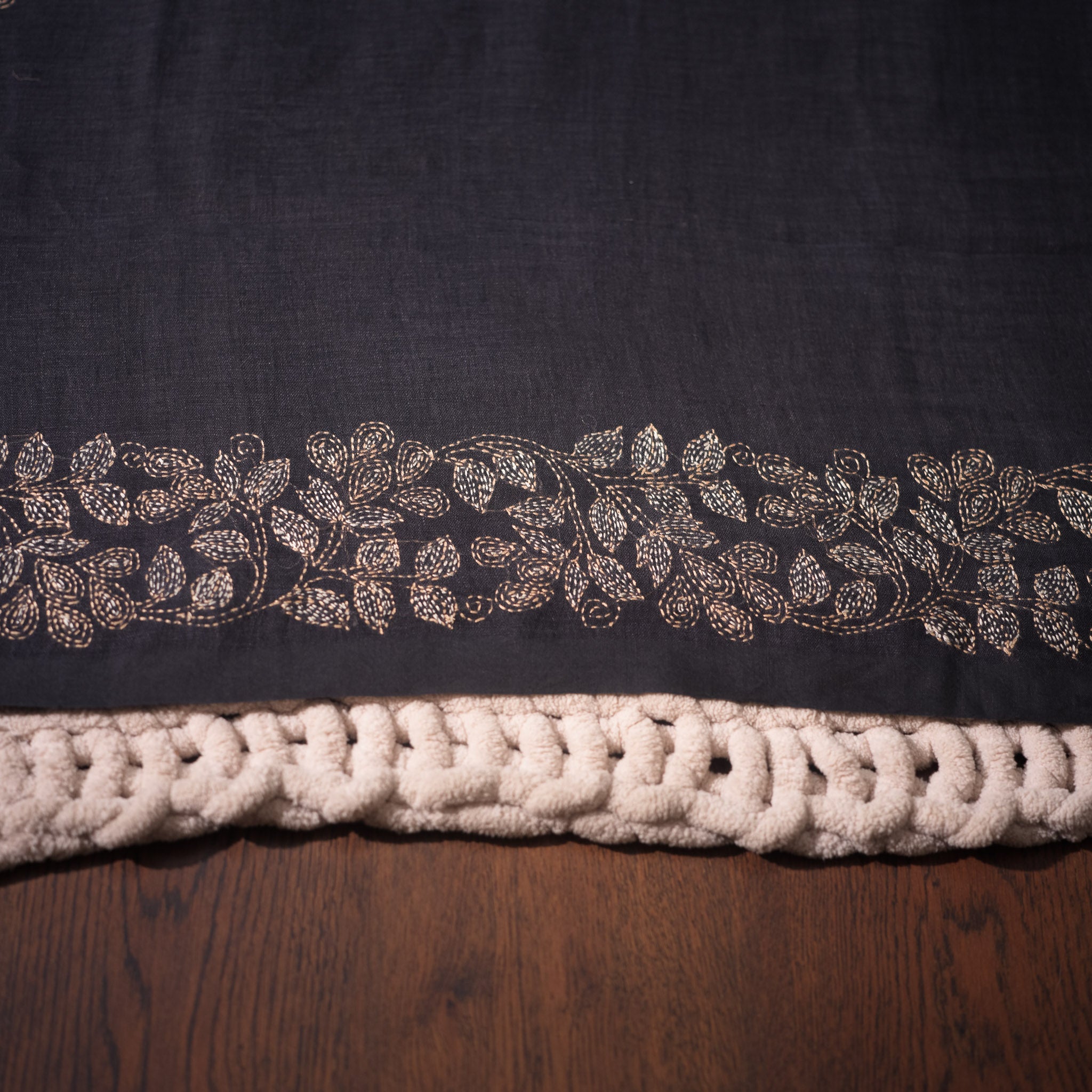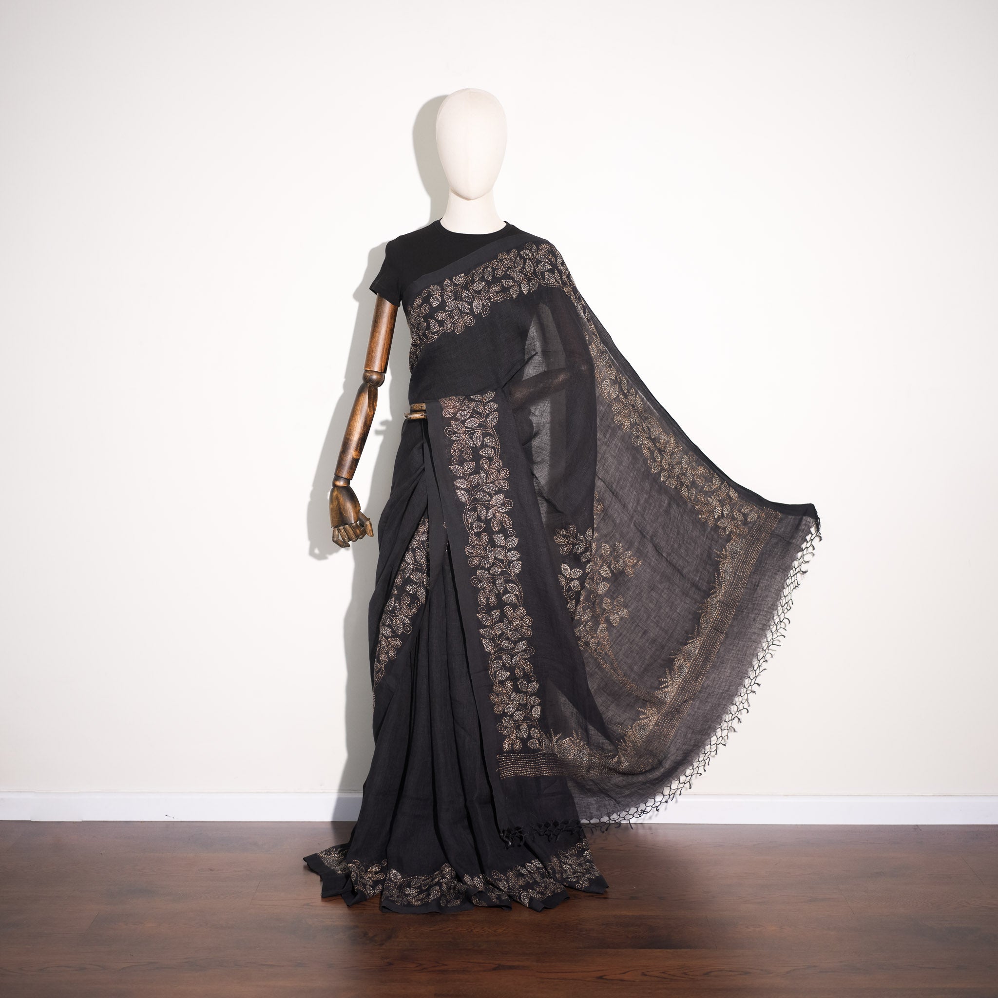 Kantha Vriksha Linen Saree – Charcoal Black with Antique Beige Kantha Embroidery