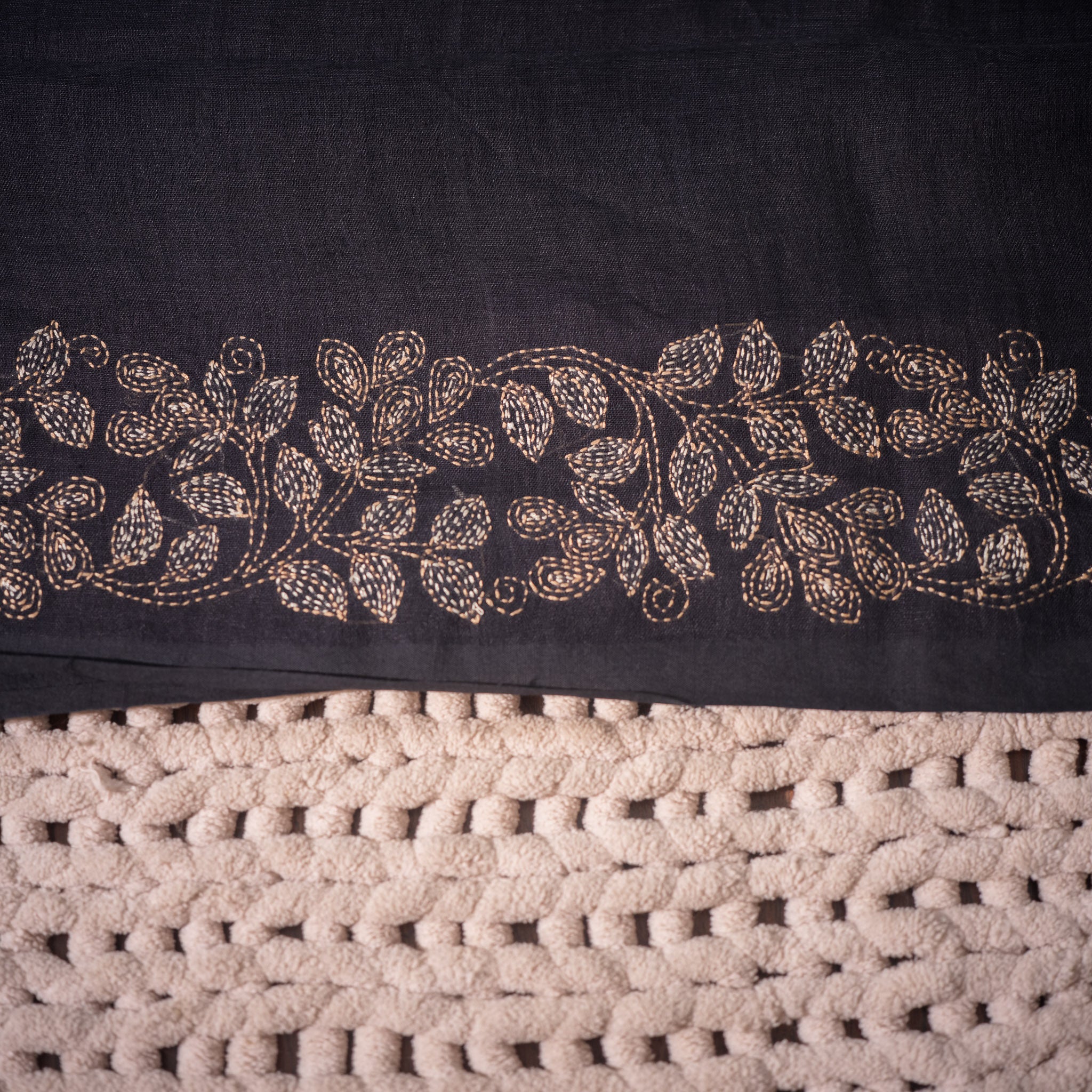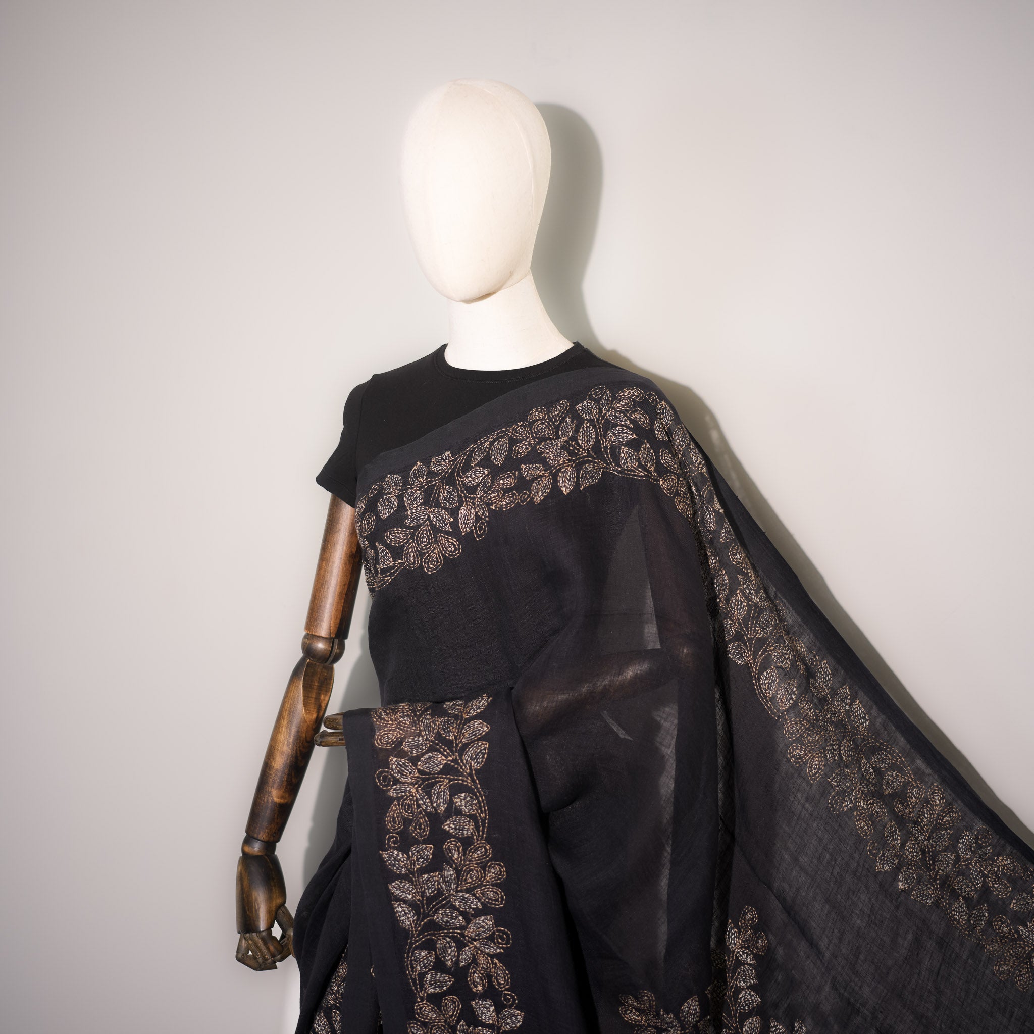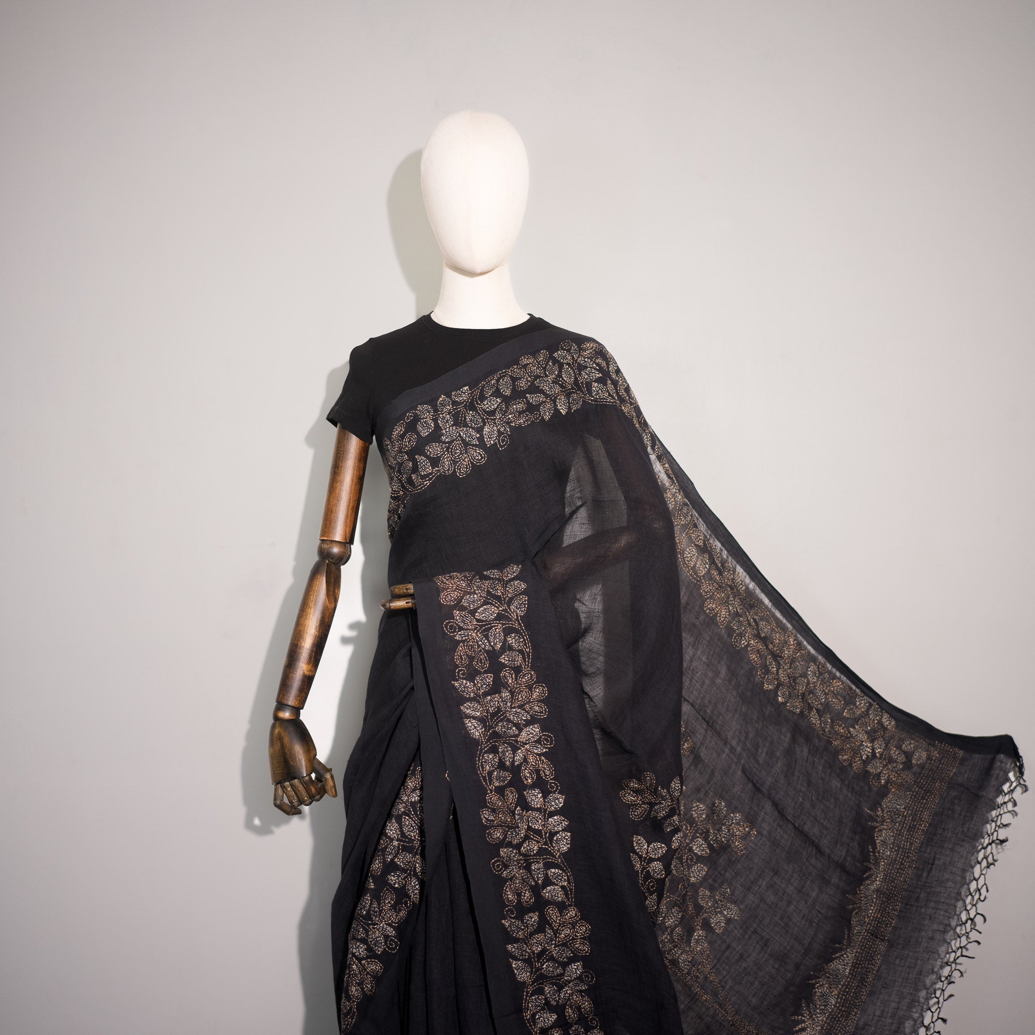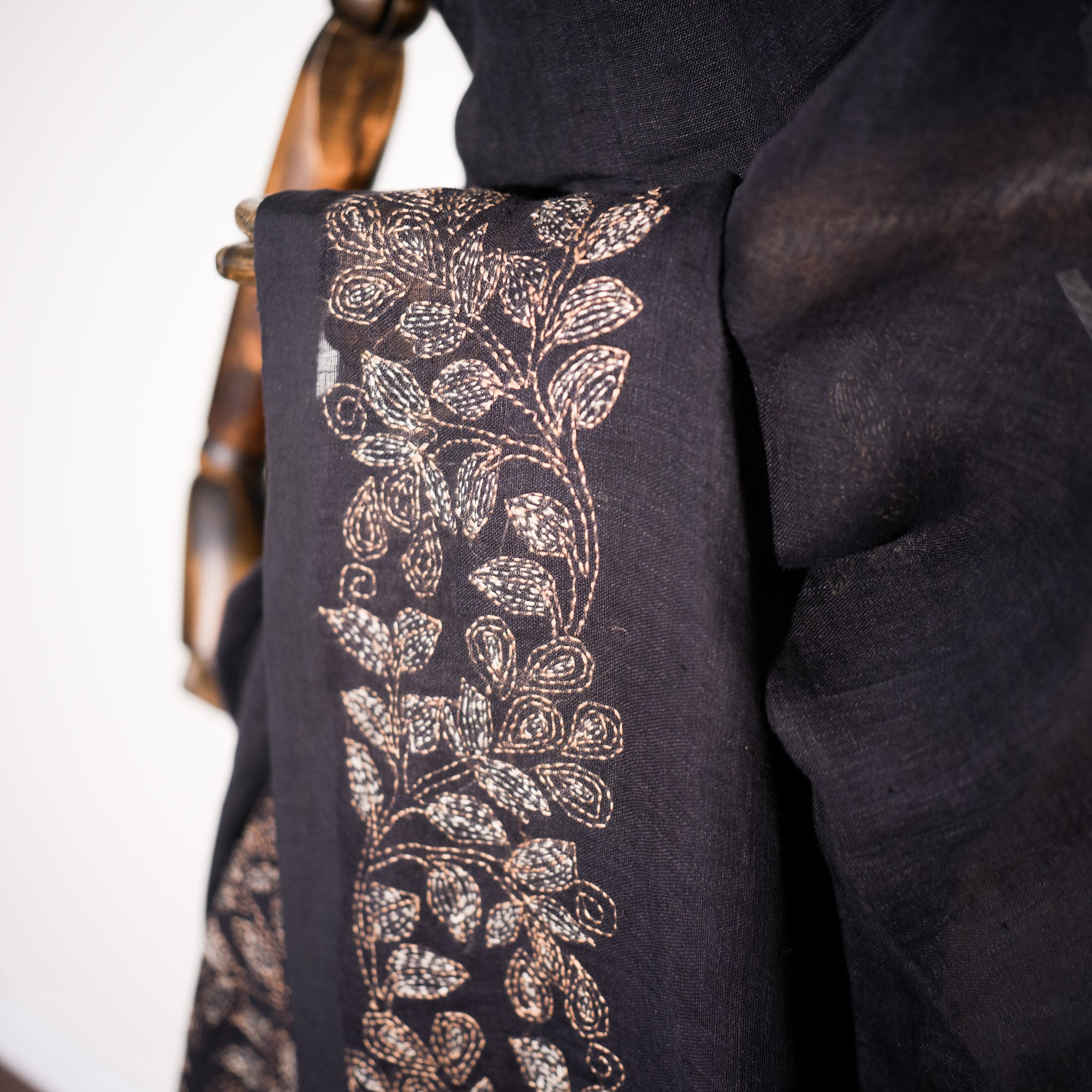 A refined pure handwoven linen saree in an elegant charcoal black tone, elevated with intricate hand Kantha embroidery.