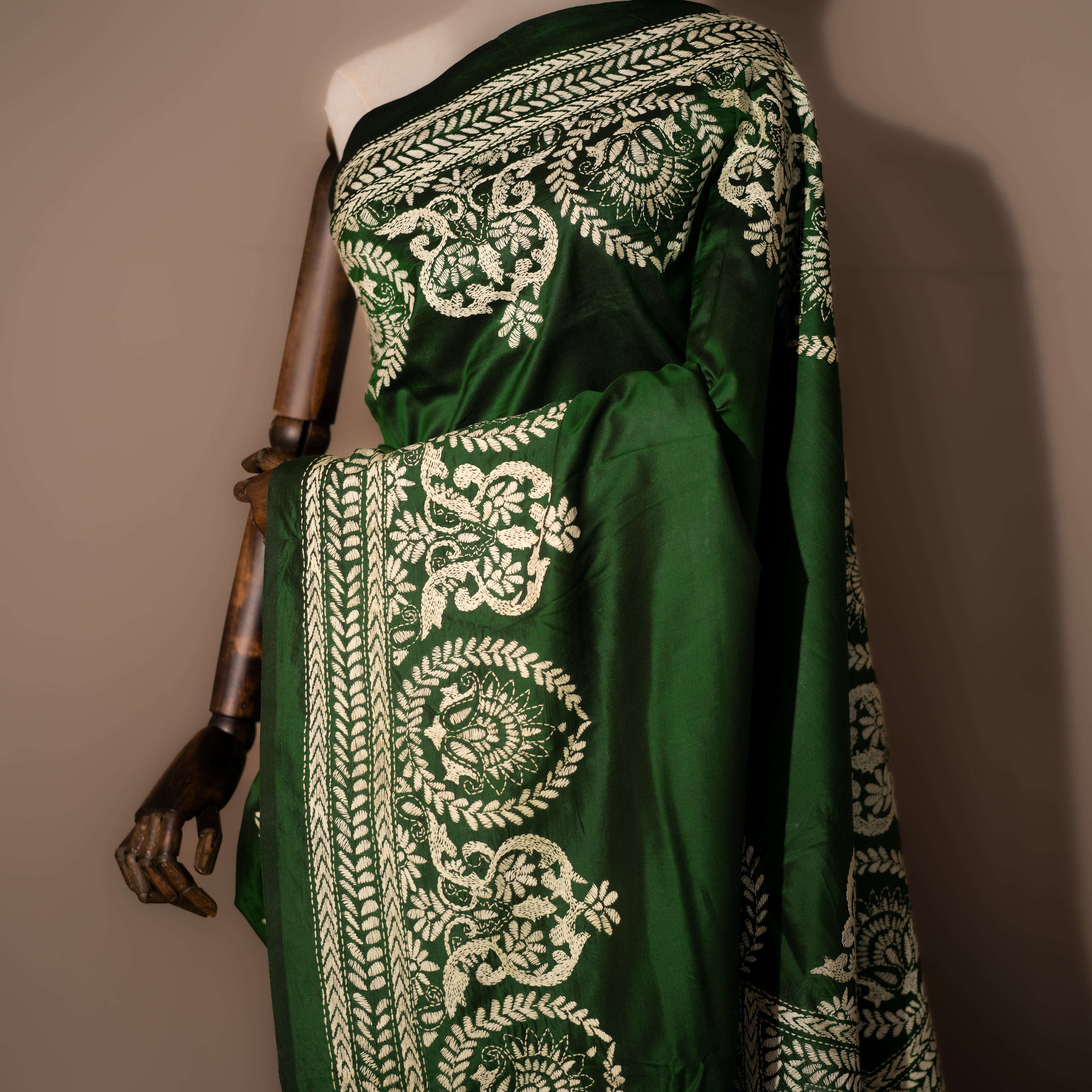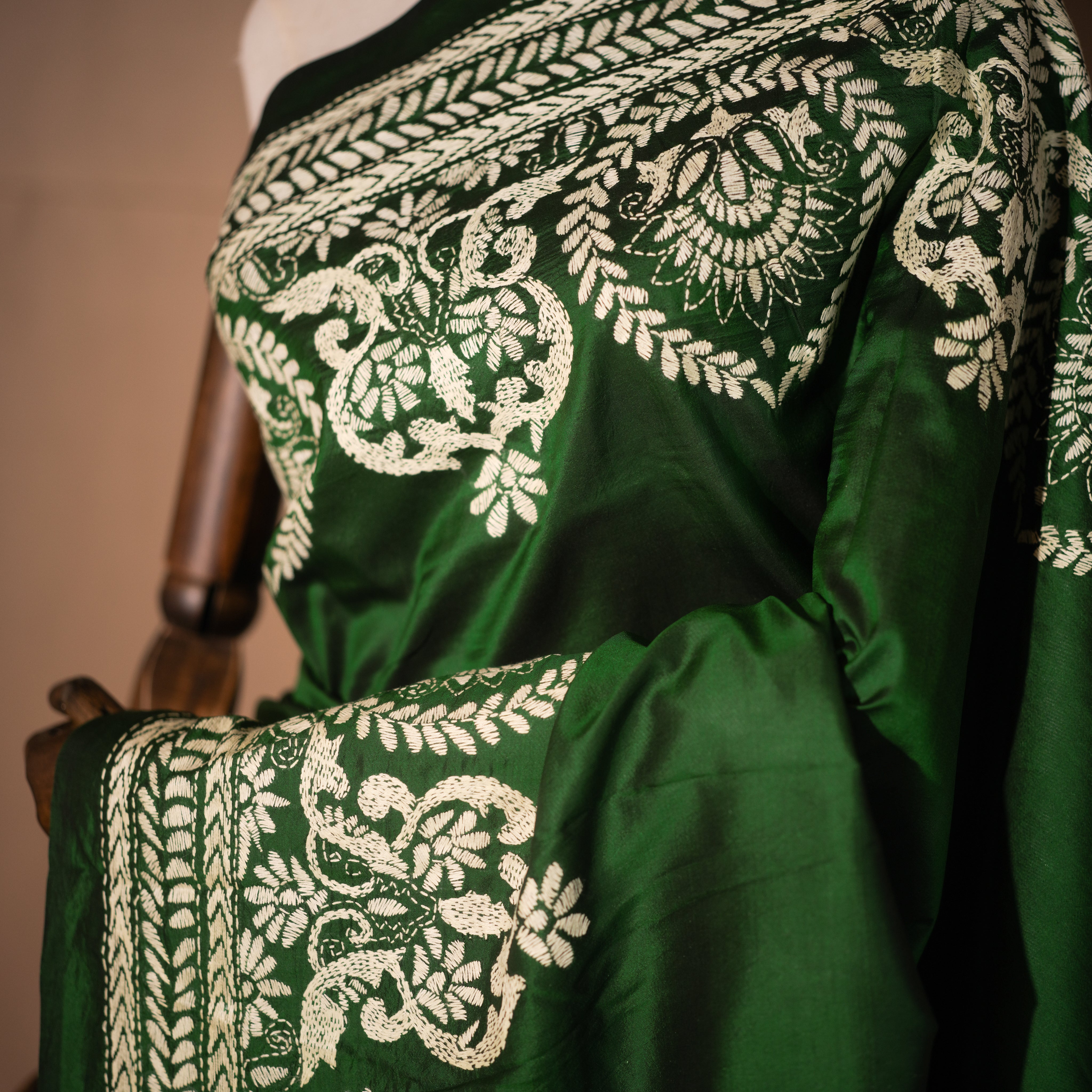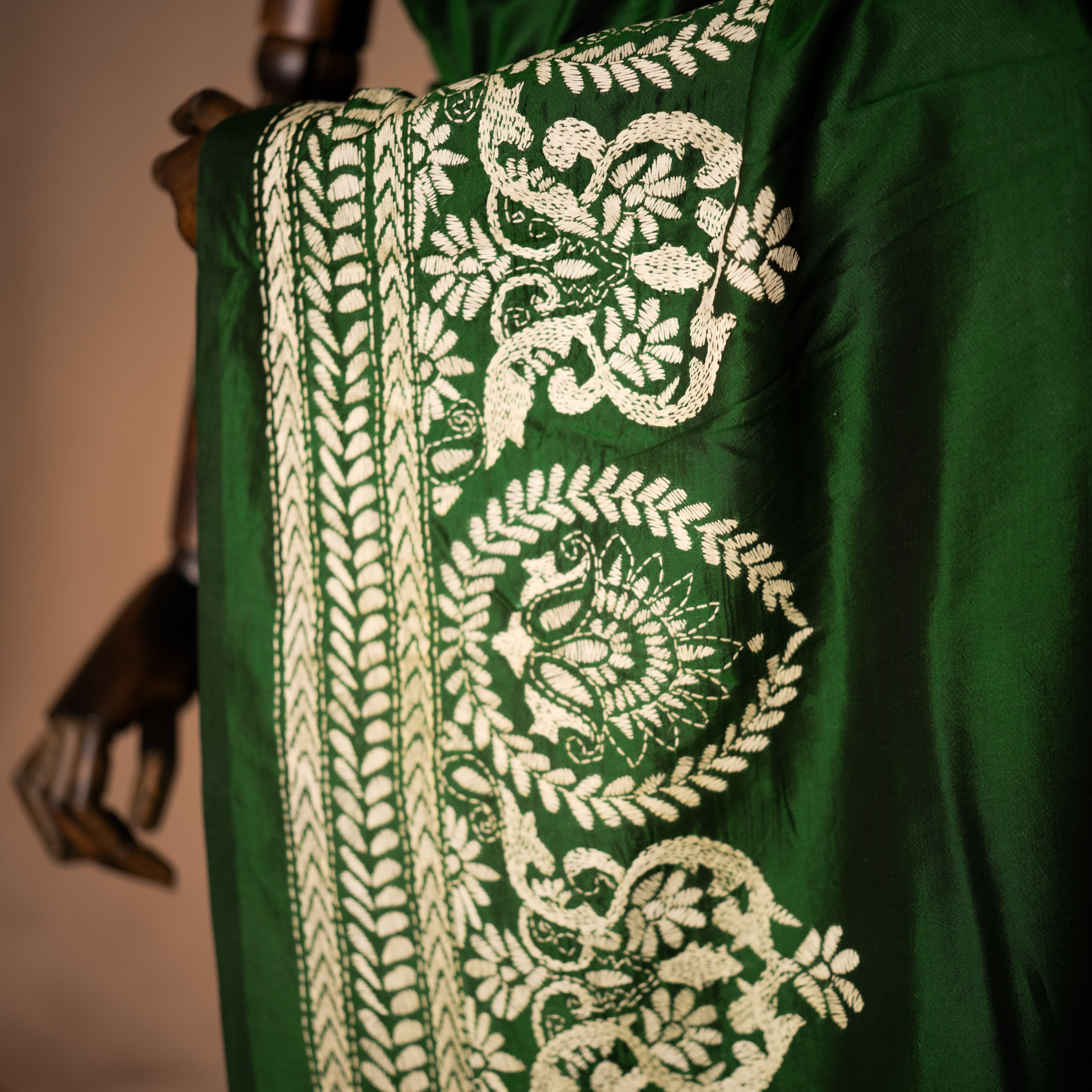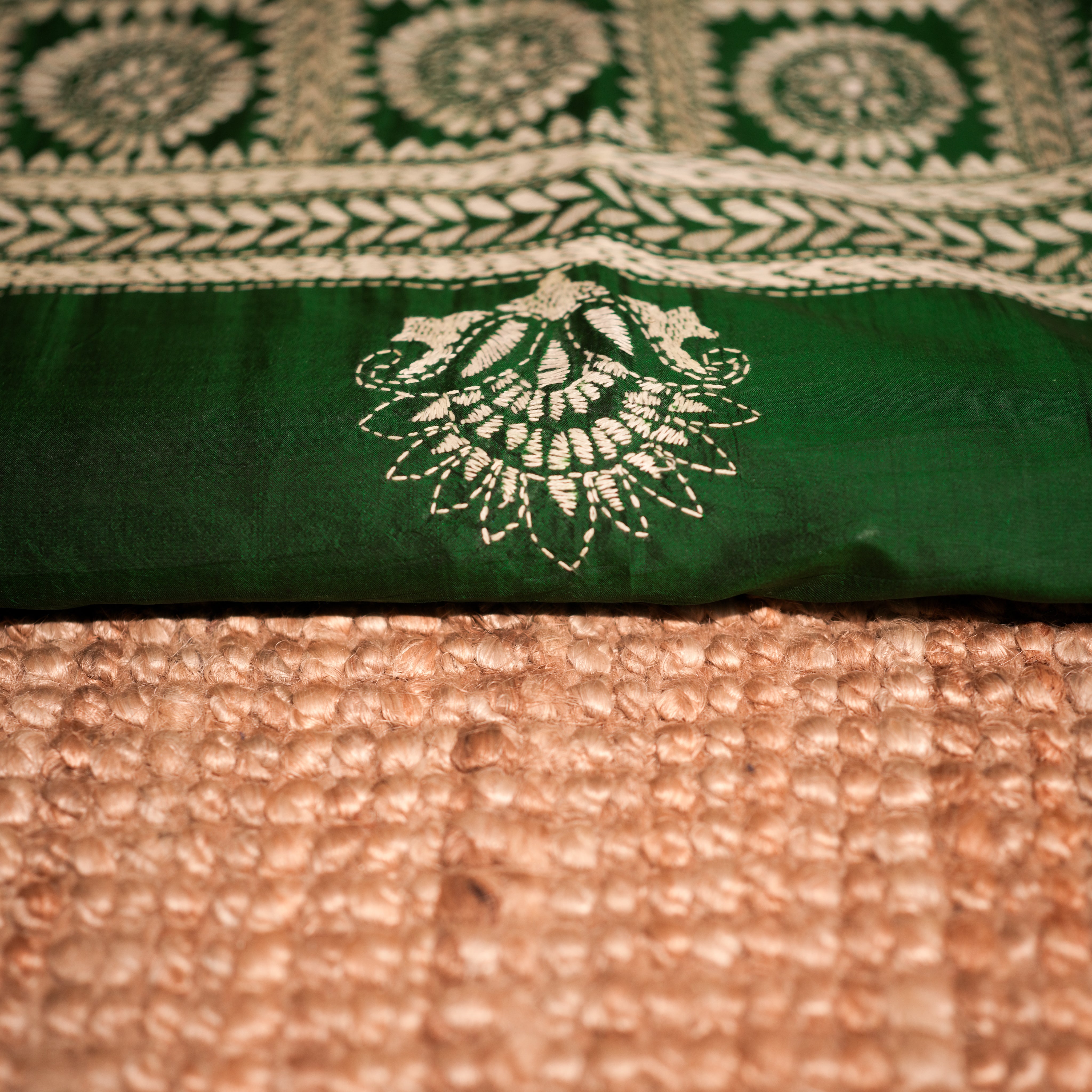 This exquisite Kantha silk saree from West Bengal is a masterpiece of traditional craftsmanship. The lush green base is adorned with intricate hand-embroidered Kantha work, showcasing detailed floral and paisley motifs that narrate the rich heritage of Bengal’s artistry. Known for its fine stitches and elaborate patterns, this saree embodies both cultural elegance and timeless beauty. Its soft texture and graceful drape make it a perfect choice for festive occasions, cultural gatherings, and statement wear.