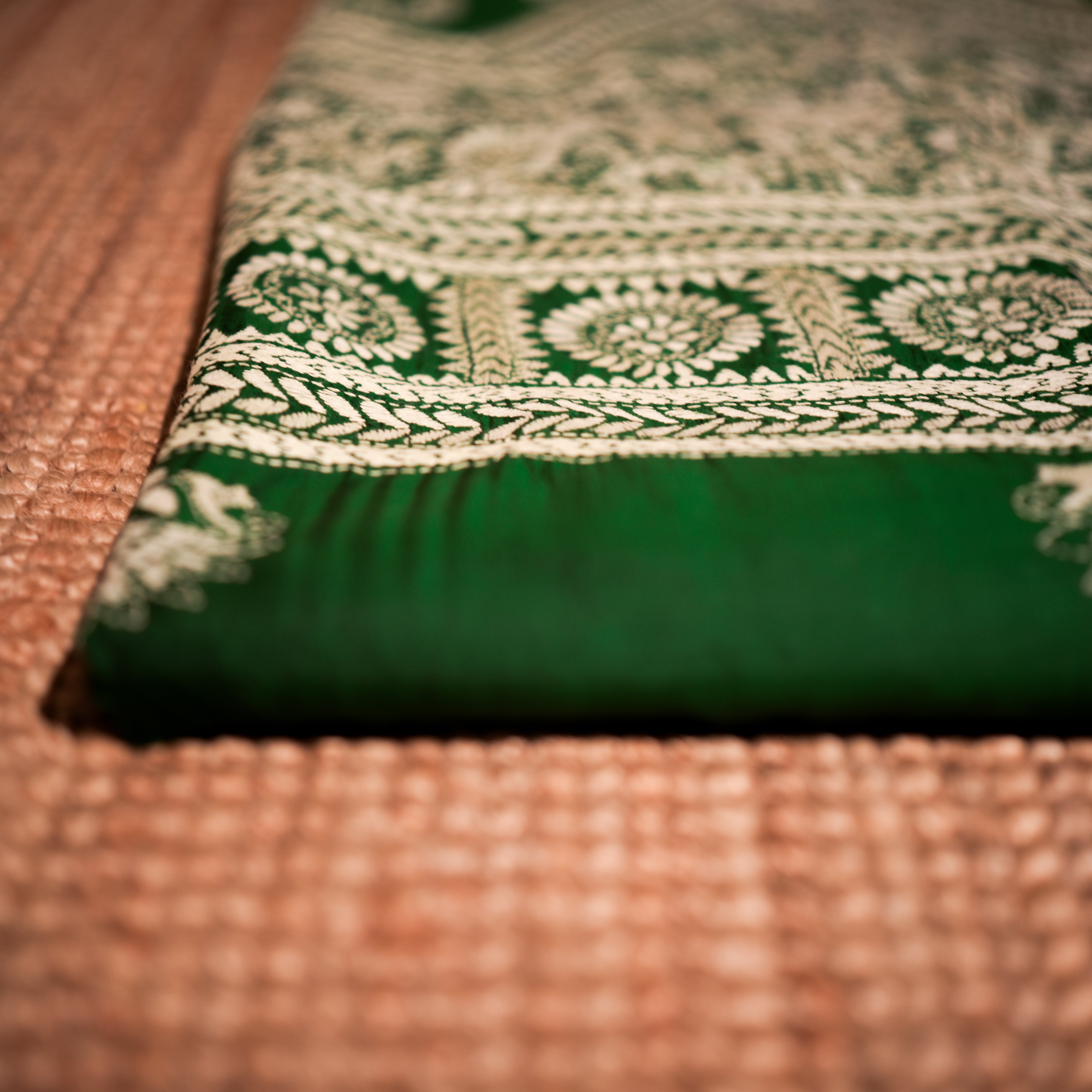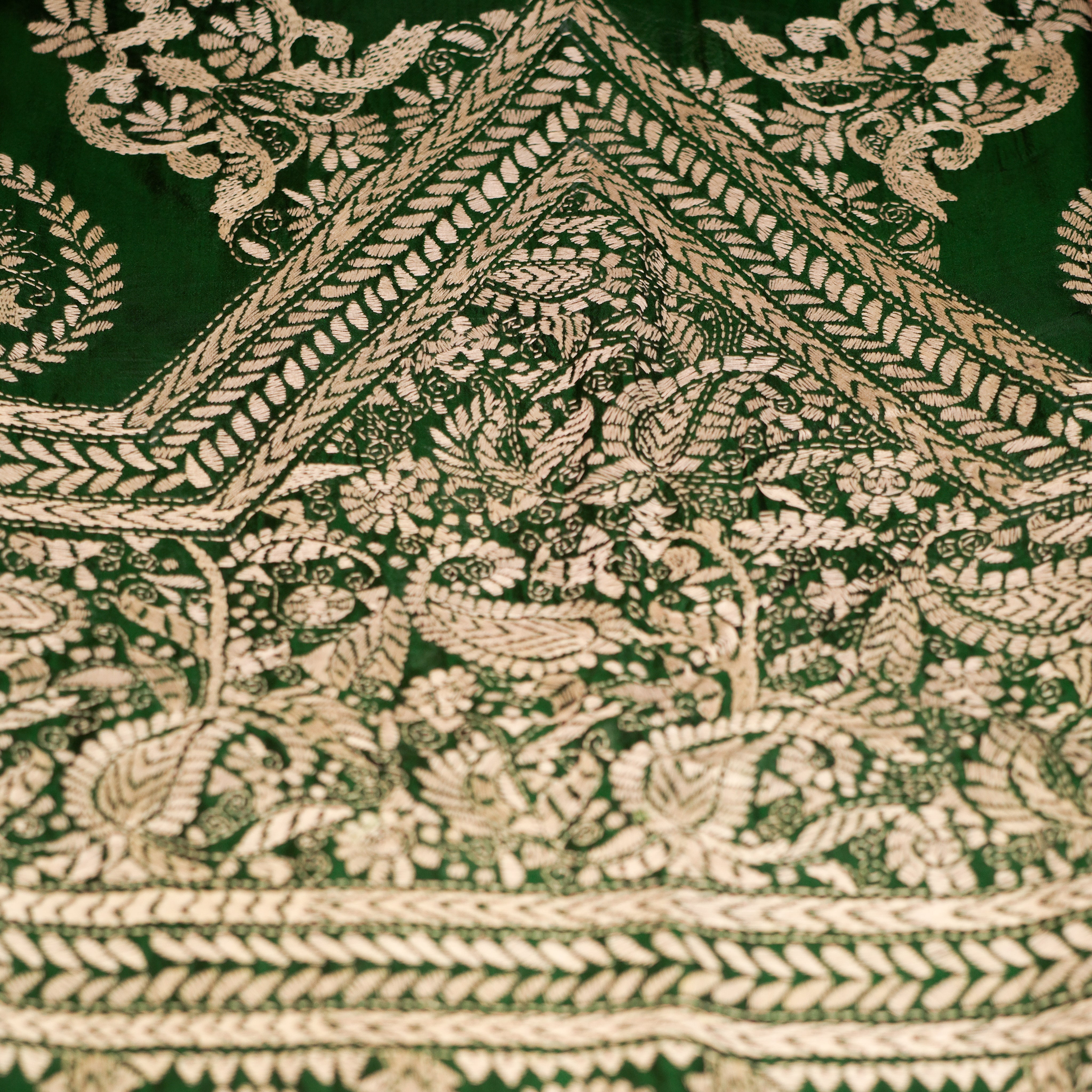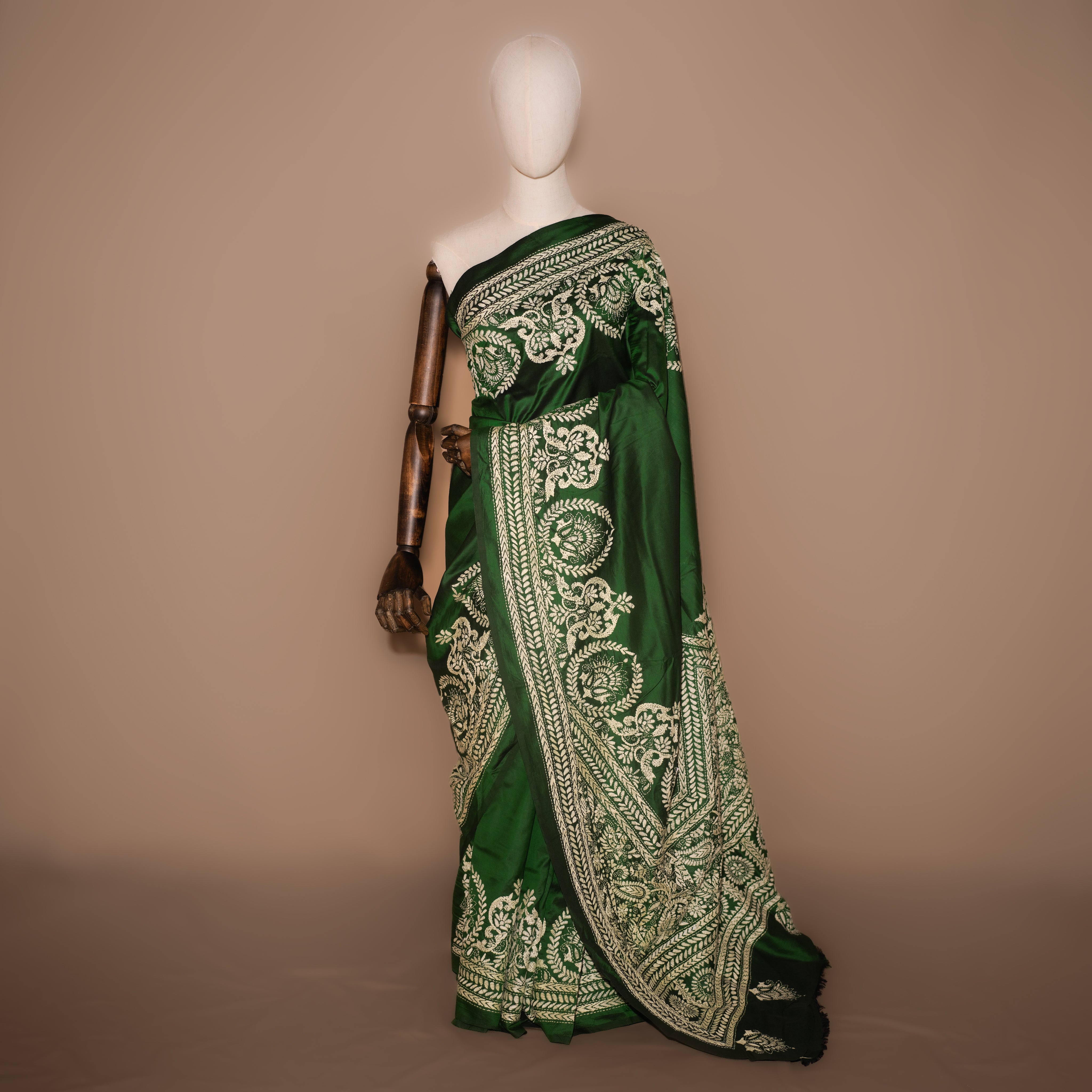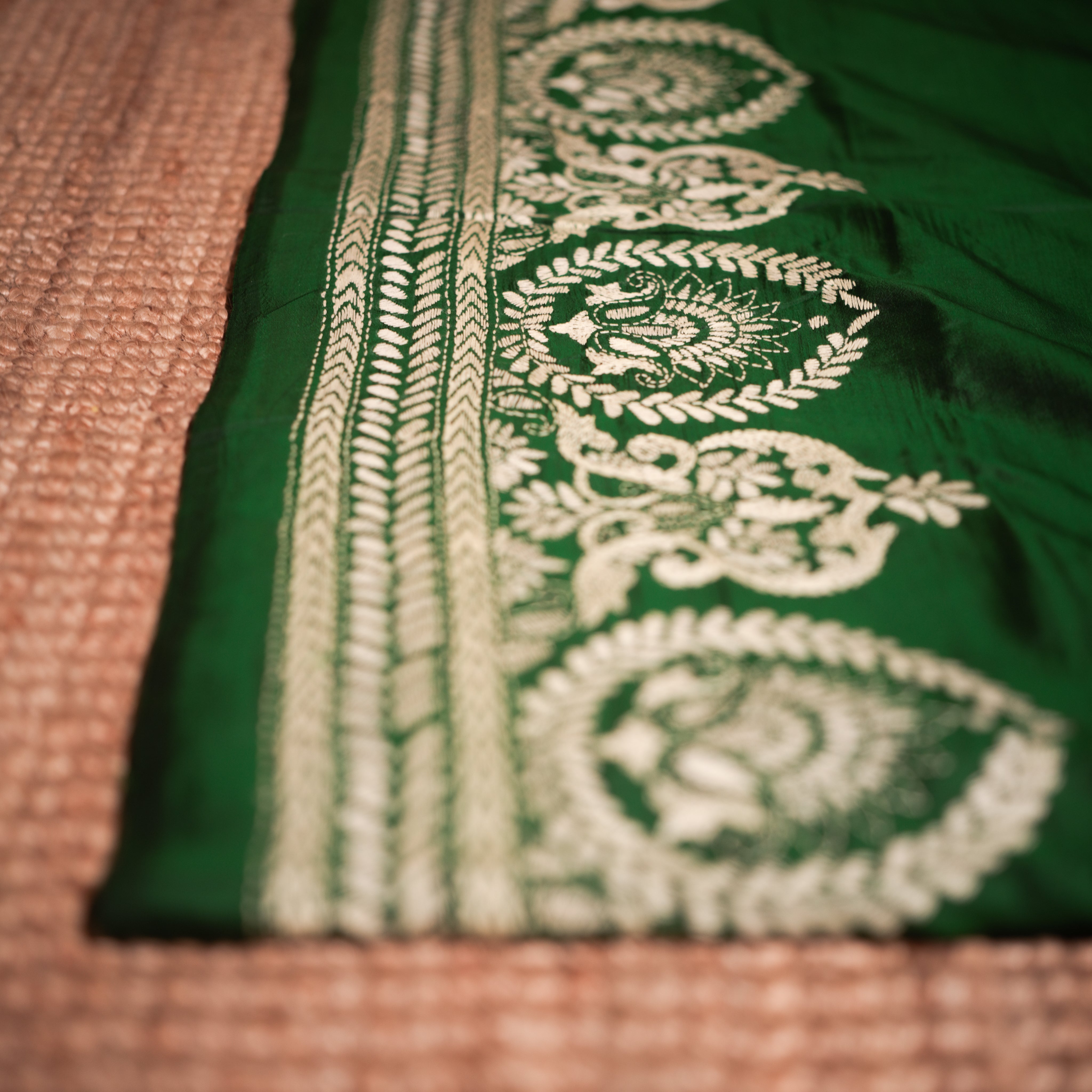 This exquisite Kantha silk saree from West Bengal is a masterpiece of traditional craftsmanship. The lush green base is adorned with intricate hand-embroidered Kantha work, showcasing detailed floral and paisley motifs that narrate the rich heritage of Bengal’s artistry. Known for its fine stitches and elaborate patterns, this saree embodies both cultural elegance and timeless beauty. Its soft texture and graceful drape make it a perfect choice for festive occasions, cultural gatherings, and statement wear.