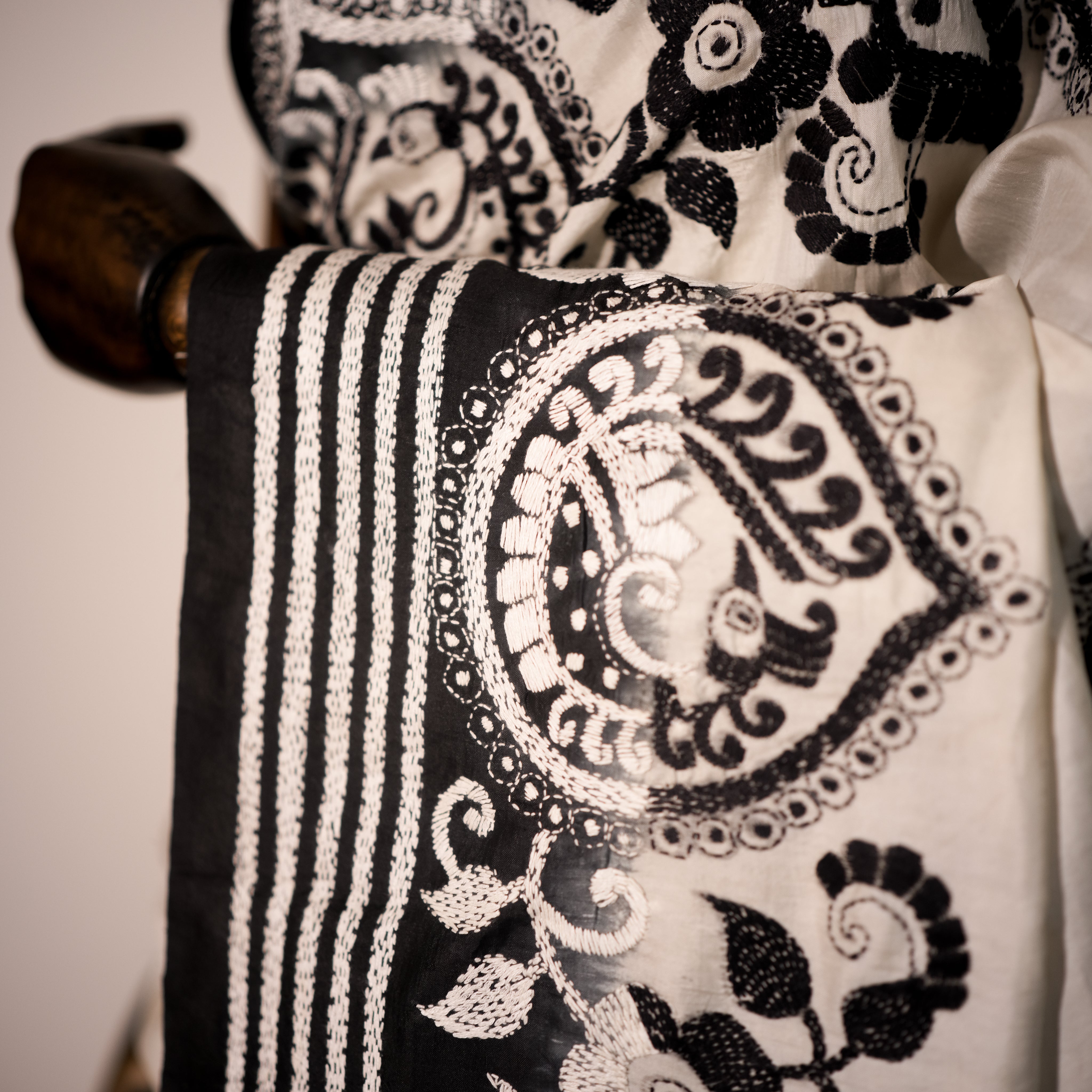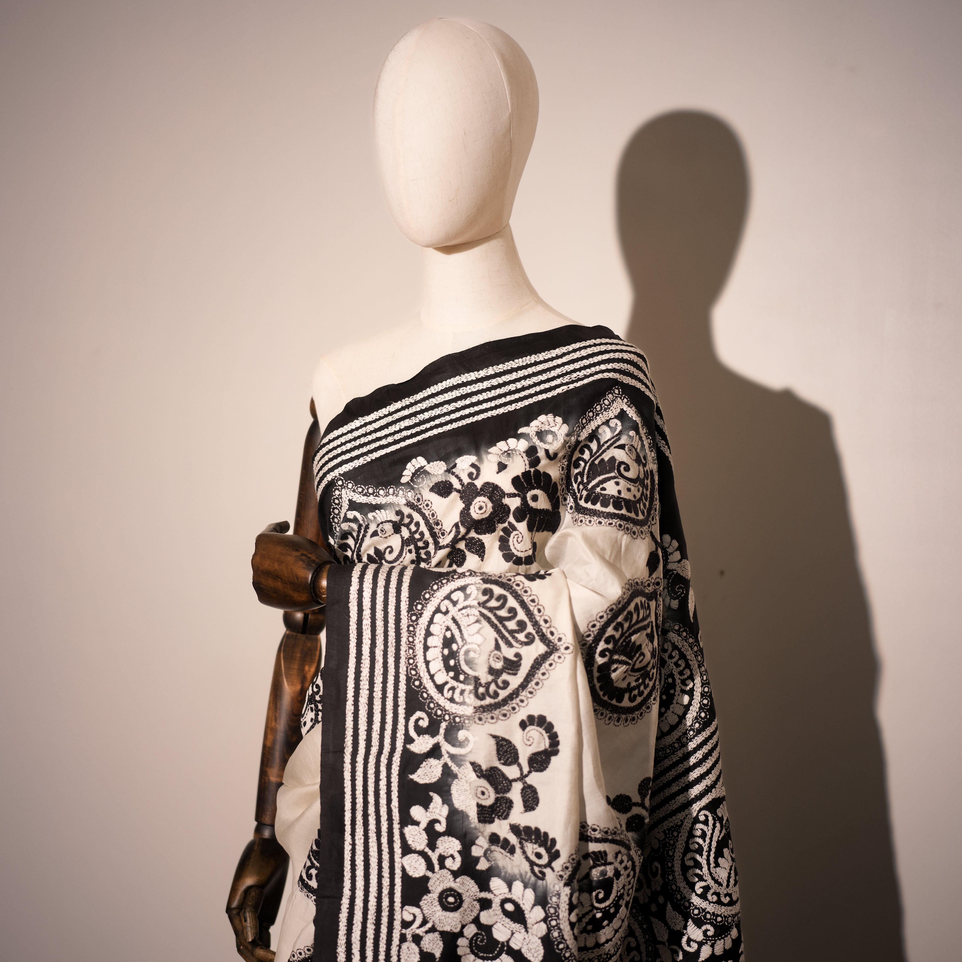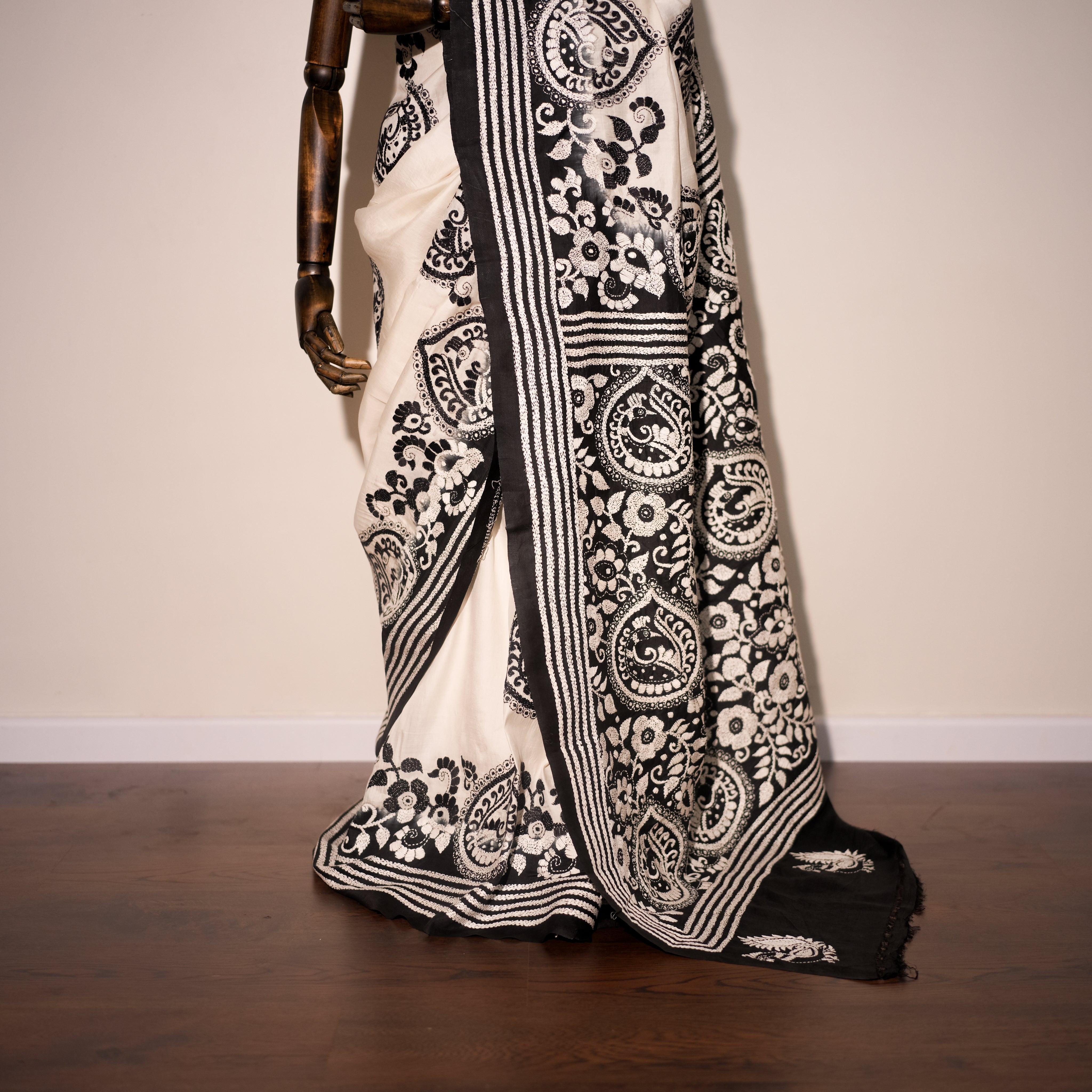 Monochrome Elegance – Hand Kanthha on Bangalore Silk